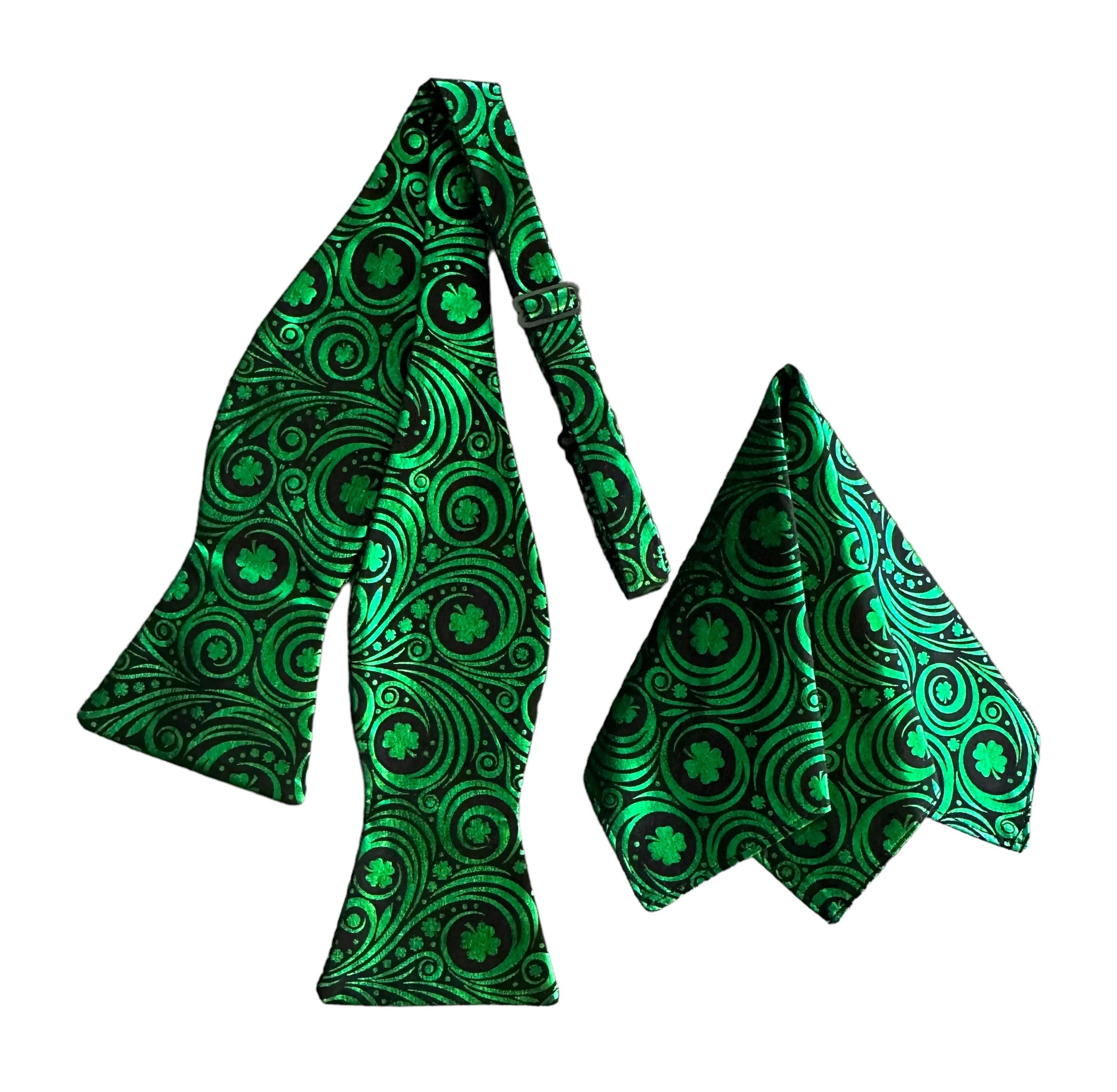 Handmade St. Patrick's Day Self-tie Bow Tie and Pocket Handkerchief Set - Green Foil Shamrocks and Swirls on Black - Premium Cotton - Adult Mens Sizing - Crafted in the USA by Holiday Bow Ties, LLC - The "Ozzy"