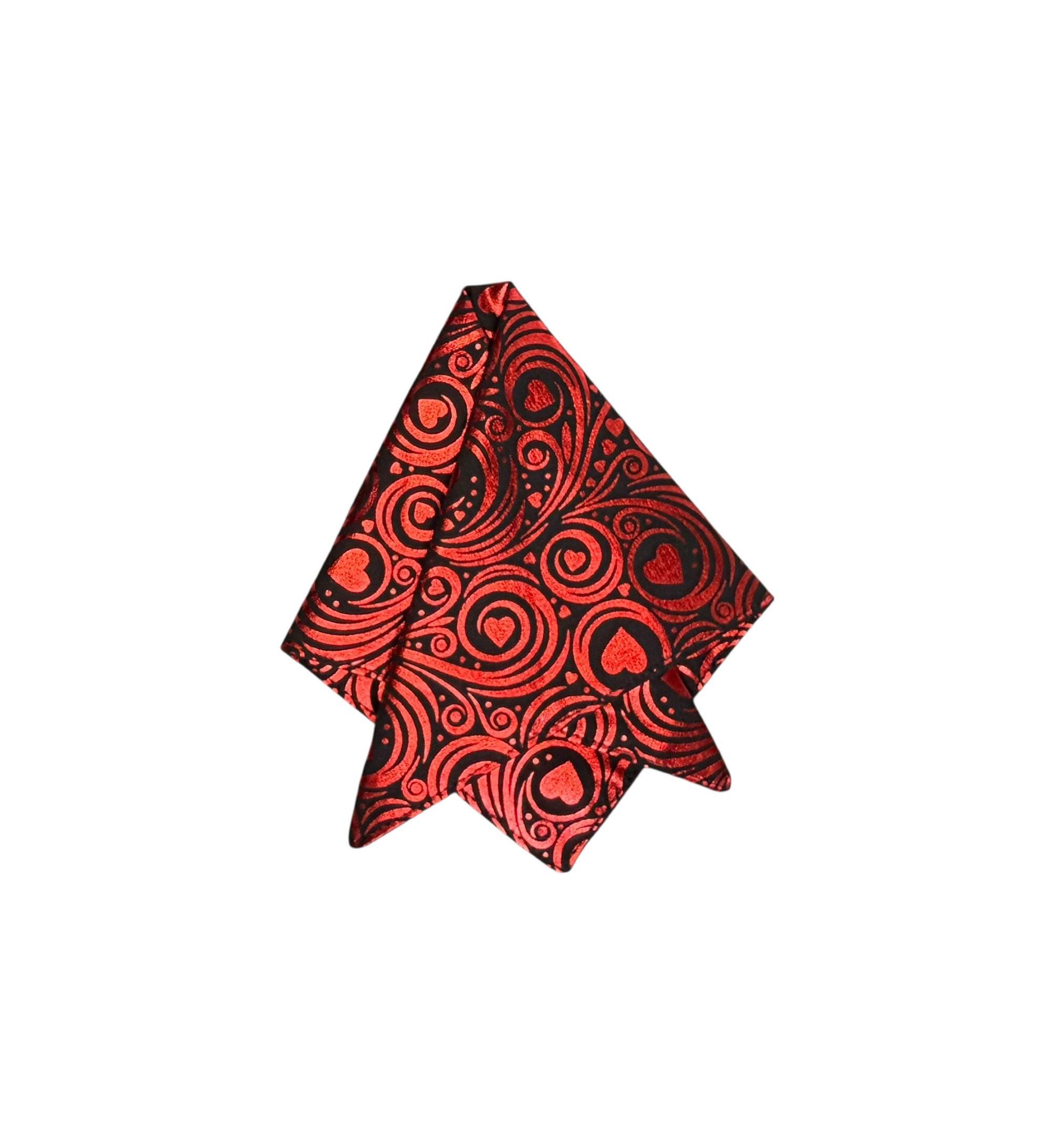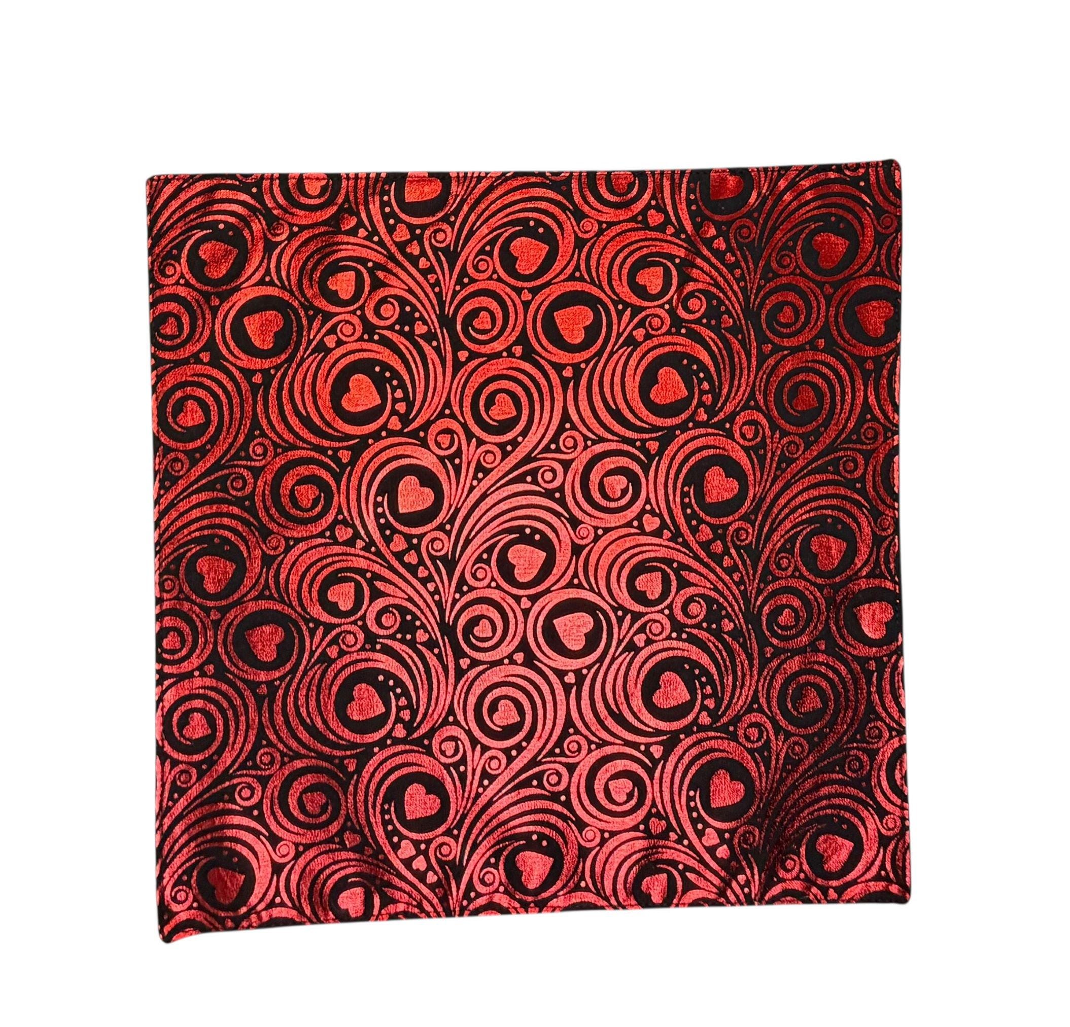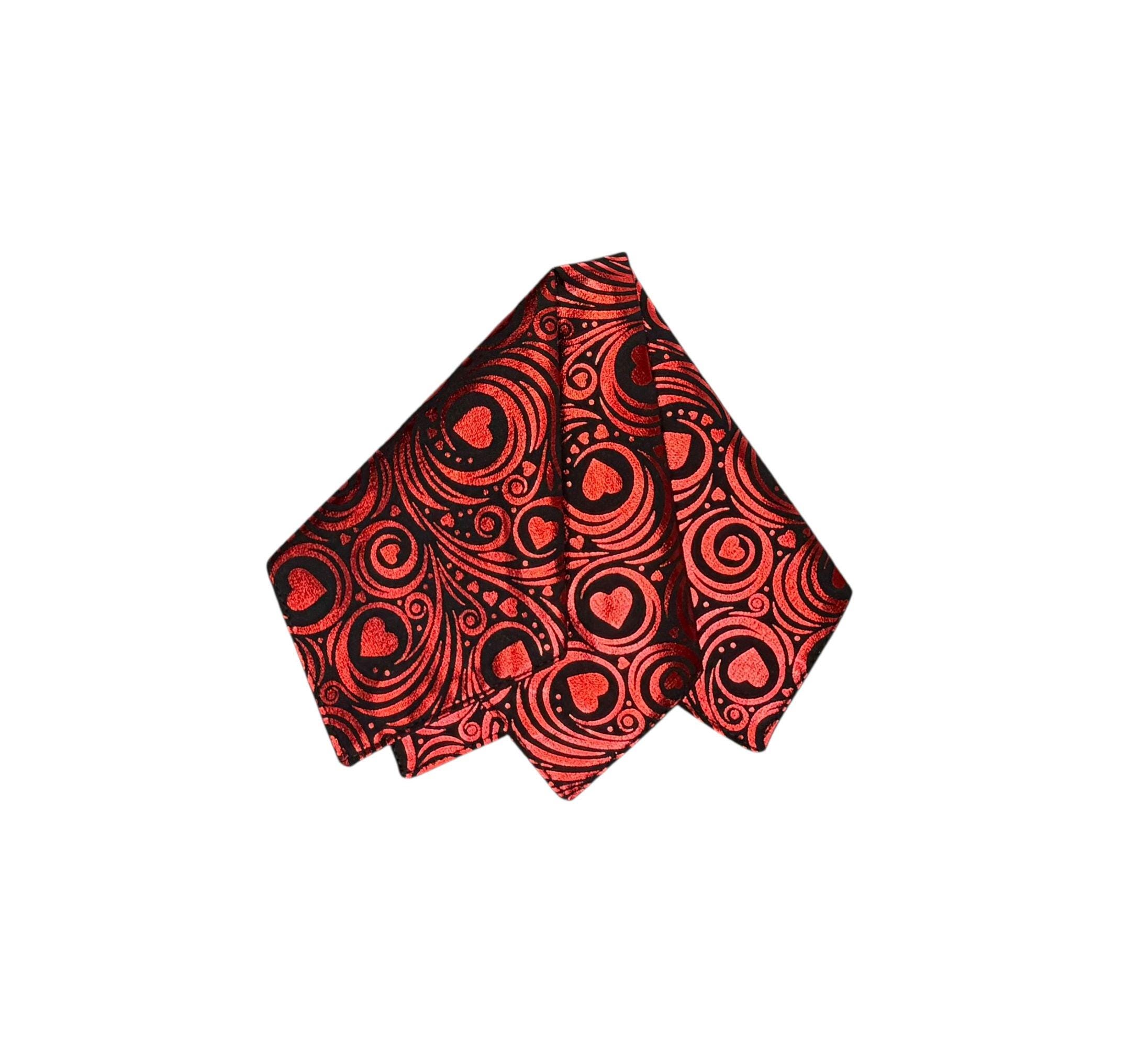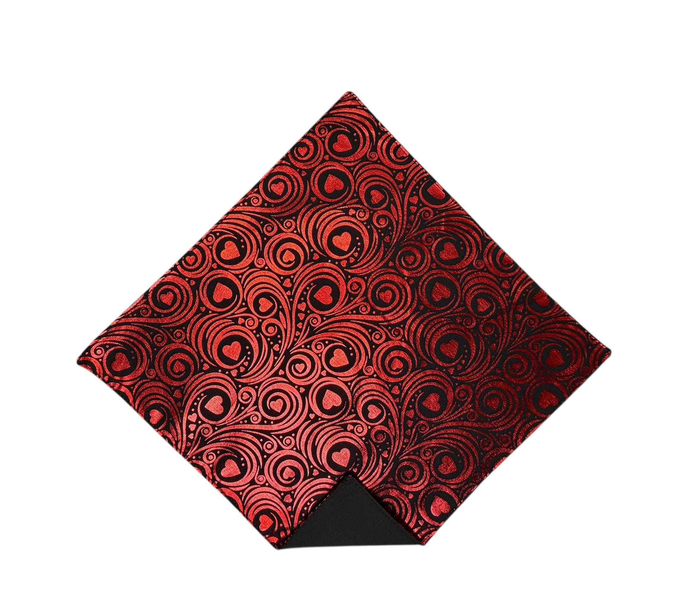 Valentine Pocket Square - Black with Red Foil Hearts and Swirls Cotton Handkerchief - Adult Sizing - Handcrafted in the USA by Holiday Bow Ties, LLC - The "Valentin"