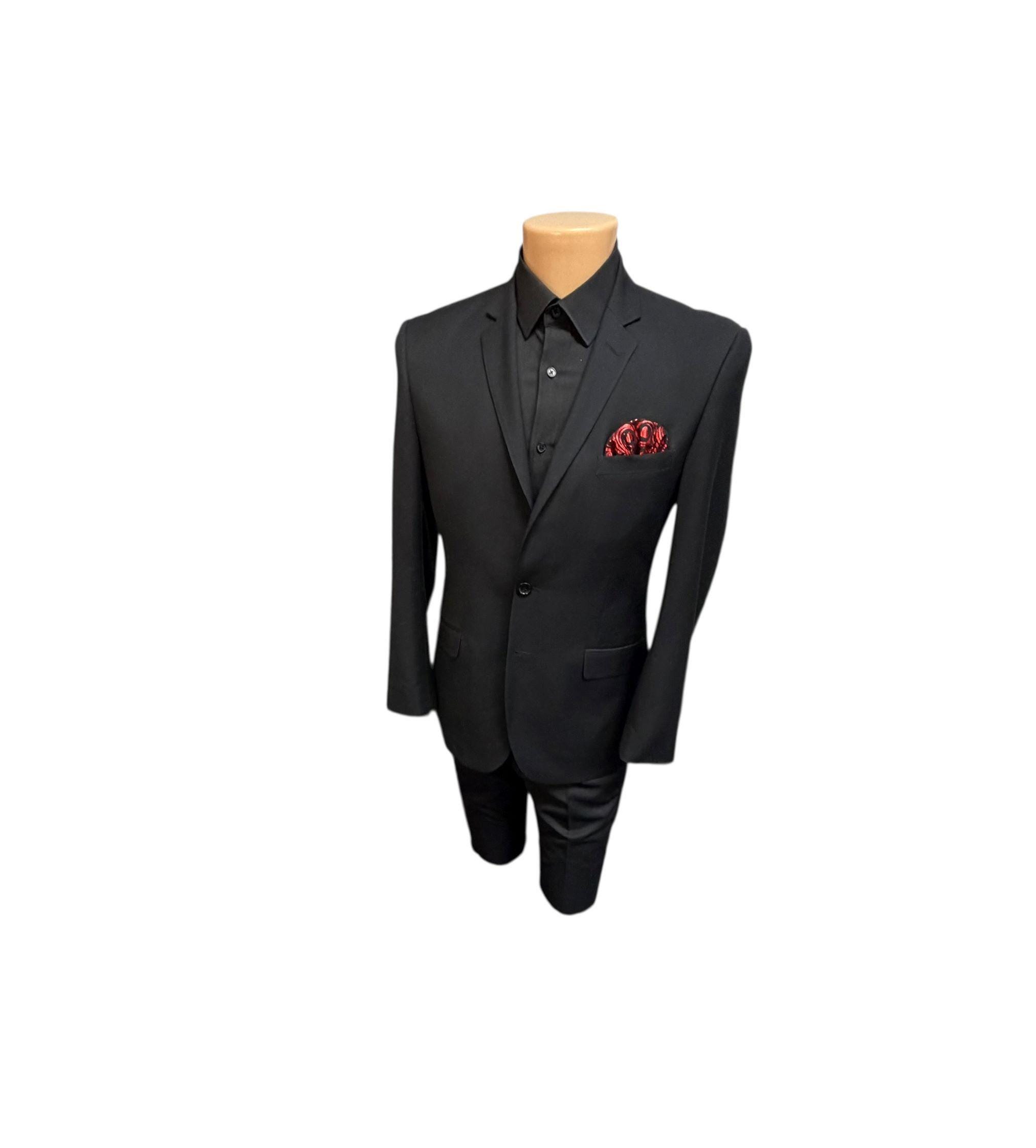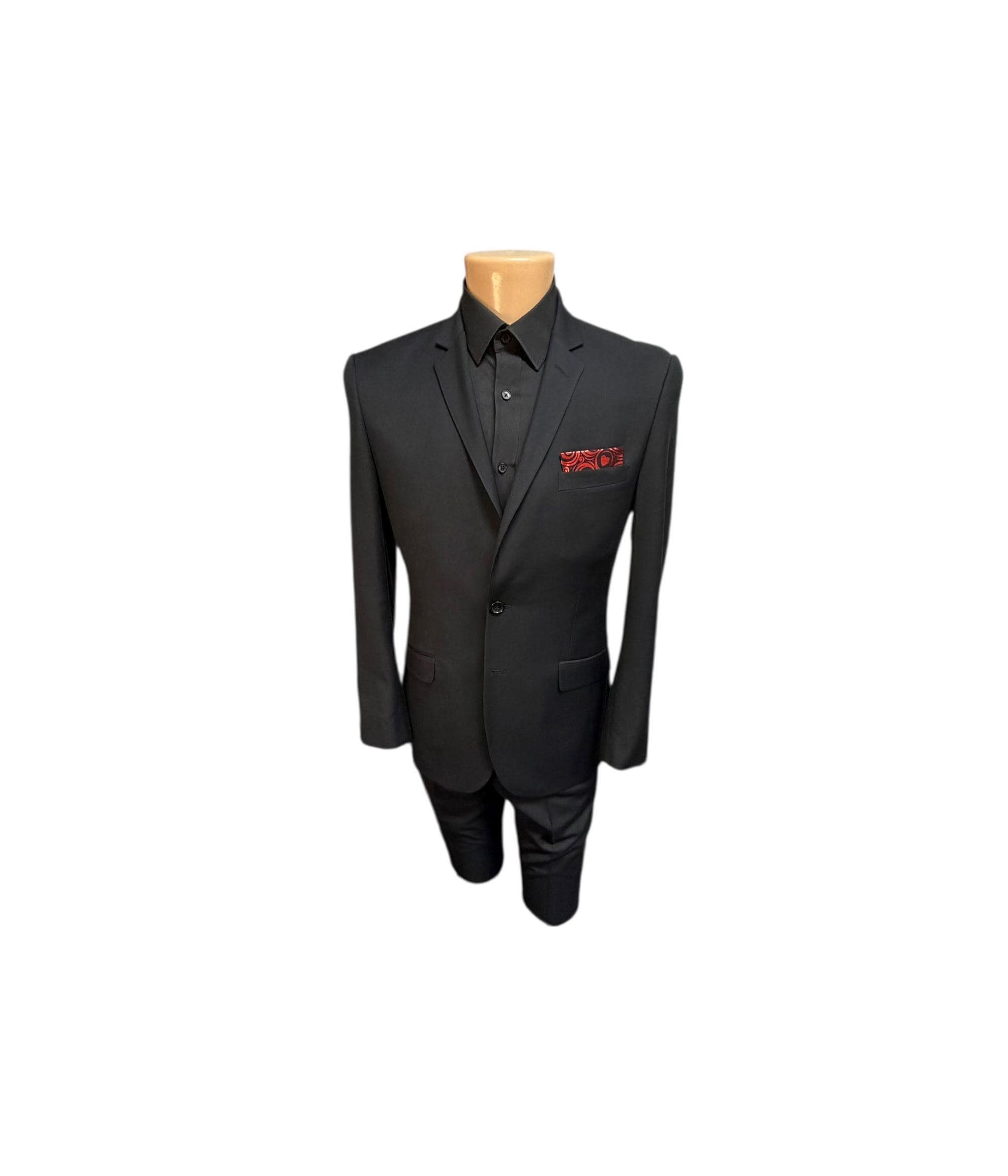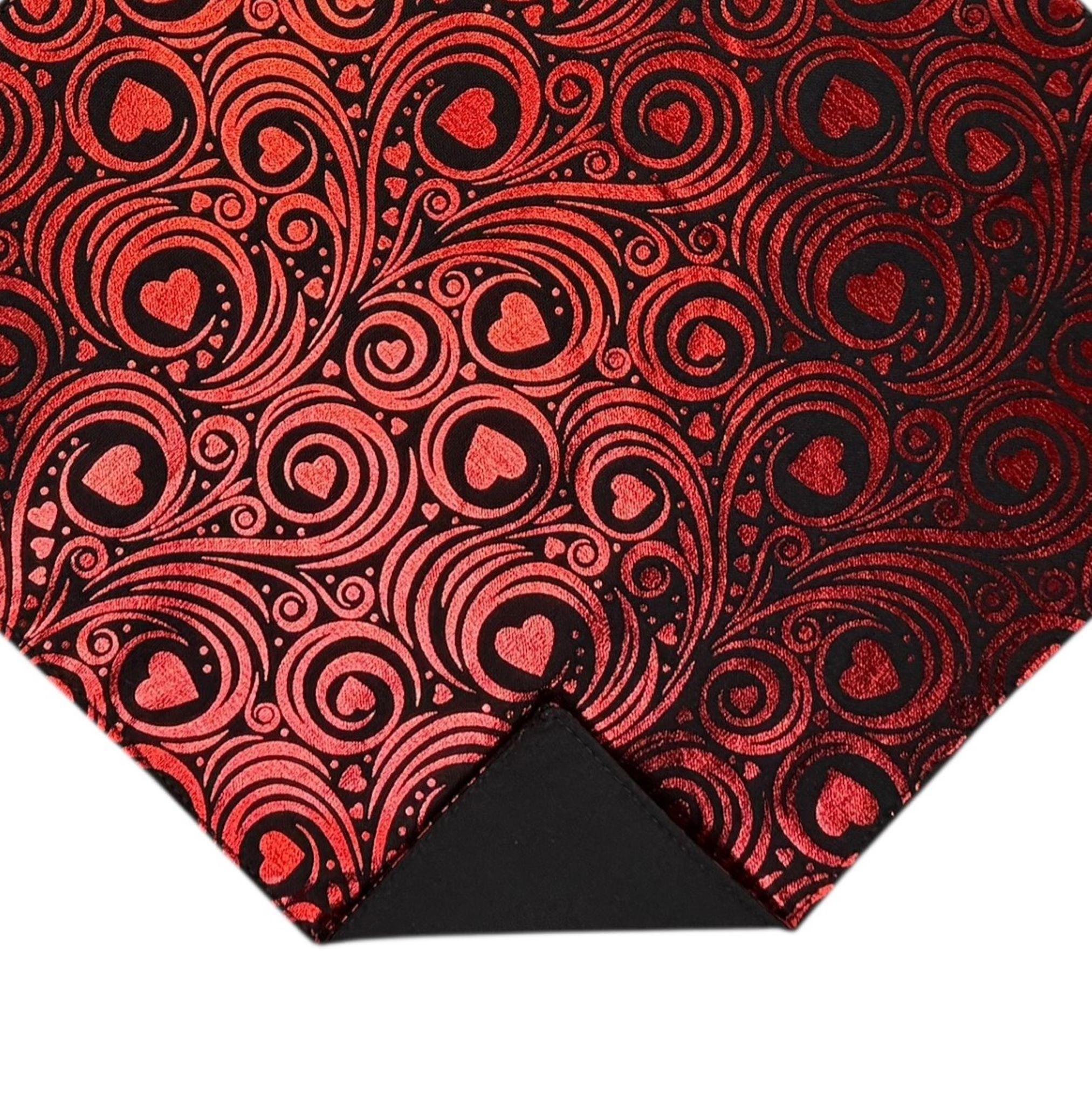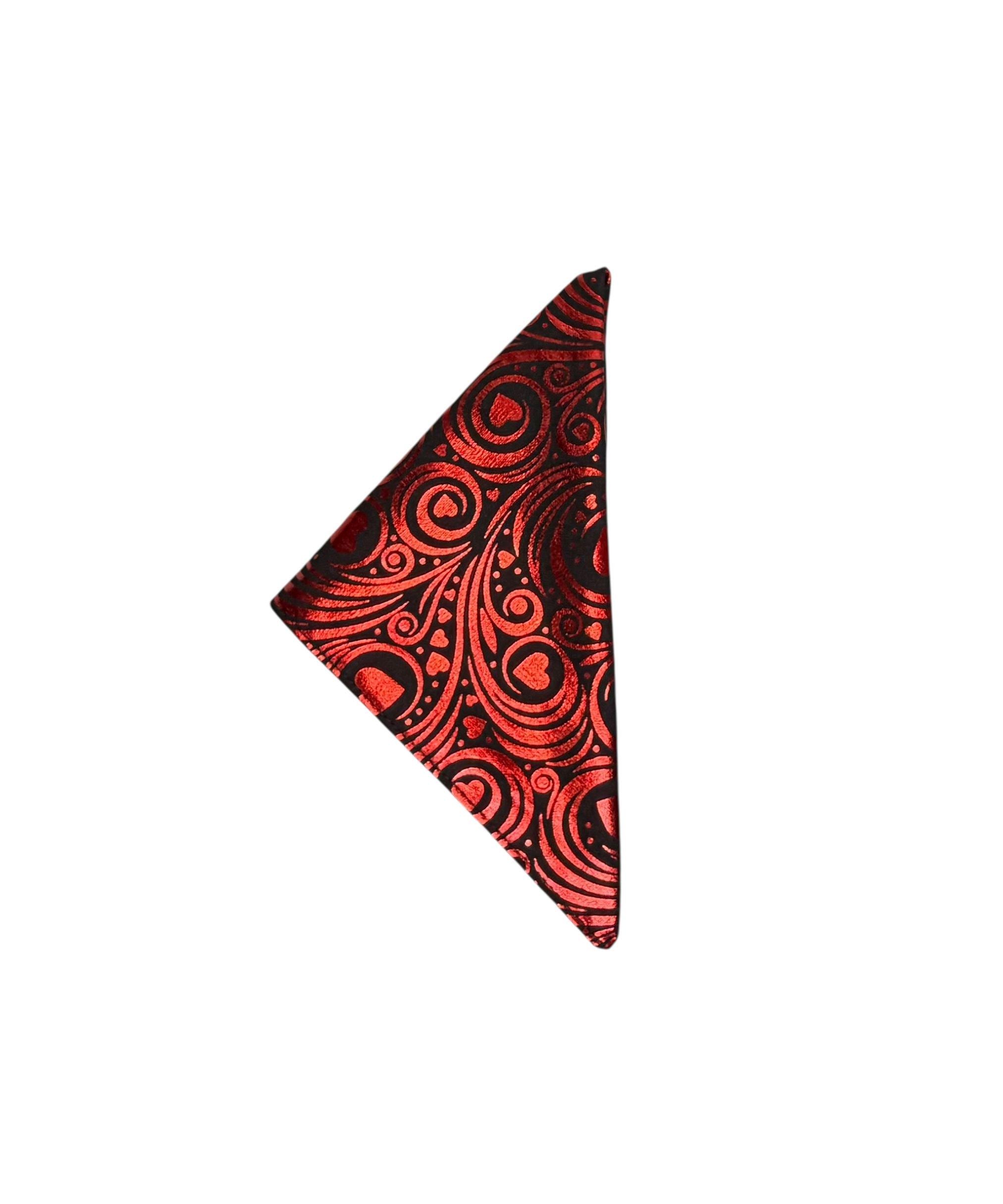 Valentine Pocket Square - Black with Red Foil Hearts and Swirls Cotton Handkerchief - Adult Sizing - Handcrafted in the USA by Holiday Bow Ties, LLC - The "Valentin"