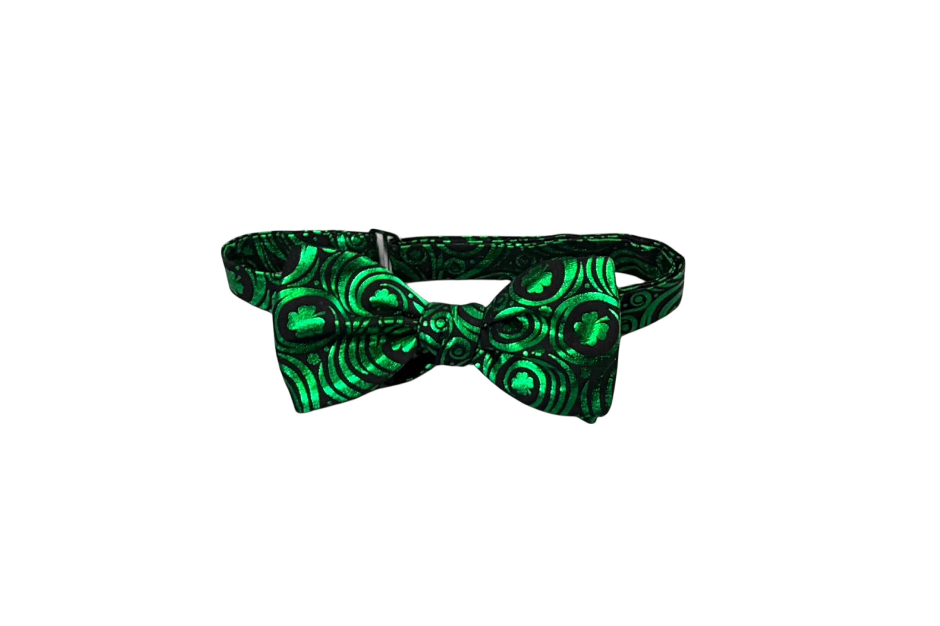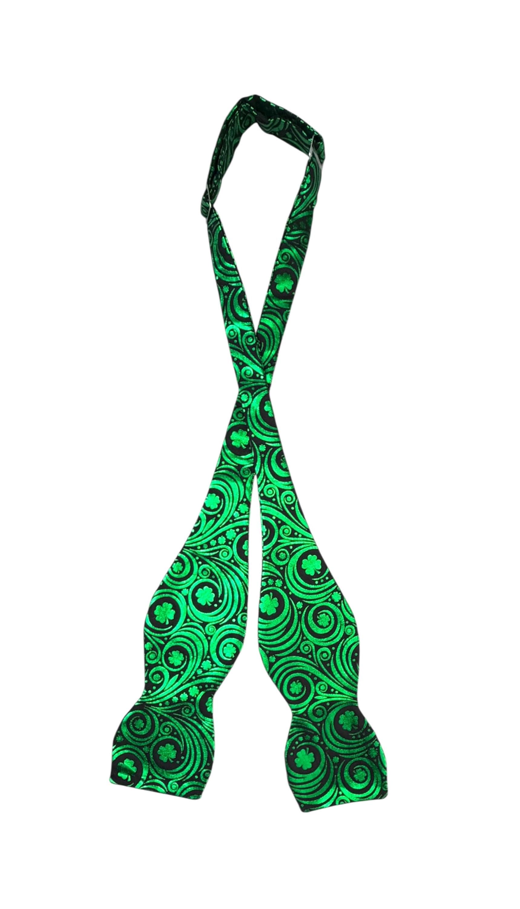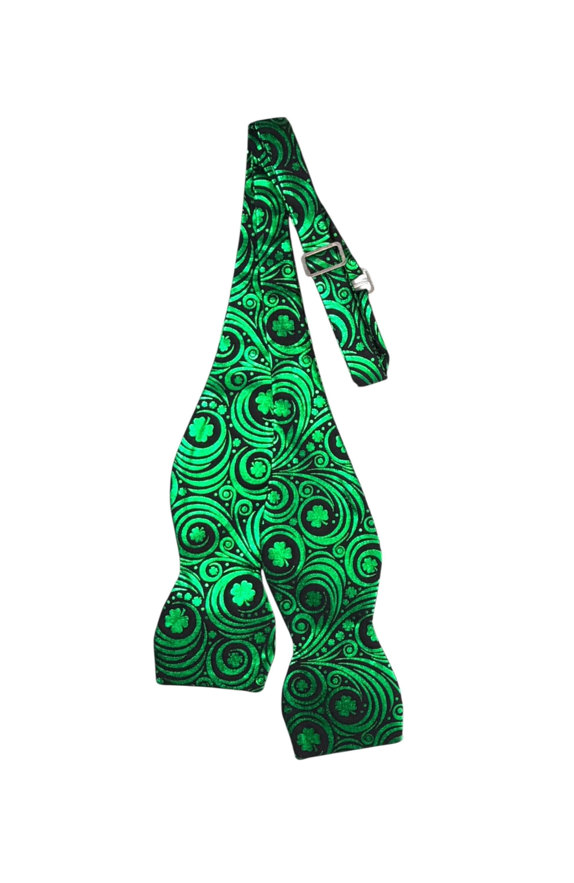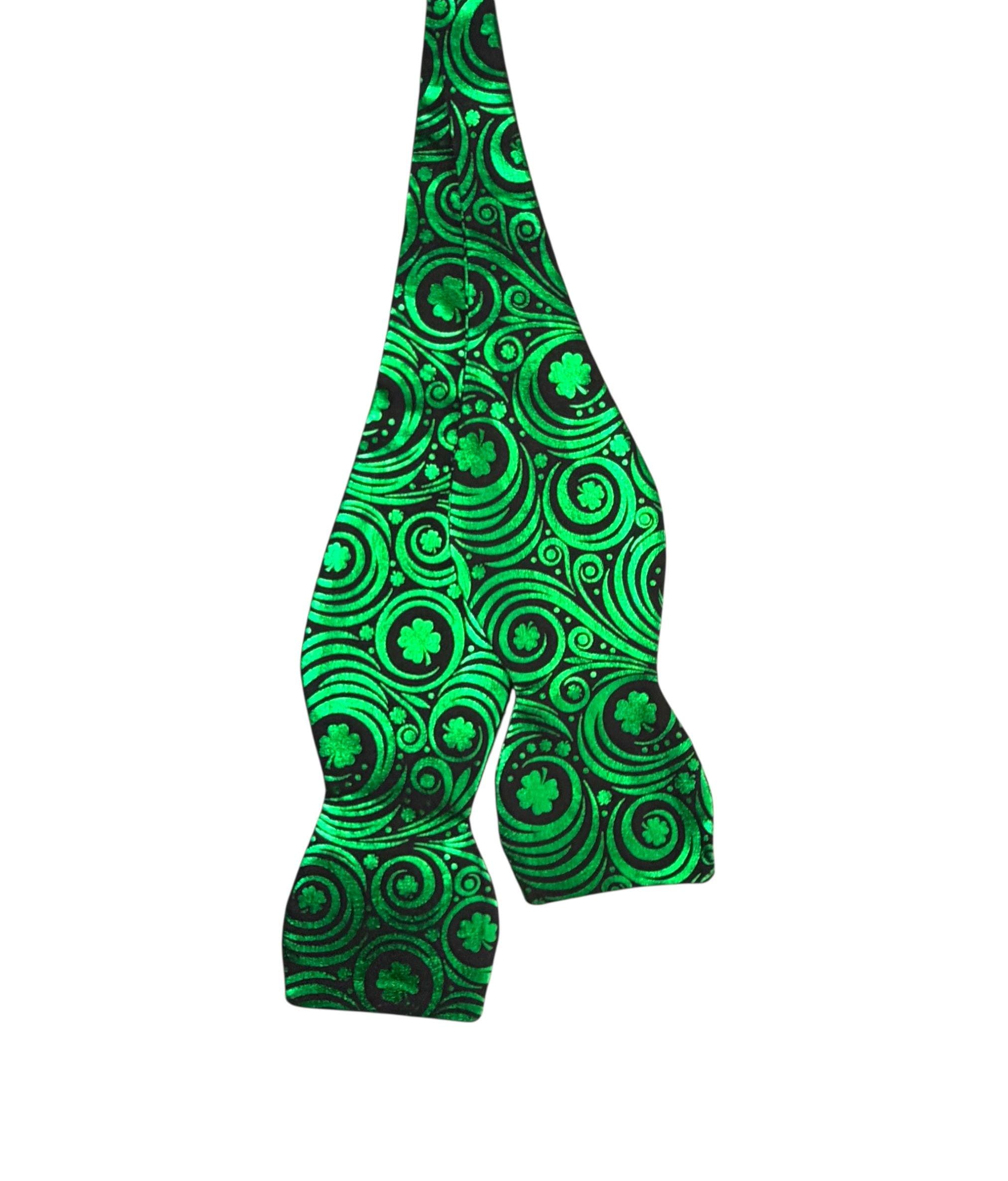 St. Patrick's Day Self-Tie or Pretied Bow Tie - Green Foil Shamrocks and Swirls on Black - Premium Cotton - Adult Men's Sizing - Handcrafted in the USA - The "Ozzy"