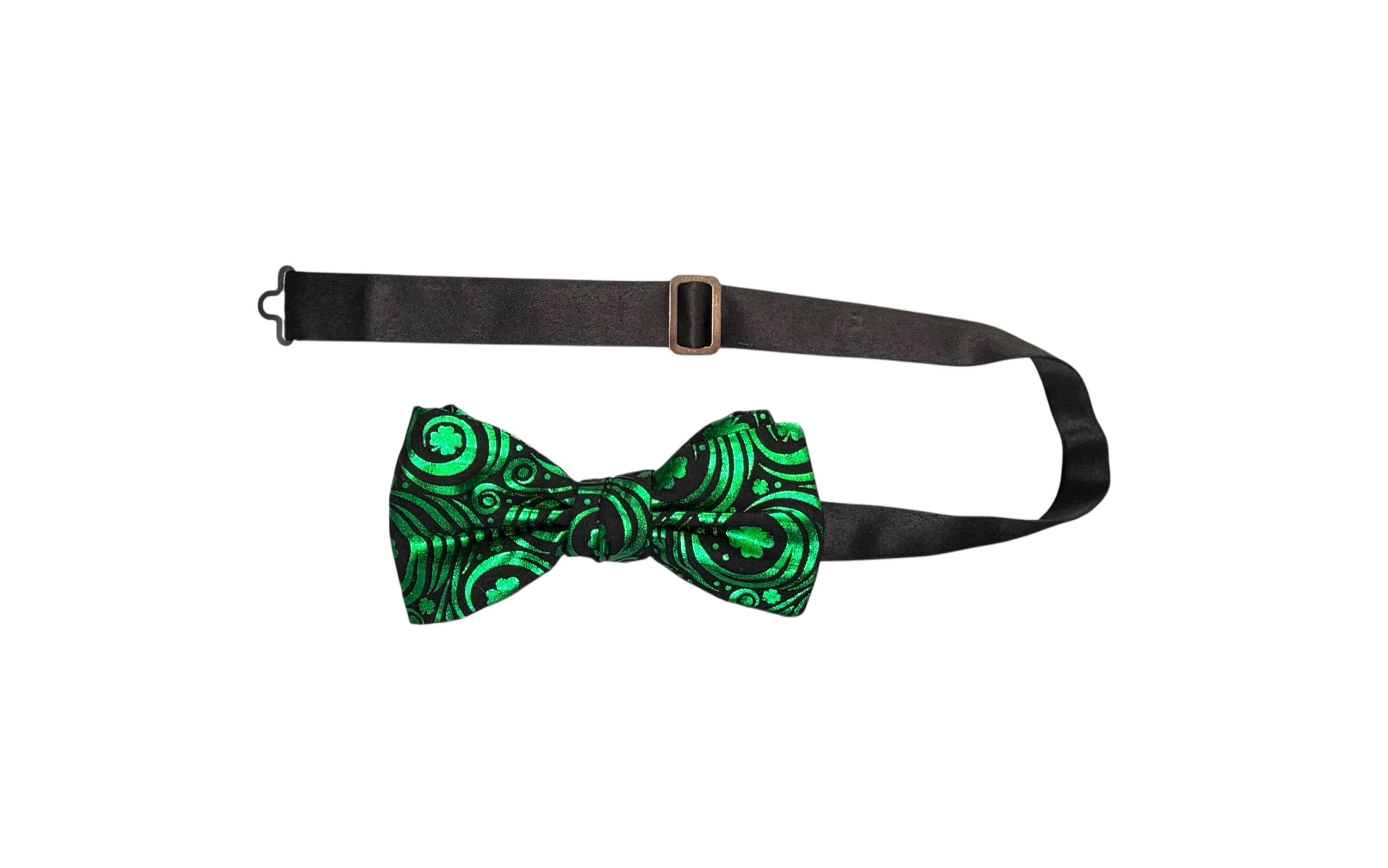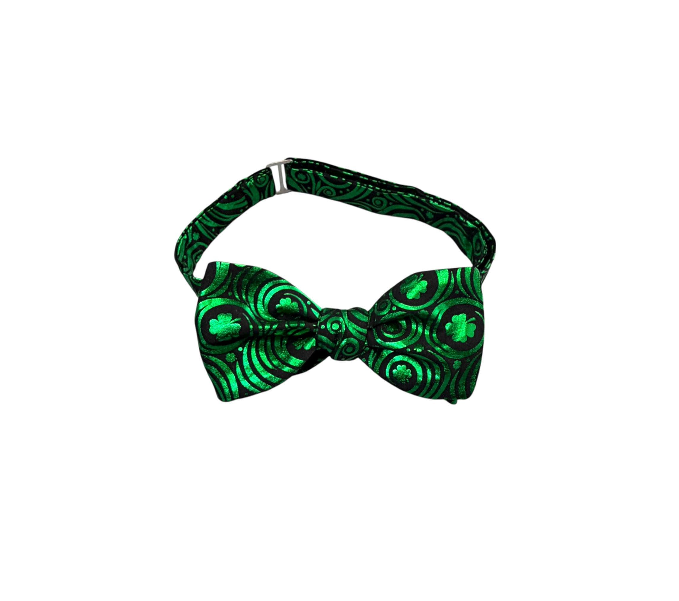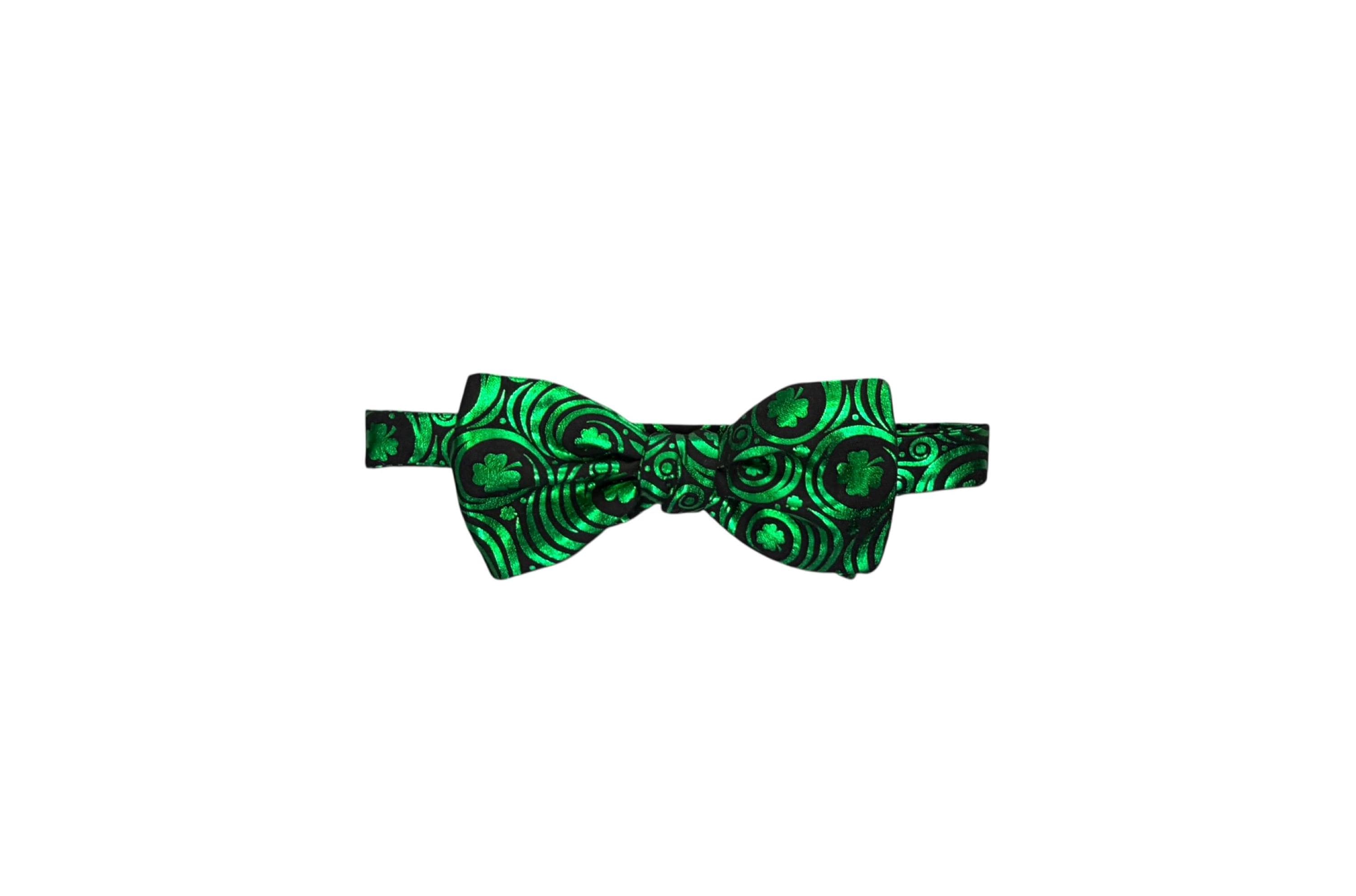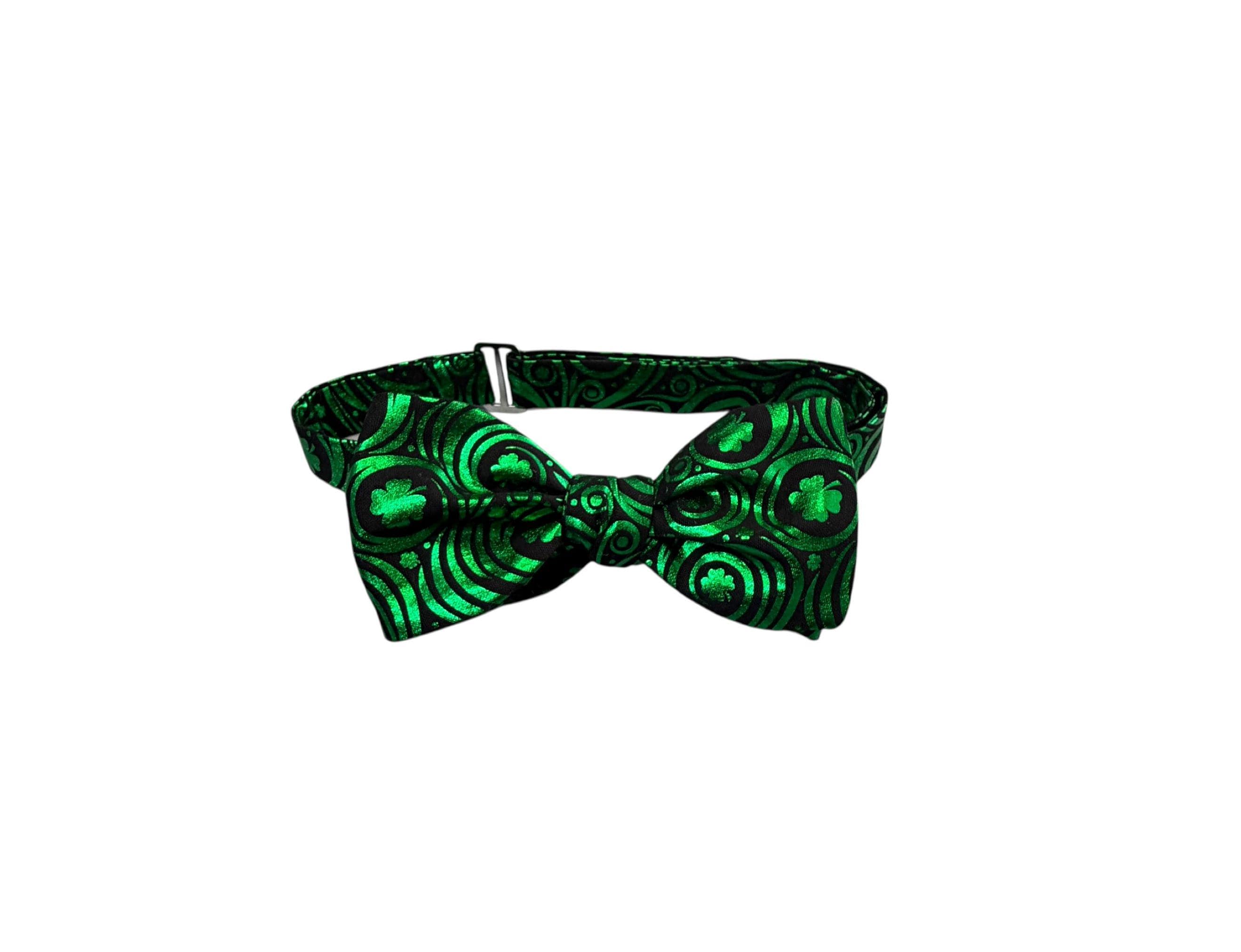 St. Patrick's Day Self-Tie or Pretied Bow Tie - Green Foil Shamrocks and Swirls on Black - Premium Cotton - Adult Men's Sizing - Handcrafted in the USA - The "Ozzy"