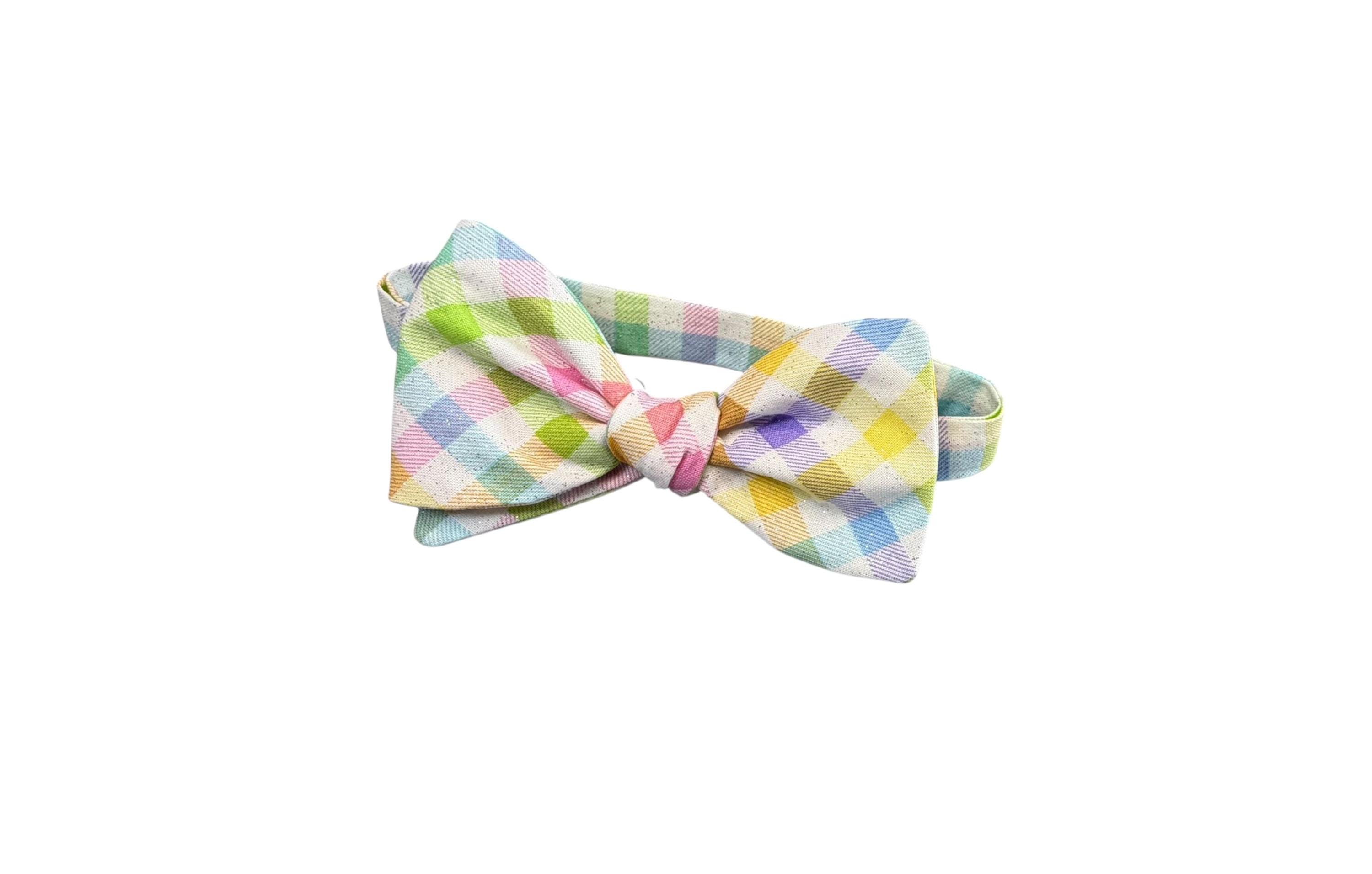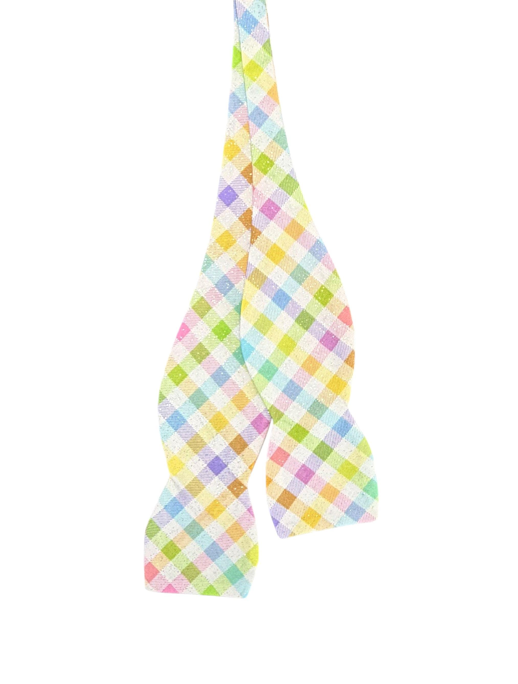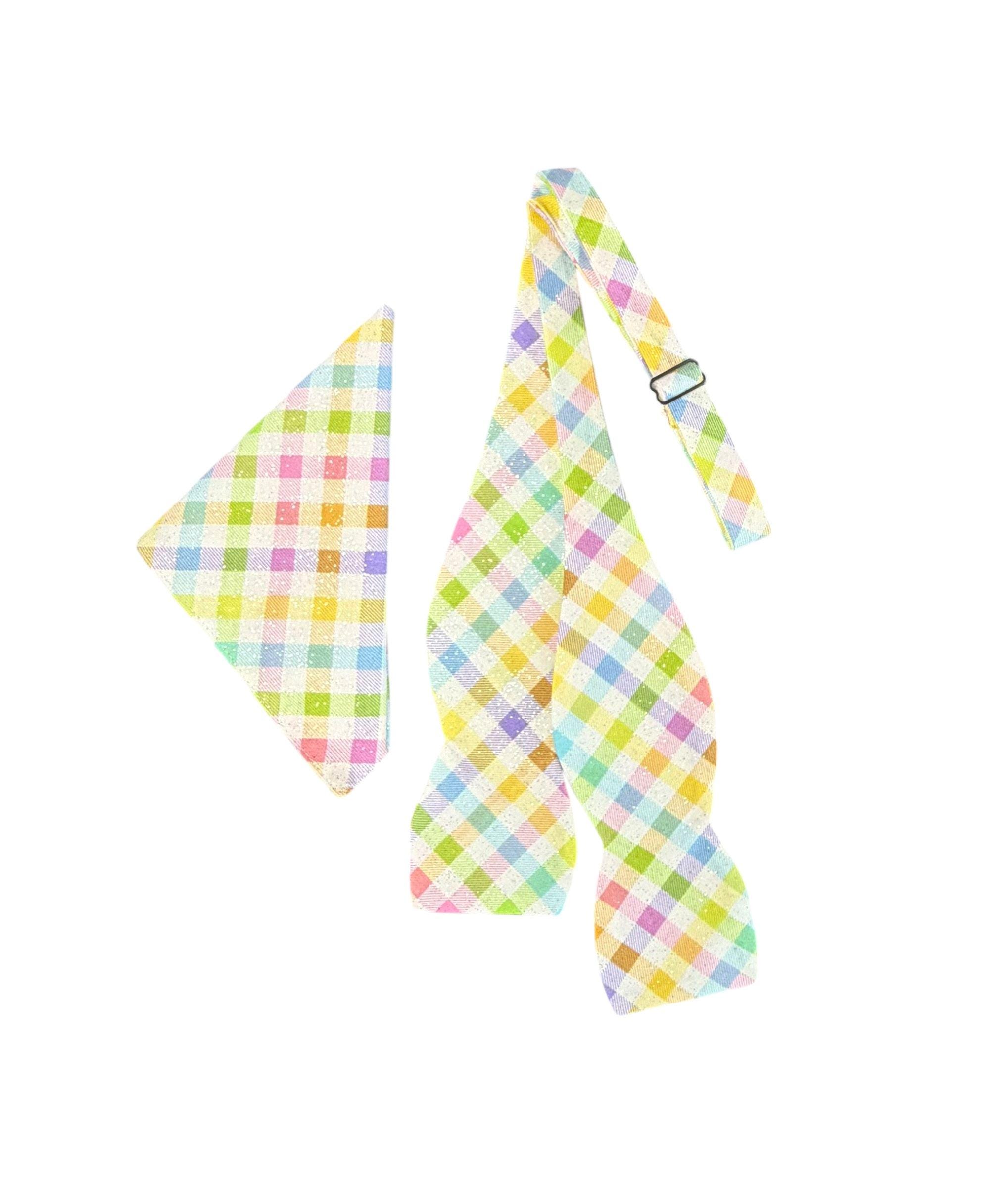 Handmade Self-tie Bow Tie Easter Self-tie Bow Tie & Pocket Square Set - Pastel Spring Plaid with Iridescent Sparkle - Adult Men's and Boys Sizing - Holiday Bow Ties, LLC - The "Palmer" Bow Tie Set
