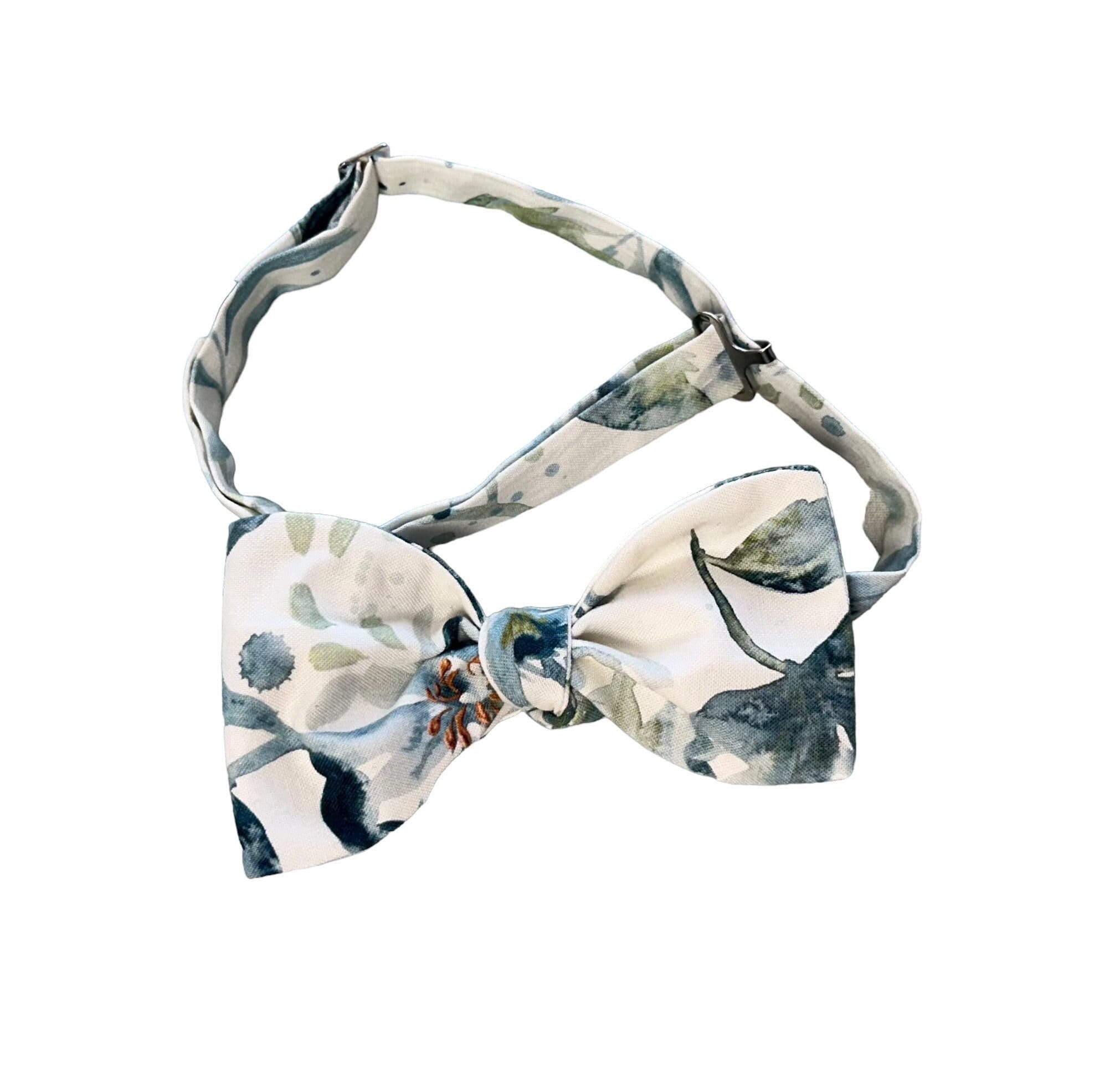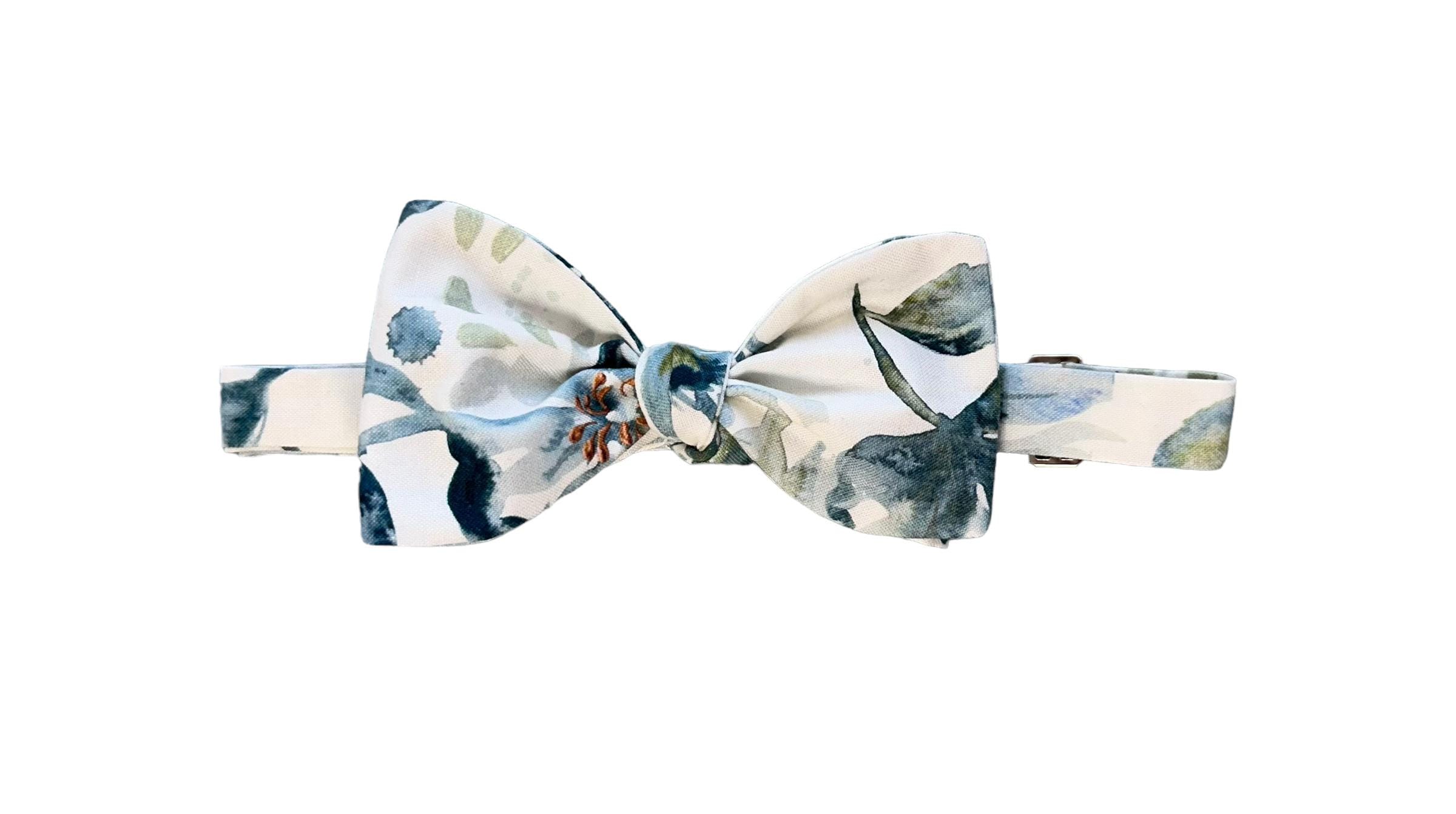 Handmade Pretied Bow Tie - Vintage Dusty Blue Teal Floral Medley in Shades of Green, Blue, Tan, Sage, Teal and Candlelight - Men's Sizing - Crafted in the USA by Holiday Bow Ties, llc - The "Myles"