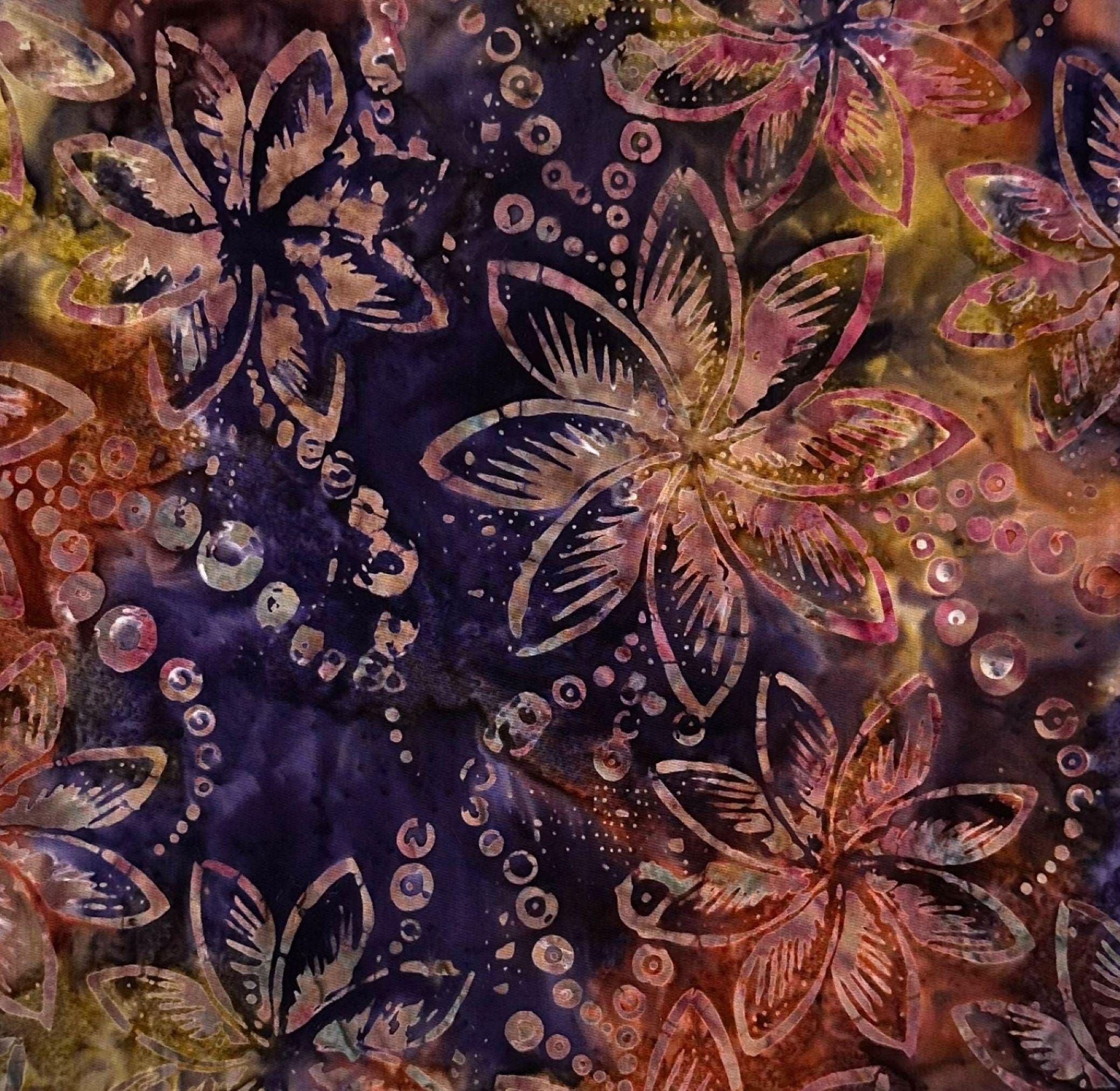 Colors: Rich plum purple with shades of gold and pinks.