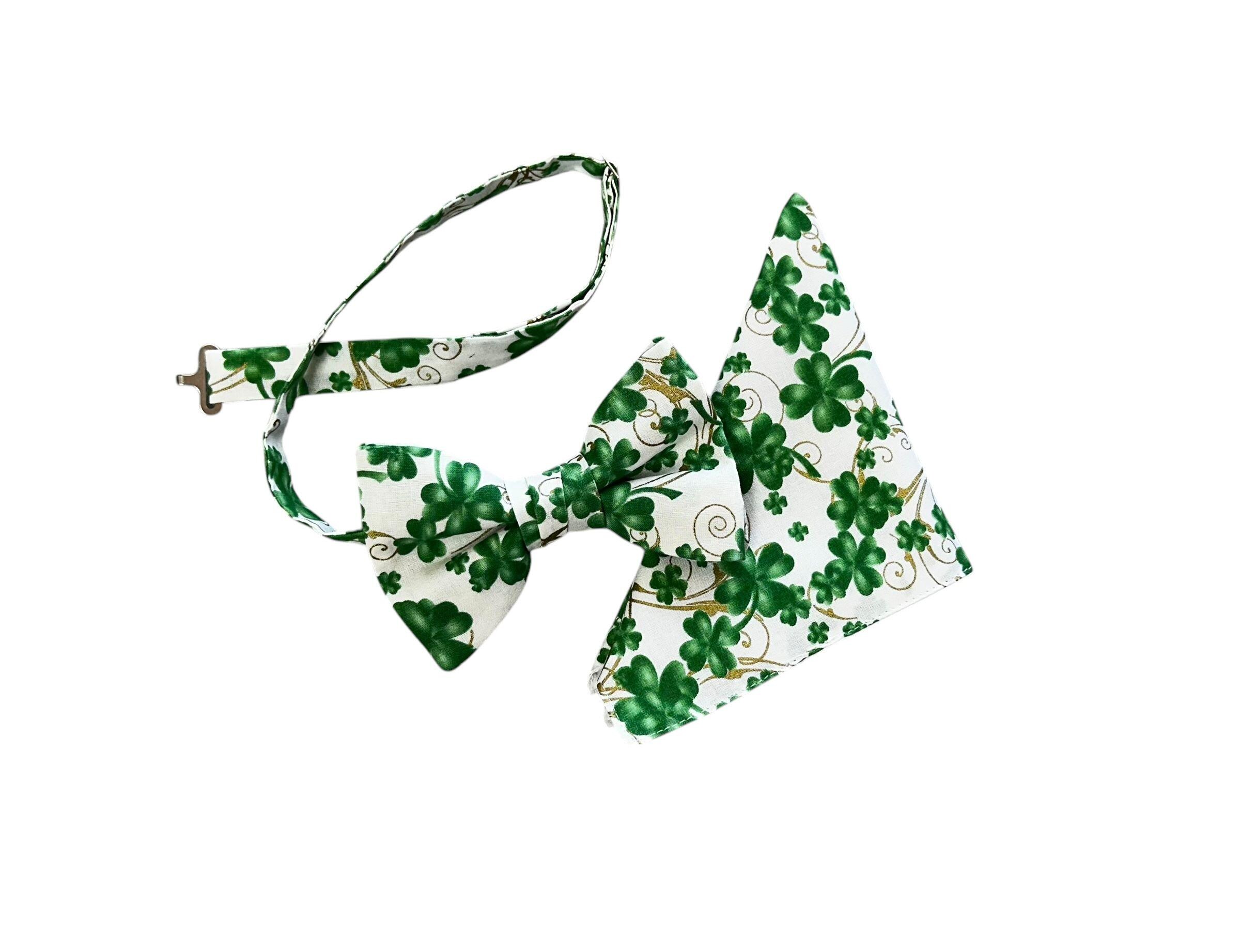 Handmade St. Patrick's Day Pretied Bow Tie and Pocket Square Handkerchief Set - Scattered Shamrock Clovers in Shades of Green on White with Gold Metallic Swirls - Premium Cotton - Adult Mens Sizing - Crafted in the USA by Holiday Bow Ties, LLC - The "Liam" Bow Tie and Pocket Square Set