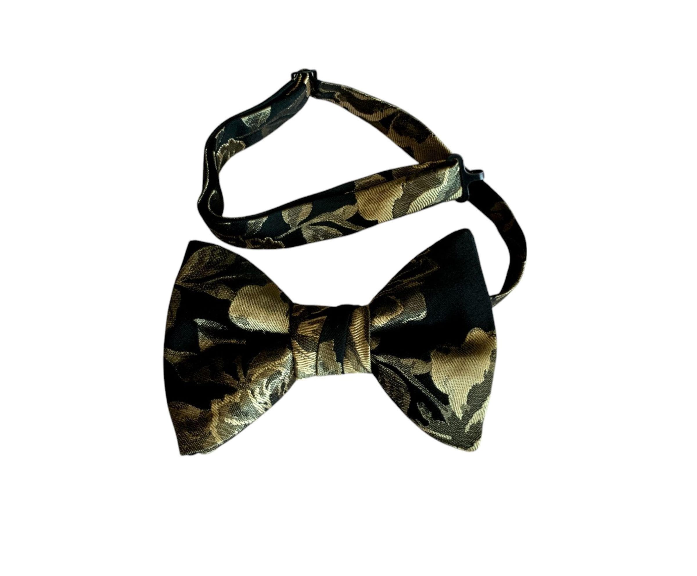 Men's Bow Tie Pretied and Adjustable - Black with Gold Metallic Shimmering Floral Medley - Premium Polyester Satin - Adult Men's Sizing - Handcrafted in the USA by Holiday Bow Ties, LLC - The "Albert" Bow Tie