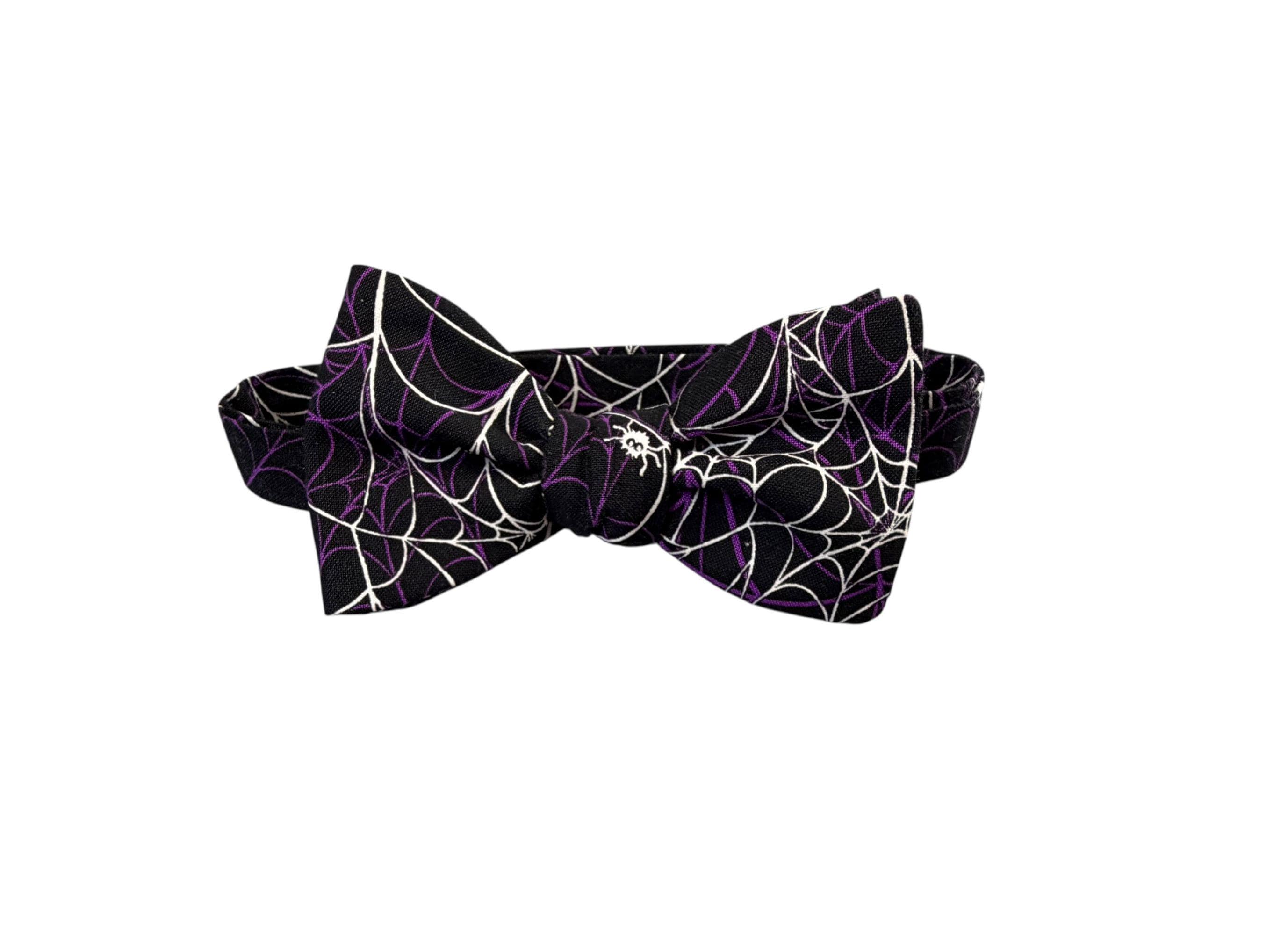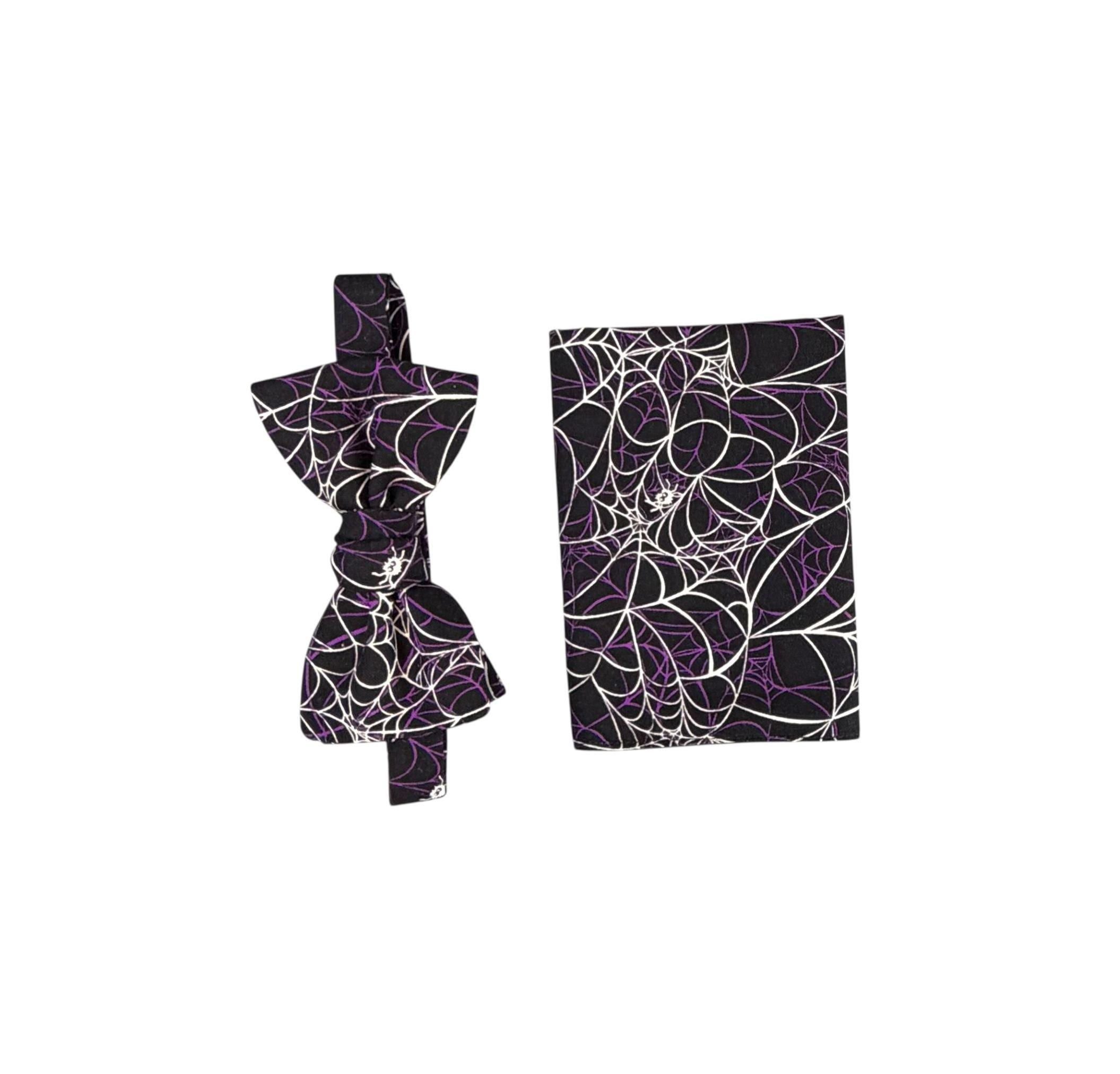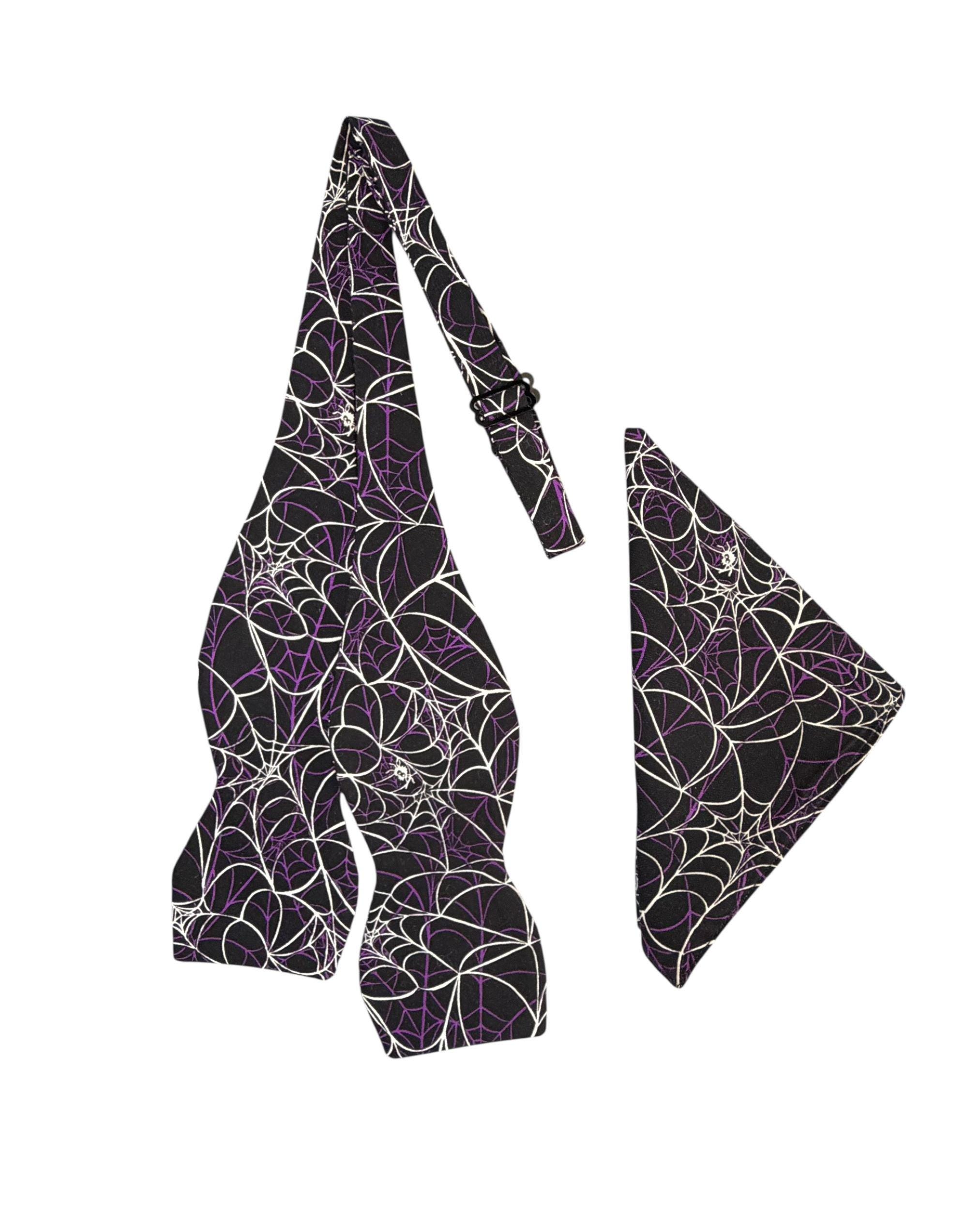 Handmade Self-tie Bow Tie and Pocket Handkerchief Set - Festive Spider Web Halloween Design - Black with Purple and White Webs - Premium Cotton Bow Tie - Adult Men's Sizing - Crafted in the USA by Holiday Bow Ties, LLC - The "Emmett" Bow Tie and Pocket Square Set
