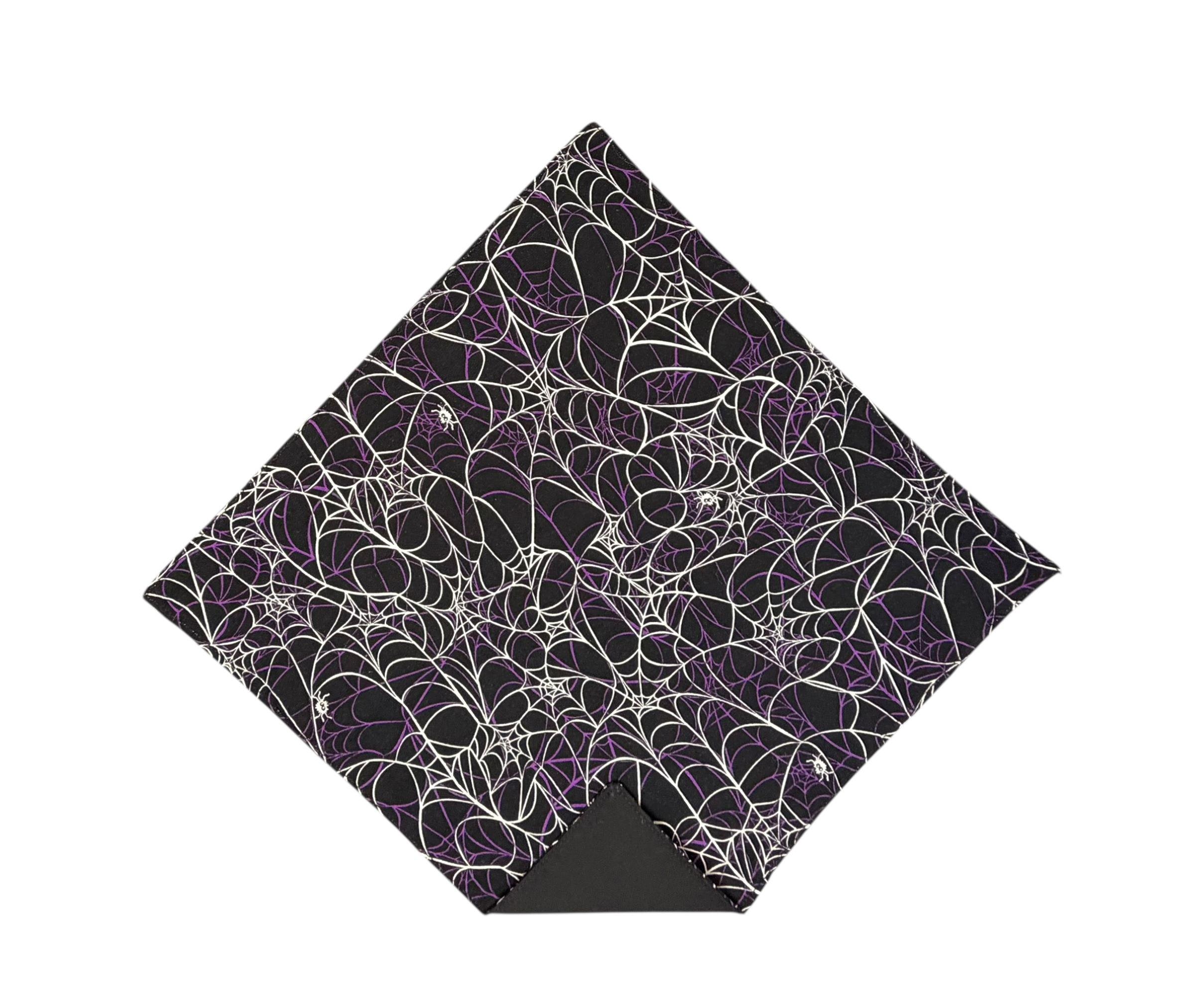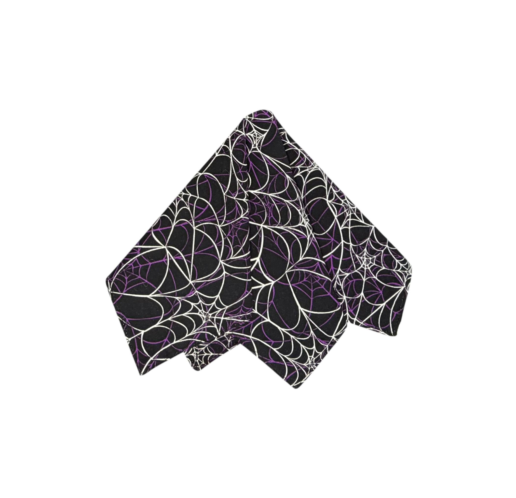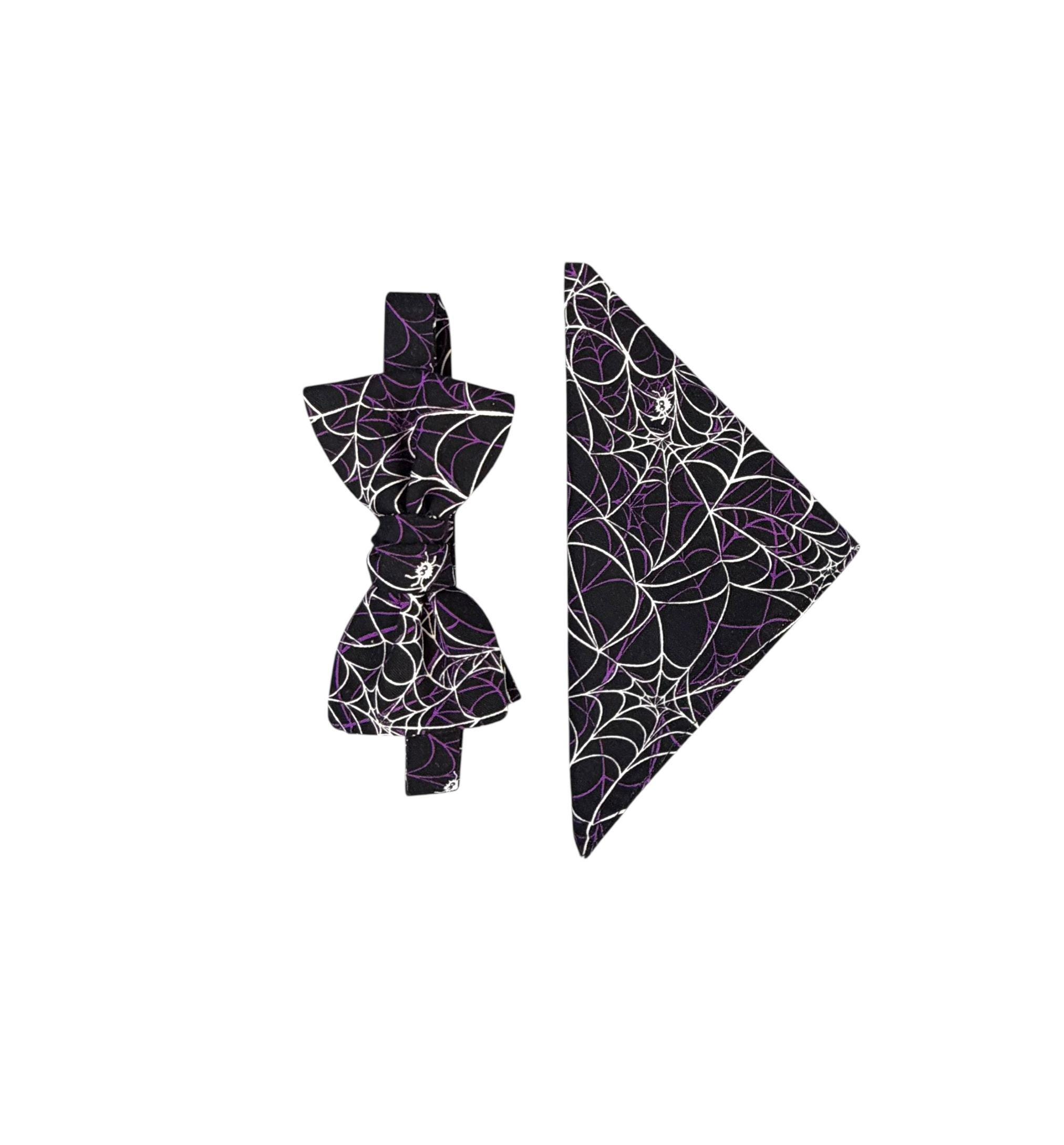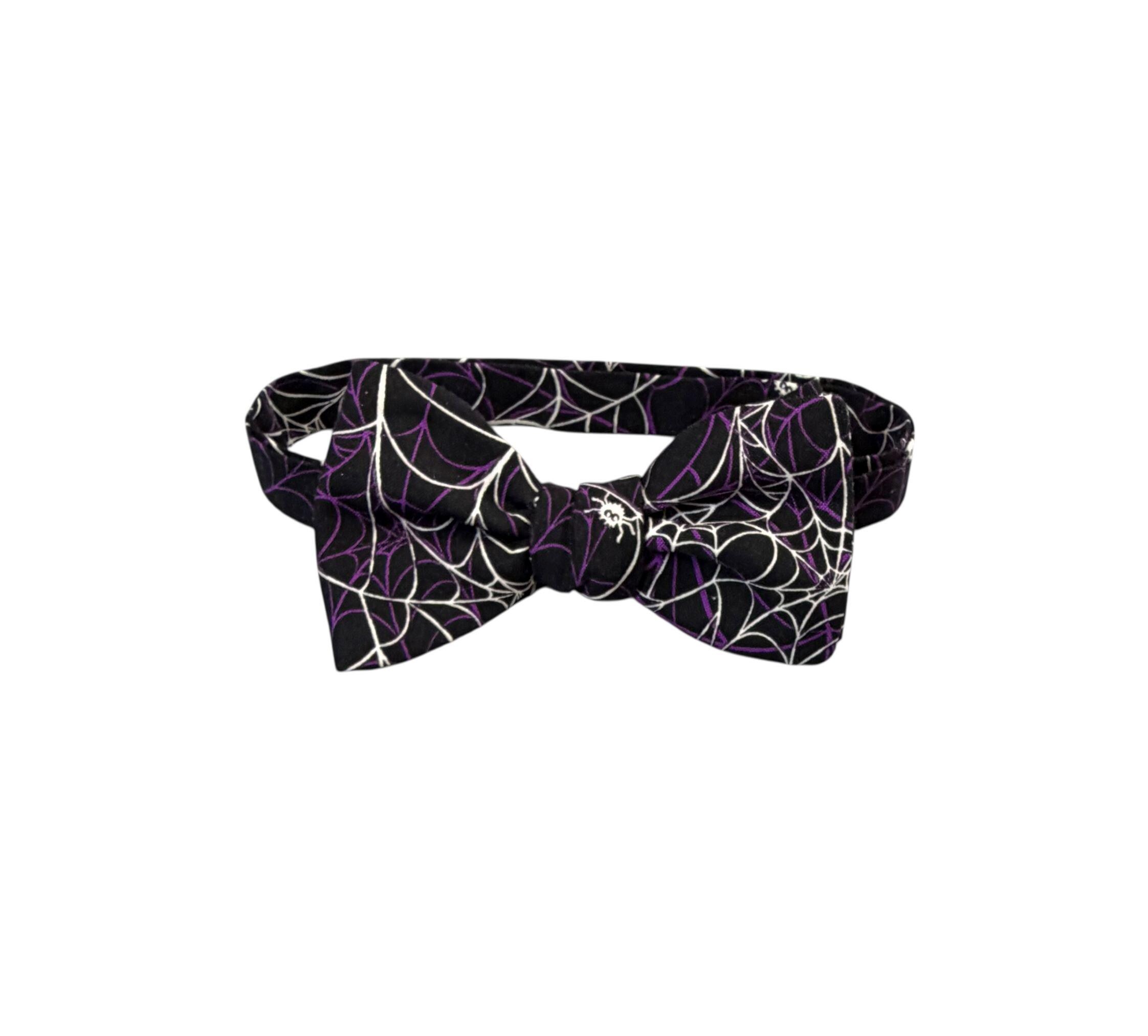 Handmade Self-tie Bow Tie and Pocket Handkerchief Set - Festive Spider Web Halloween Design - Black with Purple and White Webs - Premium Cotton Bow Tie - Adult Men's Sizing - Crafted in the USA by Holiday Bow Ties, LLC - The "Emmett" Bow Tie and Pocket Square Set
