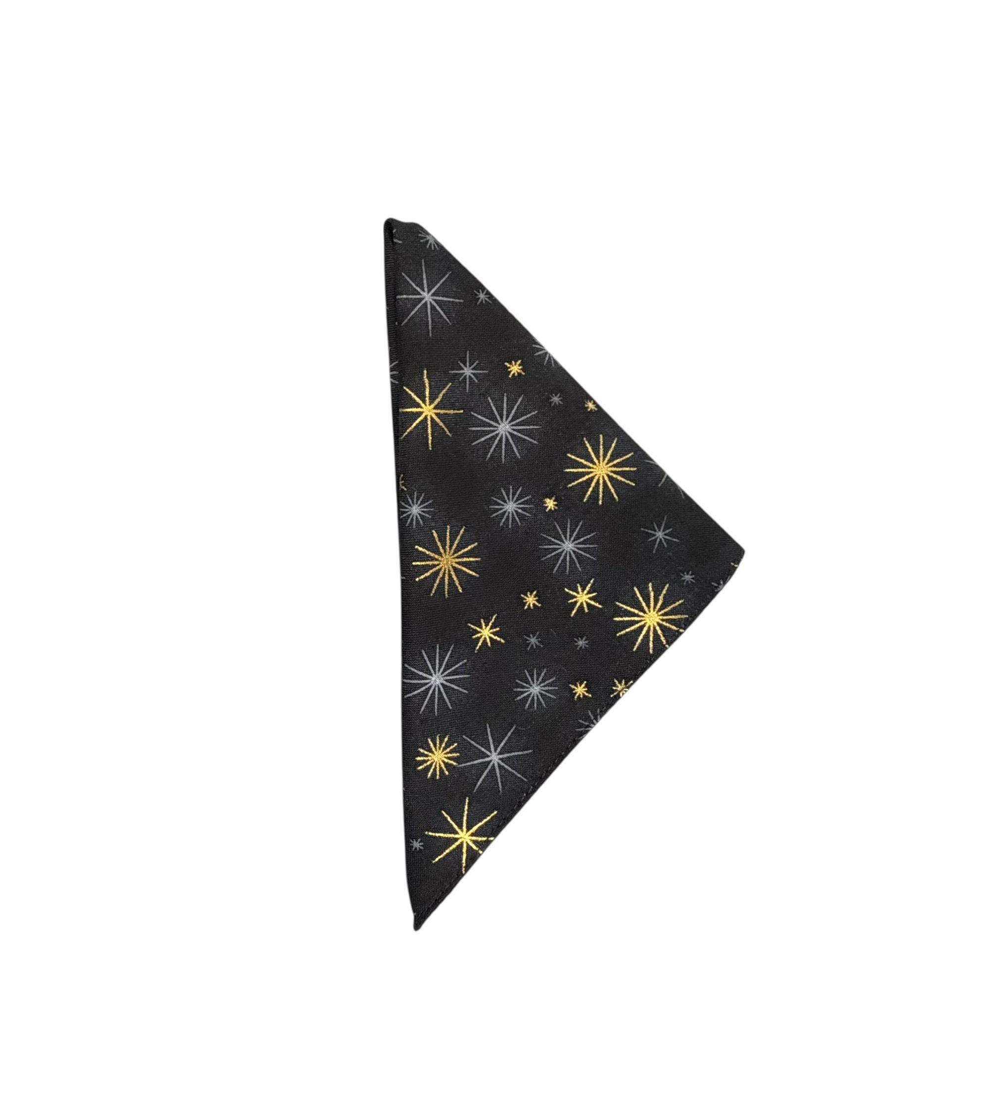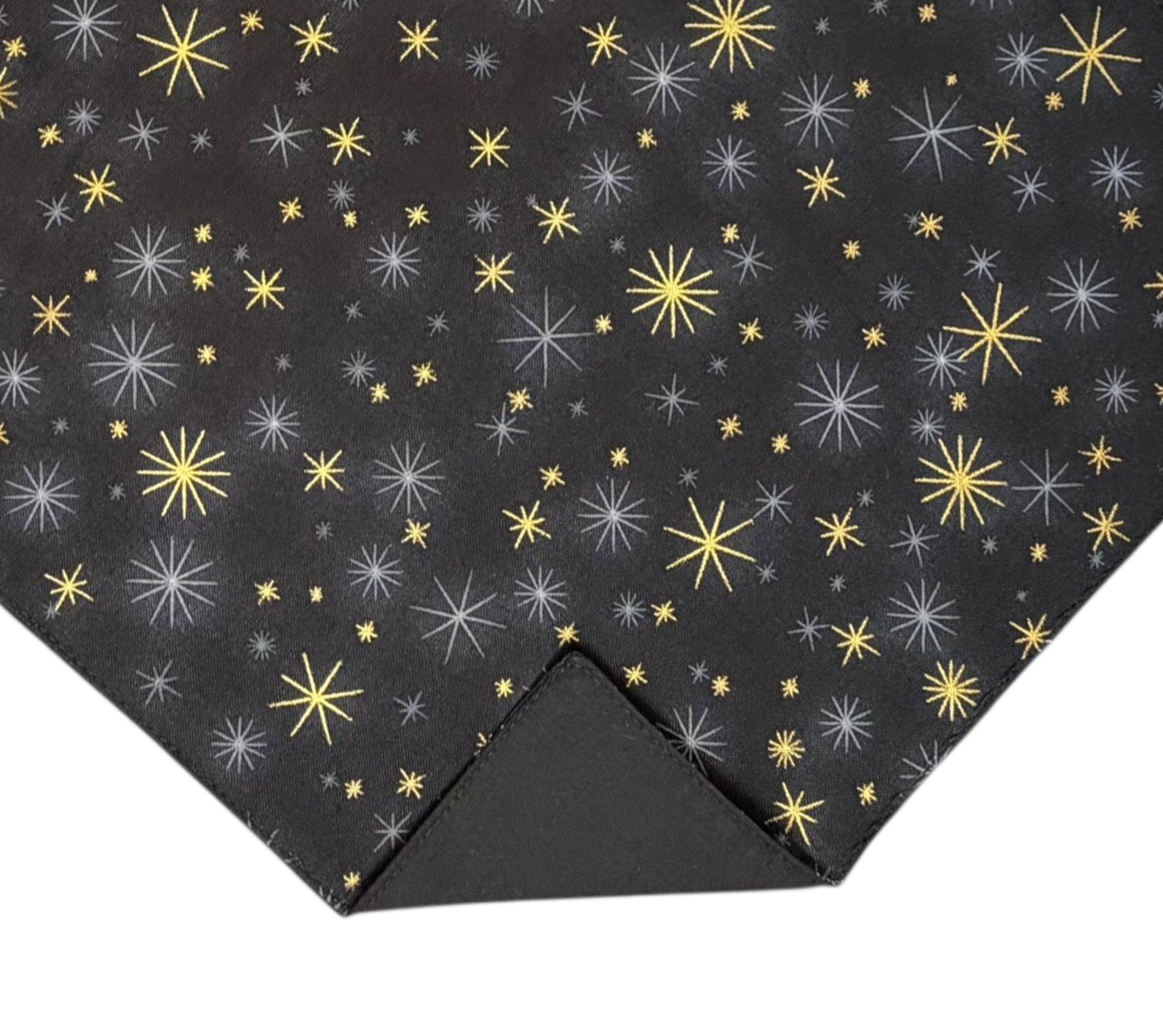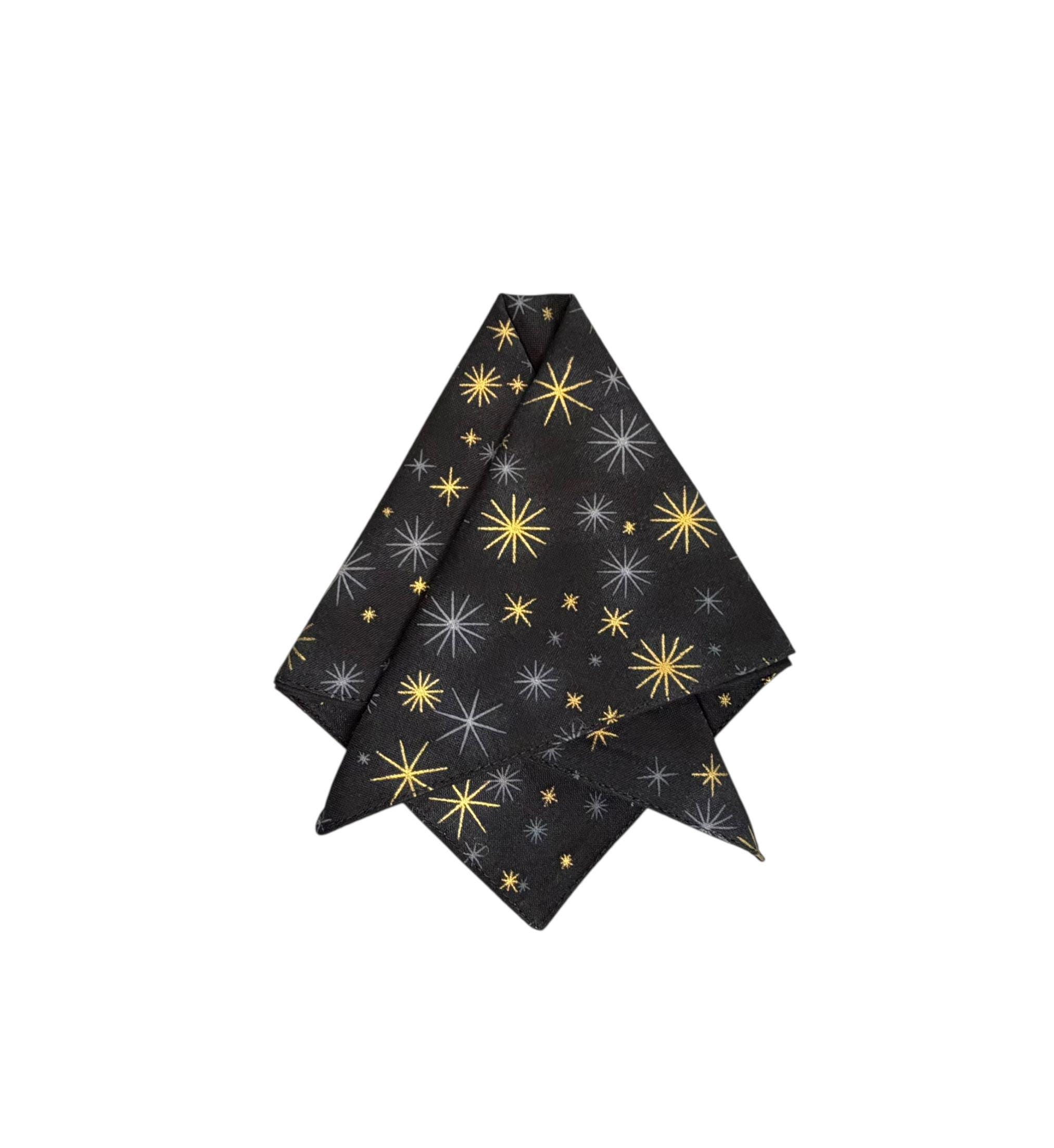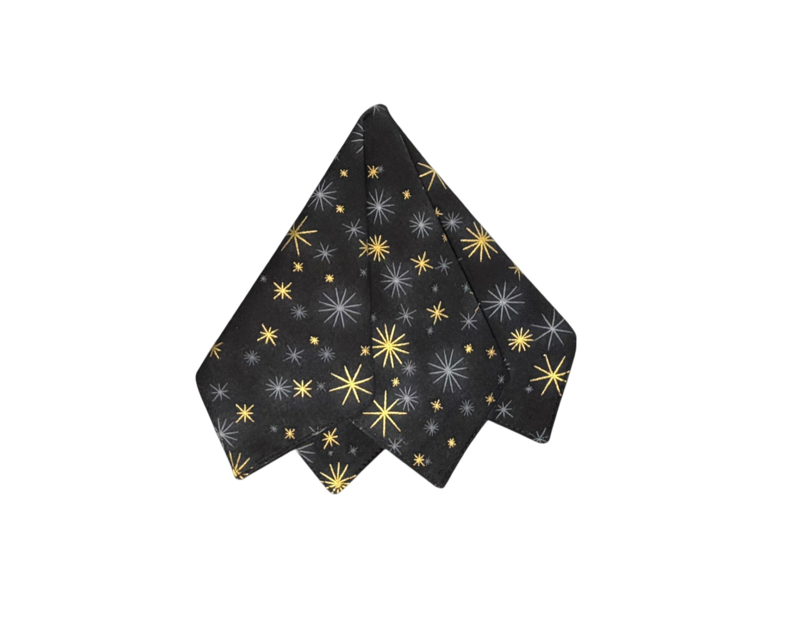 Pocket Square - Black with Gold Metallic Stars Holiday Design - Wedding - Prom Night - Cotton Handkerchief - Adult Men's Sizing - Handcrafted in the USA by Holiday Bow Ties, llc - The "Oakly"