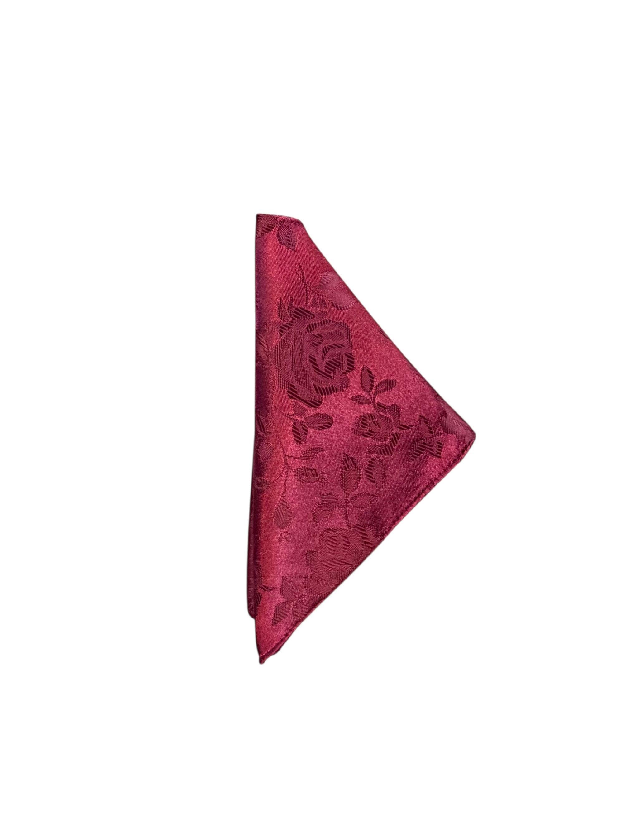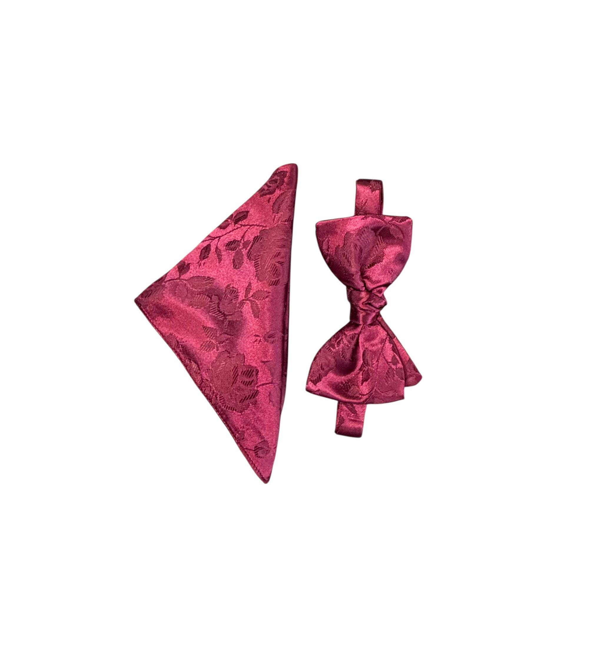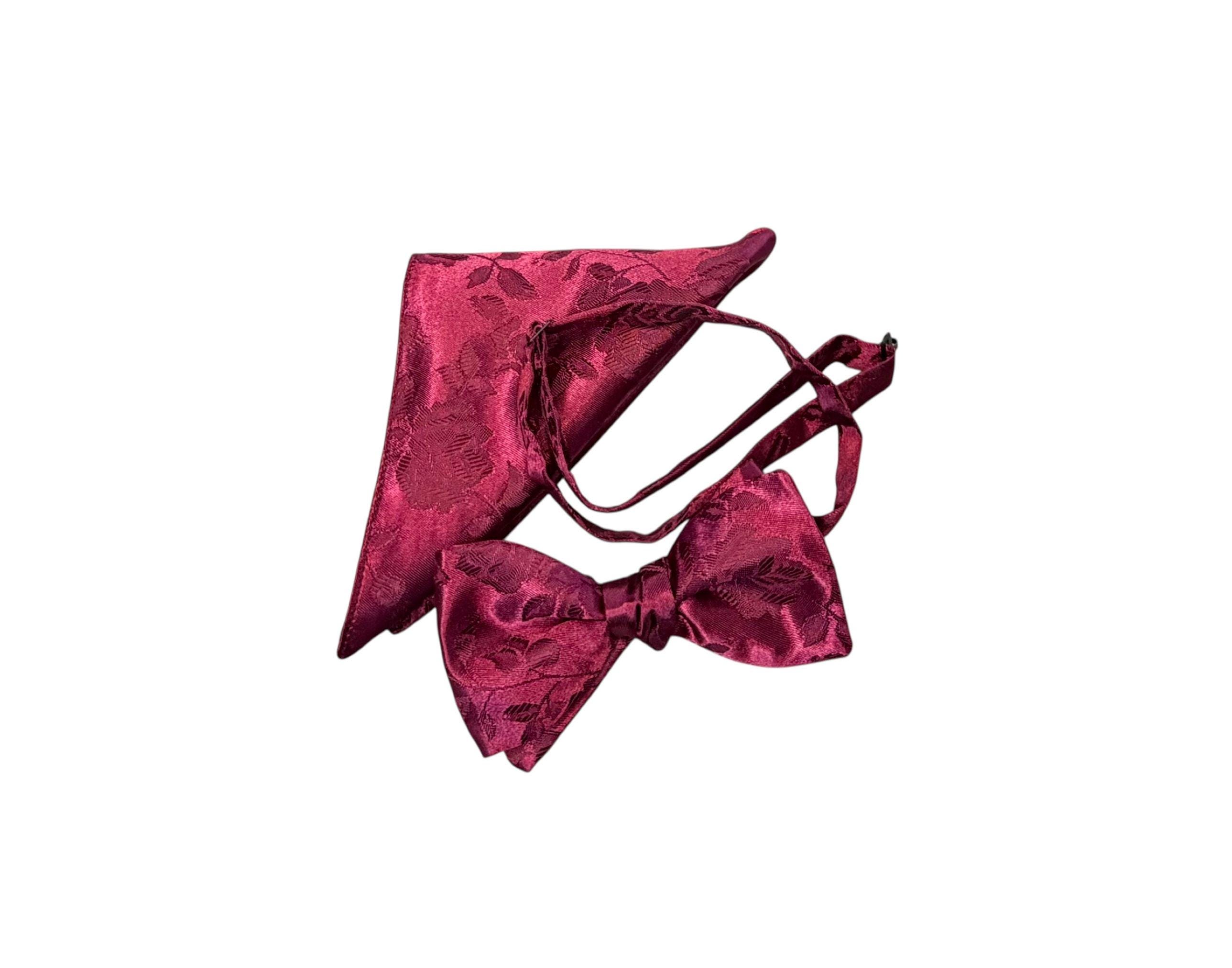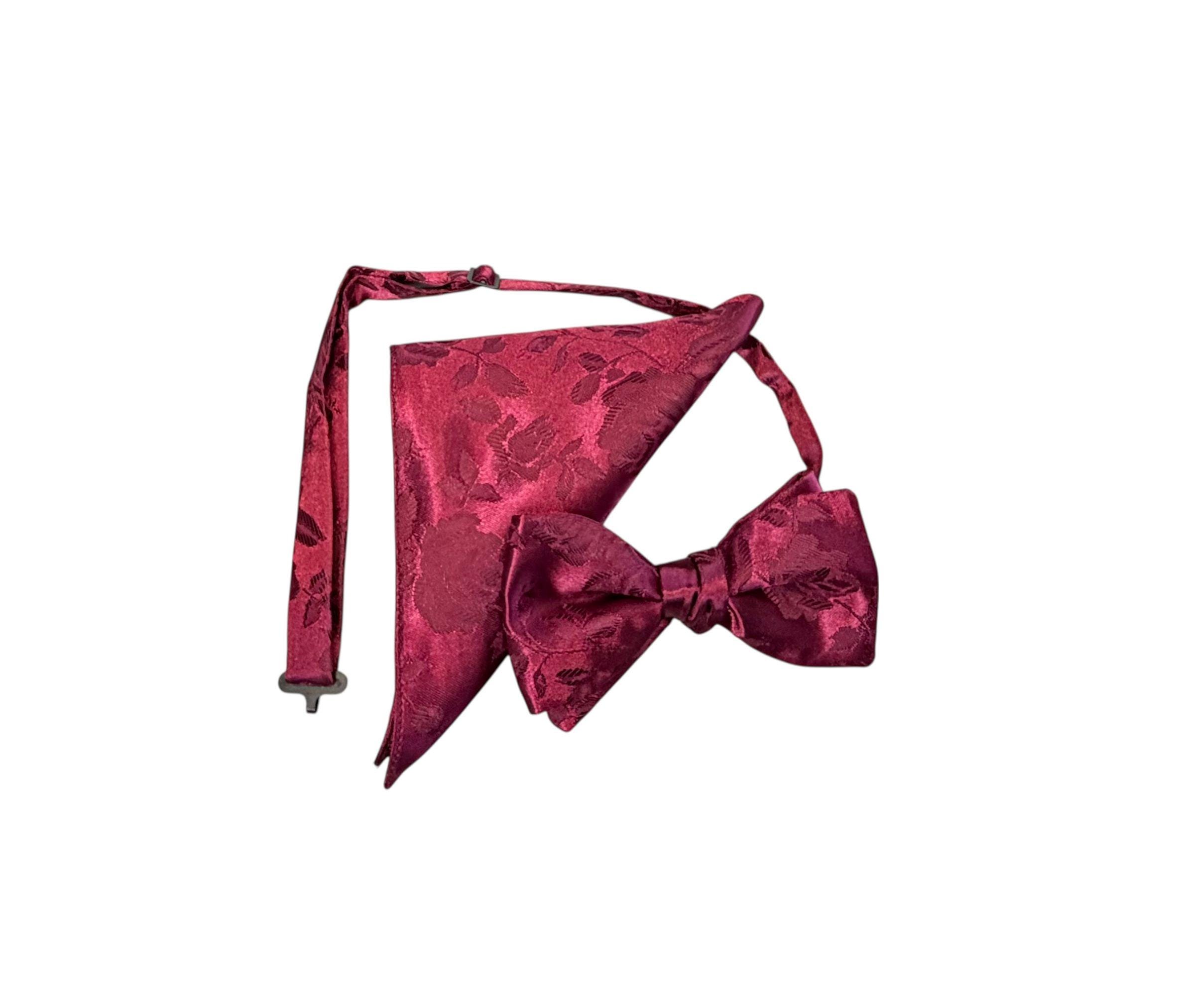Pretied Adjustable Bow Tie and Pocket Square Set - Burgundy Embossed Rose Satin Brocade - Adult Mens Sizing - Crafted in the USA by Holiday Bow Ties, LLC - The "Lee" Bow Tie and Pocket Square Set