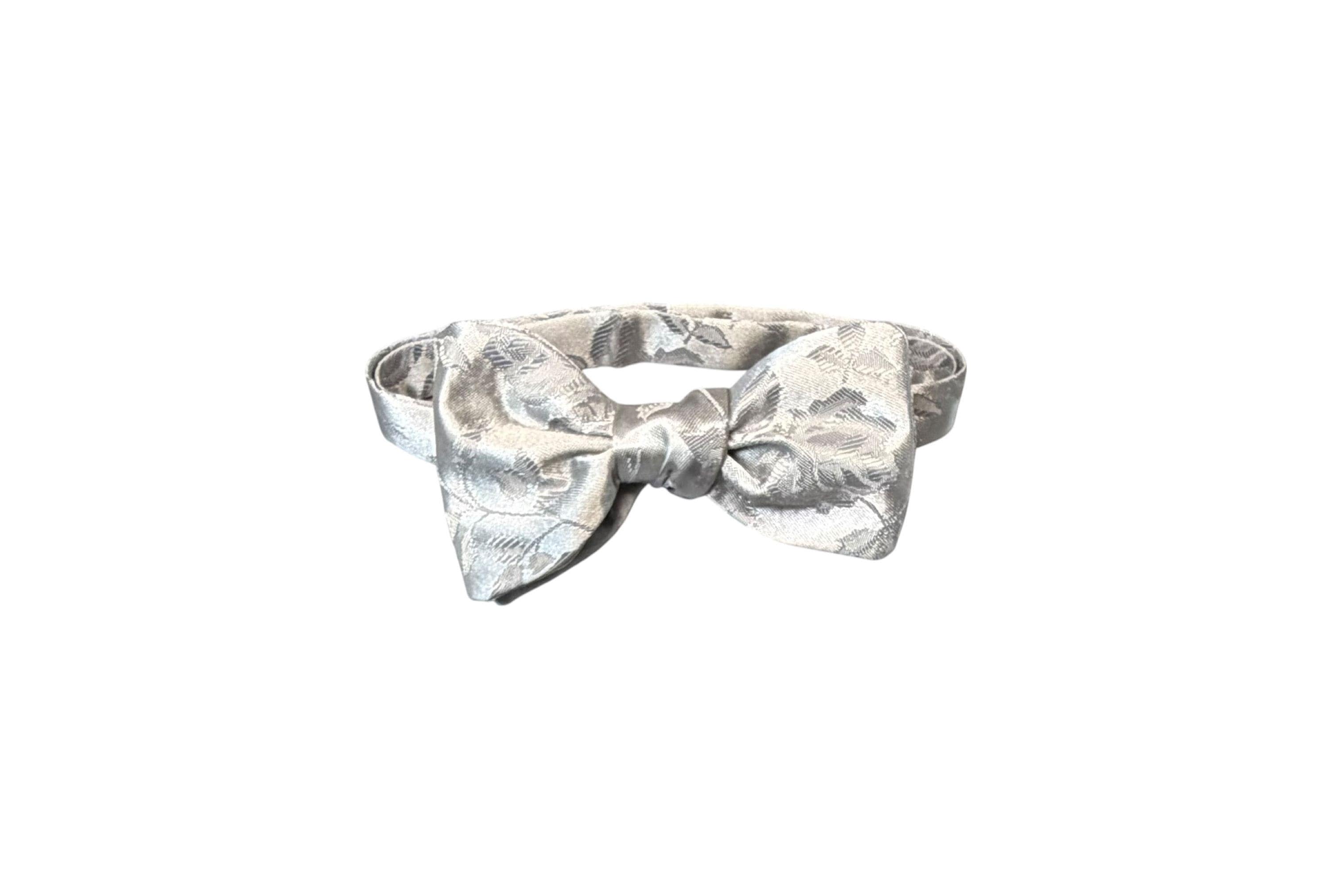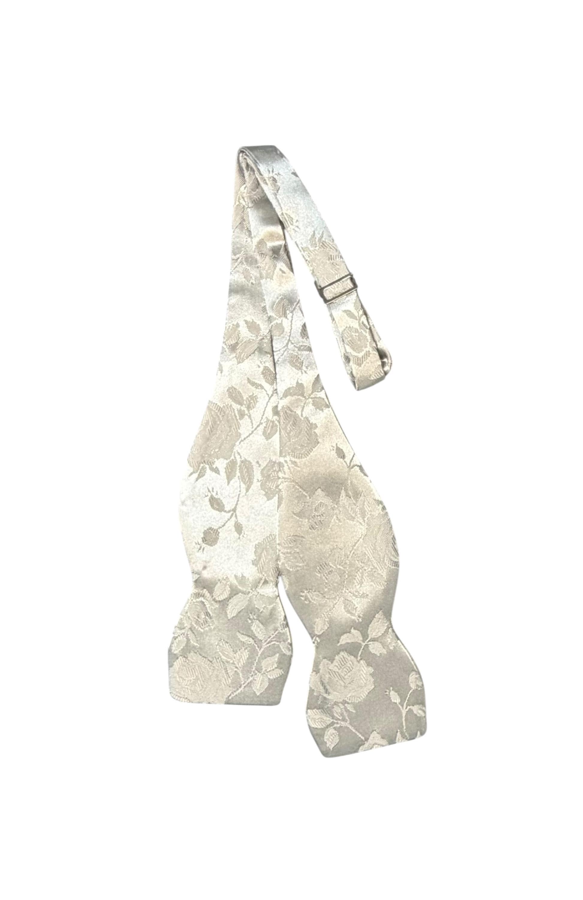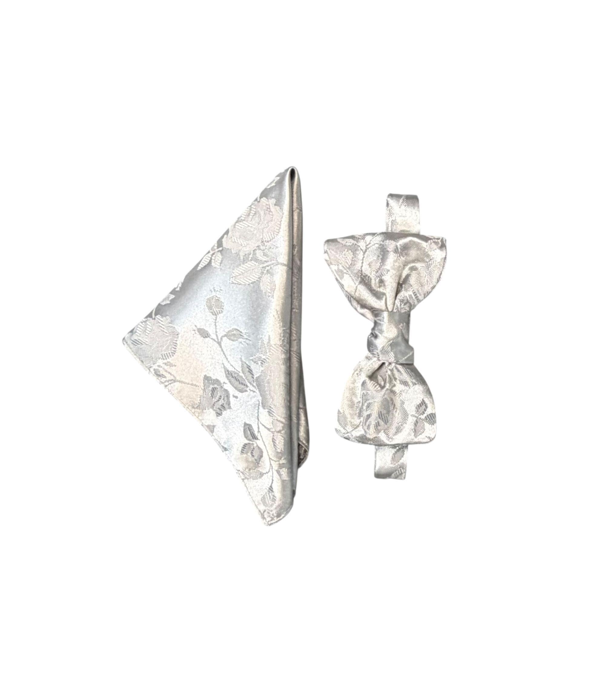 Self-tie Adjustable Bow Tie and Pocket Square Set - Silver Grey Embossed Rose Satin Brocade - Adult Mens Sizing - Crafted in the USA by Holiday Bow Ties, LLC - The "Lee" Bow Tie and Pocket Square Set