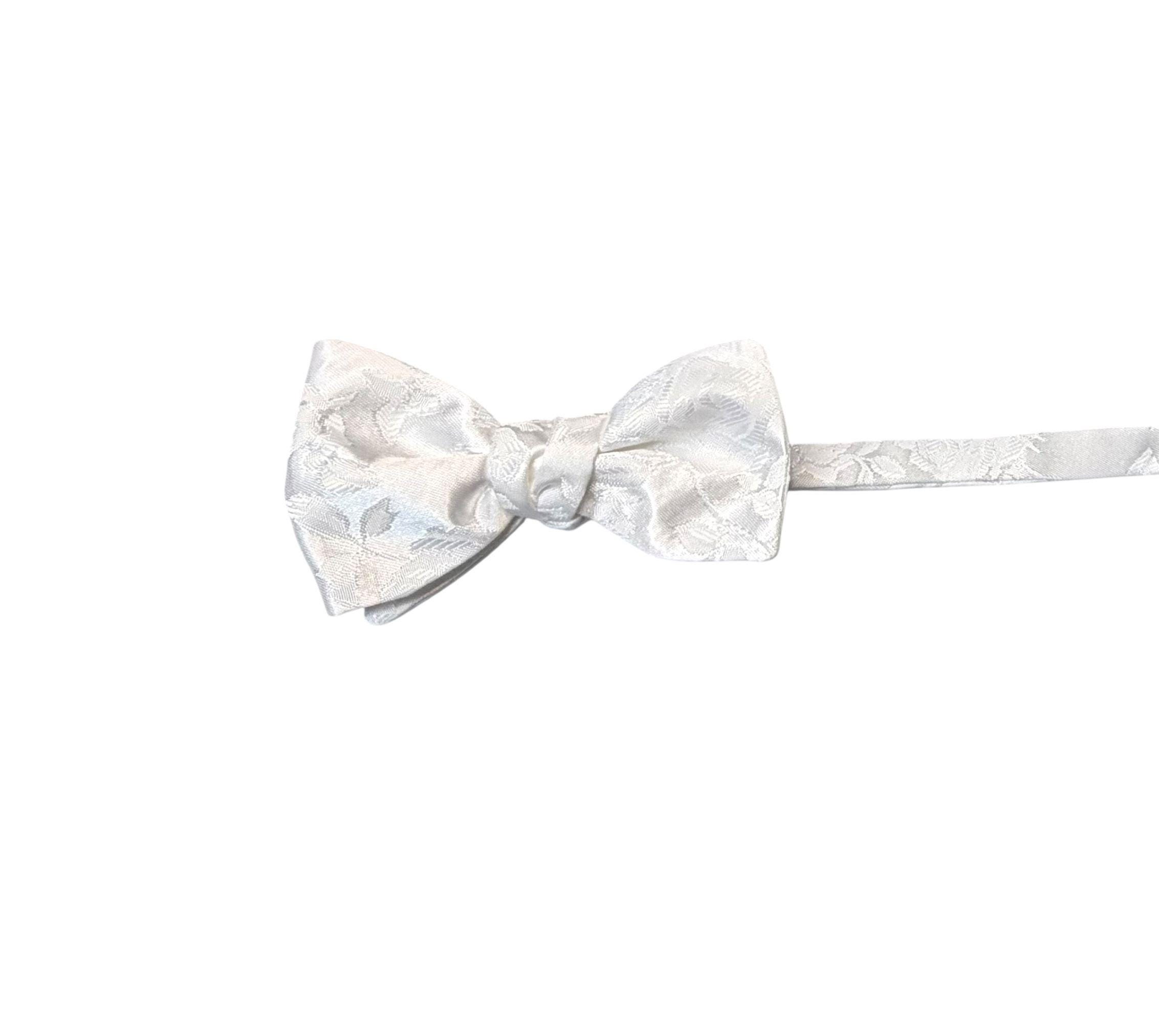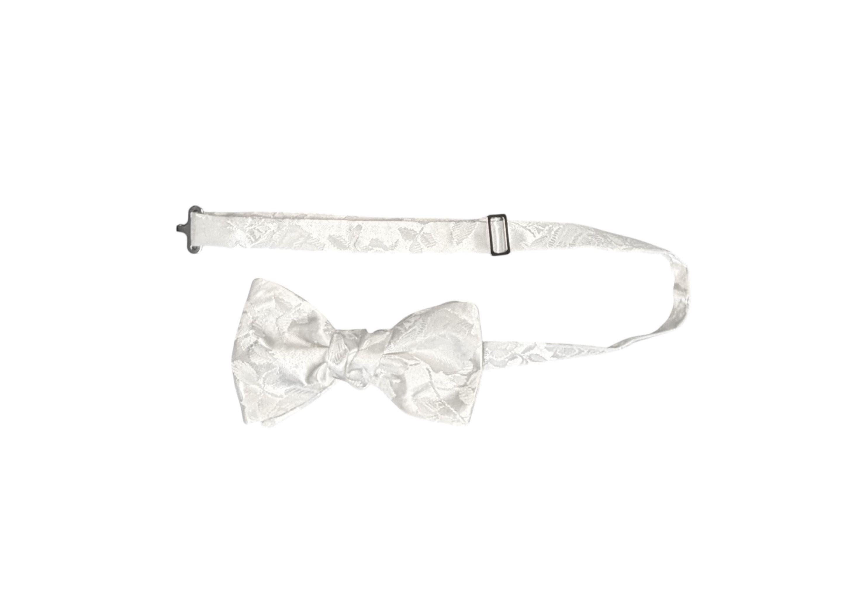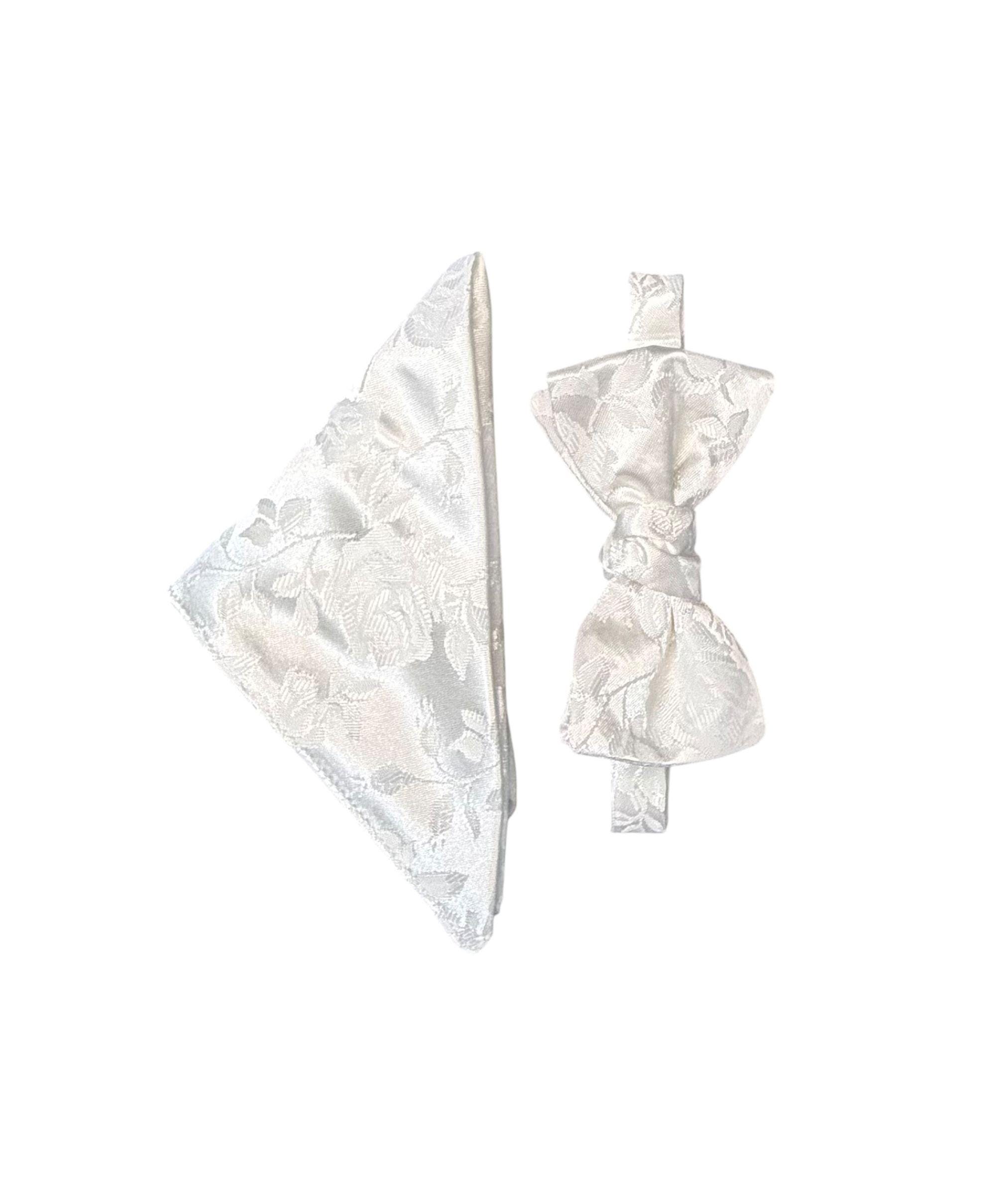 Pretied Adjustable Bow Tie and Pocket Square Set - White on White Embossed Floral Rose Satin Brocade - Adult Mens Sizing - Crafted in the USA by Holiday Bow Ties, LLC - The "Lee" Bow Tie and Pocket Square Set