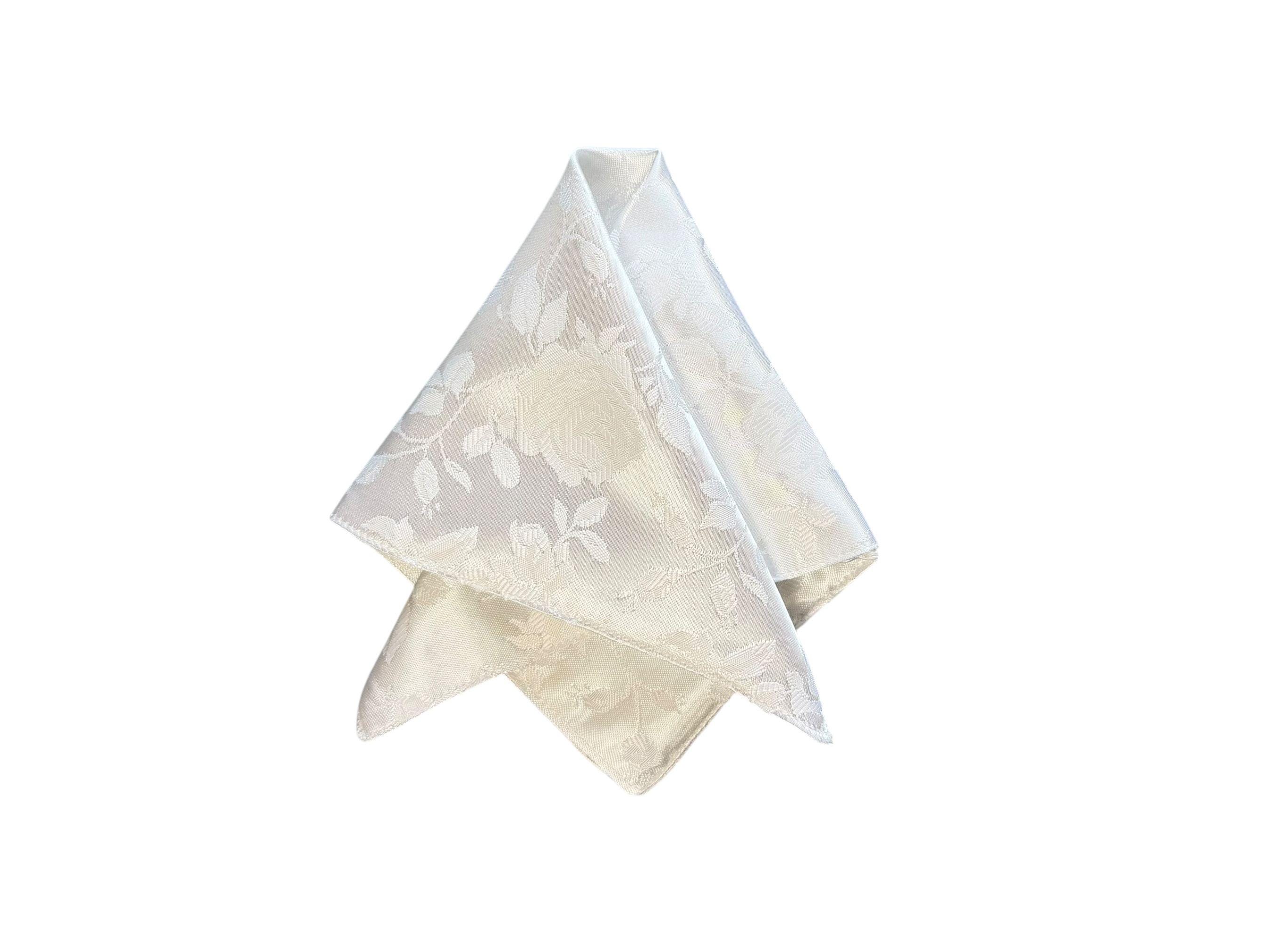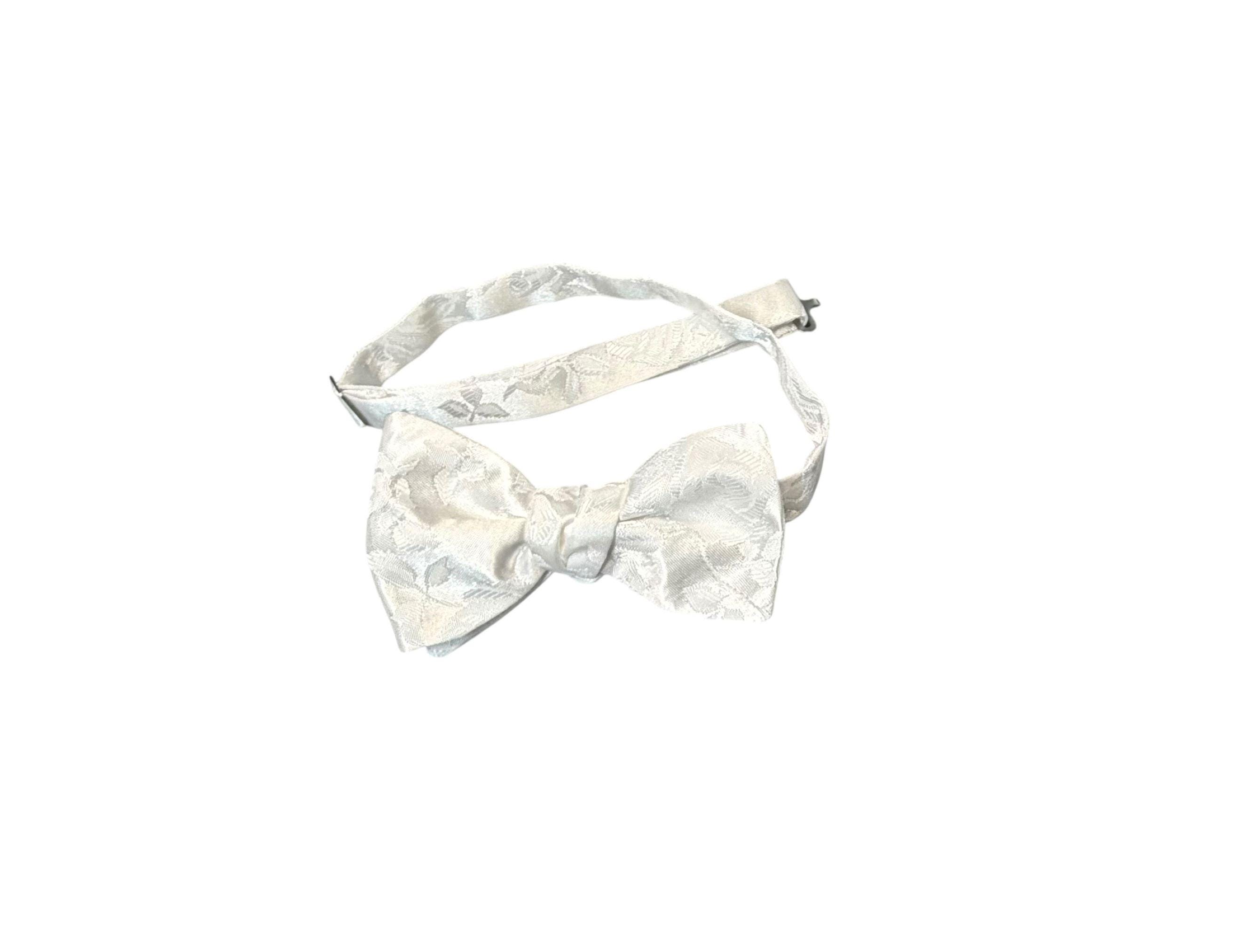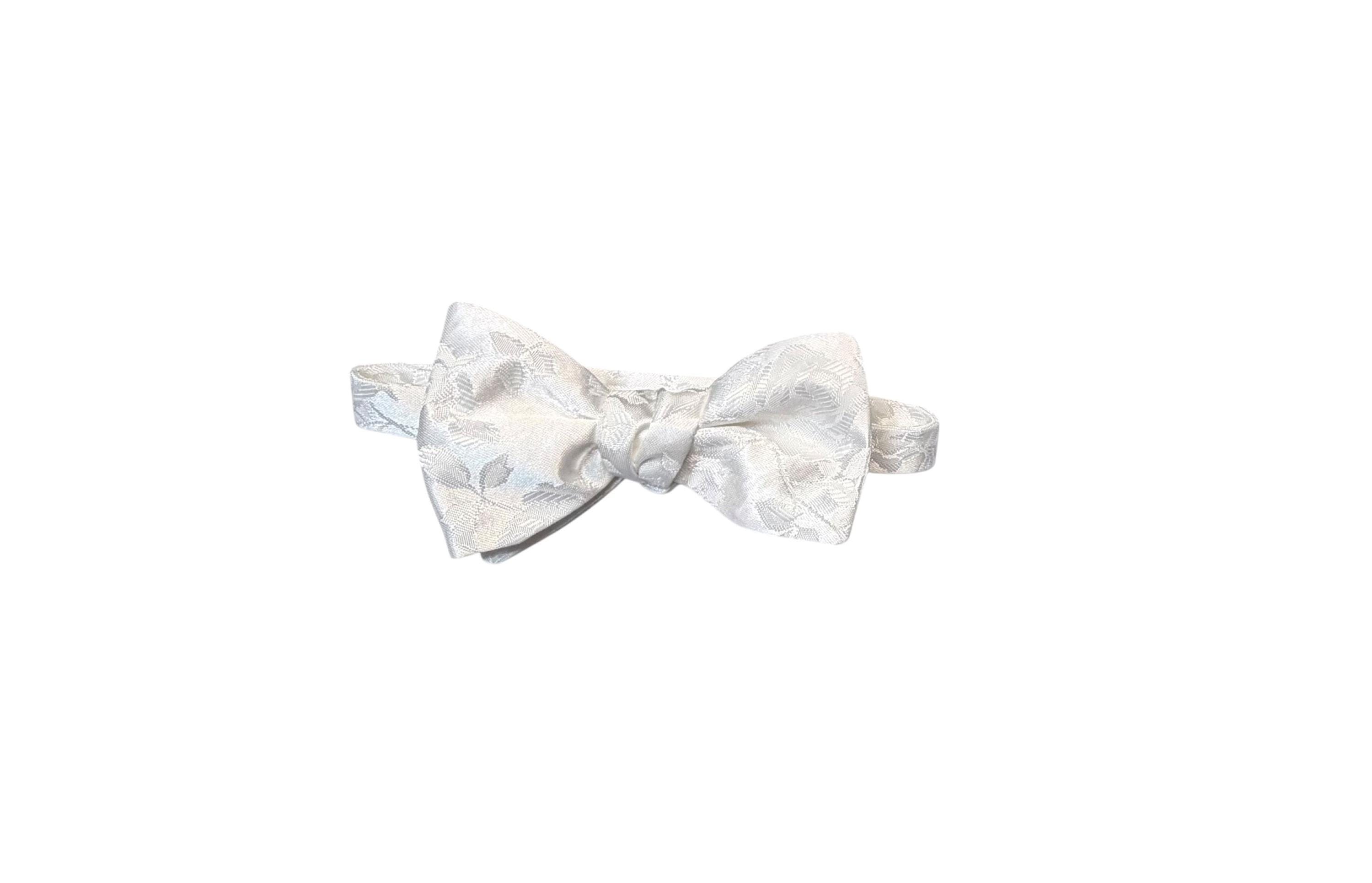 Pretied Adjustable Bow Tie and Pocket Square Set - White on White Embossed Floral Rose Satin Brocade - Adult Mens Sizing - Crafted in the USA by Holiday Bow Ties, LLC - The "Lee" Bow Tie and Pocket Square Set