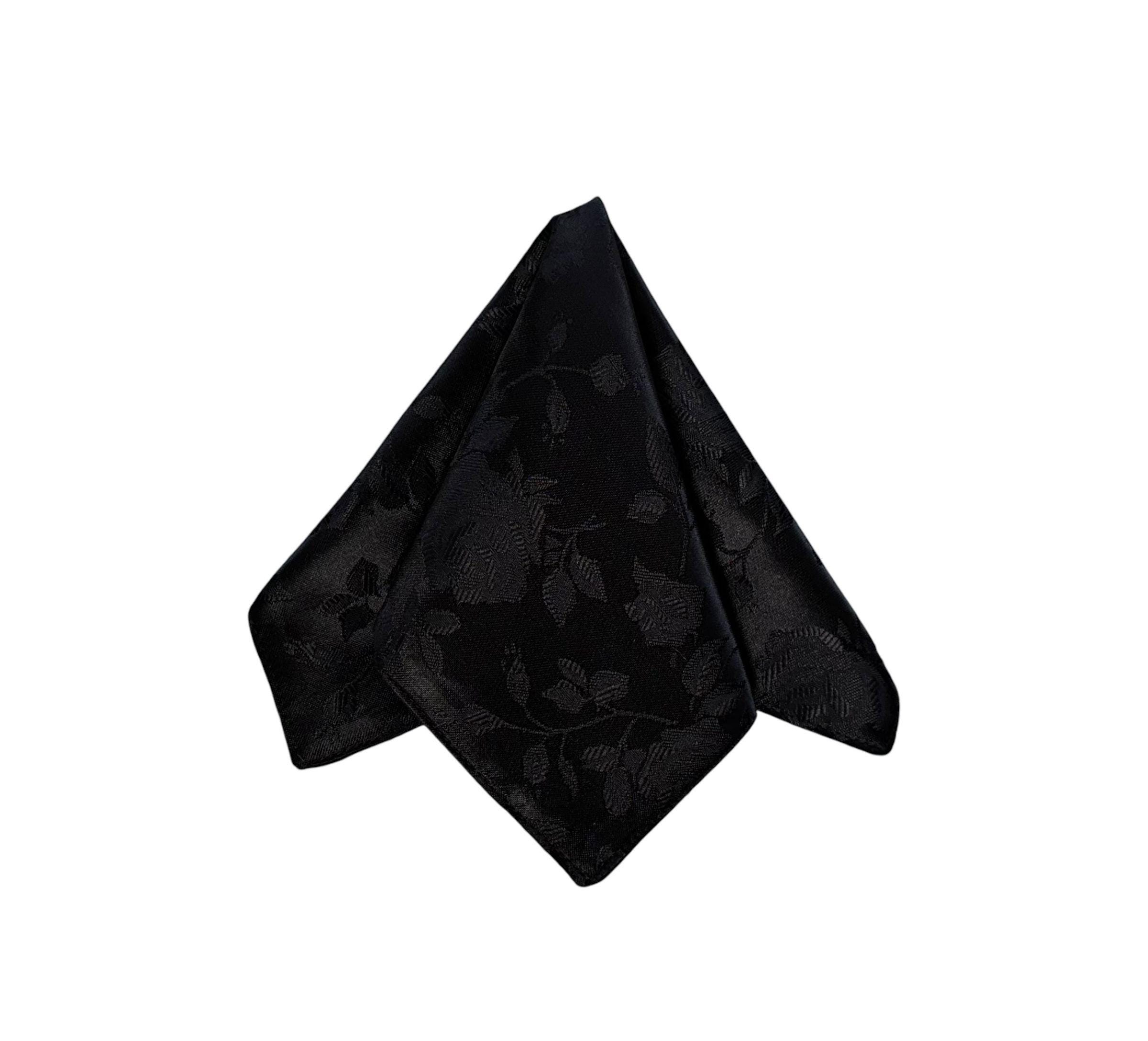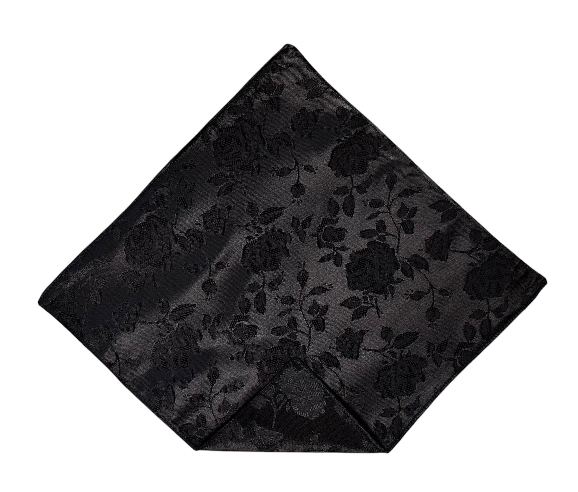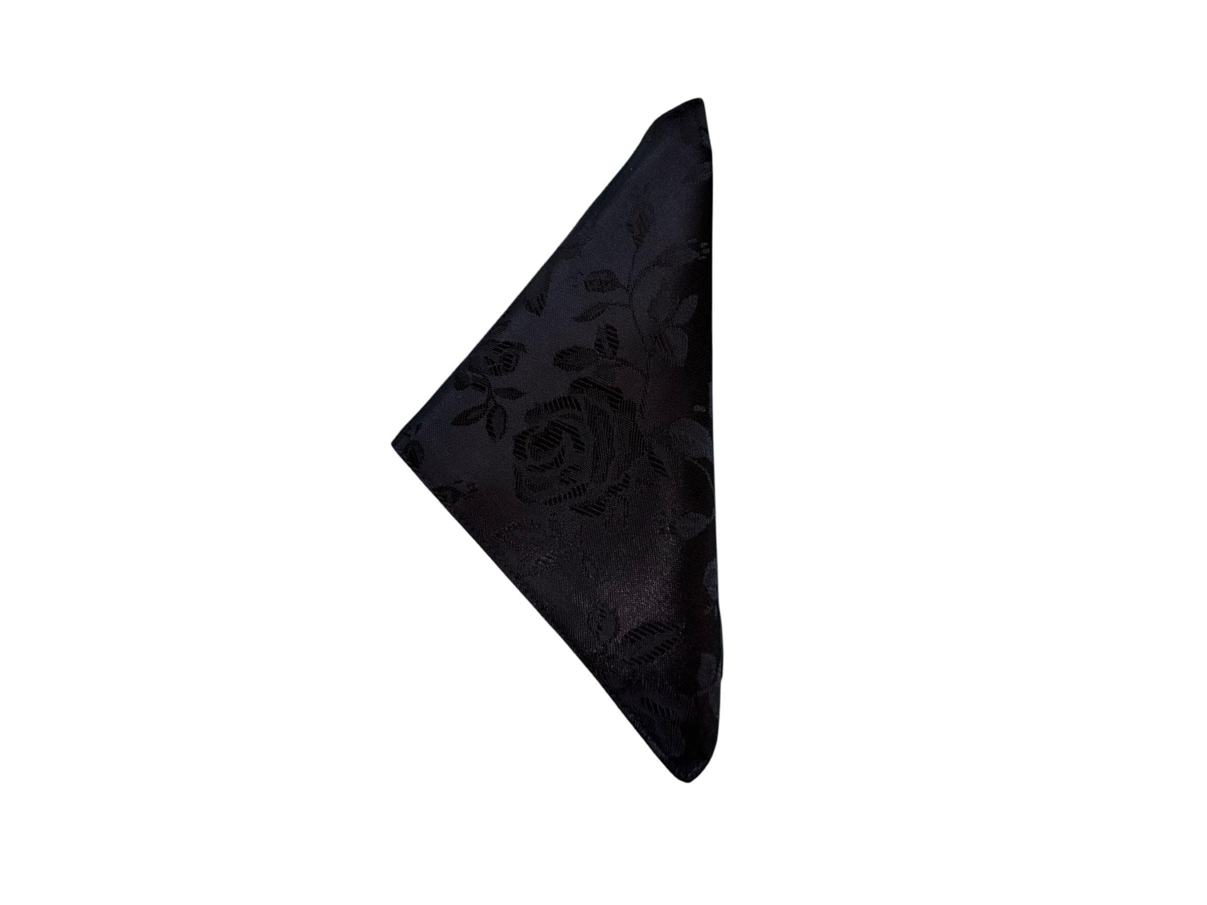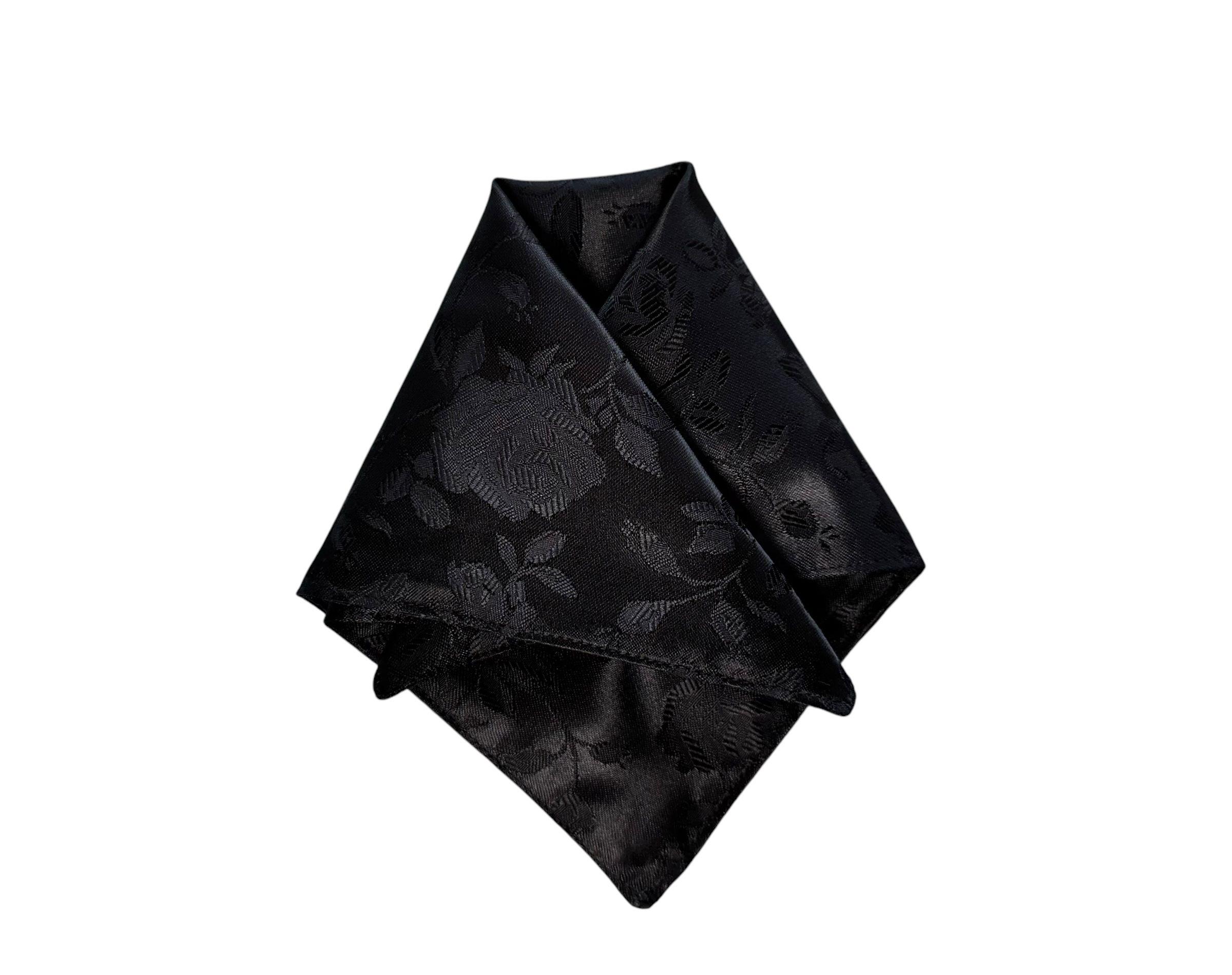 Self-tie Adjustable Bow Tie and Pocket Square Set - Black on Black Embossed Rose Satin Brocade - Adult Mens Sizing - Crafted in the USA by Holiday Bow Ties, LLC - The "Lee" Bow Tie and Pocket Square Set