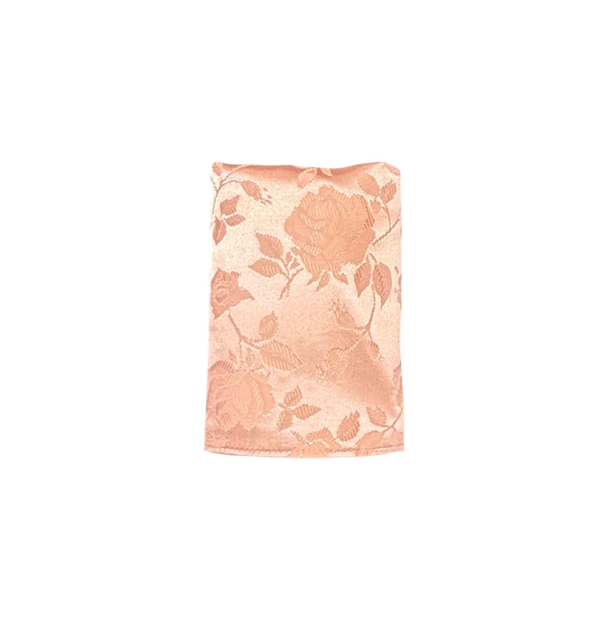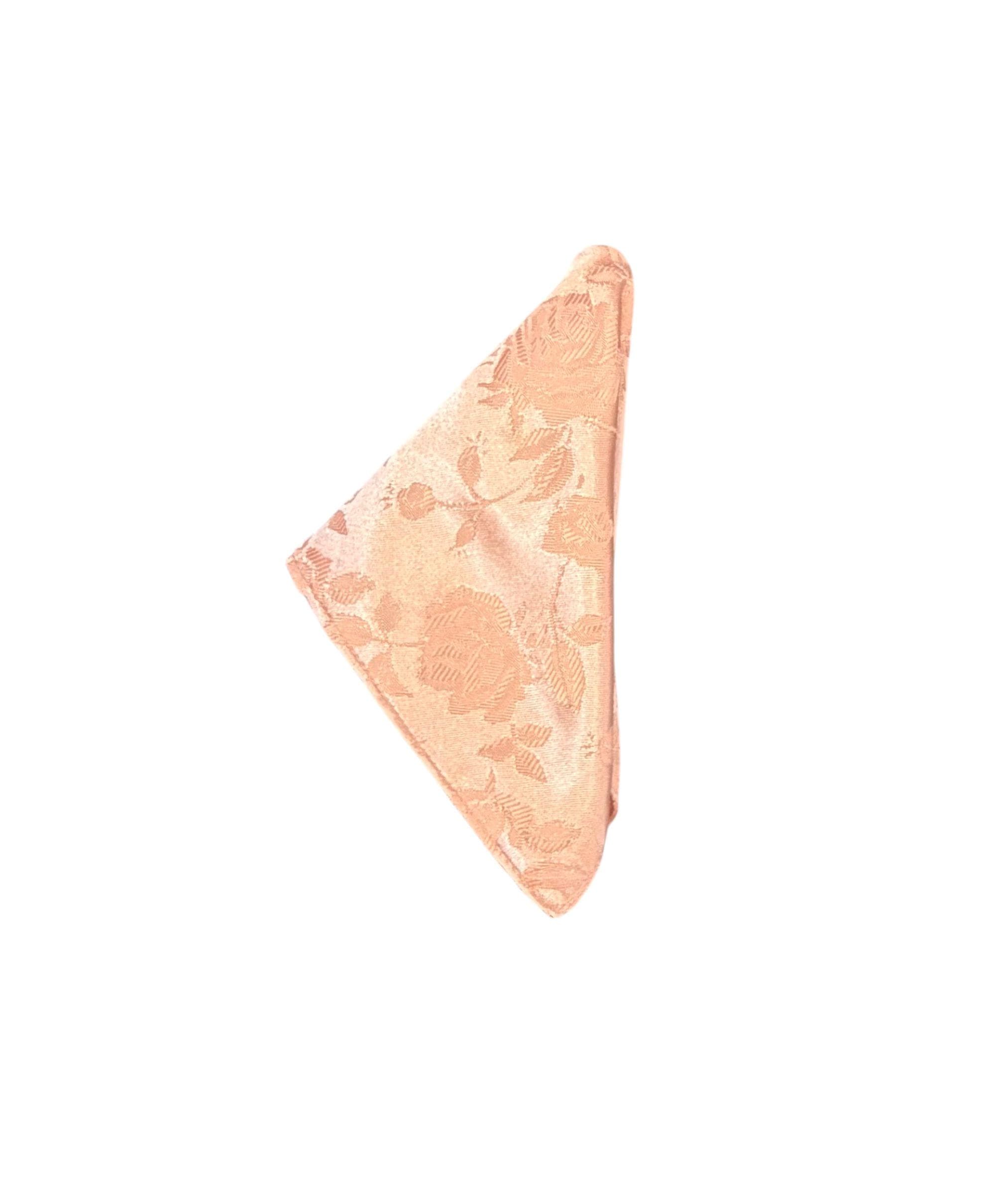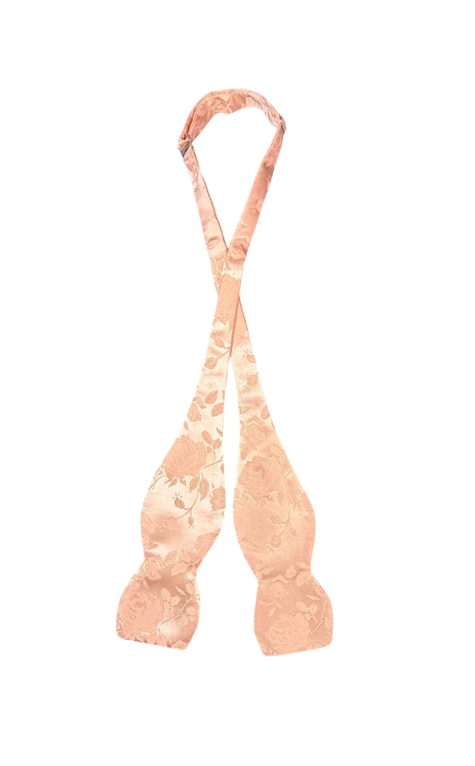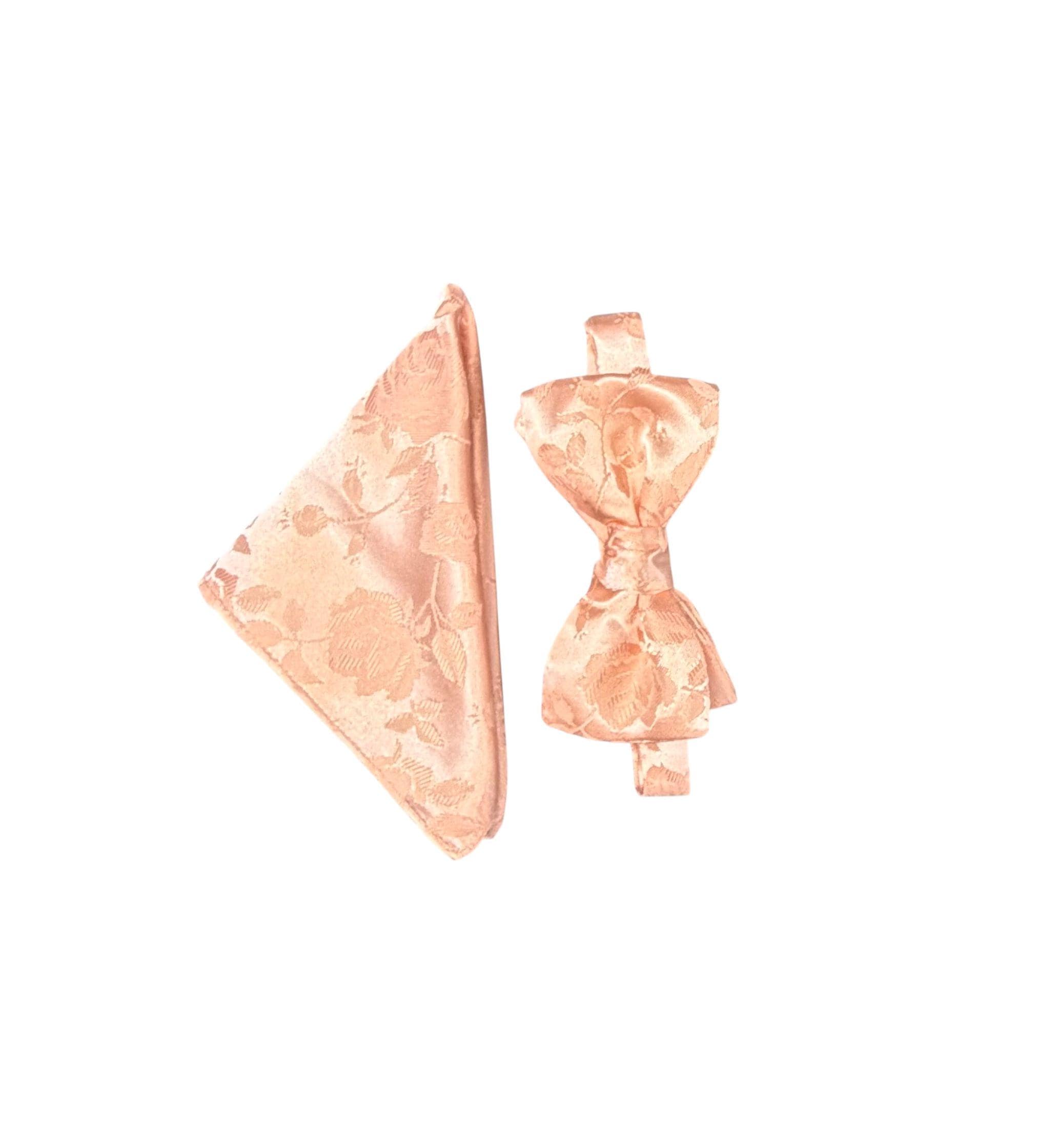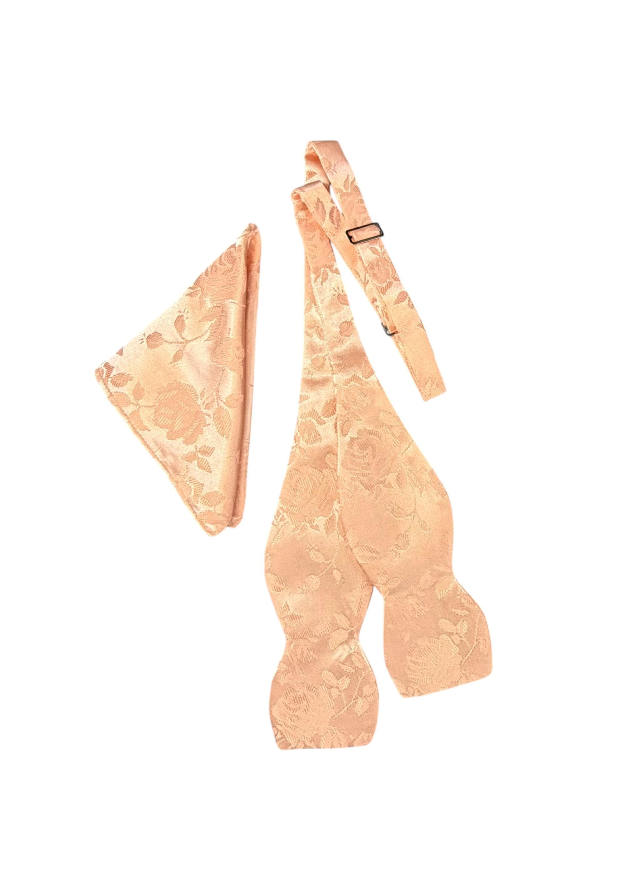 Self-tie Adjustable Bow Tie and Pocket Square Set - Peach on Peach Embossed Rose Satin Brocade - Adult Mens Sizing - Crafted in the USA by Holiday Bow Ties, LLC - The "Lee" Bow Tie and Pocket Square Set