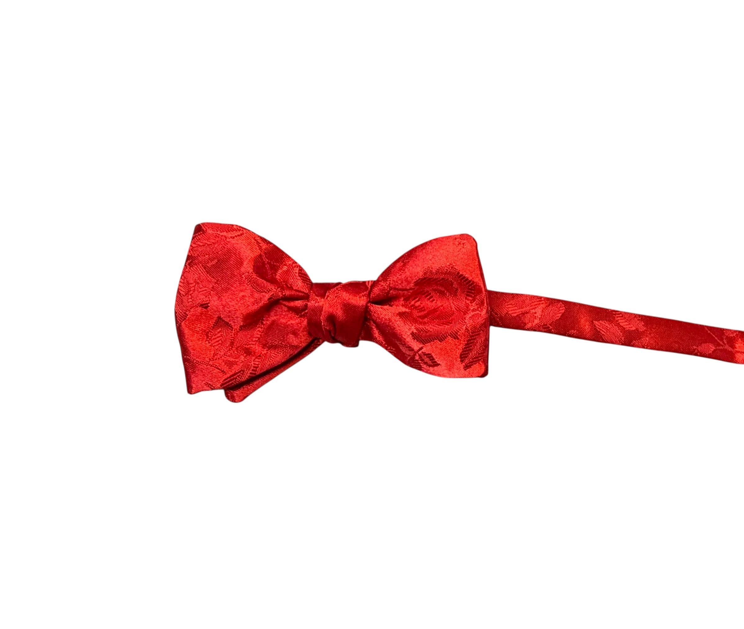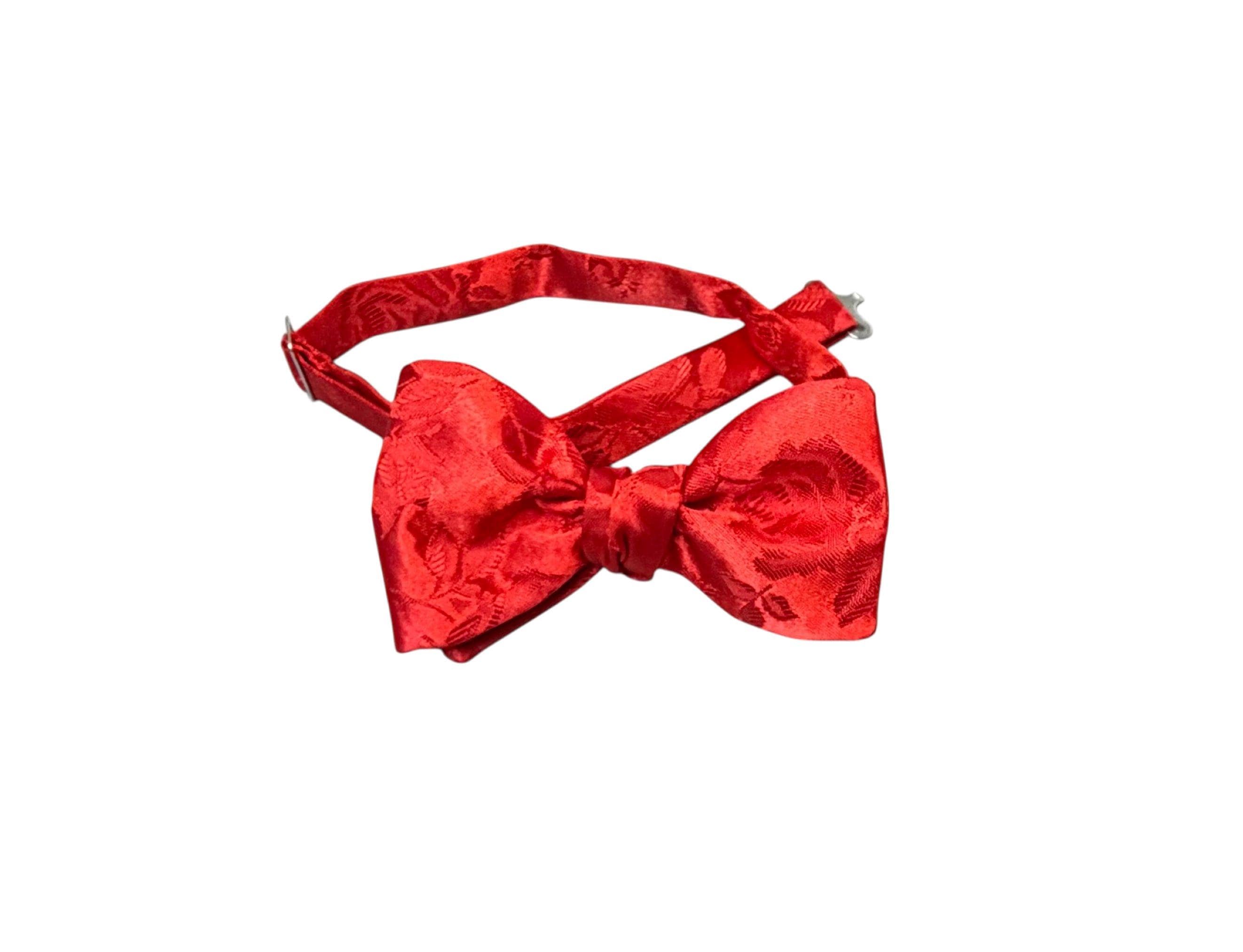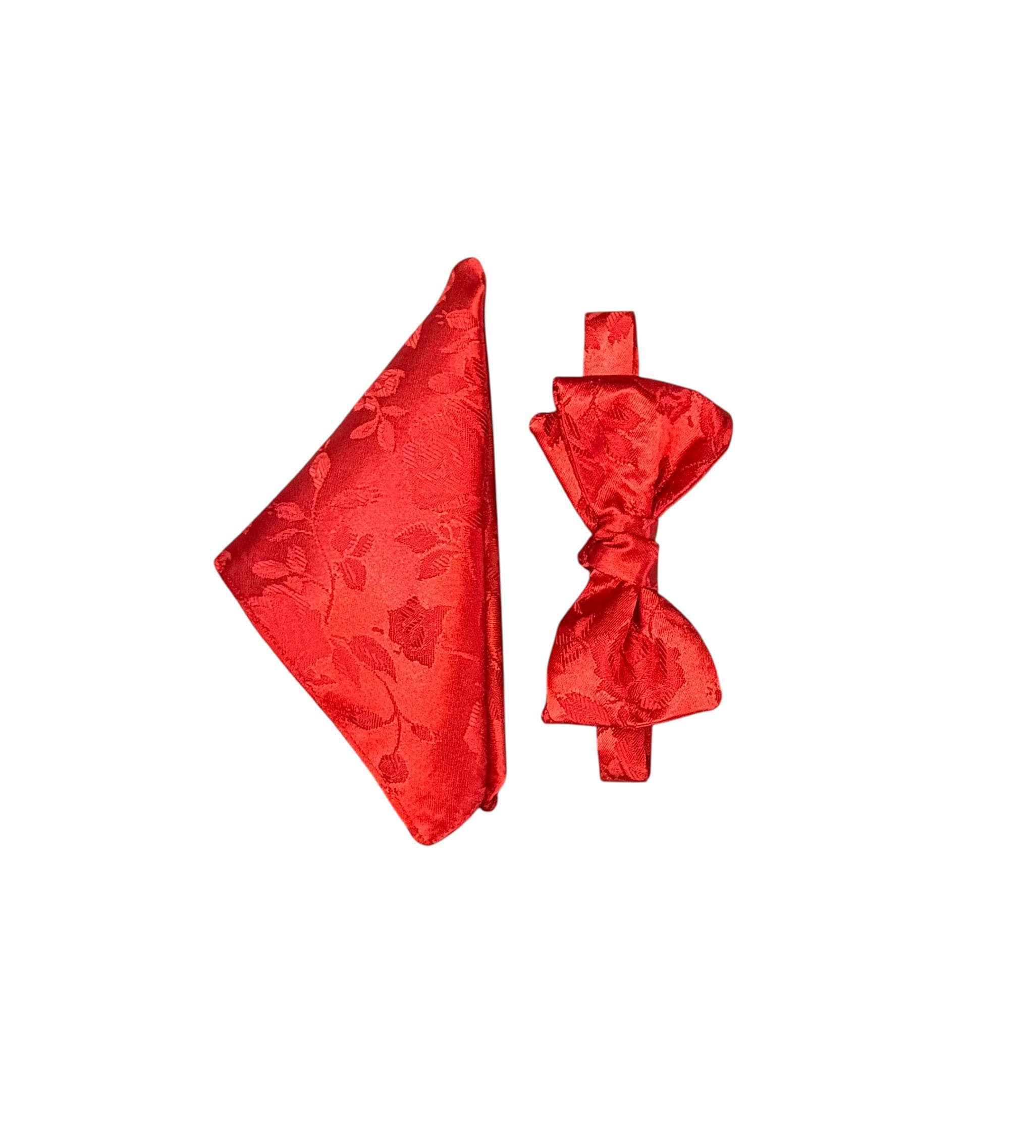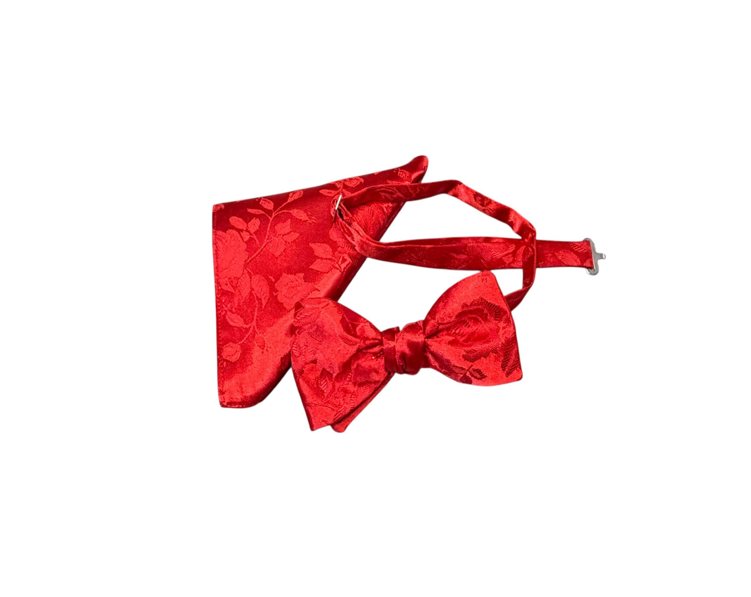 Pretied Adjustable Bow Tie and Pocket Square Set - Red on Red Embossed Rose Satin Brocade - Adult Mens Sizing - Crafted in the USA by Holiday Bow Ties, LLC - The "Lee" Bow Tie and Pocket Square Set