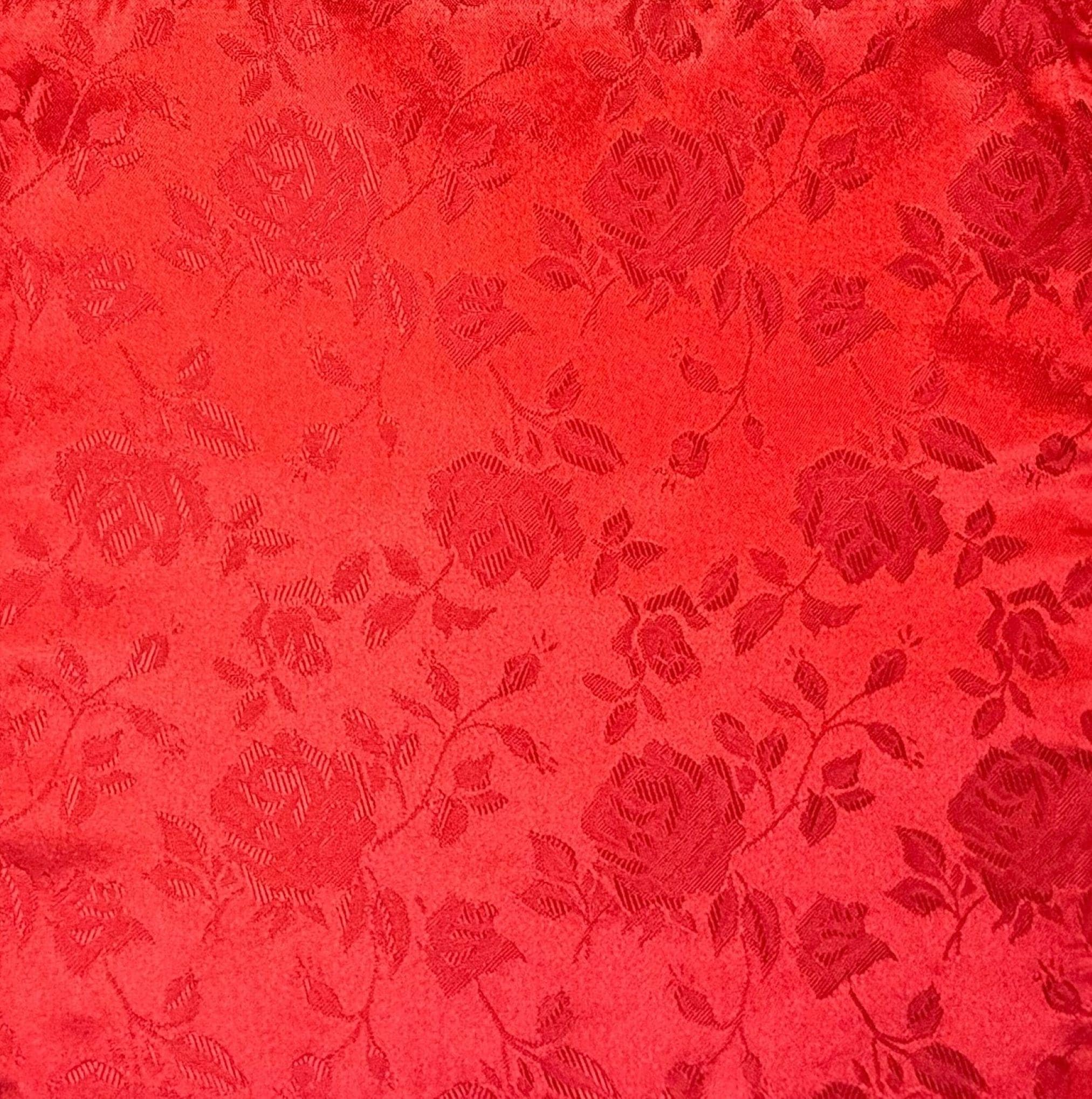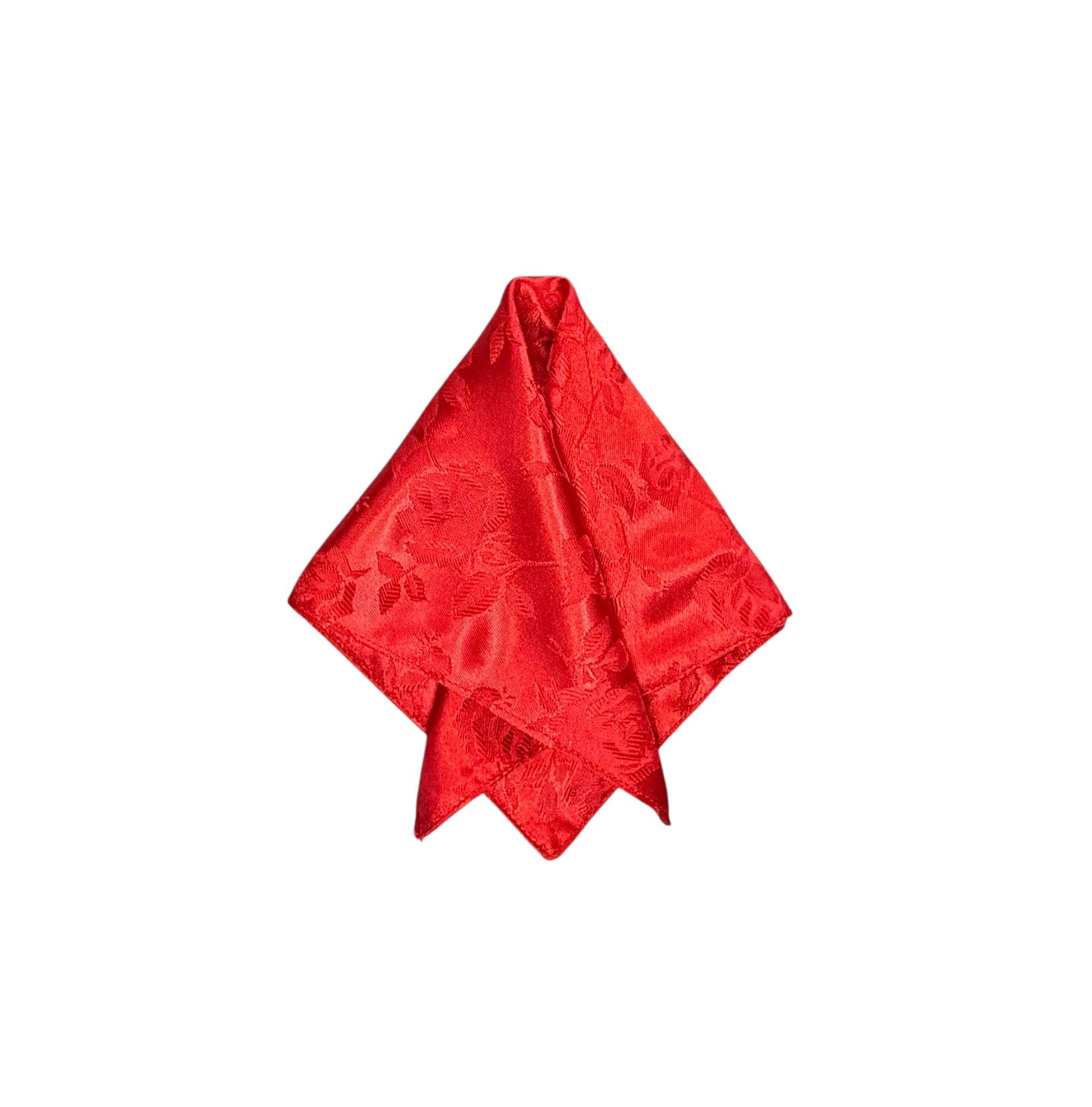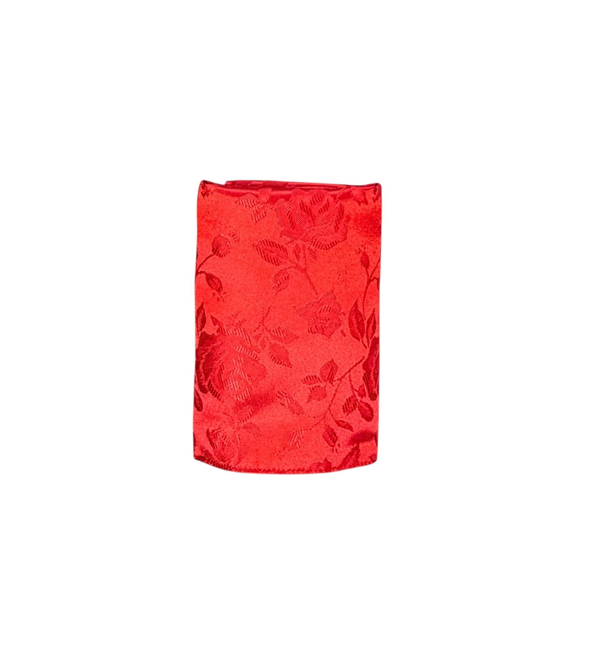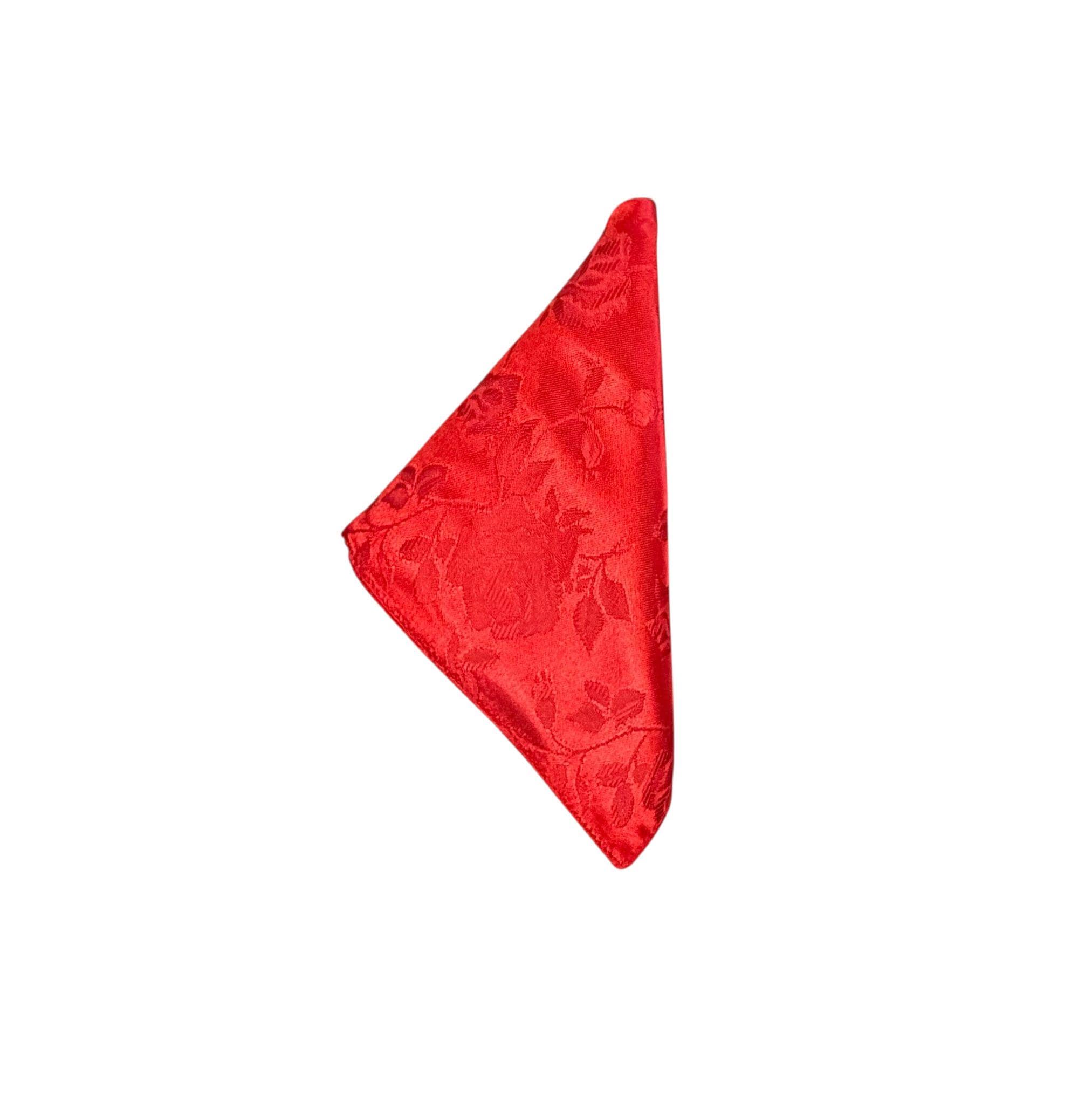 Pretied Adjustable Bow Tie and Pocket Square Set - Red on Red Embossed Rose Satin Brocade - Adult Mens Sizing - Crafted in the USA by Holiday Bow Ties, LLC - The "Lee" Bow Tie and Pocket Square Set