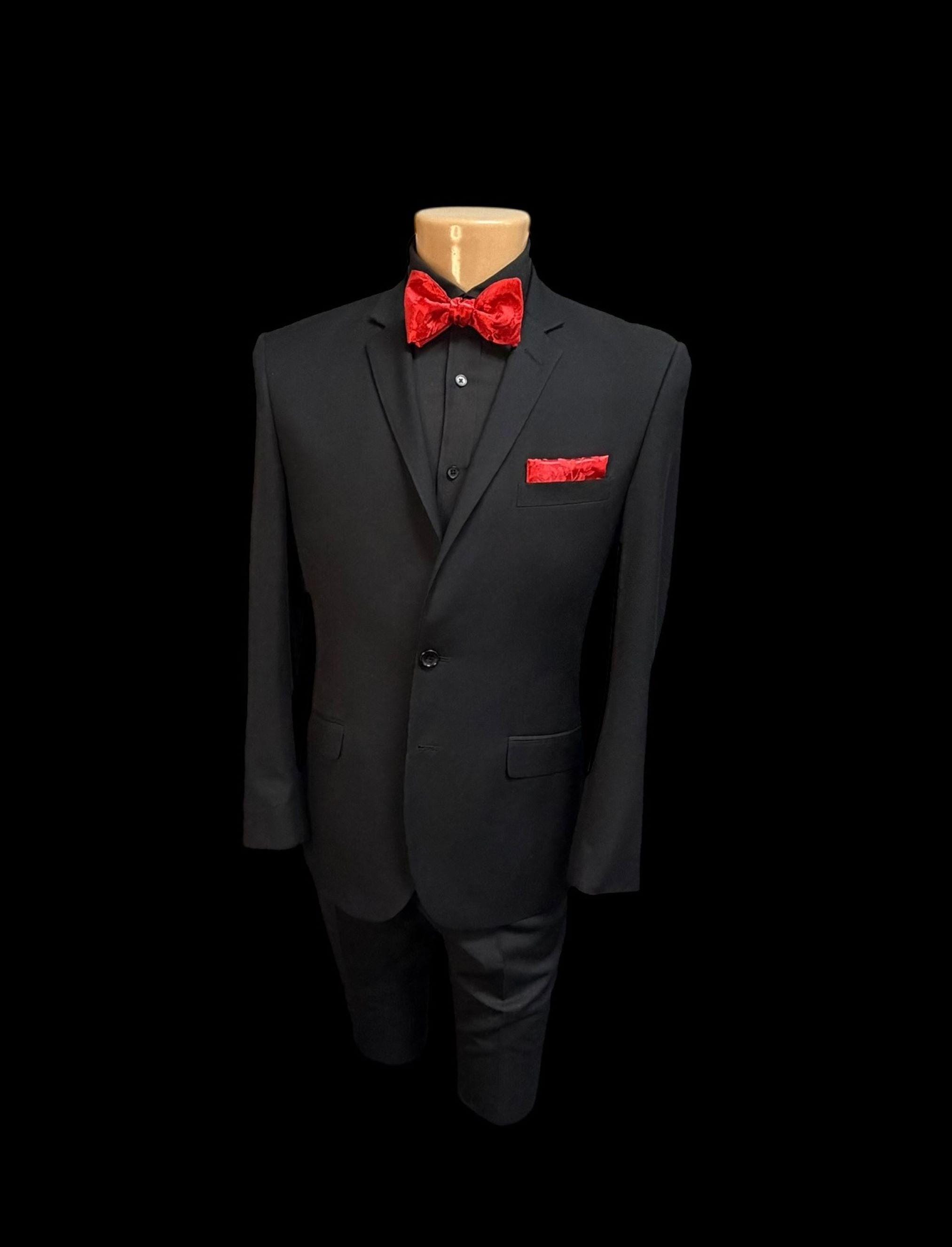 Sizes Available: This pretied bow tie is available in Adult-Men 14 and up (2.5” height, 4.75” width and the adjustable strap fits 13” to 24”). Pocket Square is a 10 inch by 10 inch square.