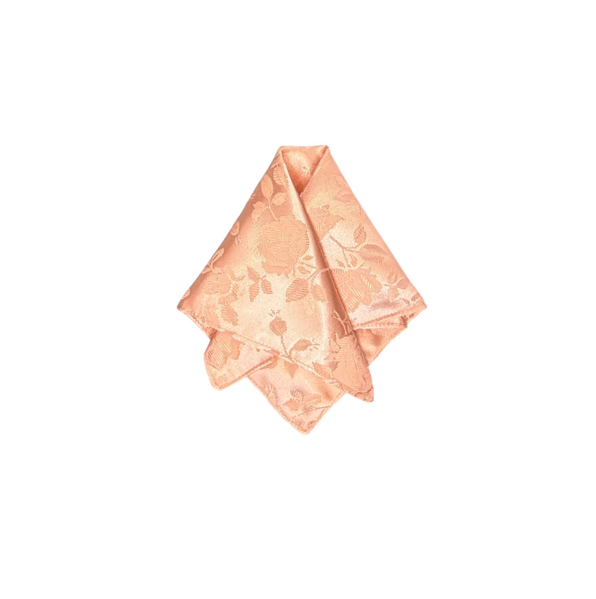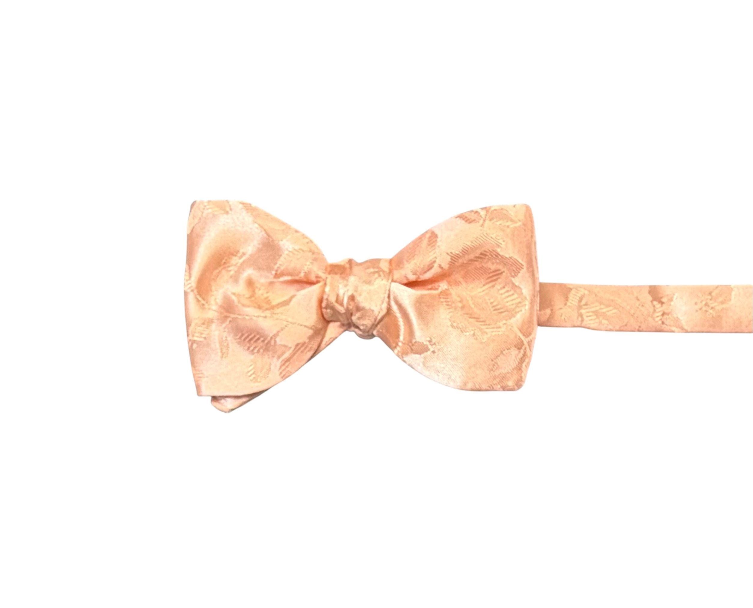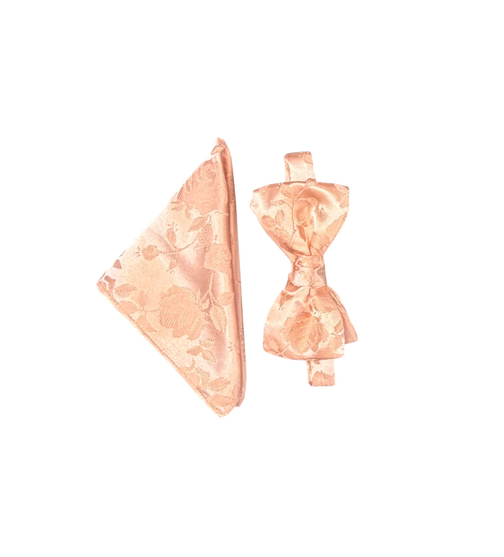 Pretied Adjustable Bow Tie and Pocket Square Set - Peach on Peach Embossed Rose Satin Brocade - Adult Mens Sizing - Crafted in the USA by Holiday Bow Ties, LLC - The "Lee" Bow Tie and Pocket Square Set