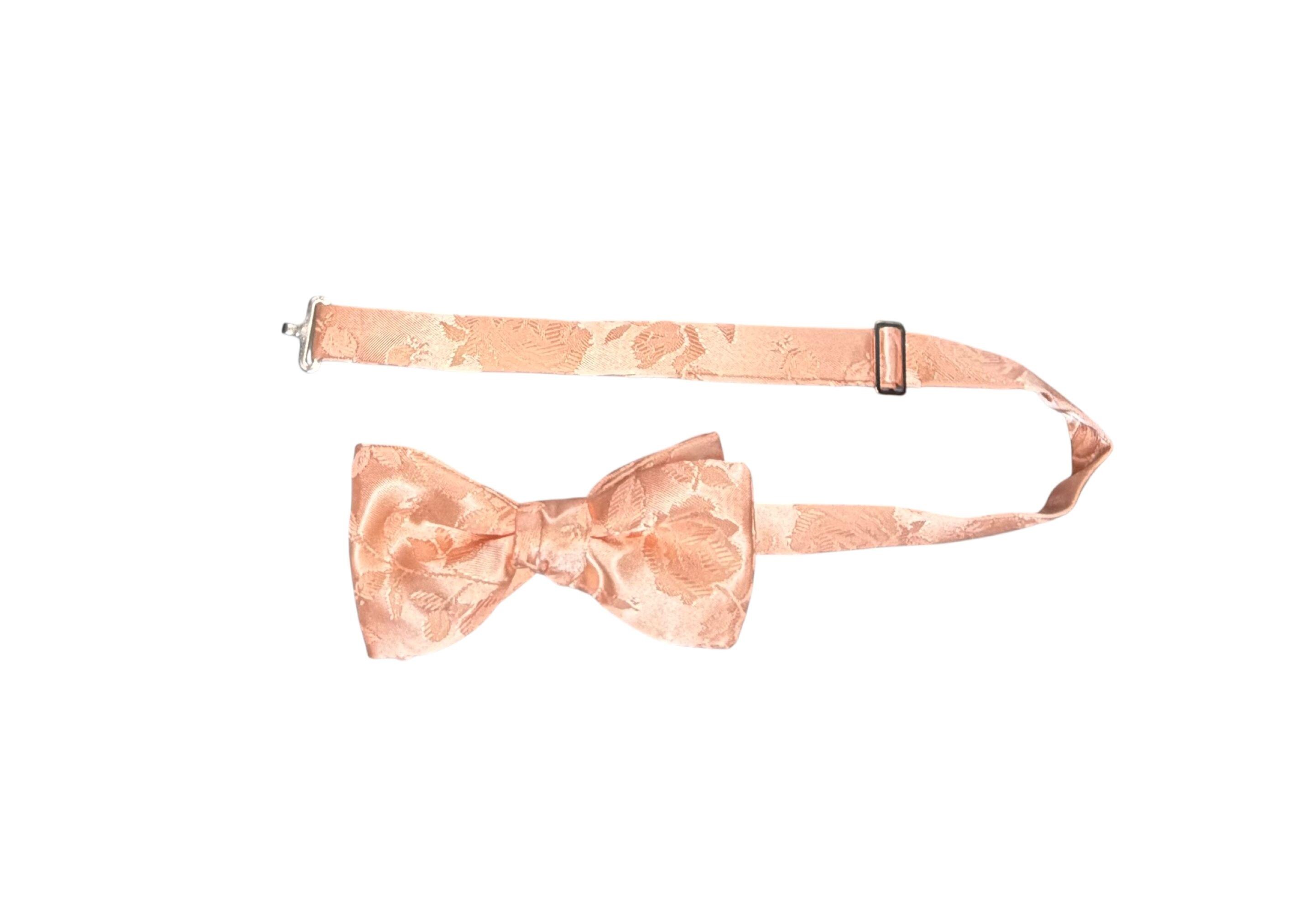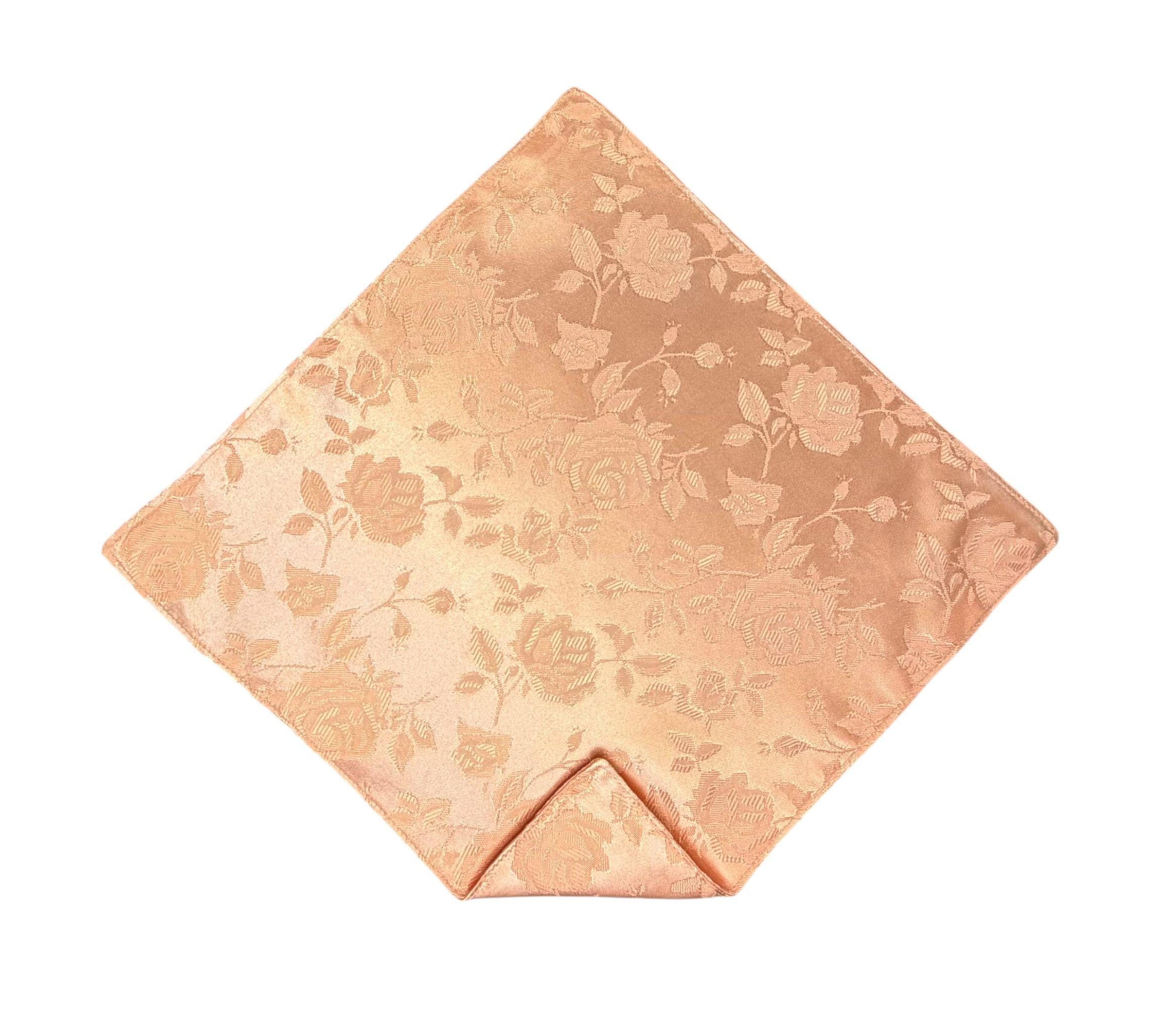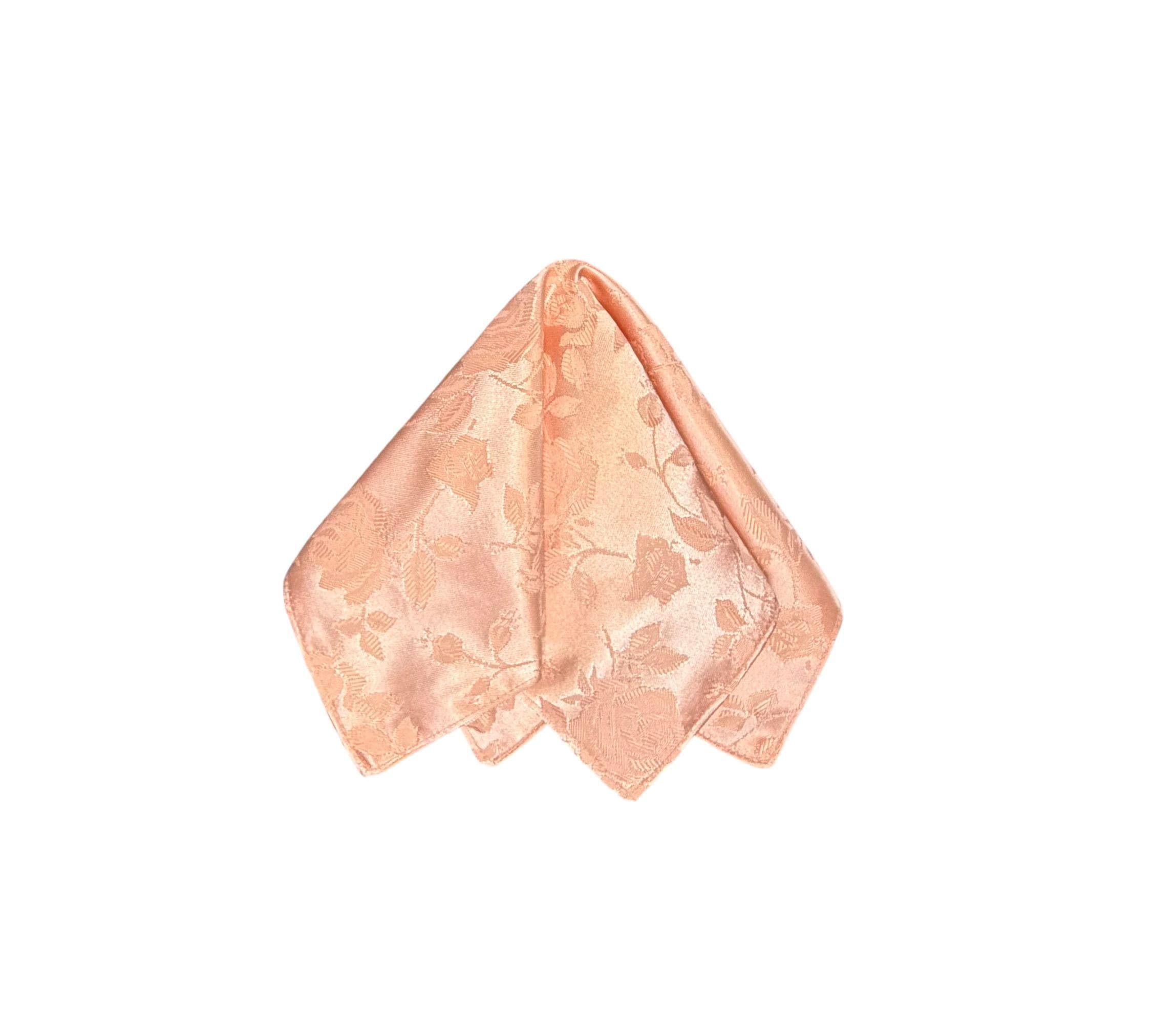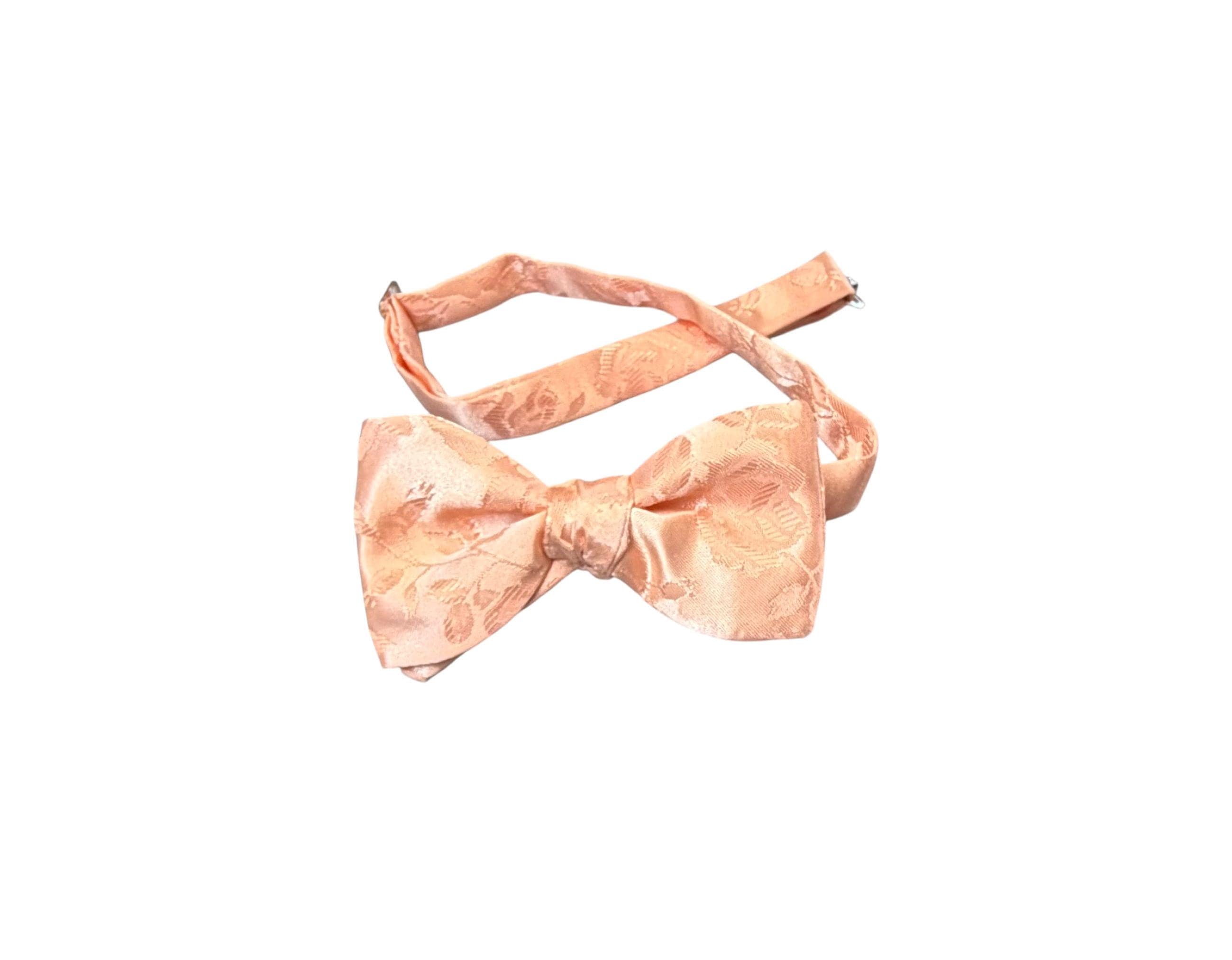 Pretied Adjustable Bow Tie and Pocket Square Set - Peach on Peach Embossed Rose Satin Brocade - Adult Mens Sizing - Crafted in the USA by Holiday Bow Ties, LLC - The "Lee" Bow Tie and Pocket Square Set