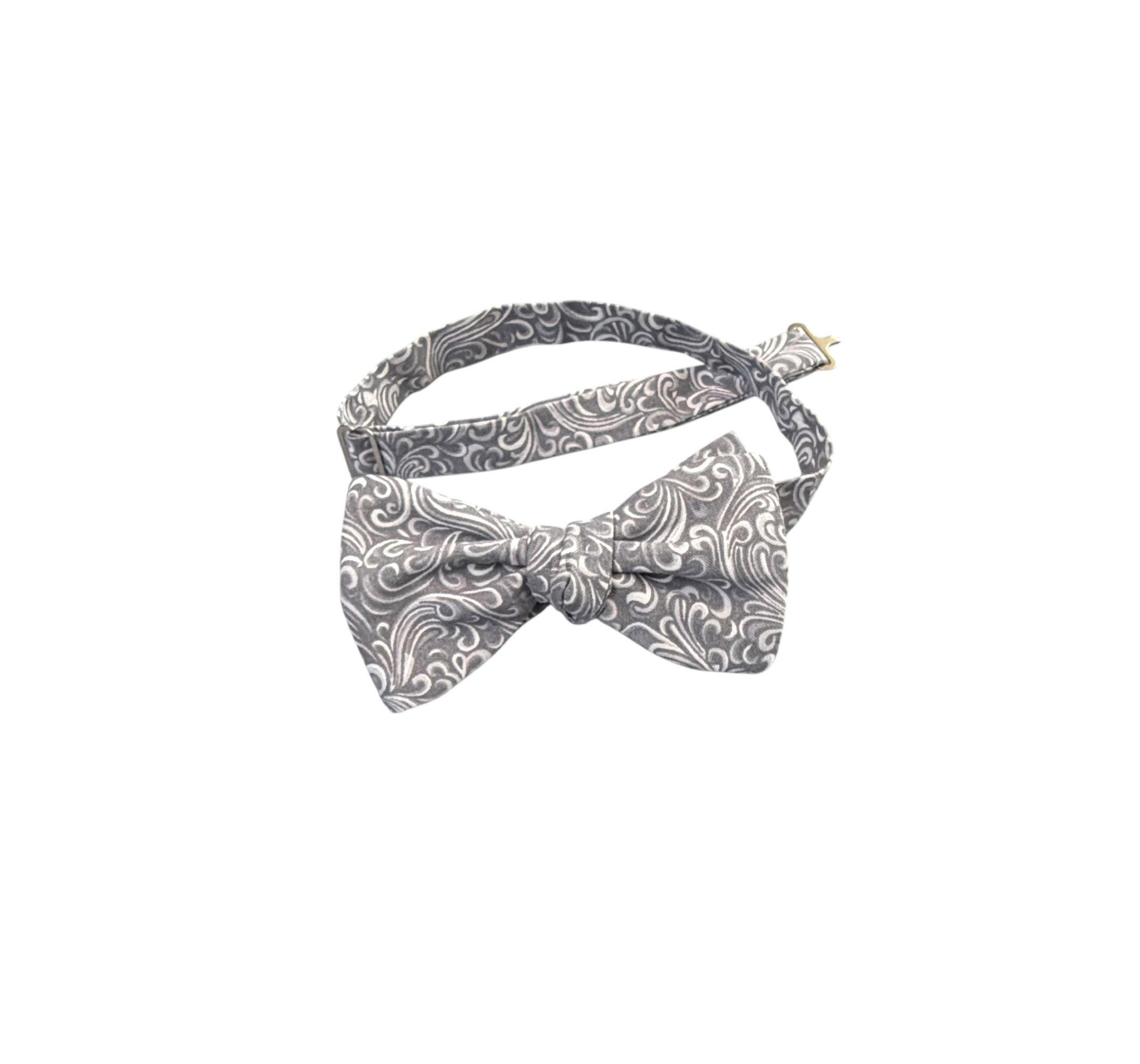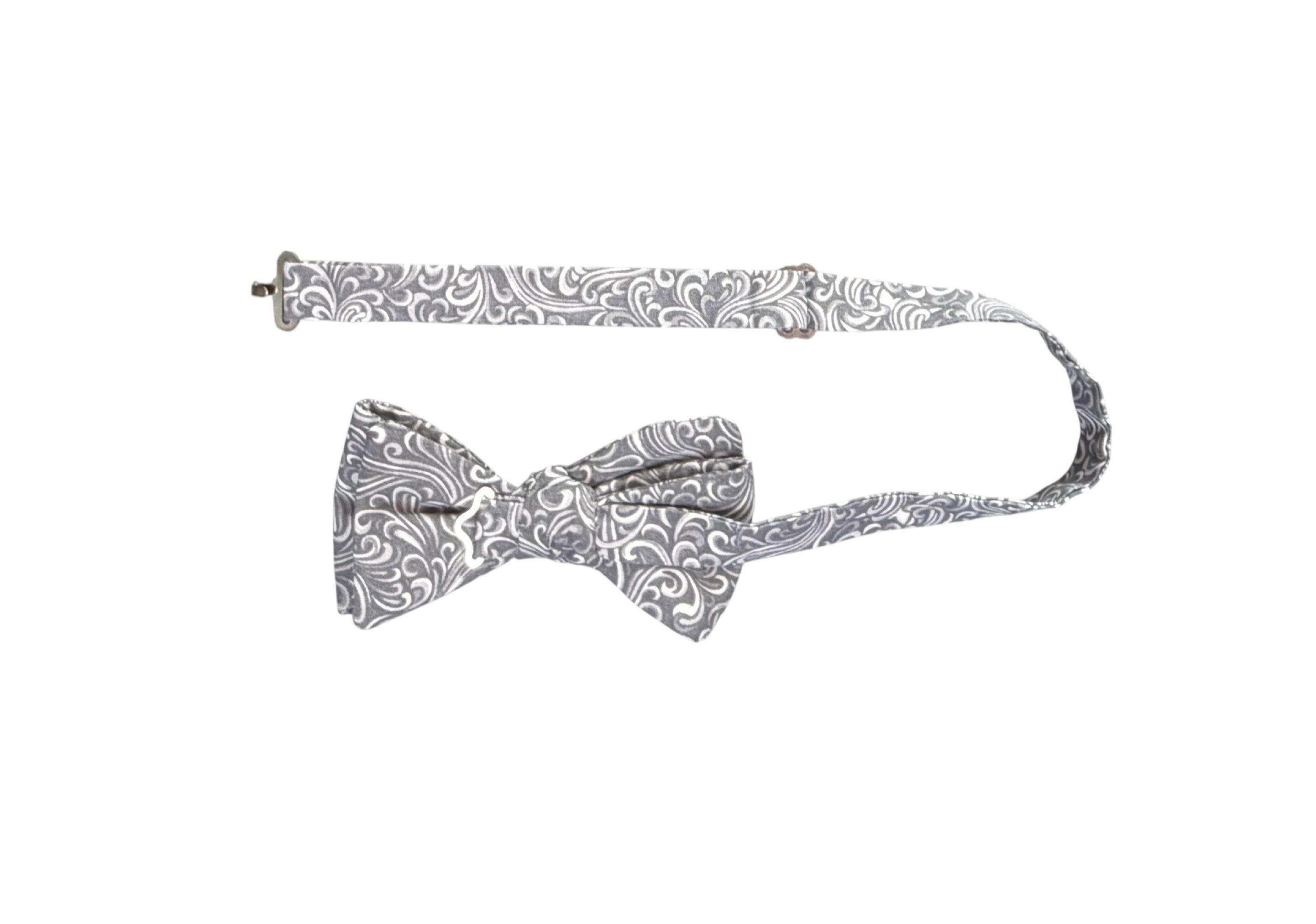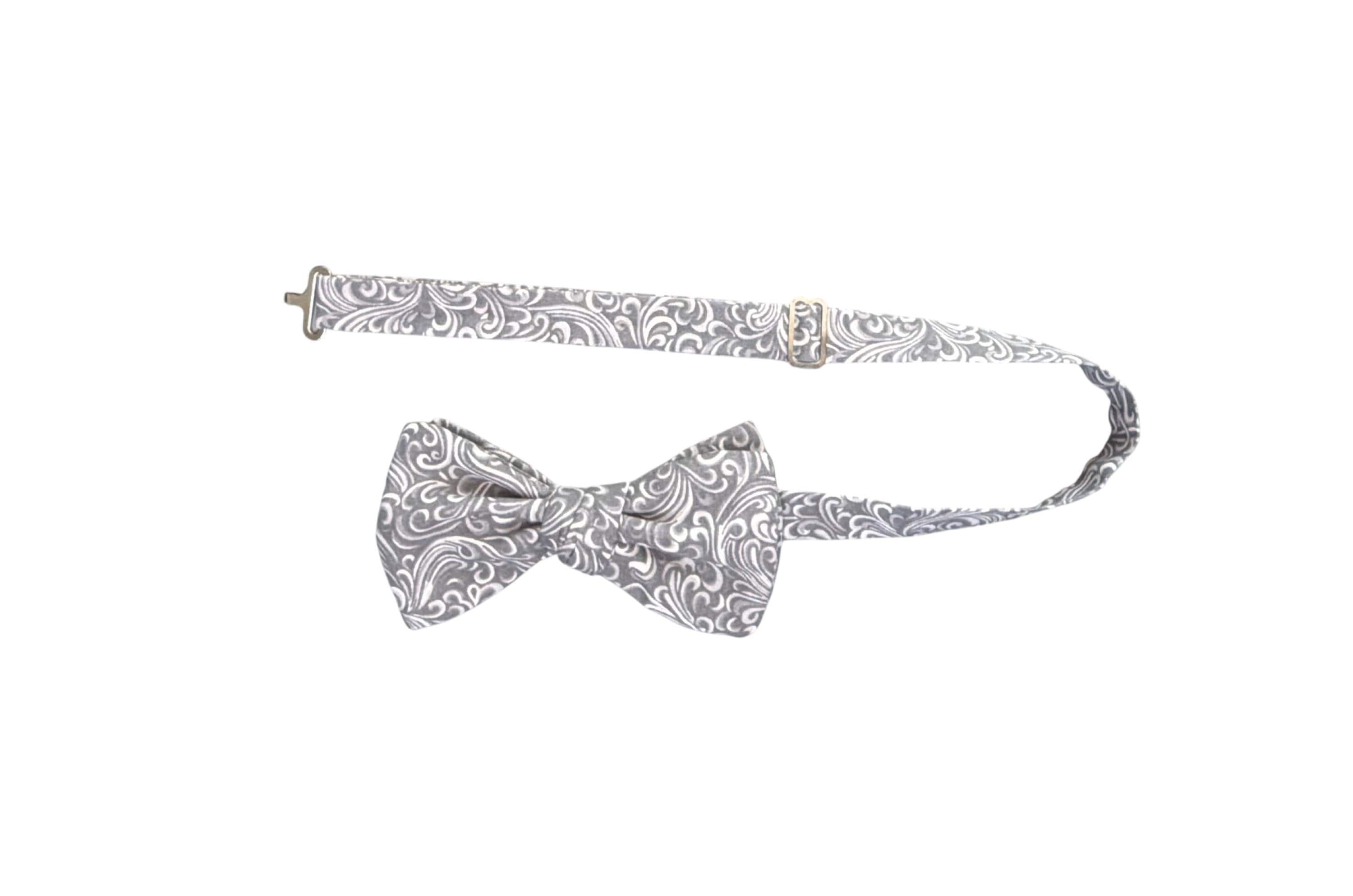 Handmade Pretied Bow Tie - Silver Grey and White Paisley Premium Cotton Bow Tie - Adult Men's Sizing - Crafted in the USA by Holiday Bow Ties, llc - The "Xavier" Bow Tie