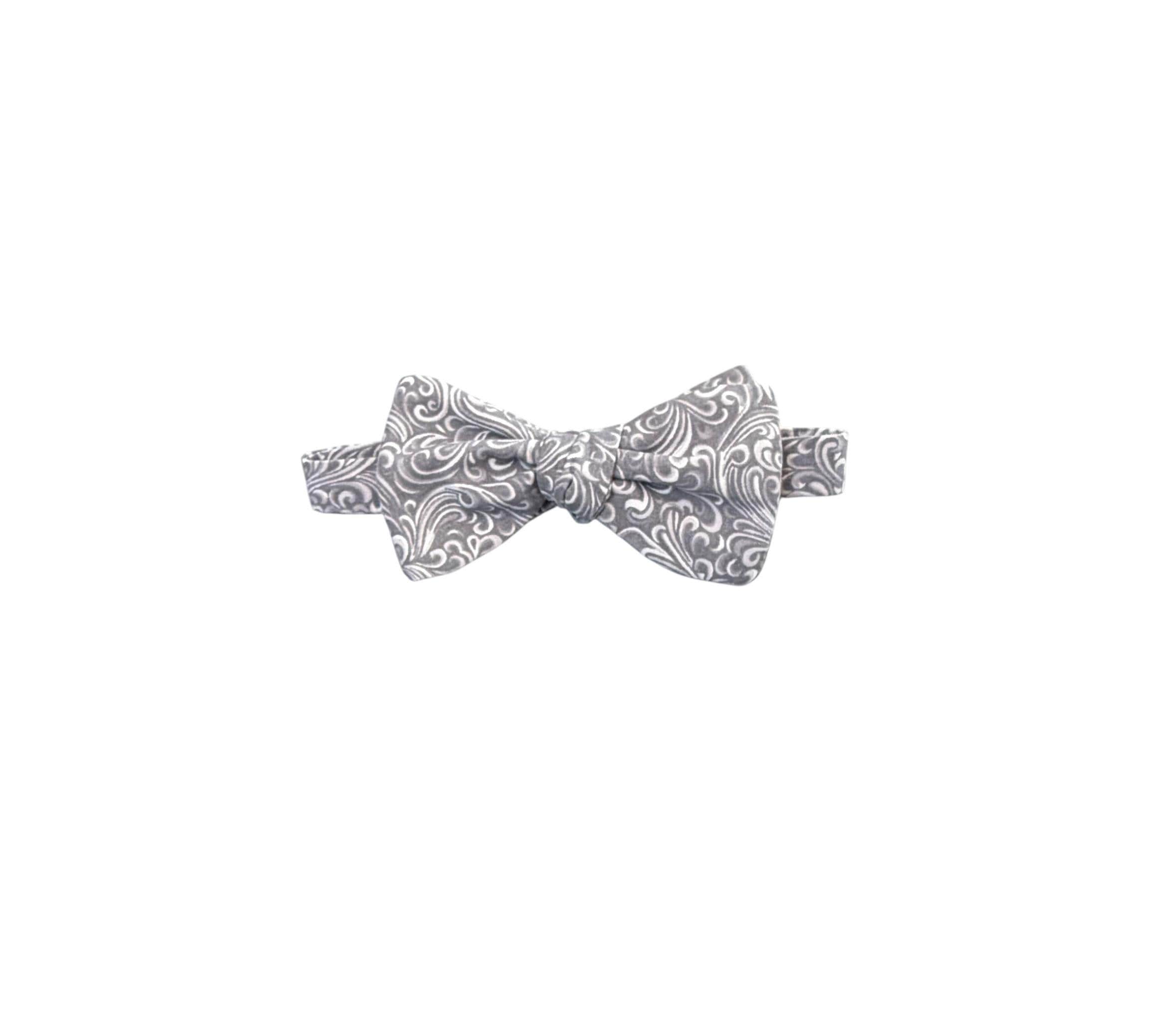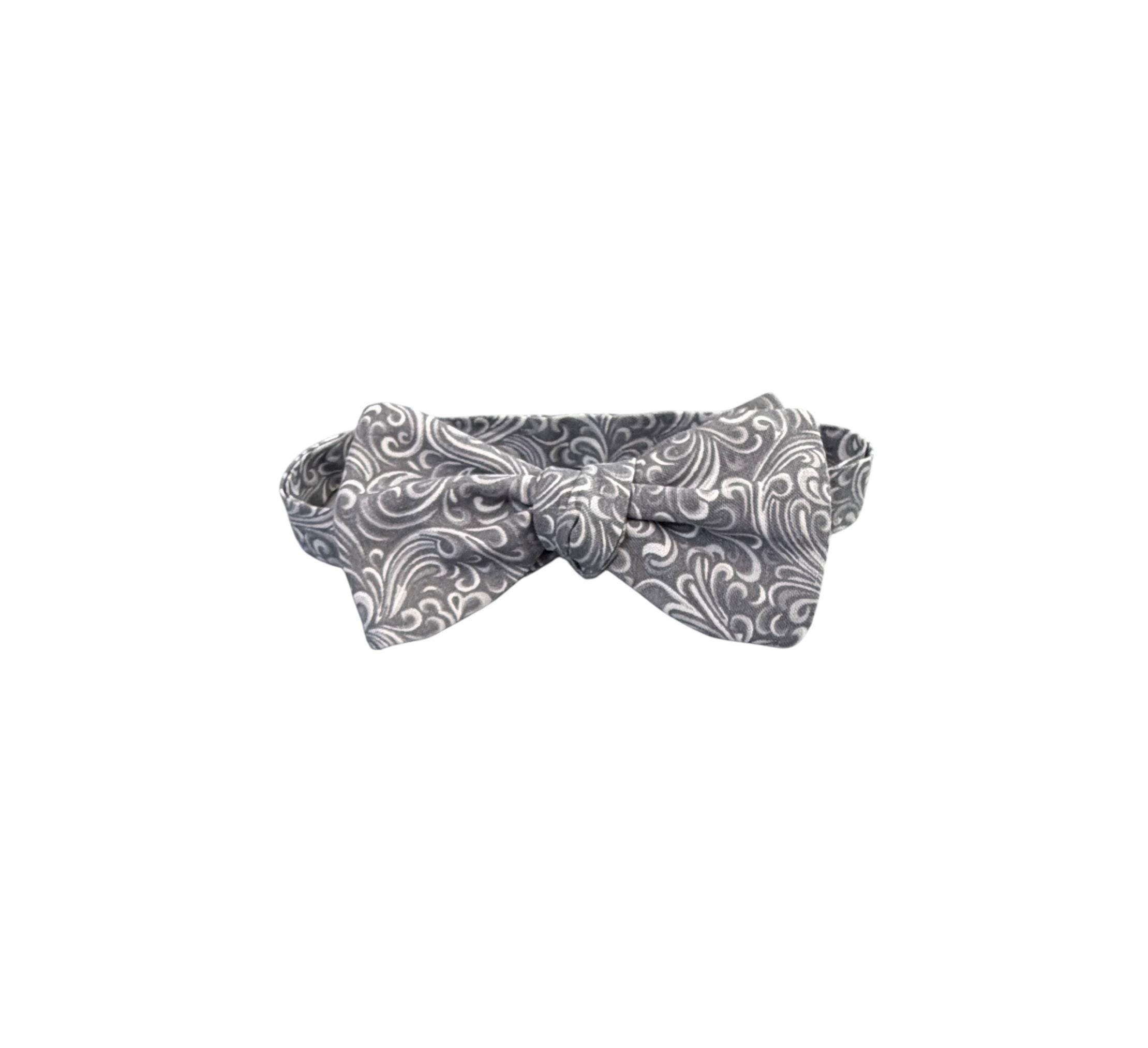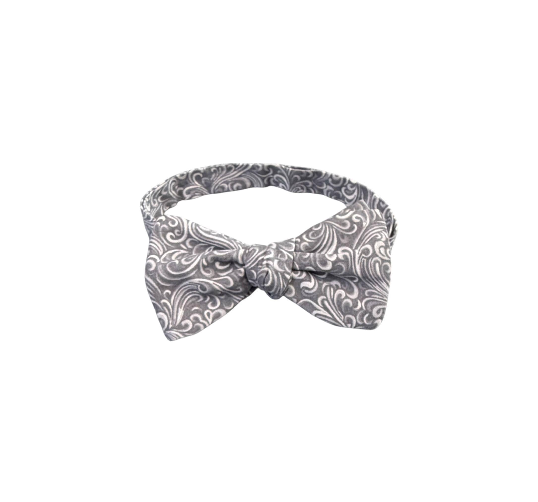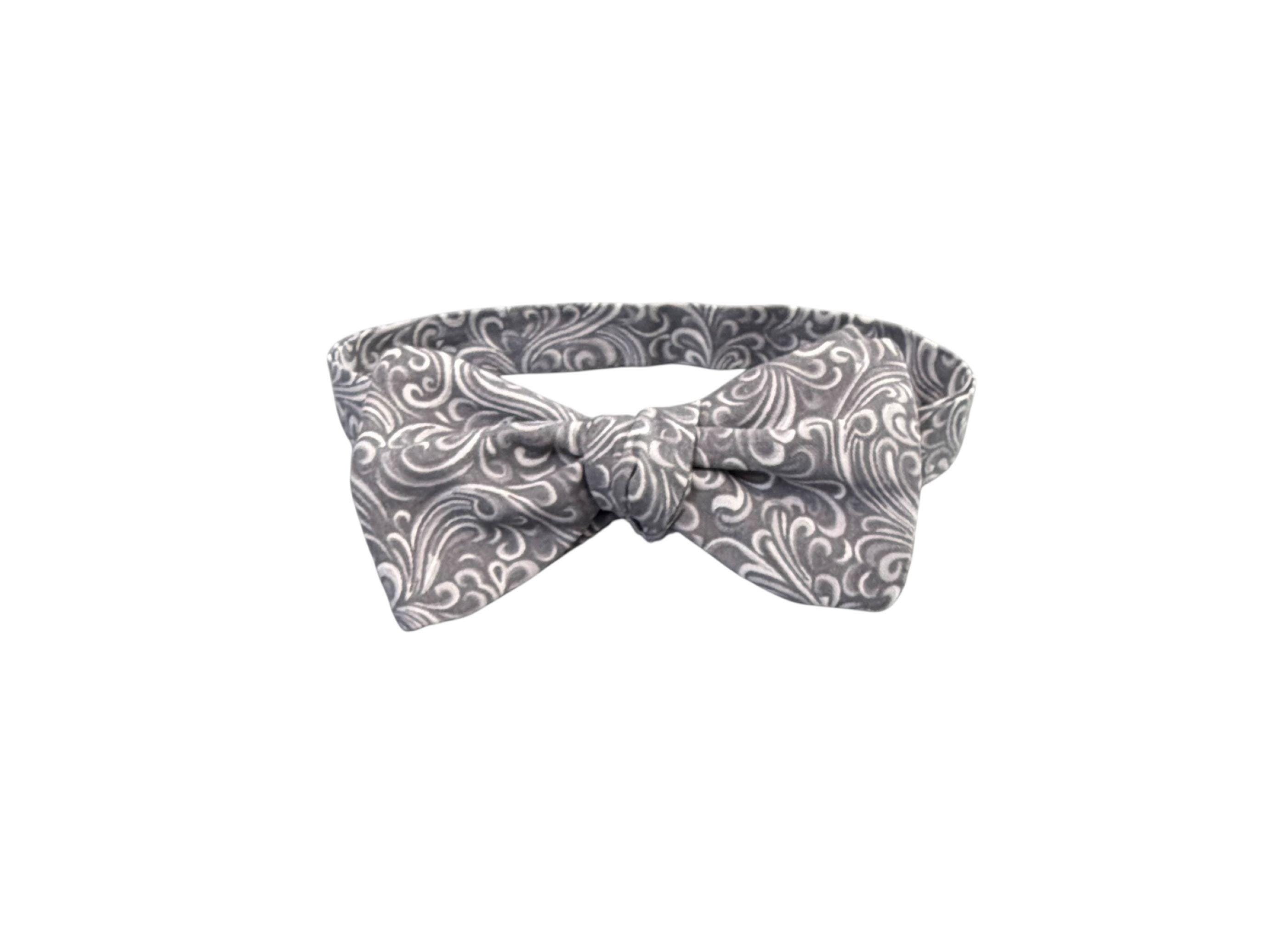 Handmade Pretied Bow Tie - Silver Grey and White Paisley Premium Cotton Bow Tie - Adult Men's Sizing - Crafted in the USA by Holiday Bow Ties, llc - The "Xavier" Bow Tie