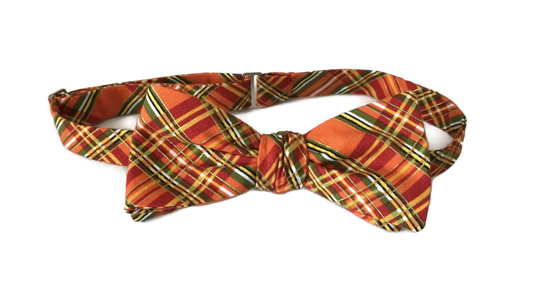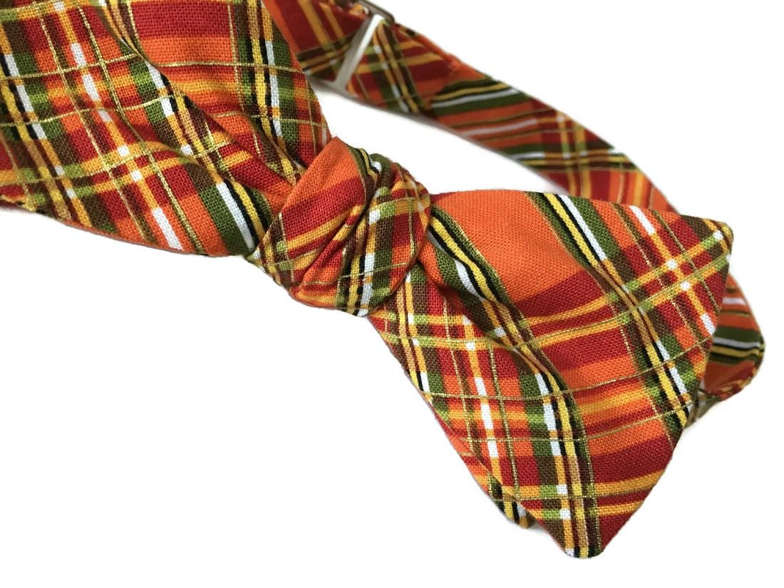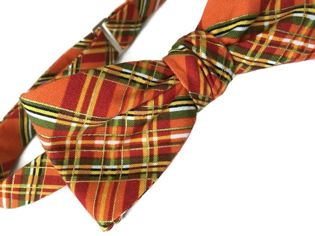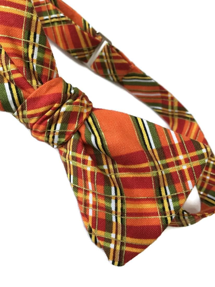 Celebrate the warmth of fall with the “Issac” Bow Tie — a handcrafted pre-tied bow tie featuring a striking autumn plaid design in shades of orange, green, yellow, and gold. Perfect for fall weddings, Thanksgiving dinners, and seasonal celebrations.