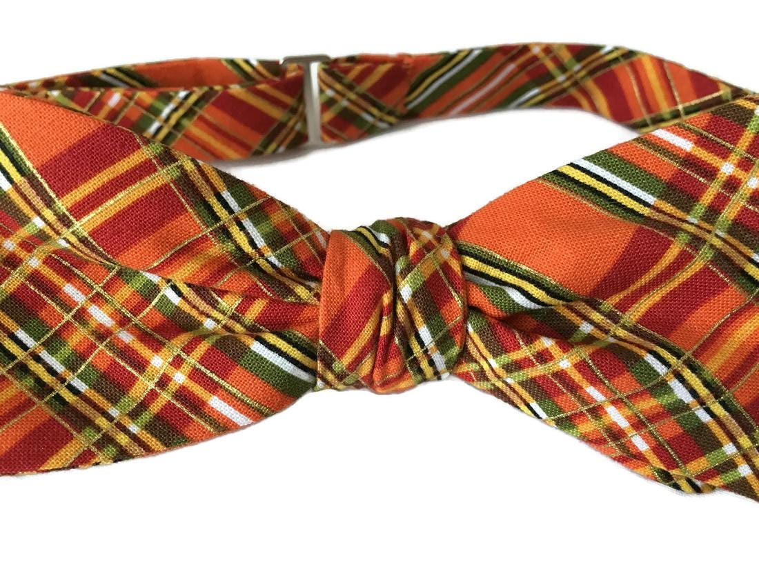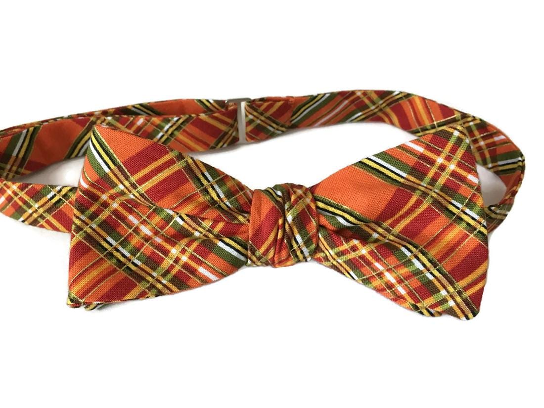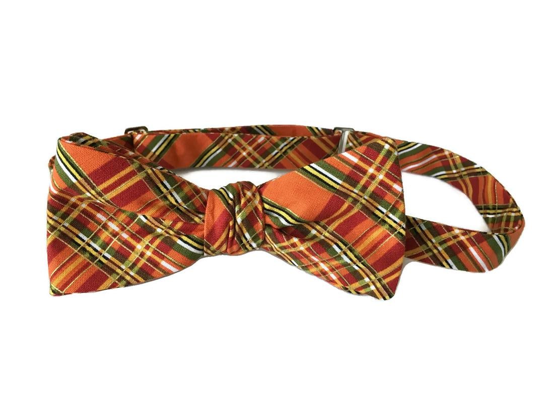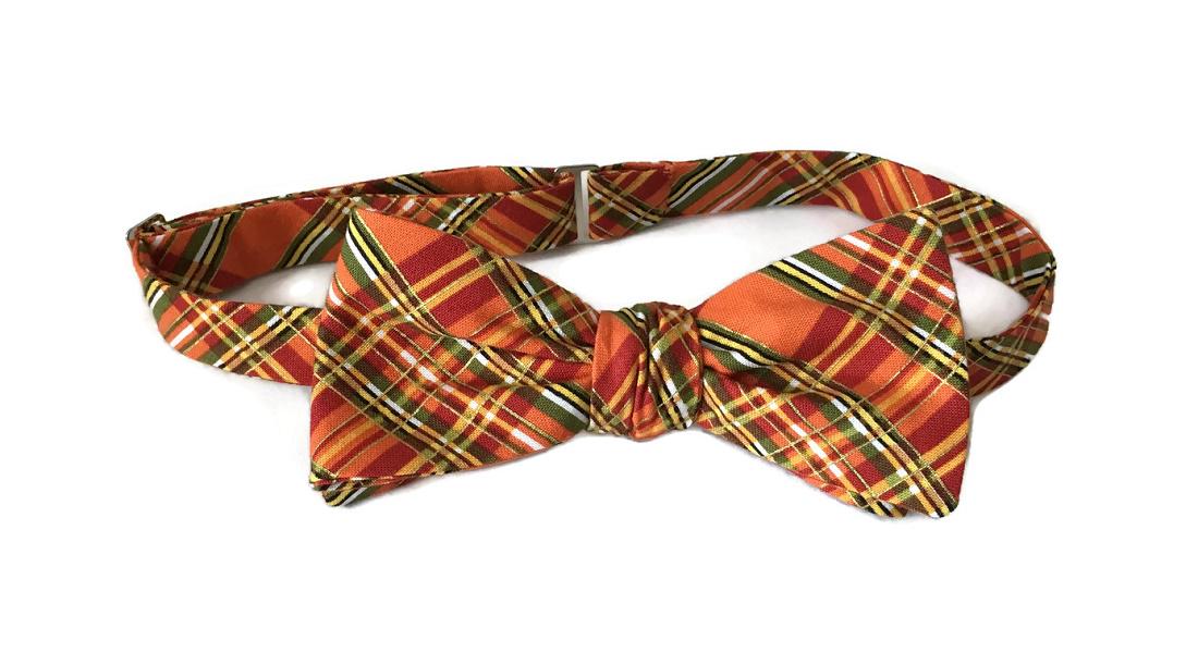 Celebrate the warmth of fall with the “Issac” Bow Tie — a handcrafted pre-tied bow tie featuring a striking autumn plaid design in shades of orange, green, yellow, and gold. Perfect for fall weddings, Thanksgiving dinners, and seasonal celebrations.