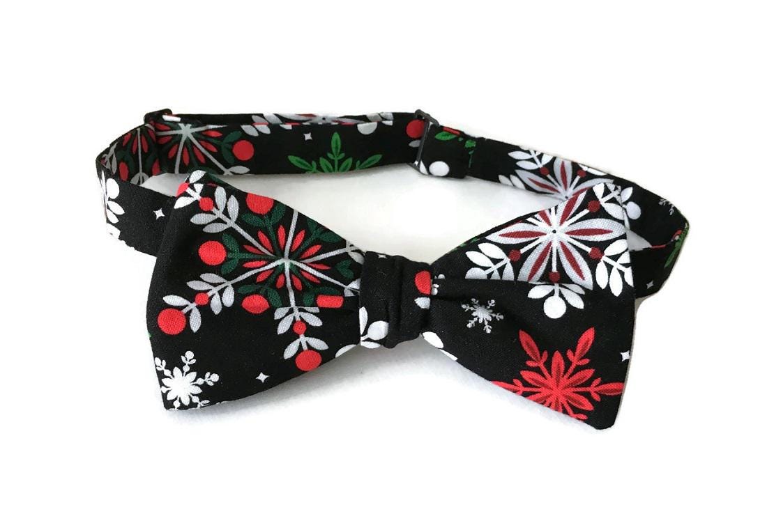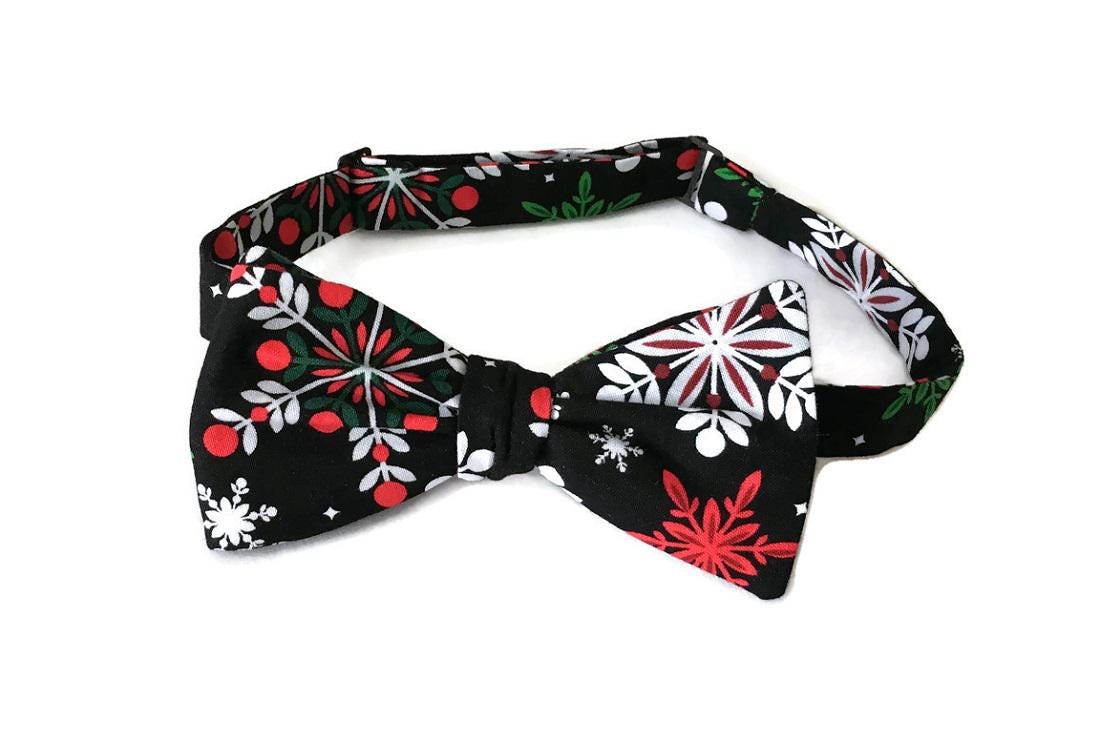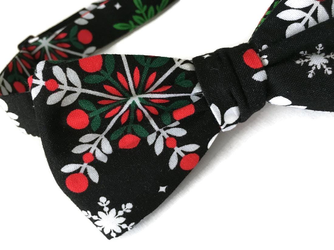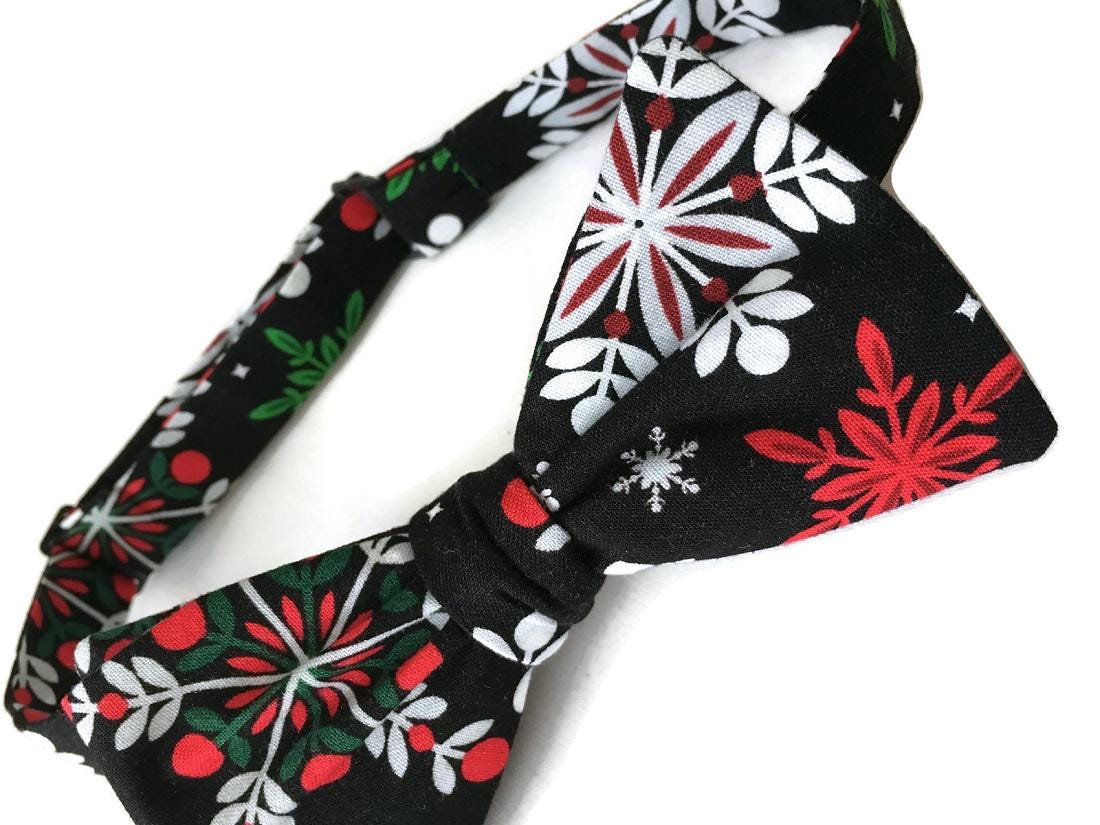 Handmade Pre-tied Bow Tie - Black withe Red, Green, and White Snowflakes Holiday Design Cotton Bow Tie - Adult Mens Sizing - Crafted in the USA by Holiday Bow Ties, LLC- The "Cole" Bow Tie