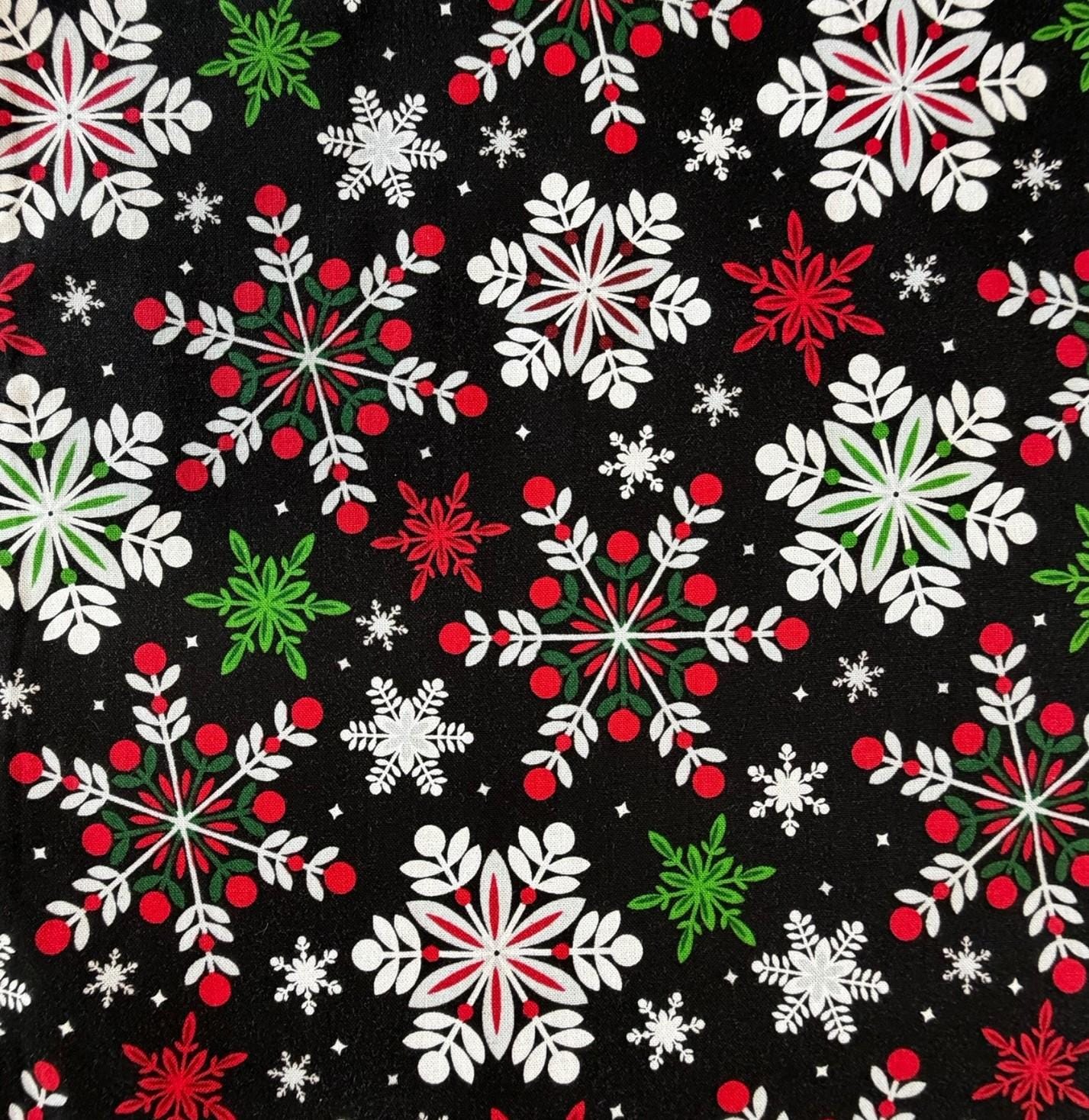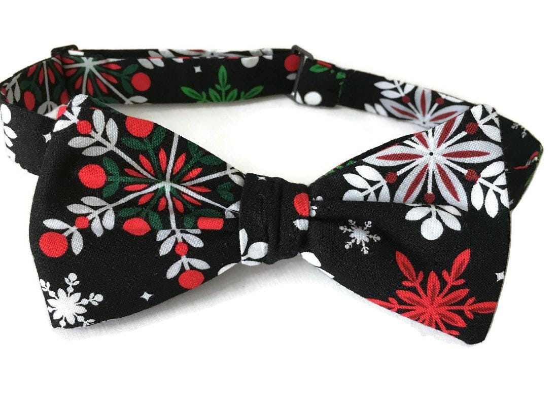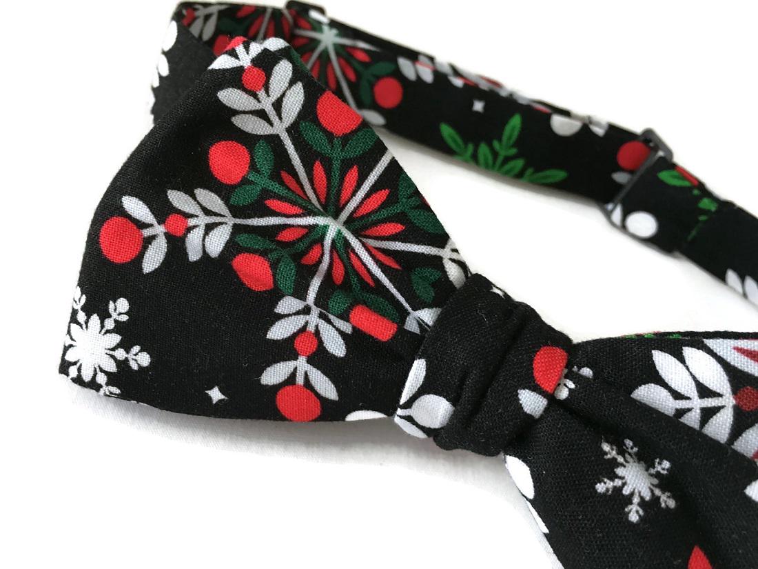 Handmade Pre-tied Bow Tie - Black withe Red, Green, and White Snowflakes Holiday Design Cotton Bow Tie - Adult Mens Sizing - Crafted in the USA by Holiday Bow Ties, LLC- The "Cole" Bow Tie