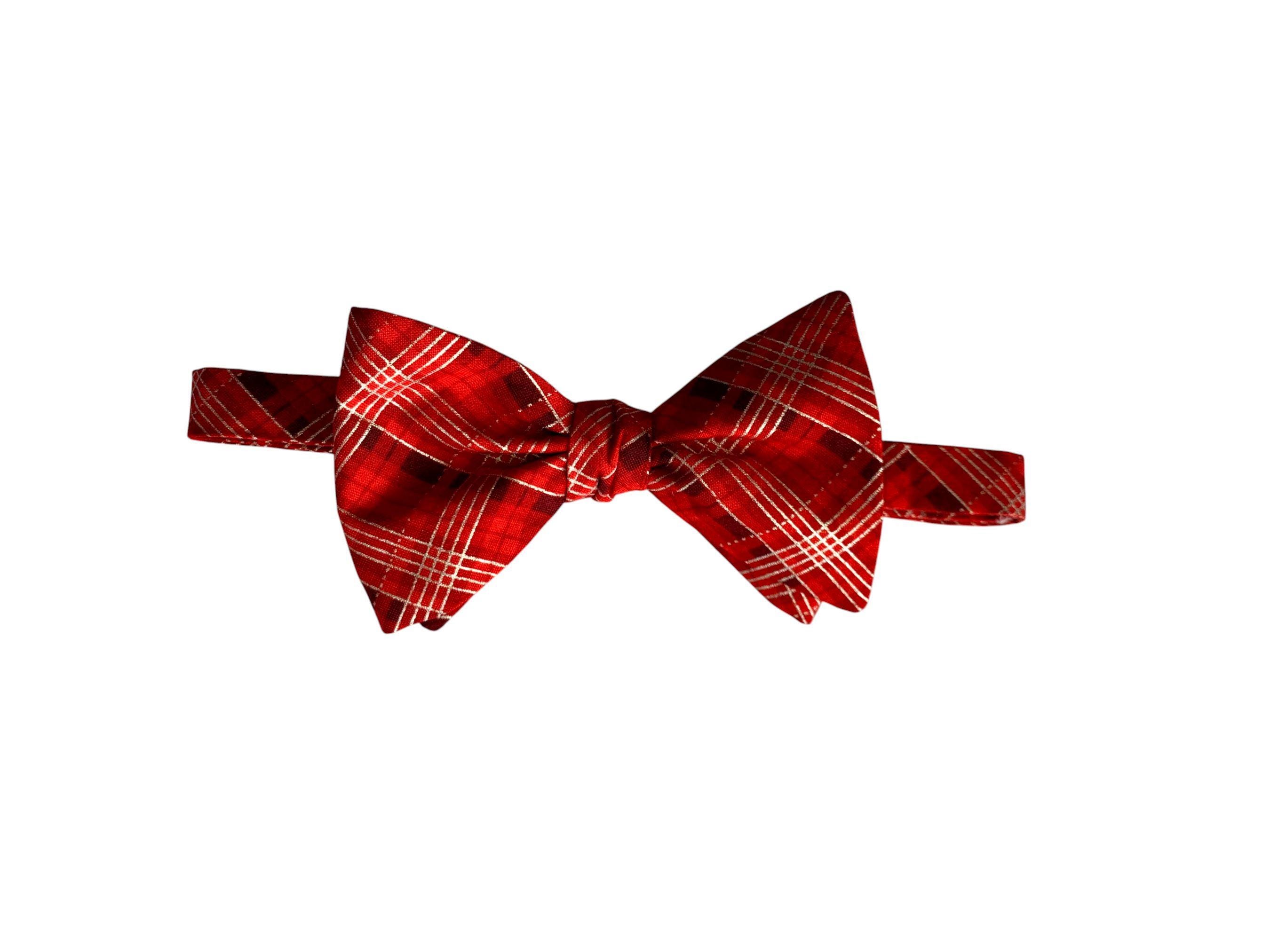 Handmade Pre-tied Bow Tie - Shades of Red and Silver Metallic Plaid - Premium Cotton - Adult Men's Sizing - Crafted in the USA by Holiday Bow Ties, llc - The "Nicholas" Bow Tie