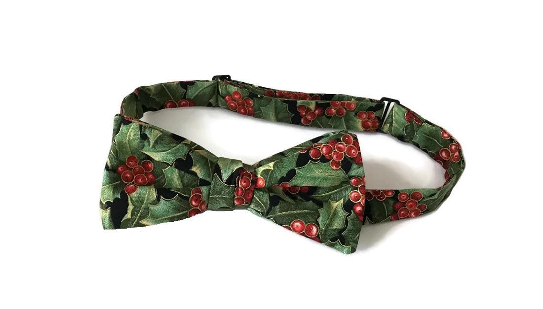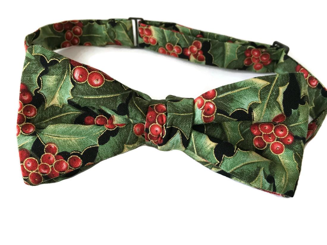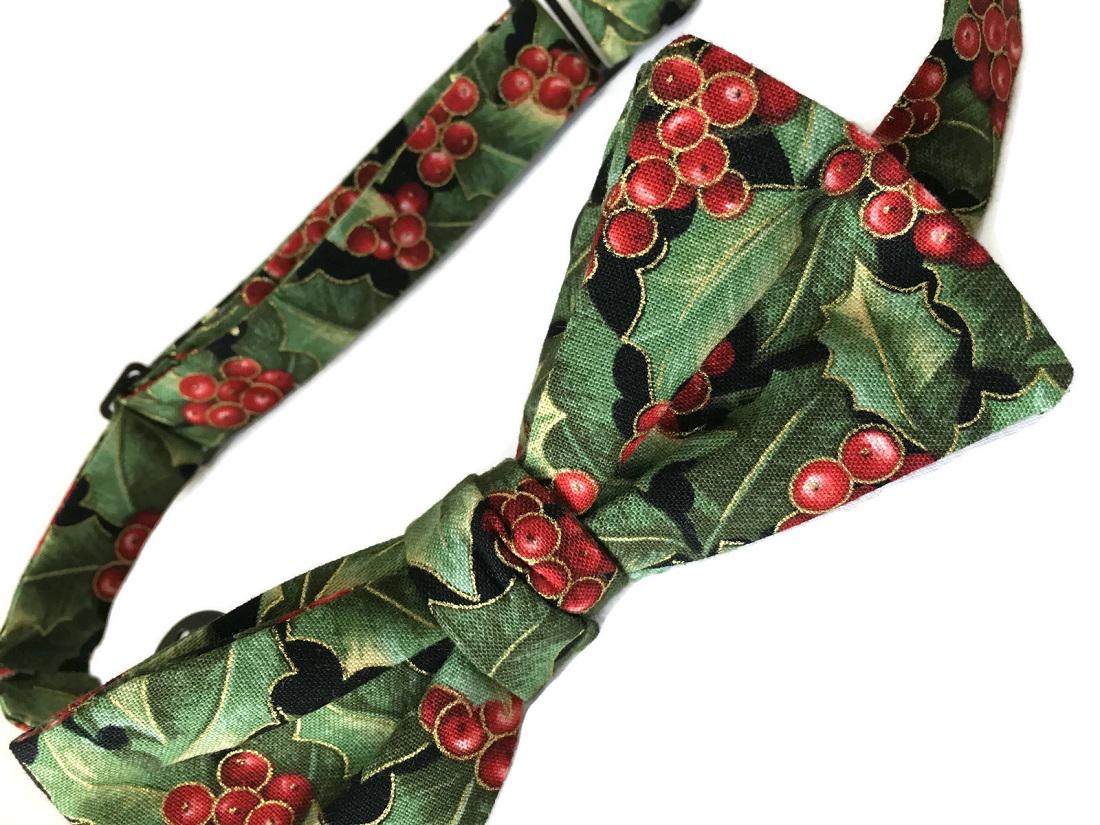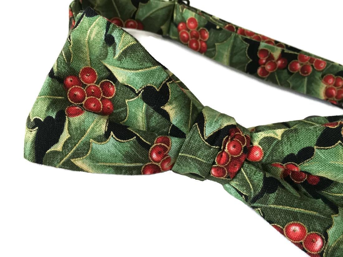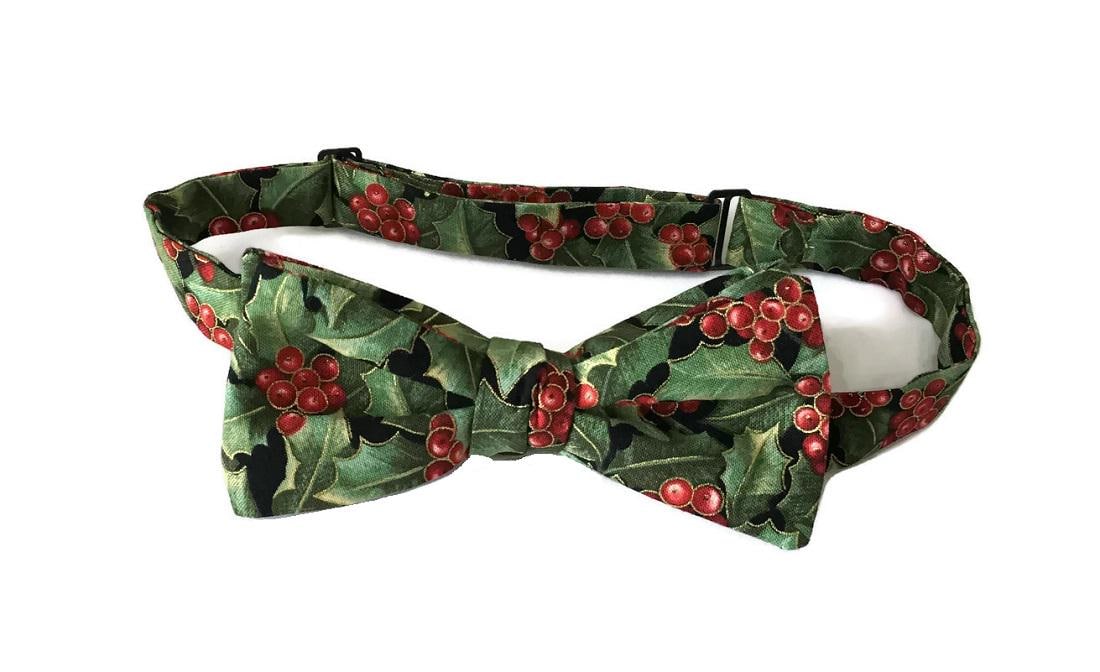 Handmade Pre-tied Bow Tie - Holiday Green and Red Holly Berry Touched with Gold Metallic - Premium Cotton - Adult Mens Sizing - Crafted in the USA by Holiday Bow Ties, LLC - The "Vale" Bow Tie