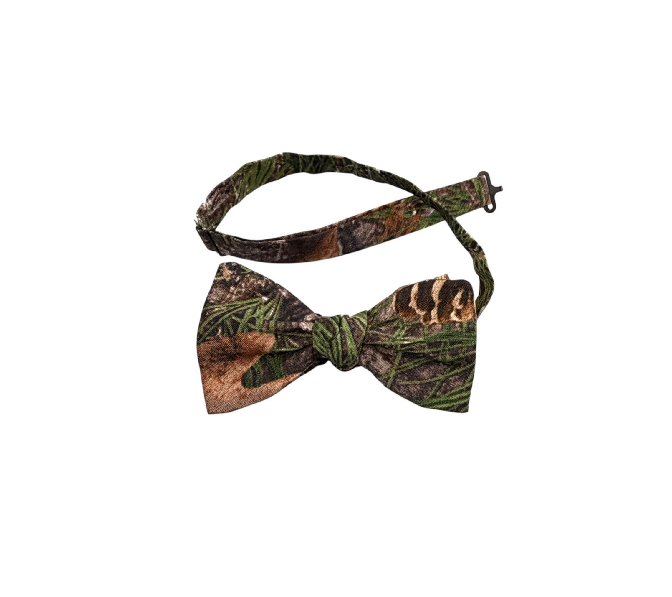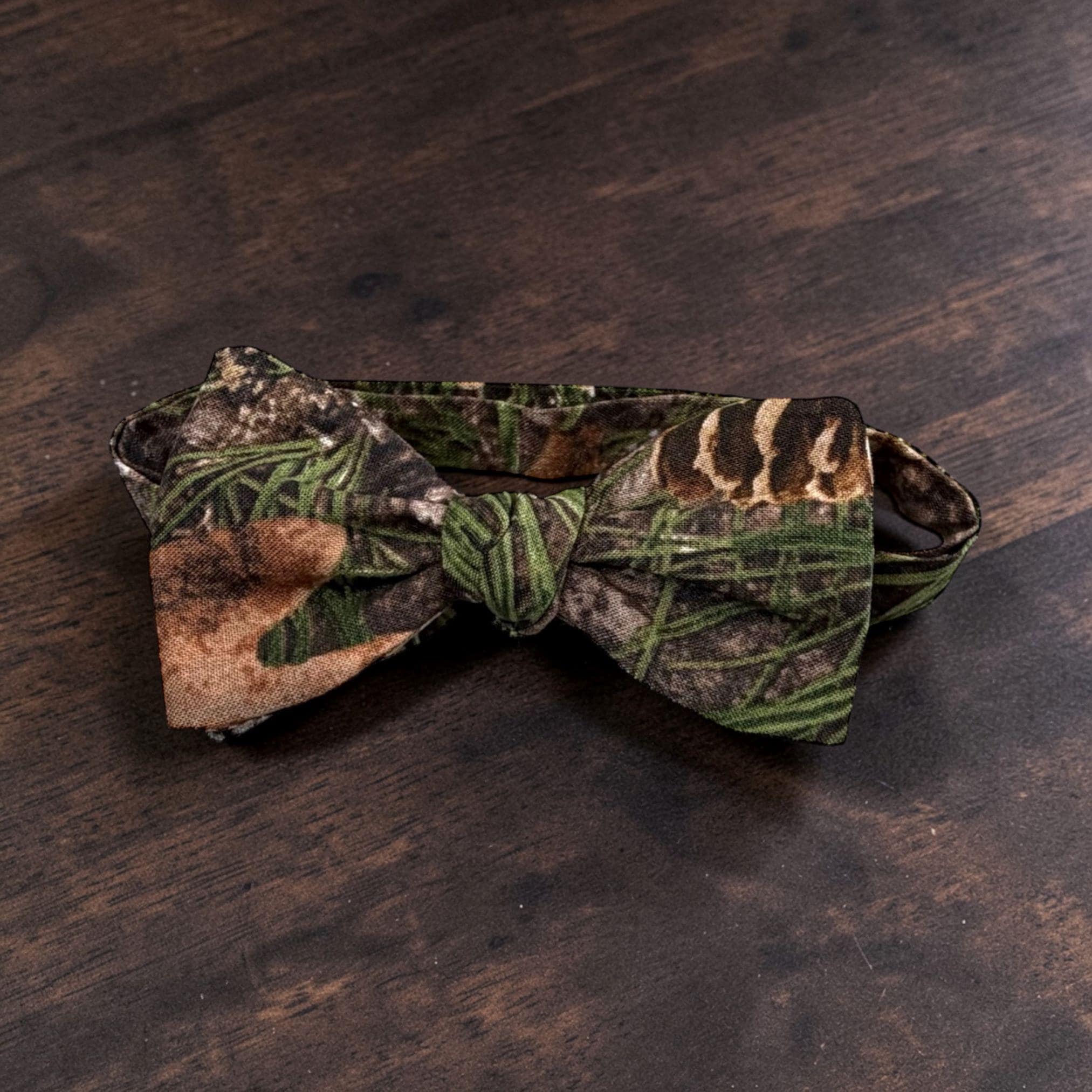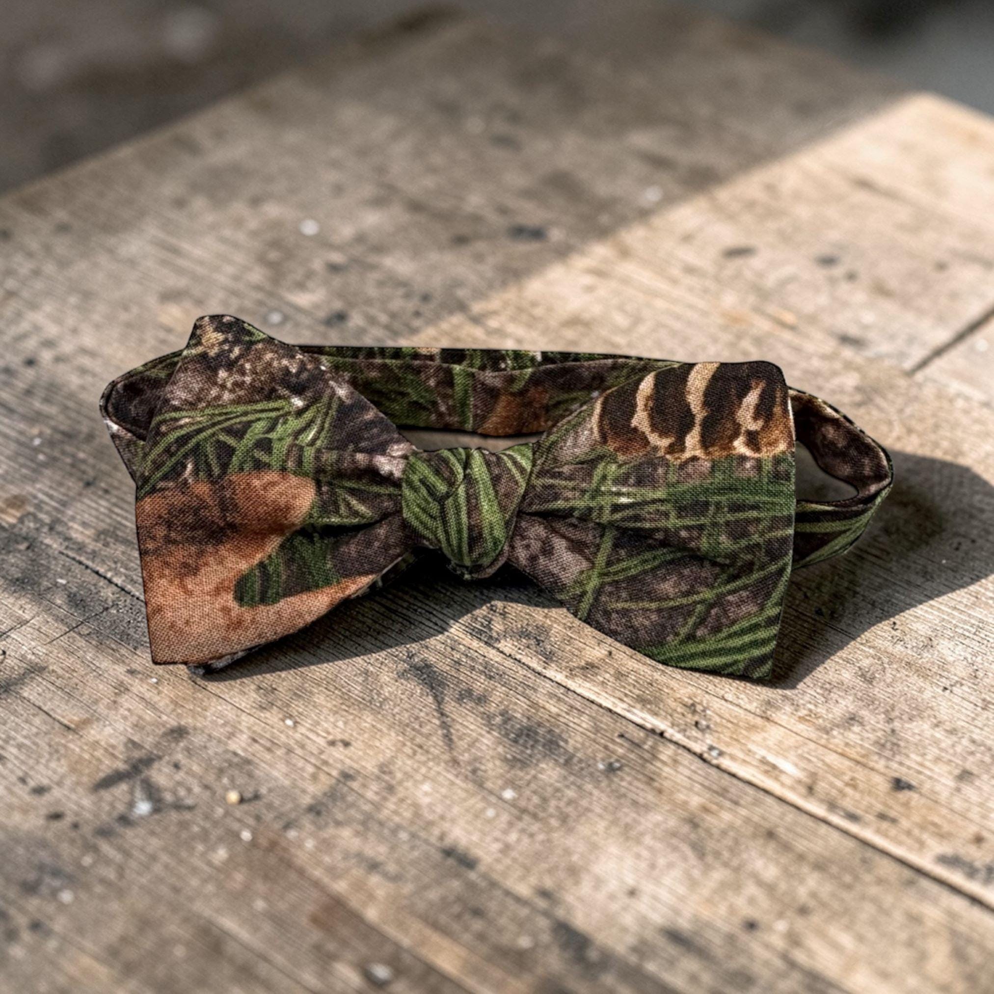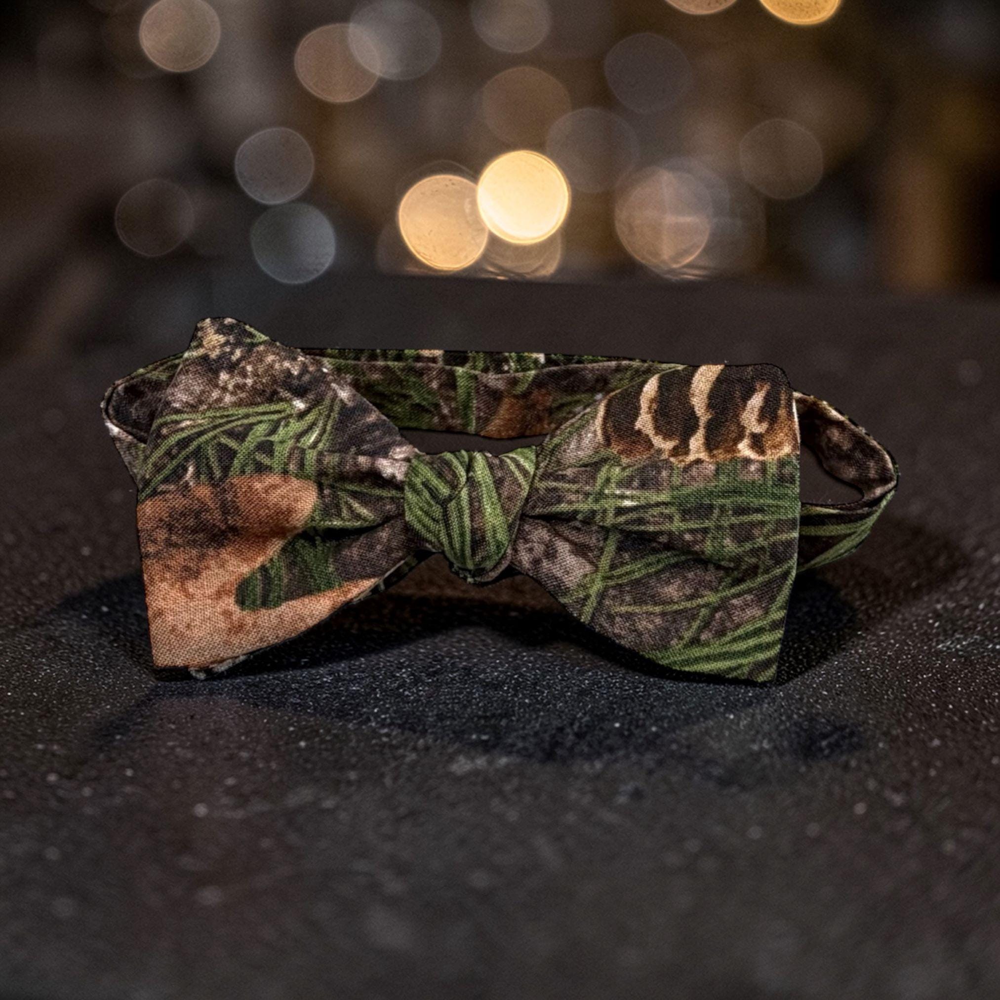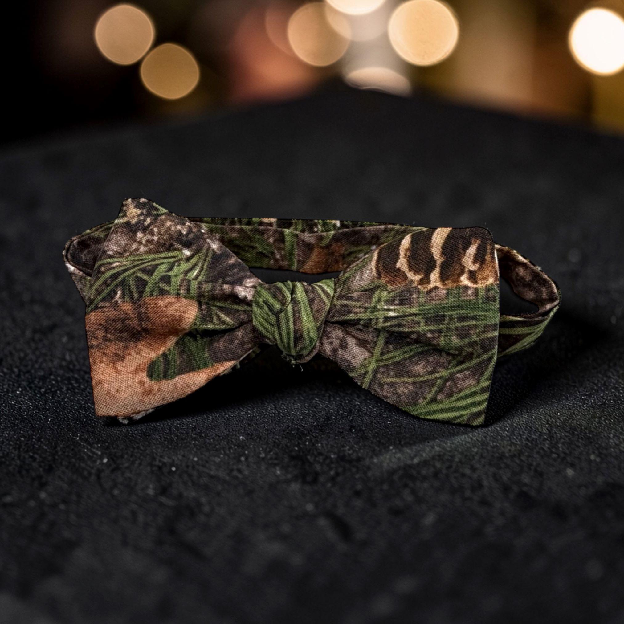 Self-tied or Pretied Bow Tie - Brown Timber and Pine Camouflage Patterned Neck Wear - Adult Men's Sizing - Weddings and Prom - Handcrafted in the USA - The "Hunter" Bow Tie