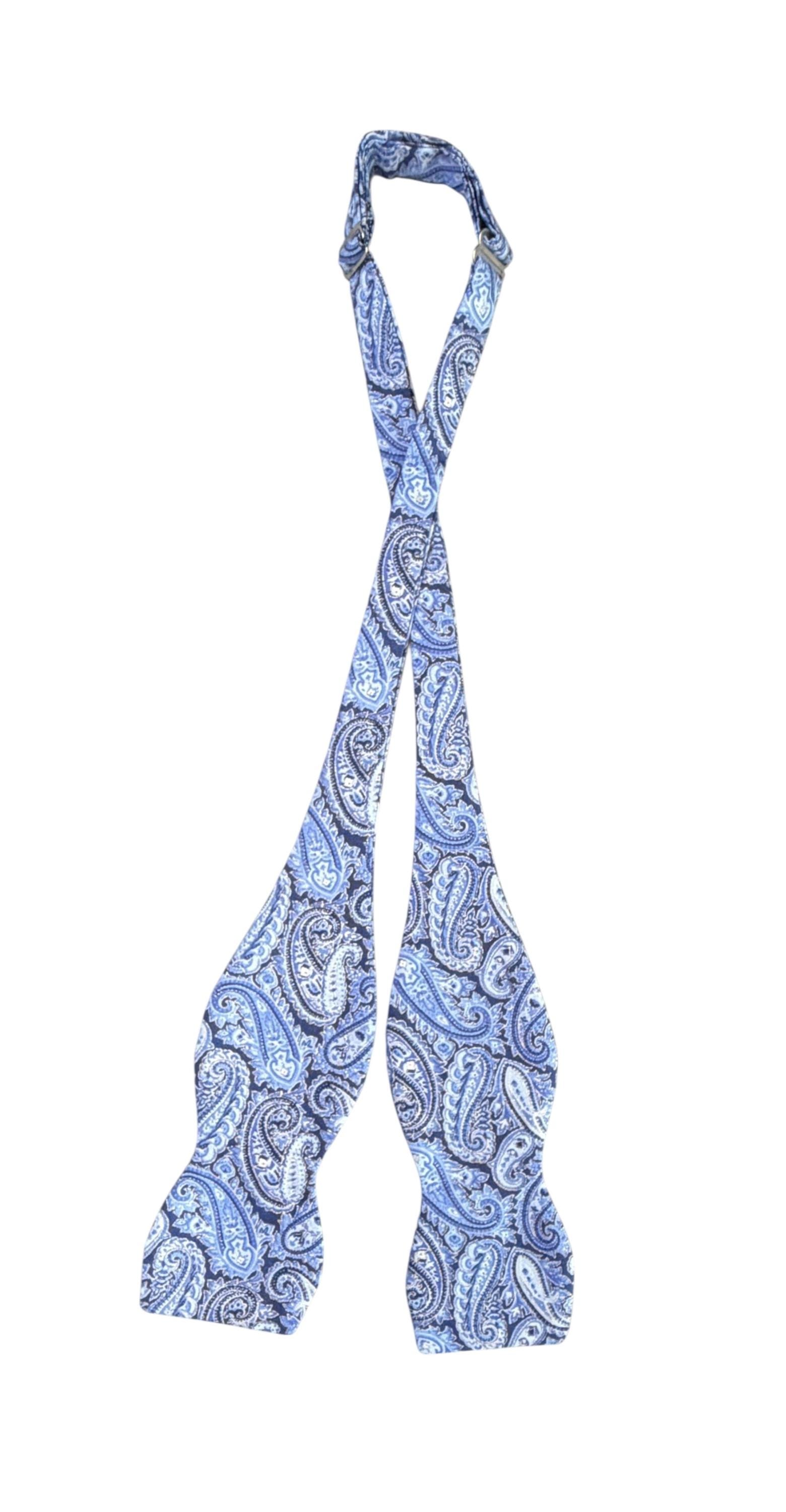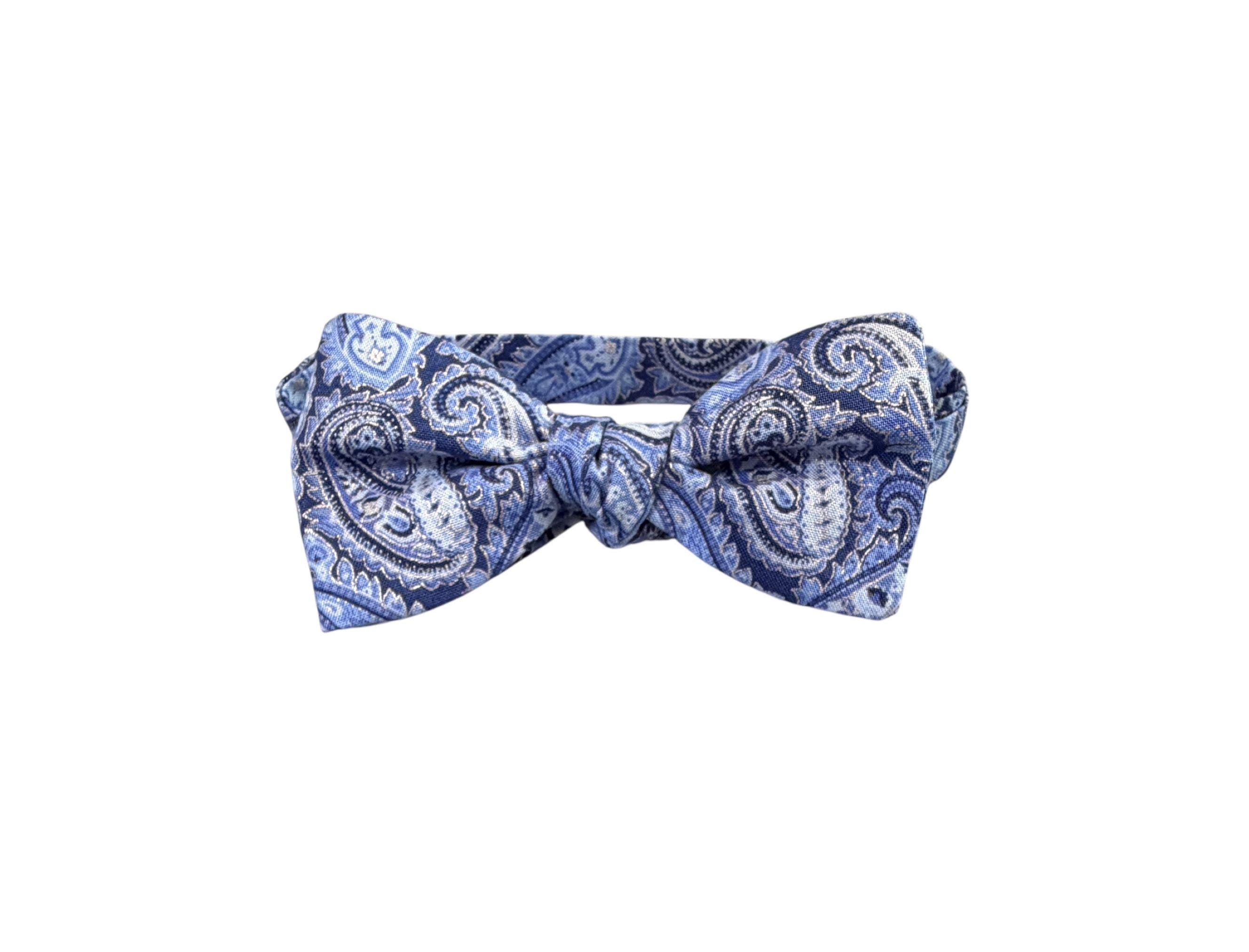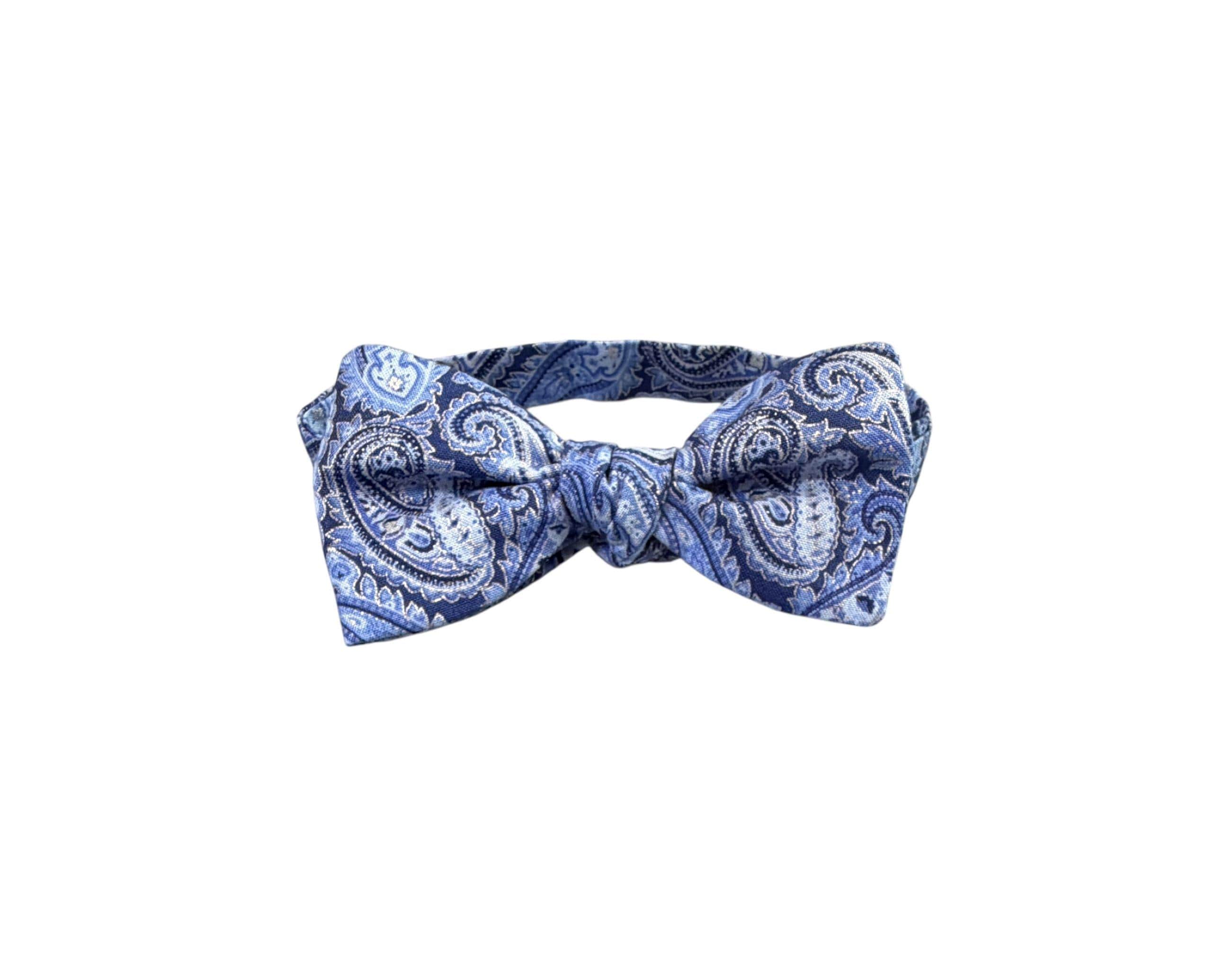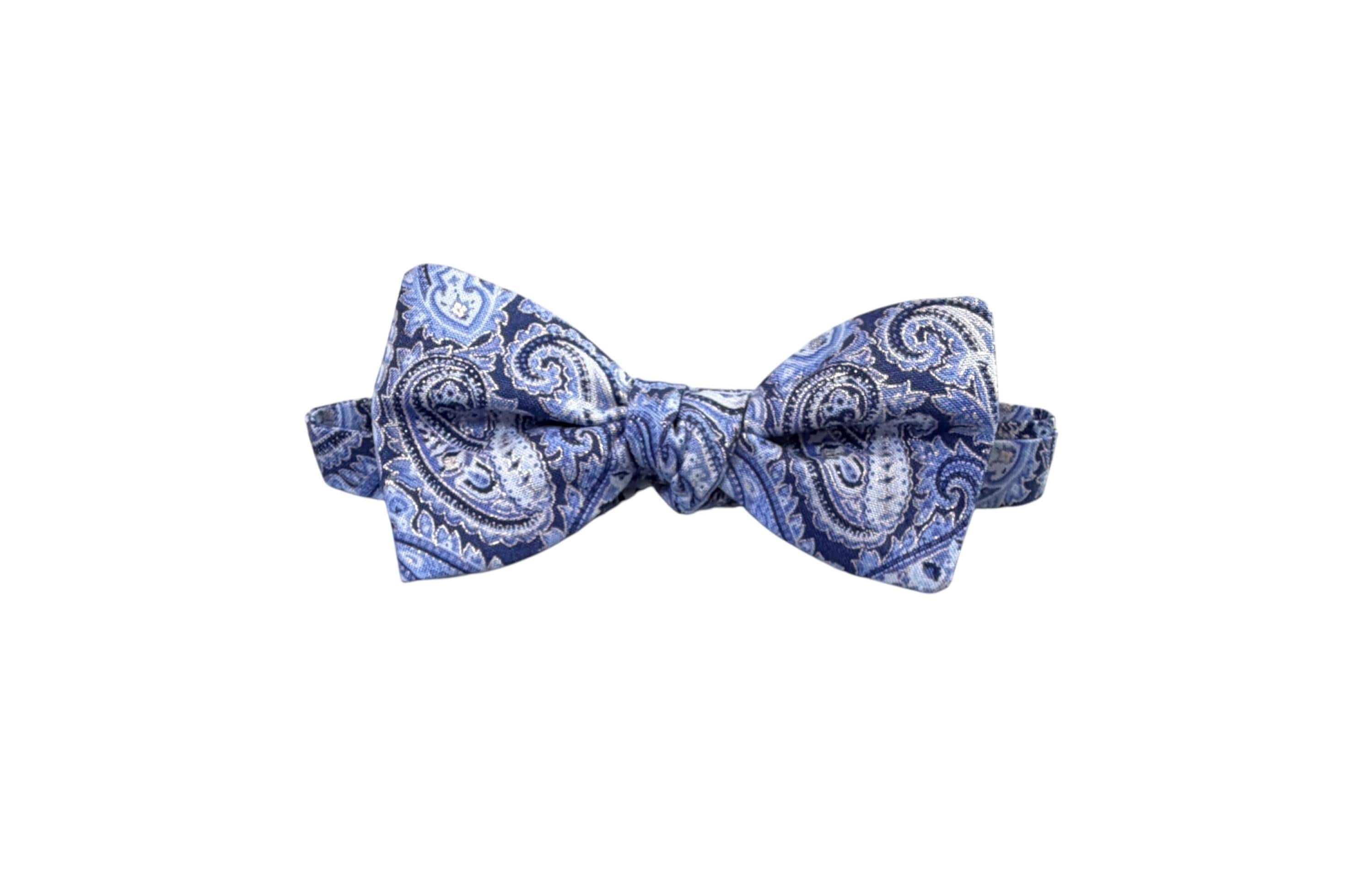 Self-Tie Bow Tie - Blue Paisley Accented with Silver Metallic Design Premium Cotton - Adjustable - Adult Men's Sizing - Handcrafted in the USA by Holiday Bow Ties, llc - The "Eastwood" Bow Tie