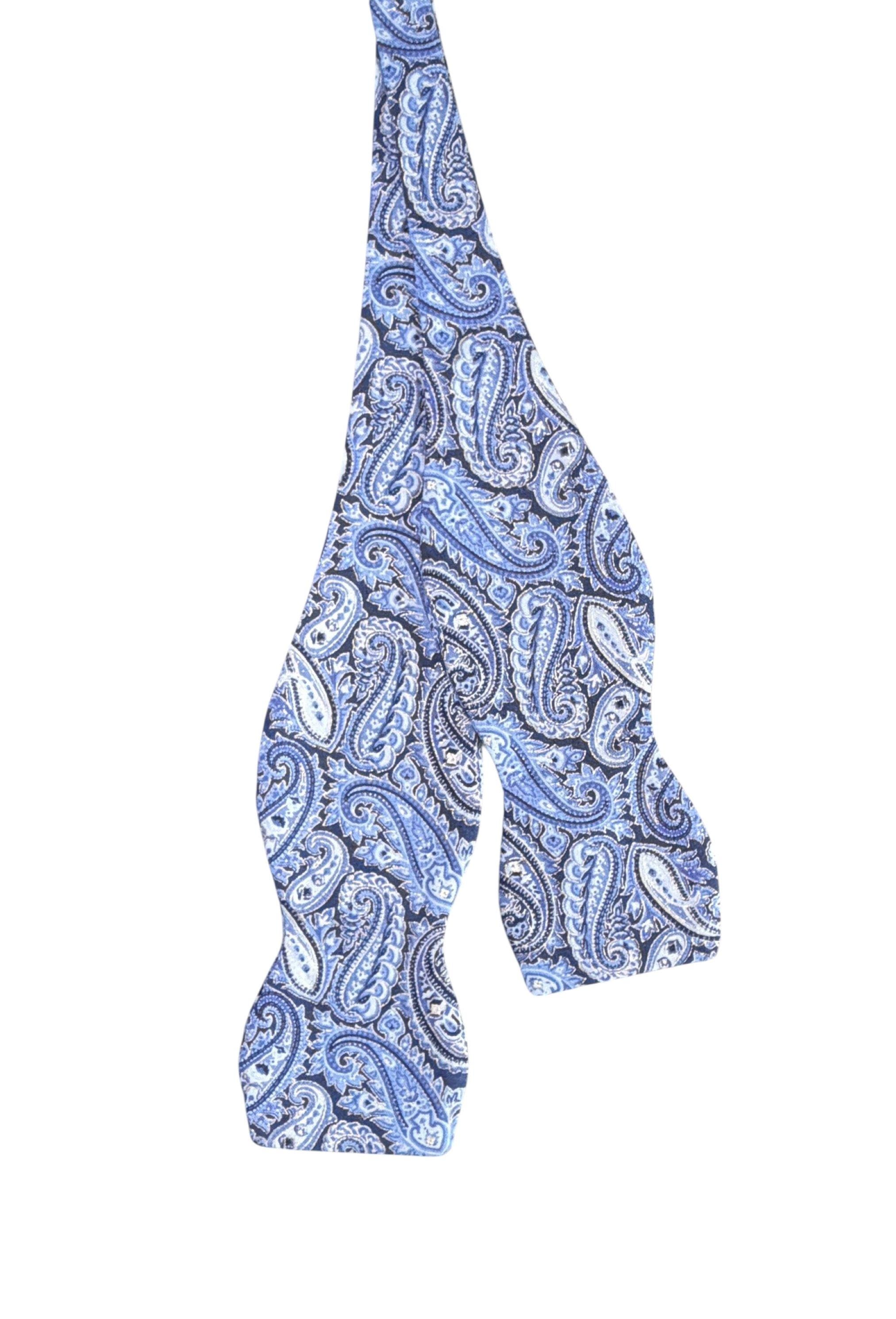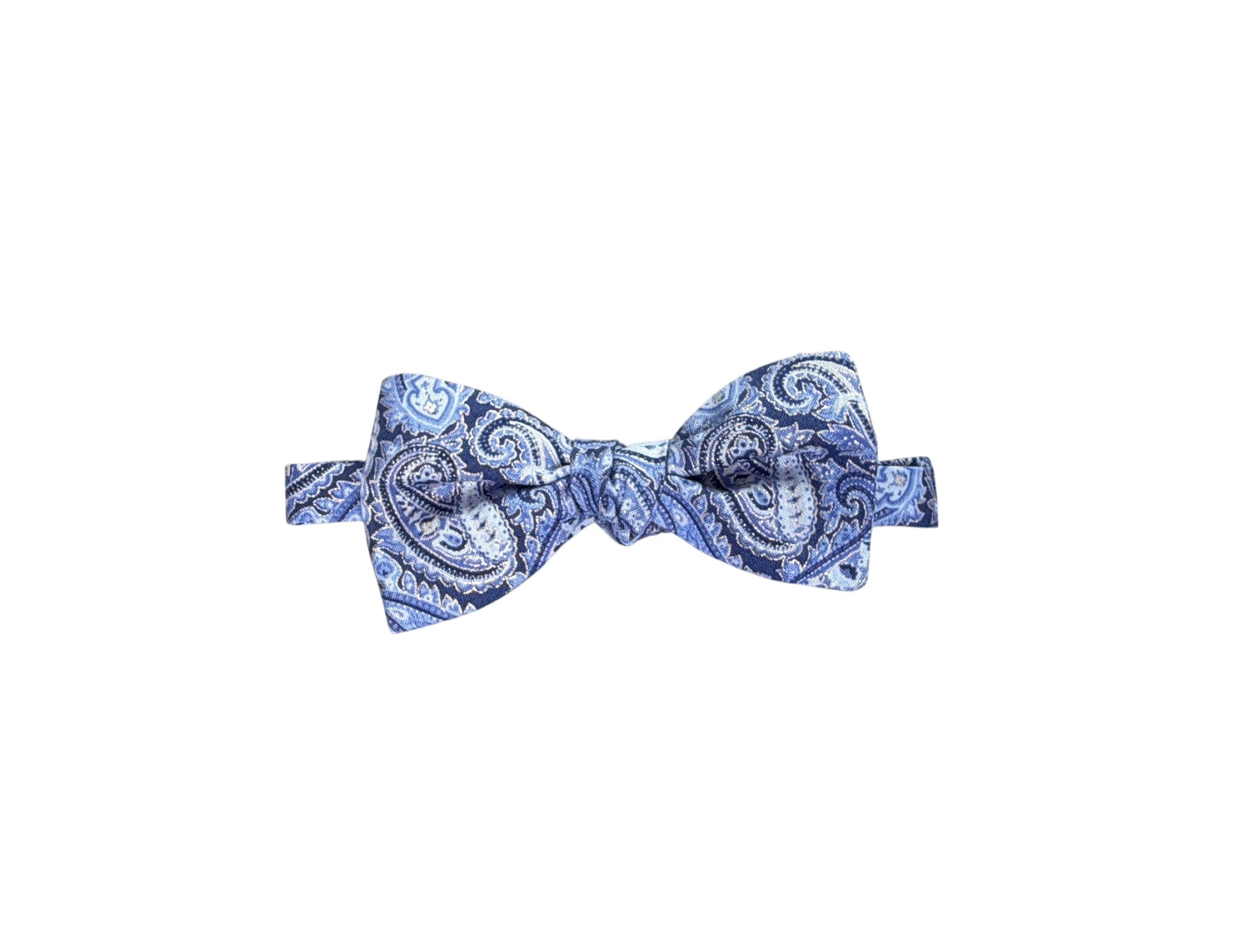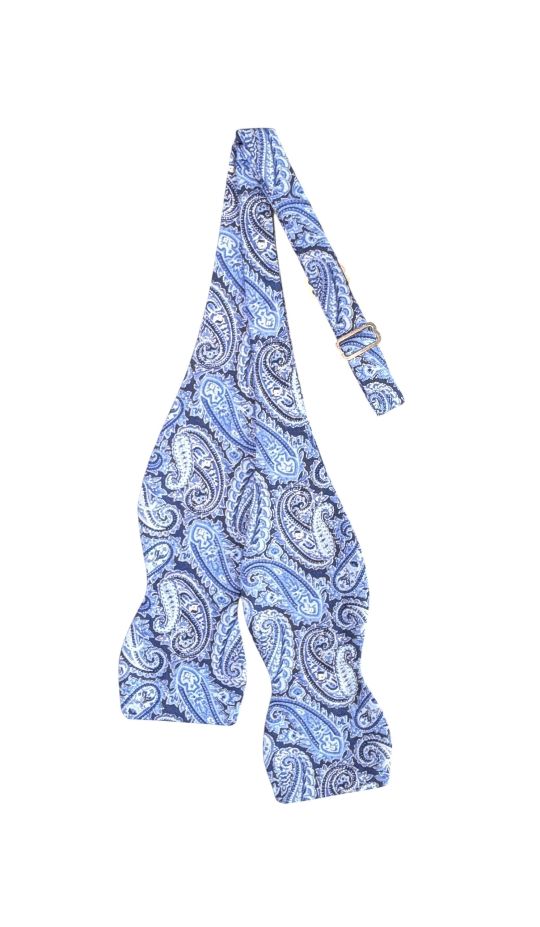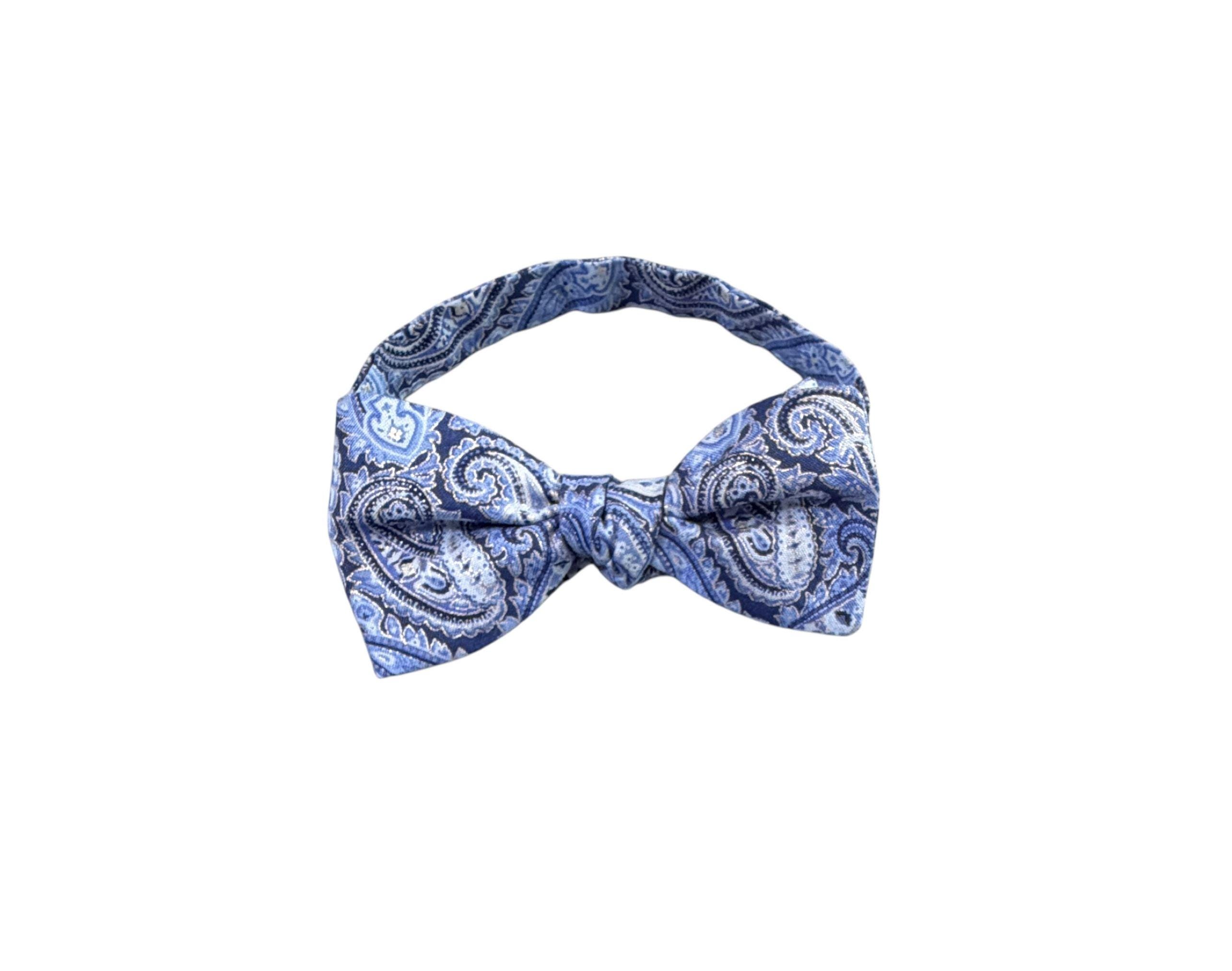 Self-Tie Bow Tie - Blue Paisley Accented with Silver Metallic Design Premium Cotton - Adjustable - Adult Men's Sizing - Handcrafted in the USA by Holiday Bow Ties, llc - The "Eastwood" Bow Tie