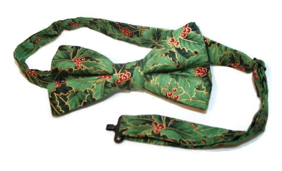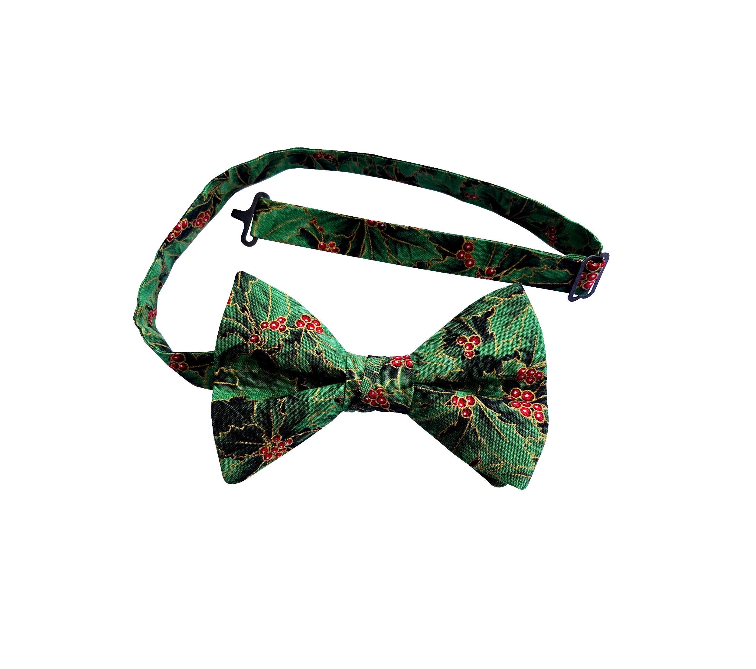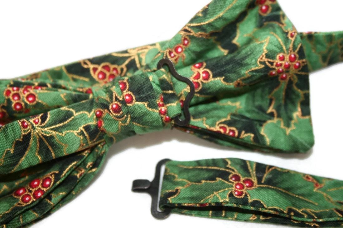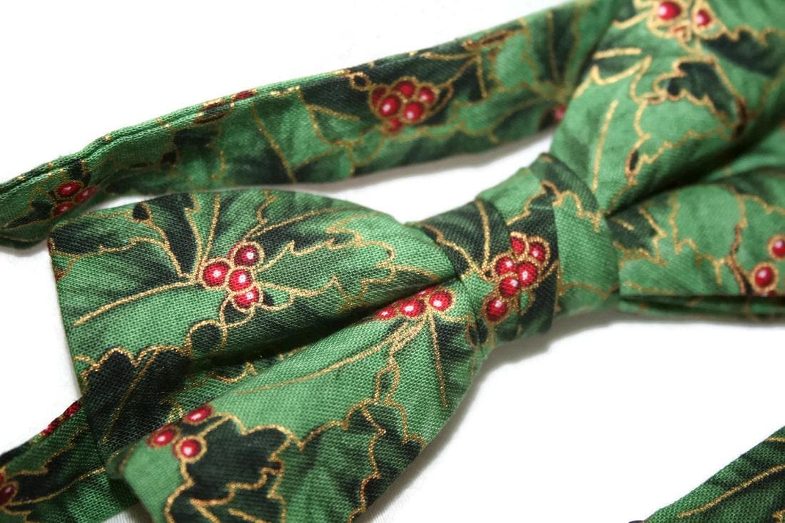 Handmade Pre-tied Bow Tie - Holiday Green and Red Holly Berry Touched with Gold Metallic - Premium Cotton - Adult Mens Sizing - Crafted in the USA by Holiday Bow Ties, LLC - The "Holly" Bow Tie