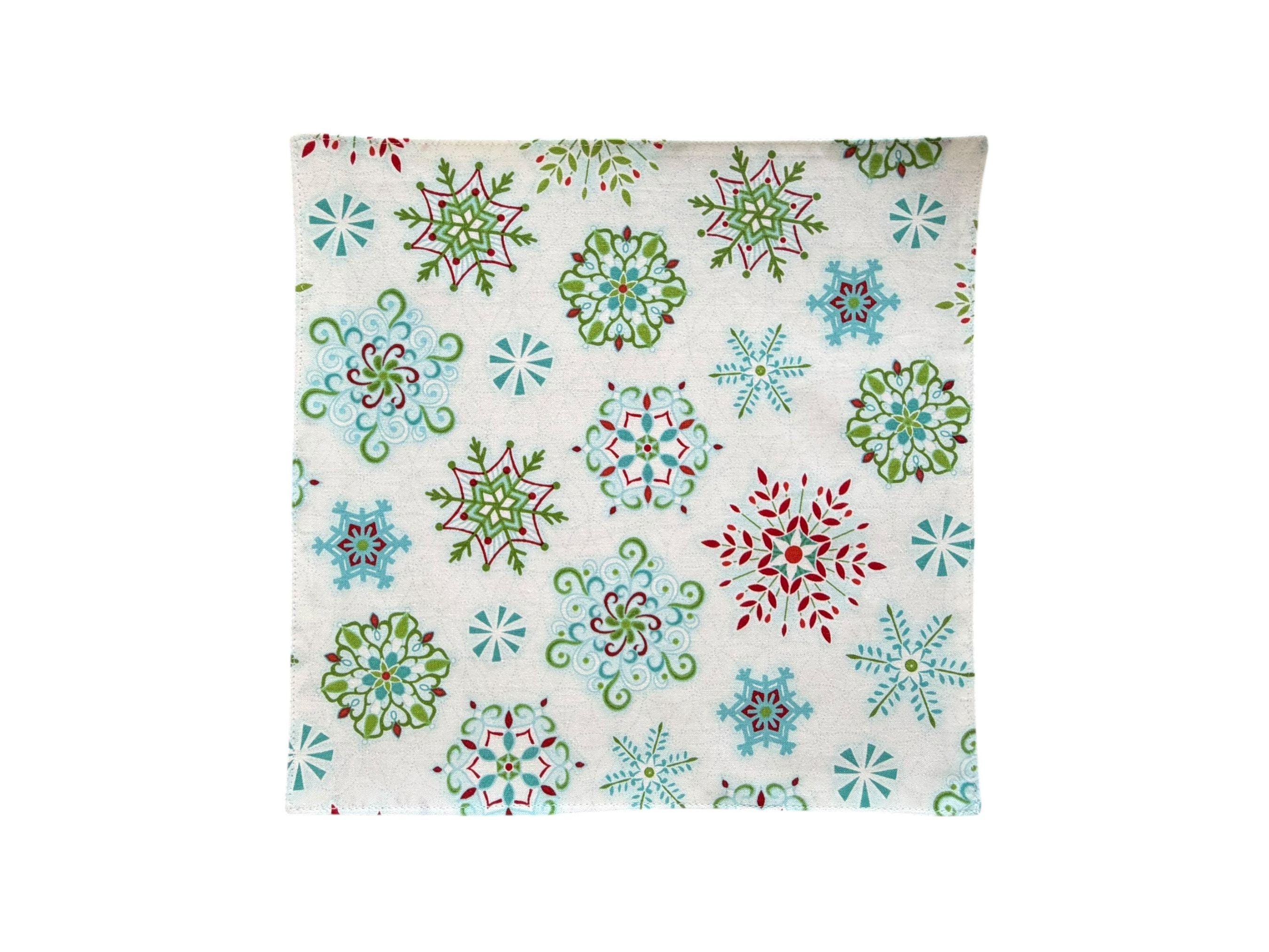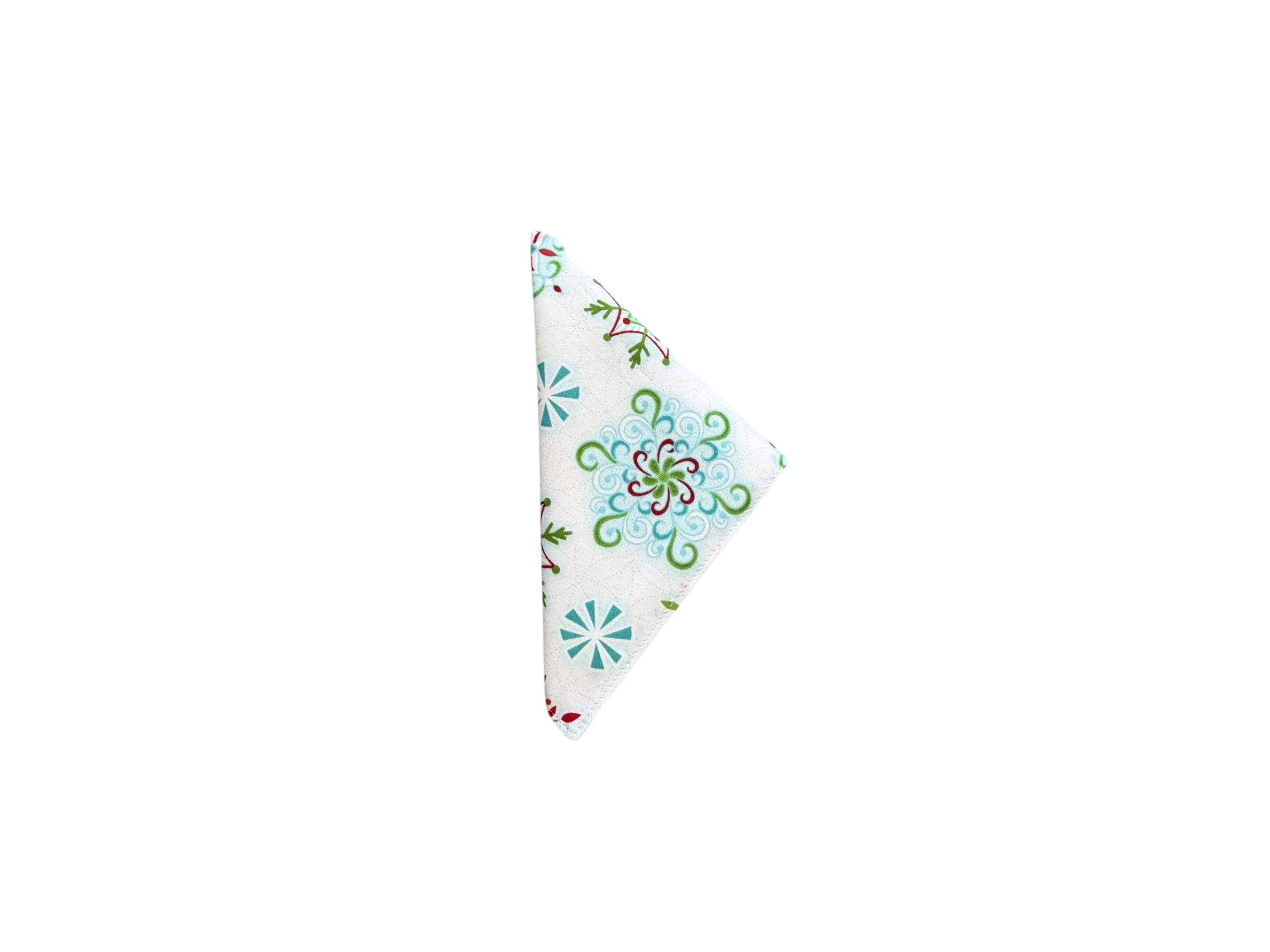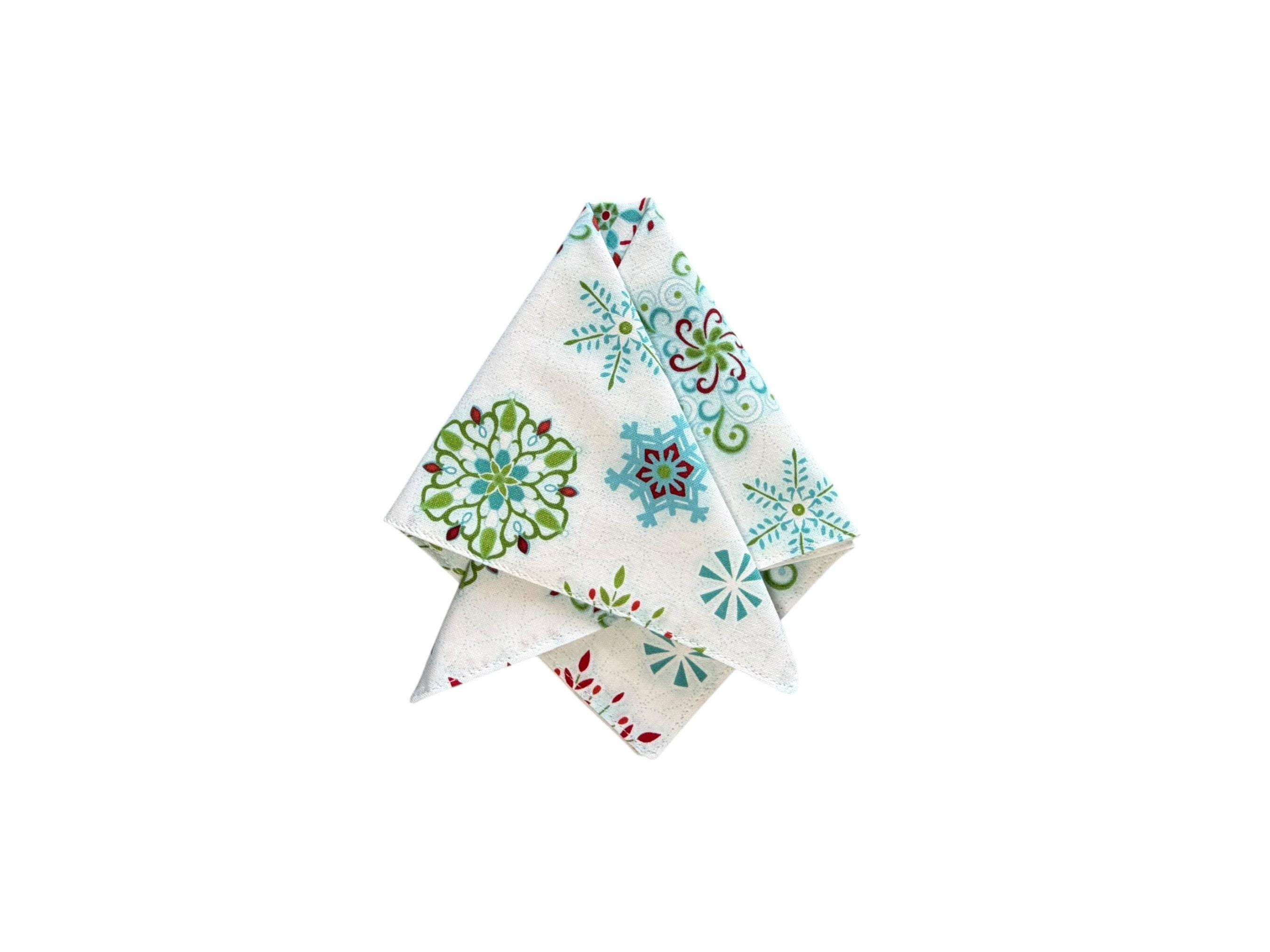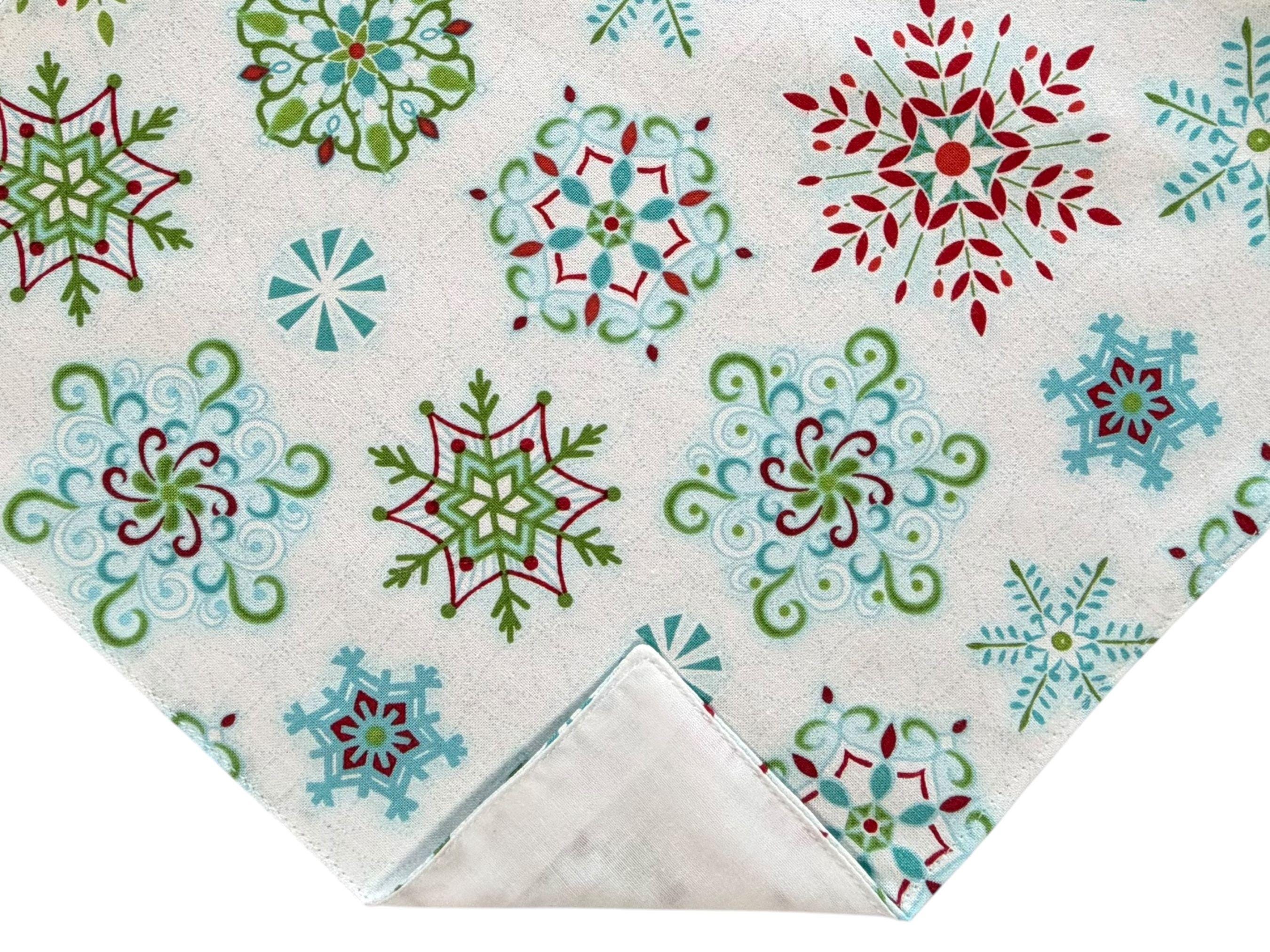 Handmade Pocket Square - White Handkerchief with Blue Green and Red Snowflakes Holiday - Adult Mens Sizing - Crafted in the USA by Holiday Bow Ties, LLC - The "Noah" Pocket Square