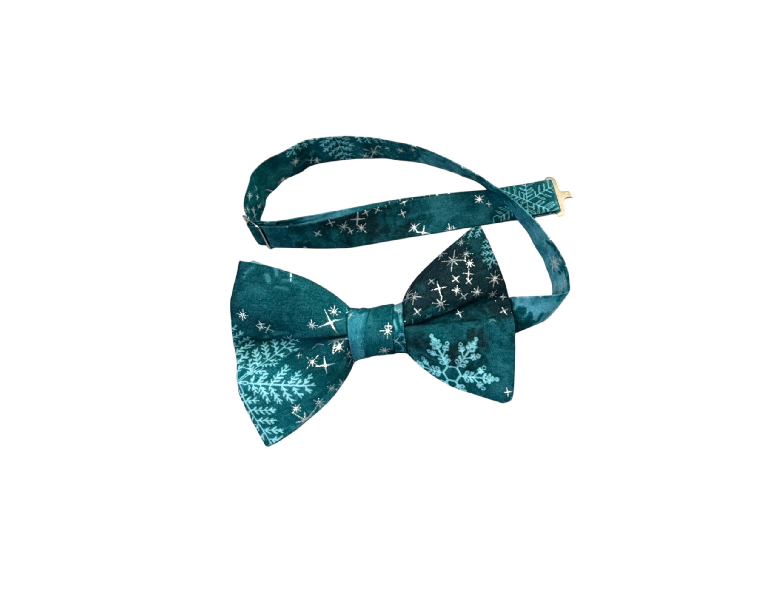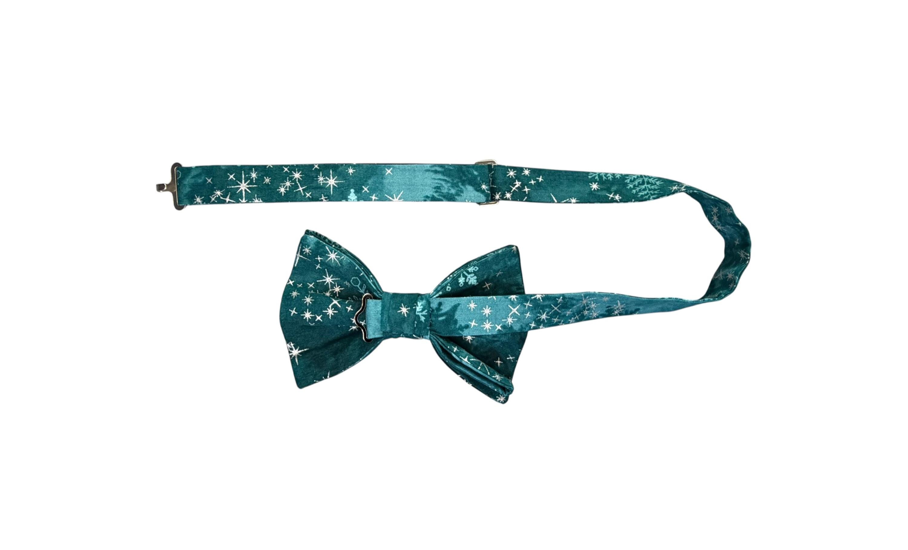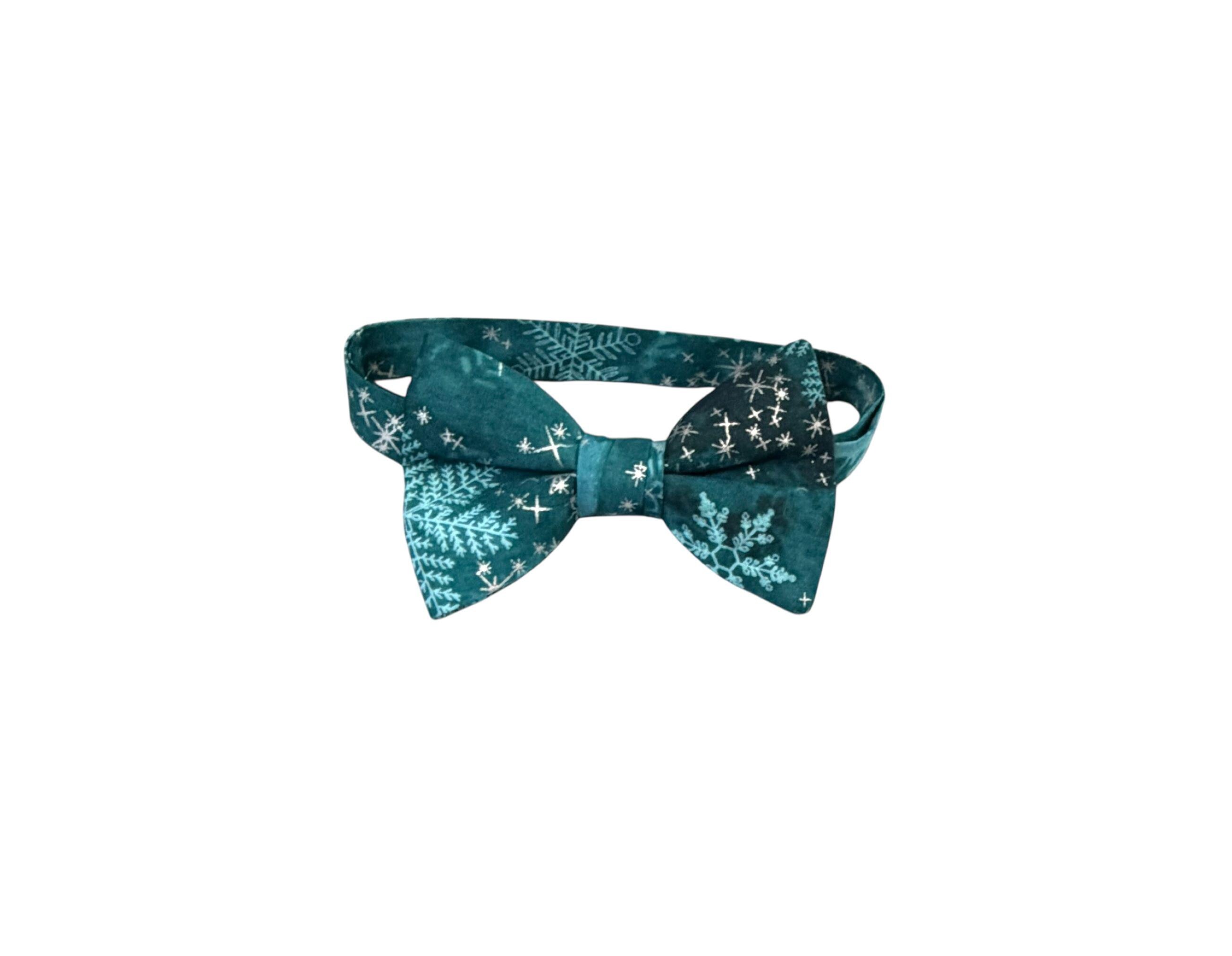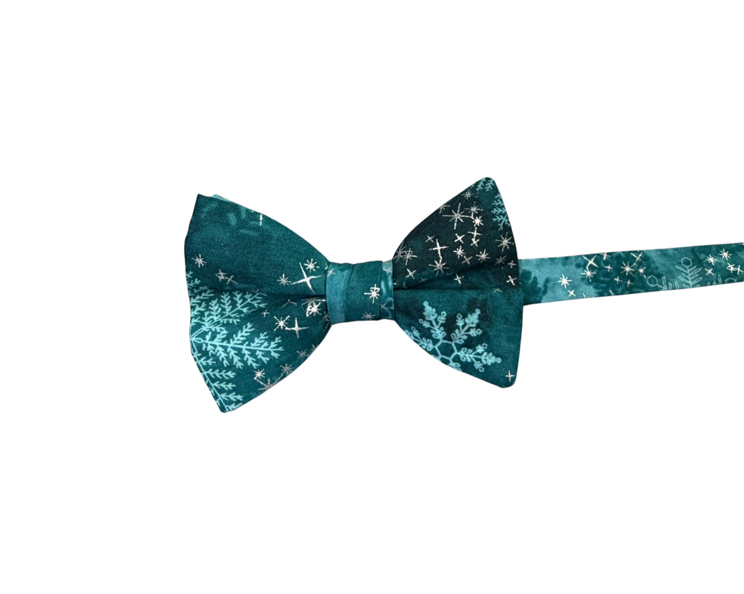 Handmade Pre-tied Bow Tie - Handmade Teal and Aqua Snowflakes with Silver Metallic Stars - Premium Cotton - Adult Men's Sizing - Crafted in the USA by Holiday Bow Ties, LLC - The "North" Bow Tie