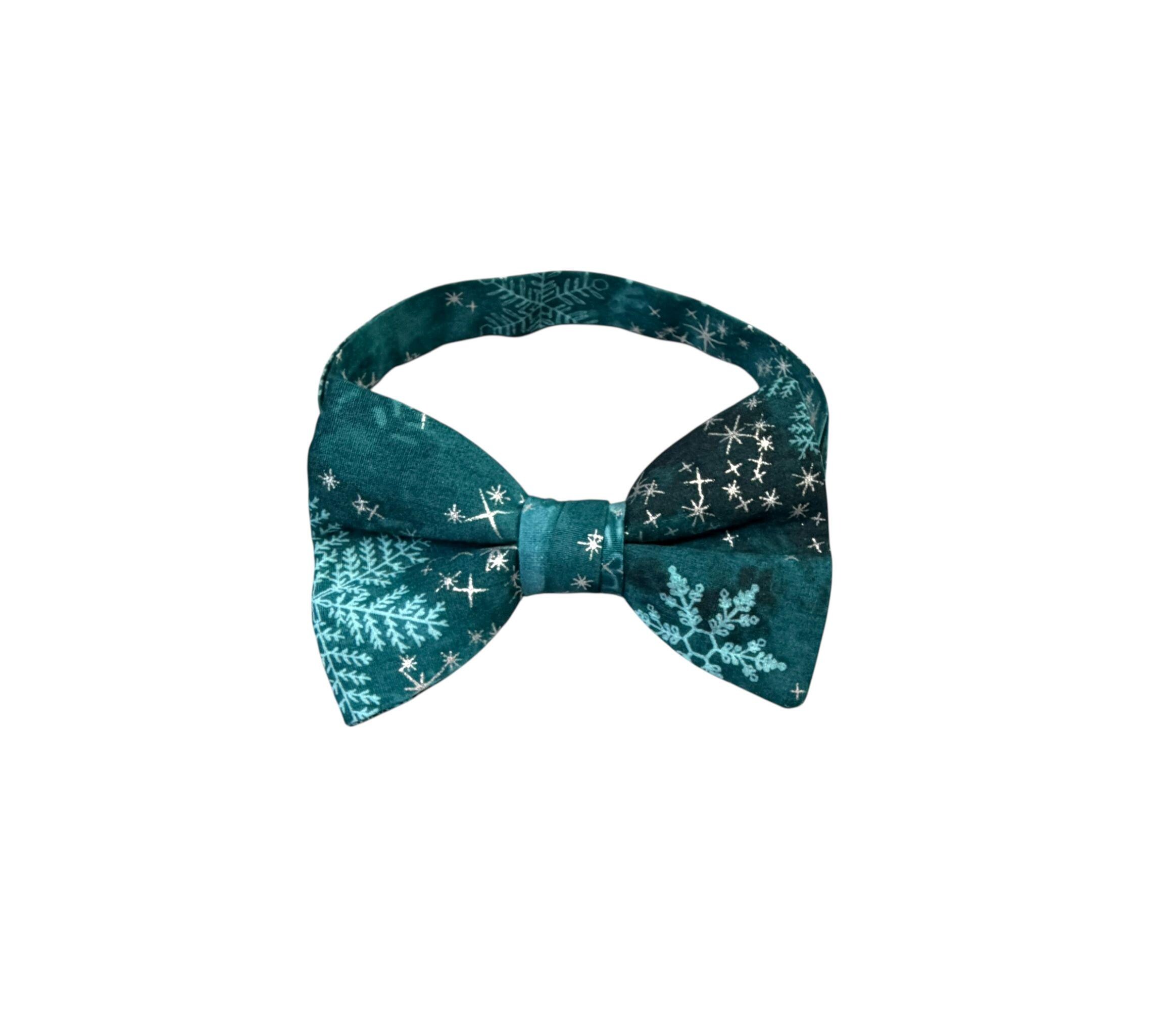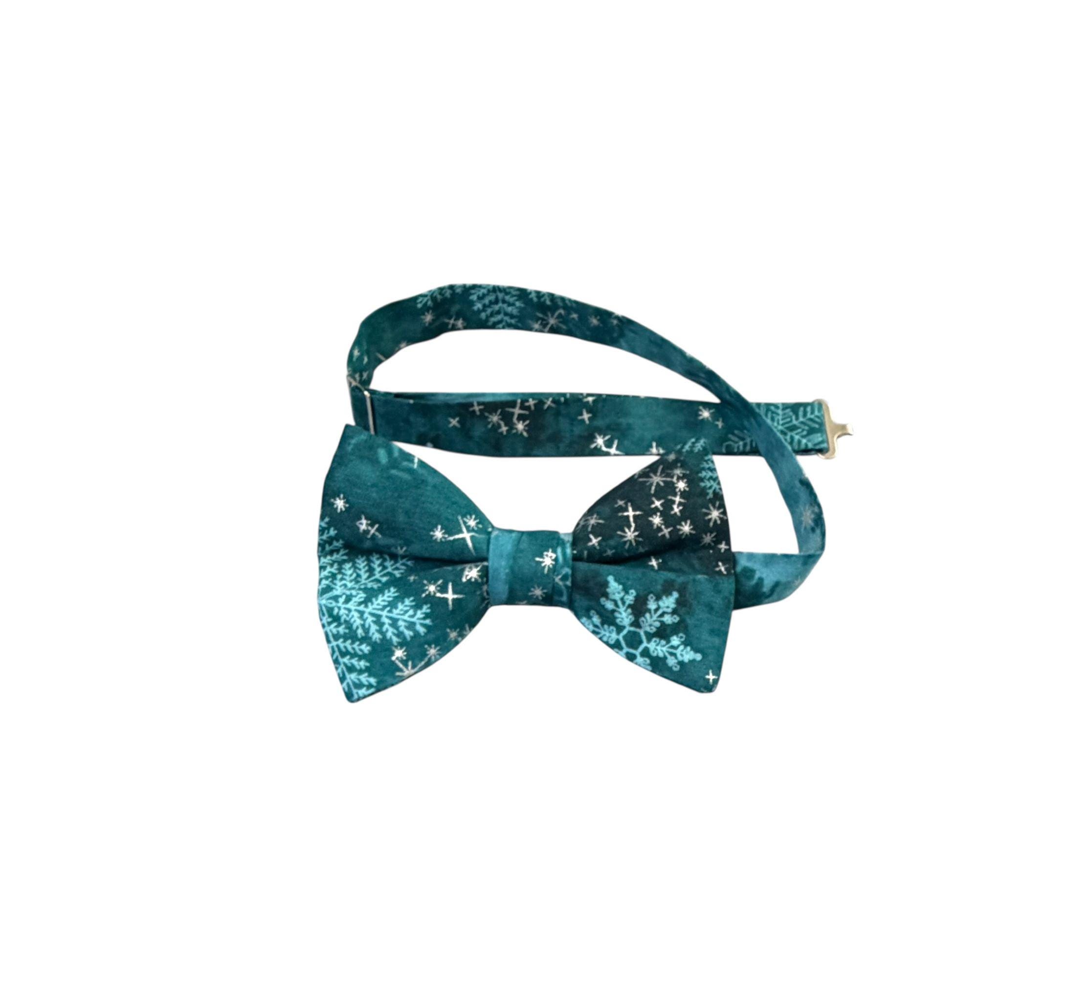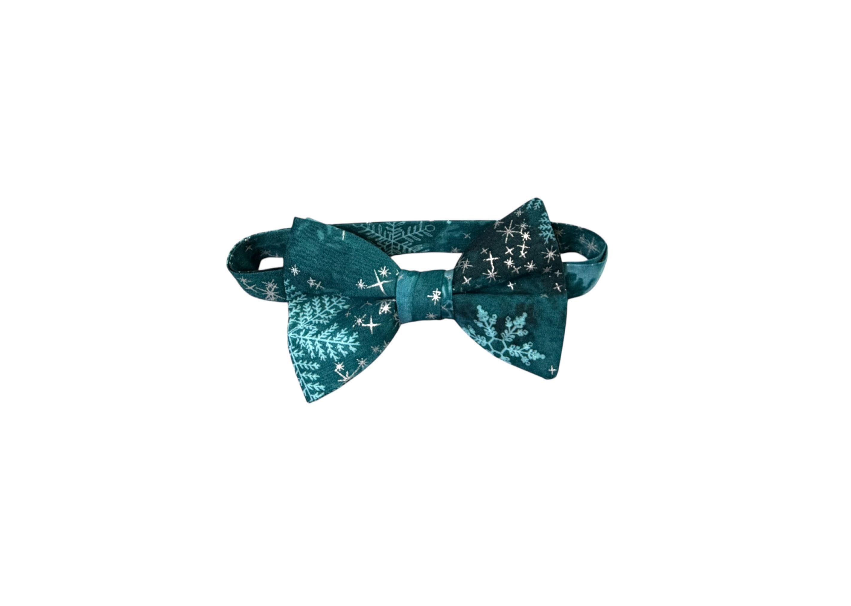 Handmade Pre-tied Bow Tie - Handmade Teal and Aqua Snowflakes with Silver Metallic Stars - Premium Cotton - Adult Men's Sizing - Crafted in the USA by Holiday Bow Ties, LLC - The "North" Bow Tie