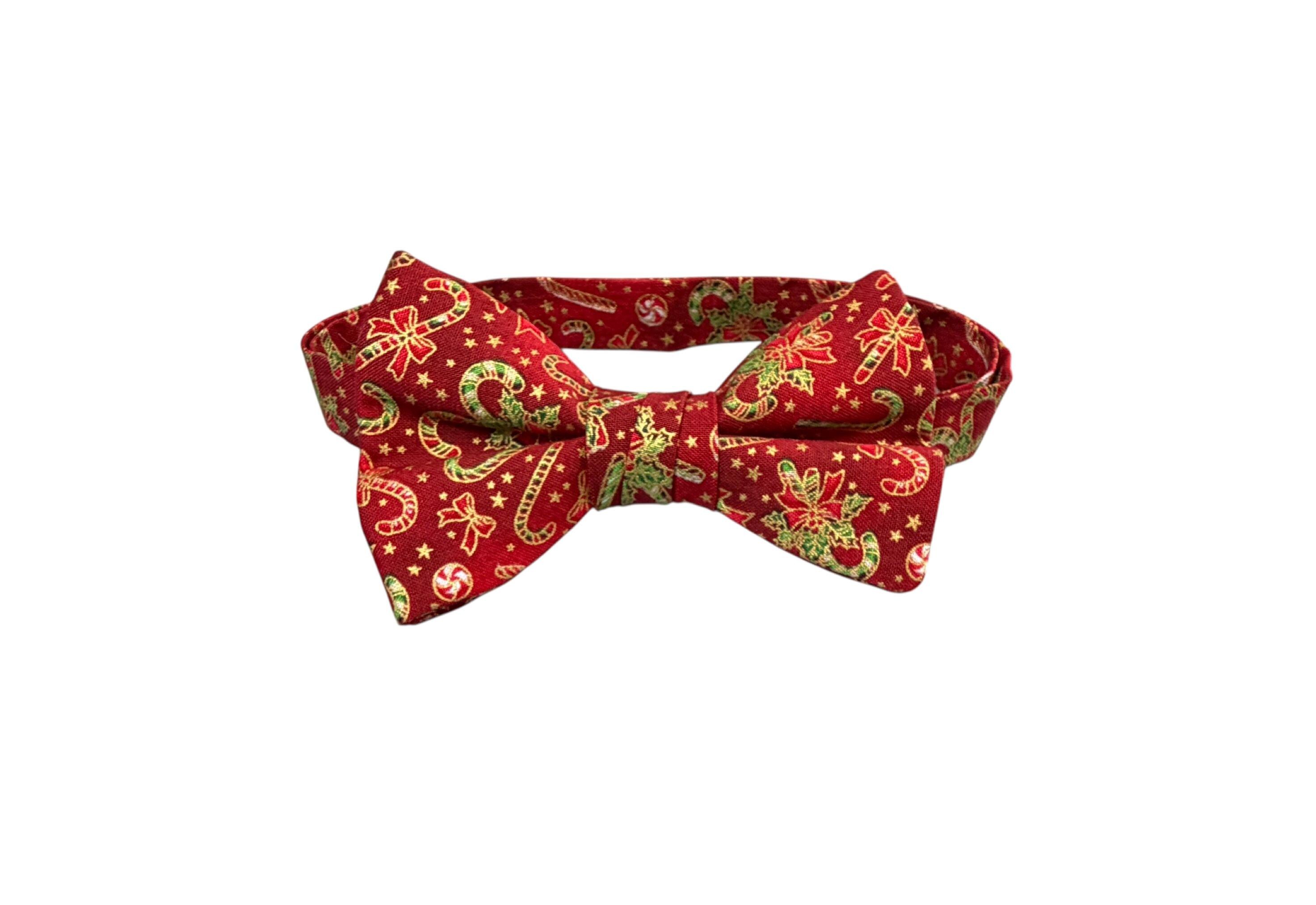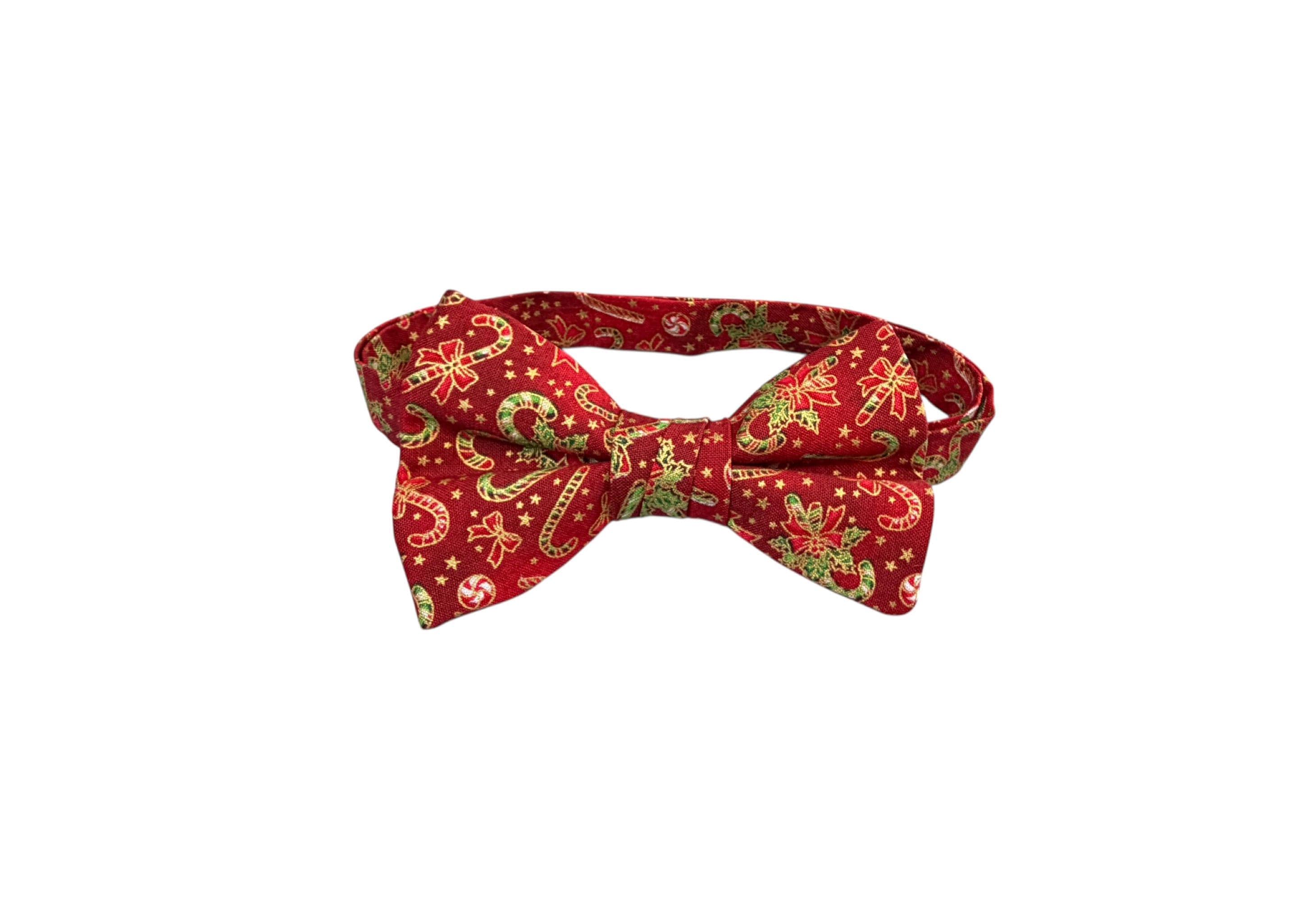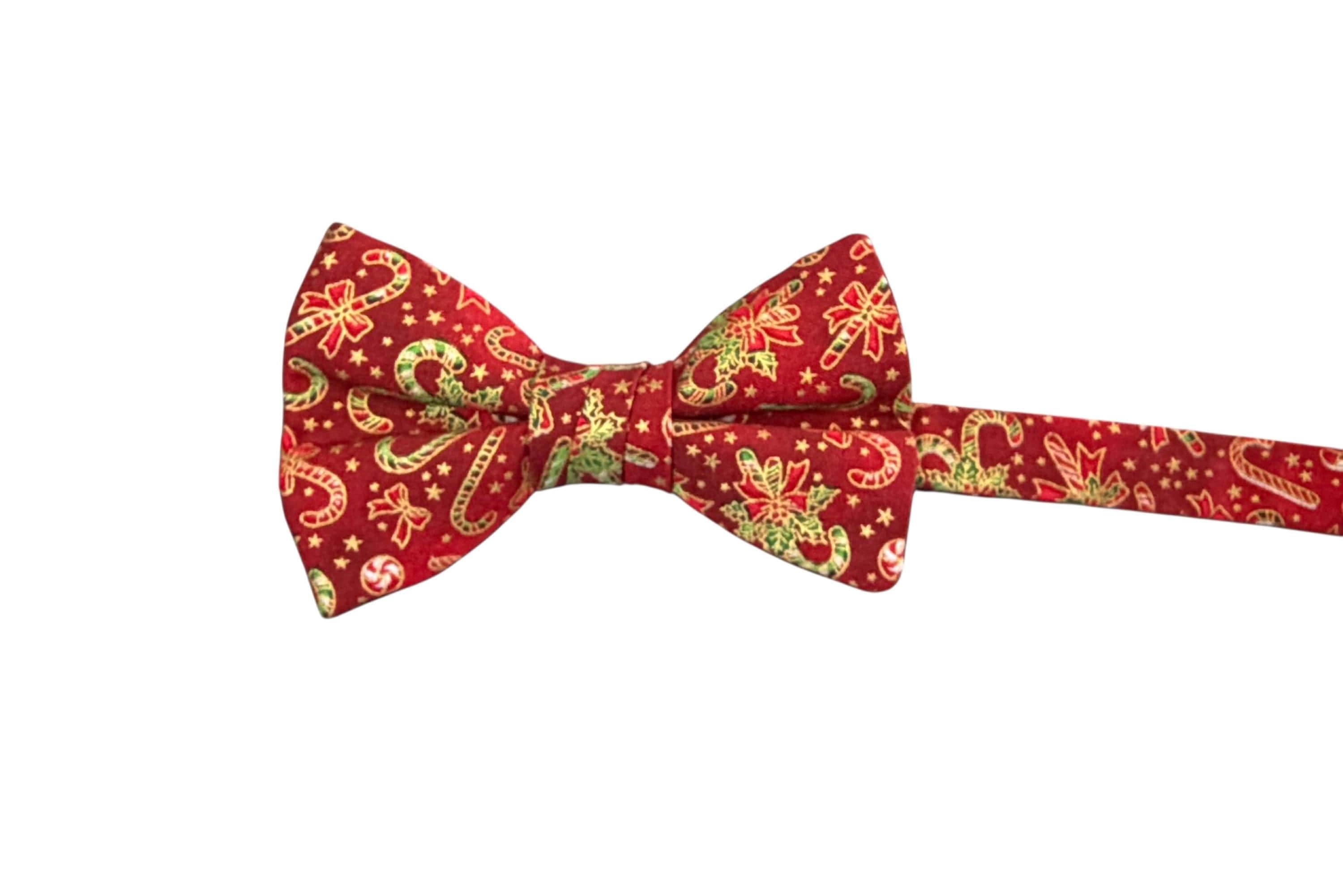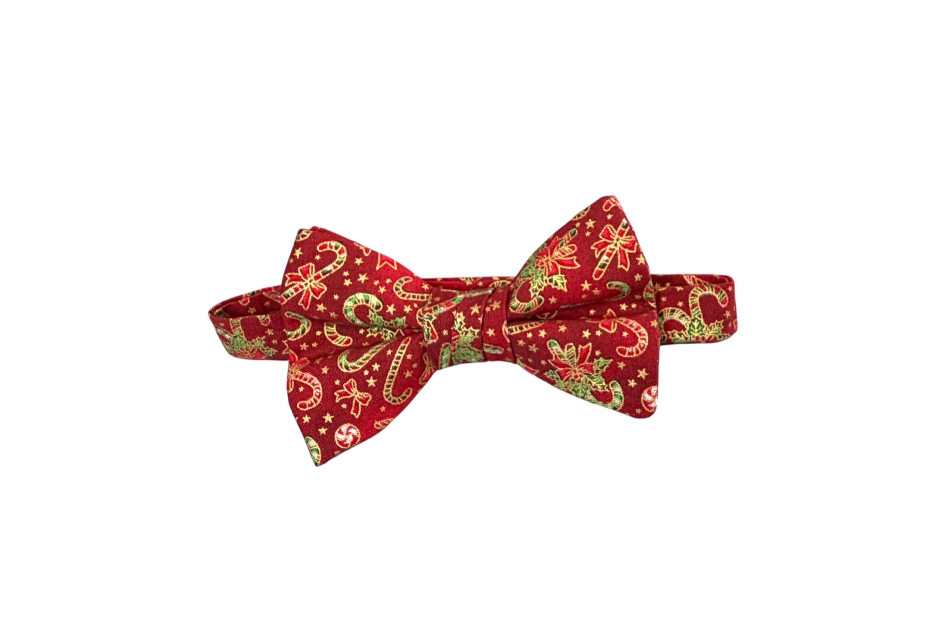 Candy Cane Handmade Pre-tied Bow Tie - Christmas Red and Green Accented with Gold Metallic - Premium Cotton - Adult Men's Sizing - Crafted in the USA by Holiday Bow Ties, LLC - The "Emmanuel"