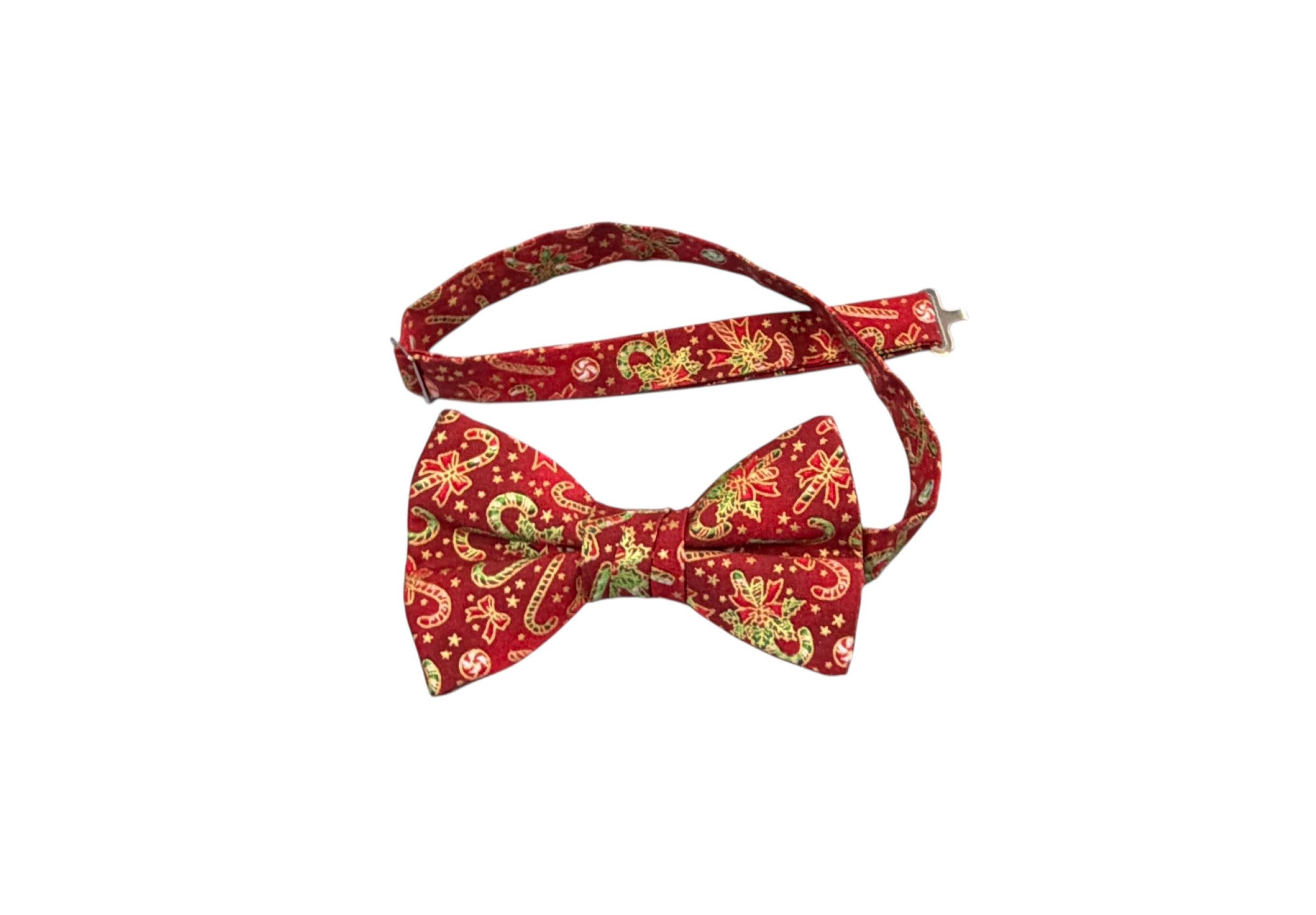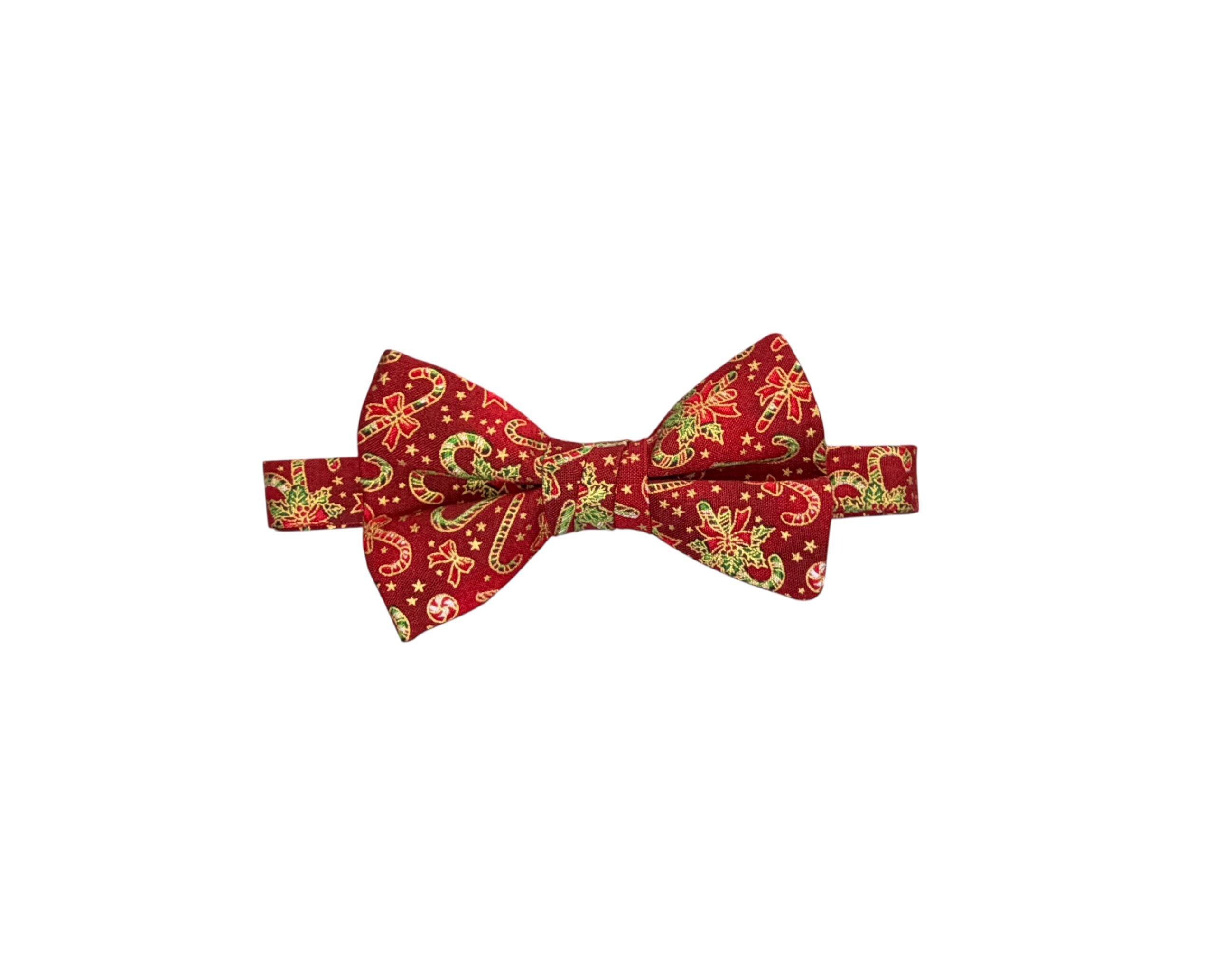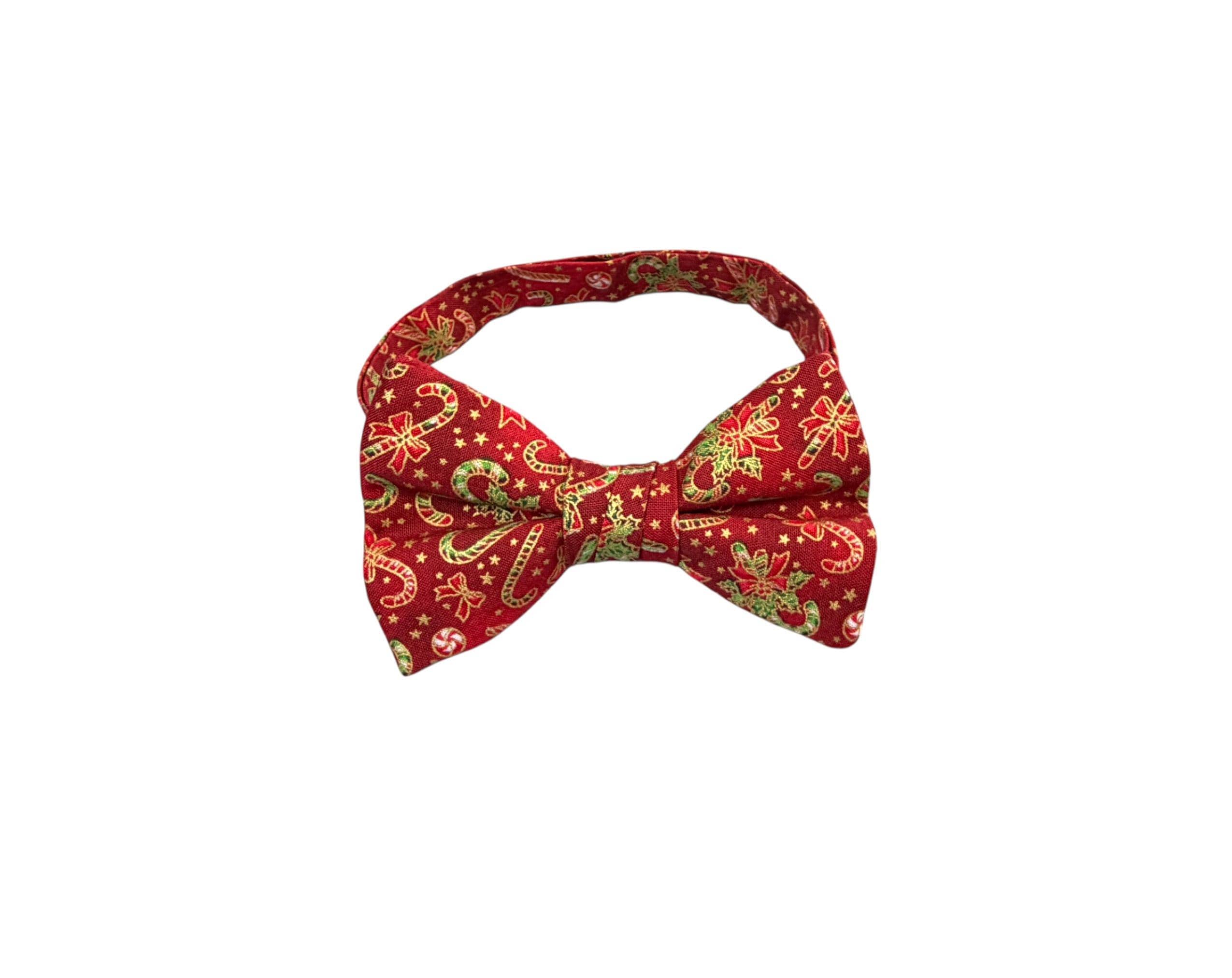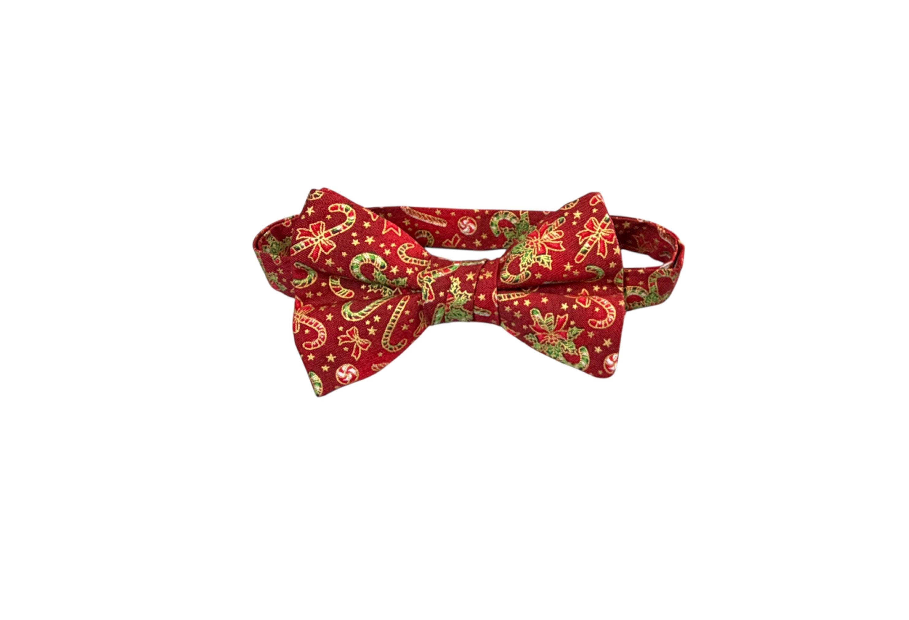 Candy Cane Handmade Pre-tied Bow Tie - Christmas Red and Green Accented with Gold Metallic - Premium Cotton - Adult Men's Sizing - Crafted in the USA by Holiday Bow Ties, LLC - The "Emmanuel"