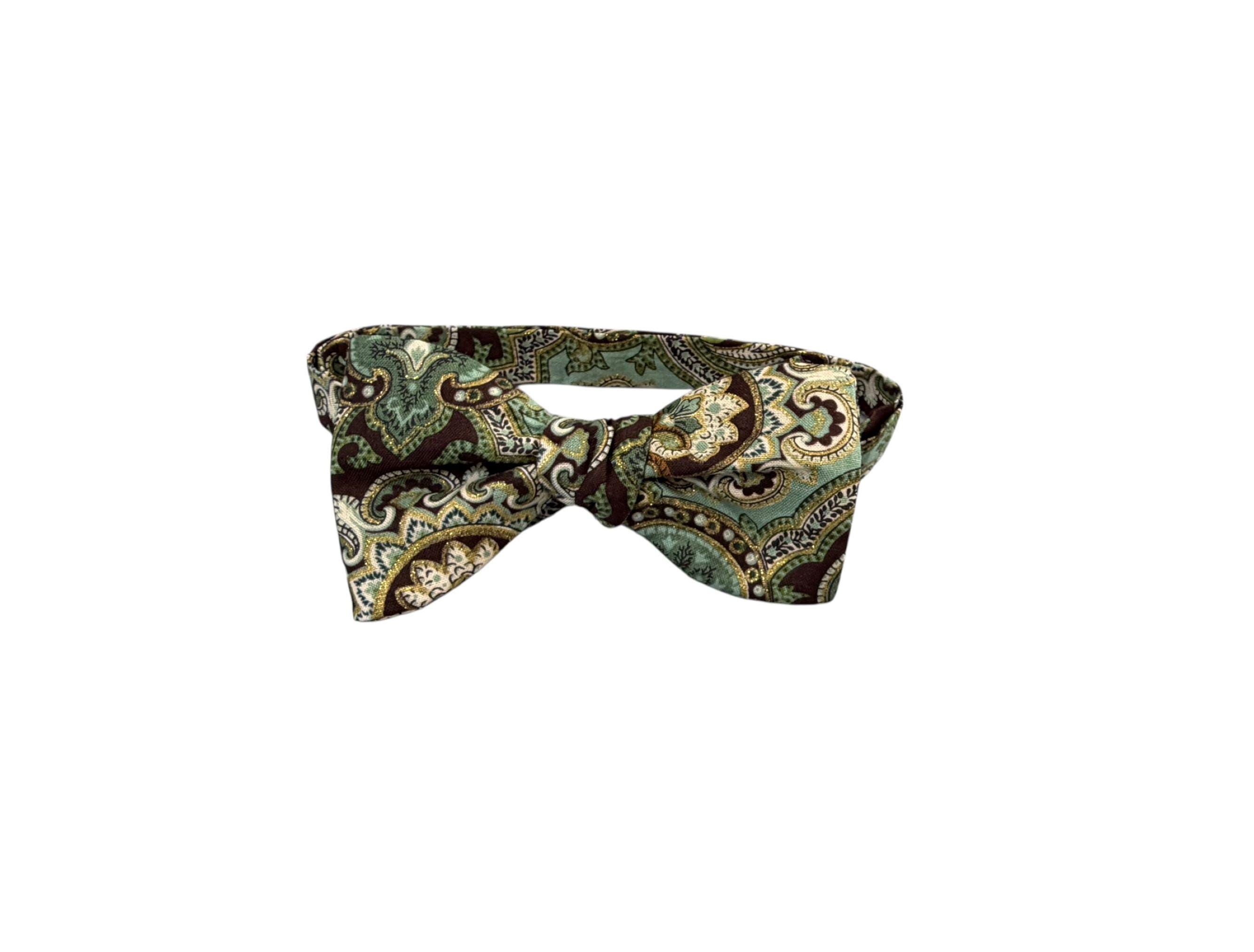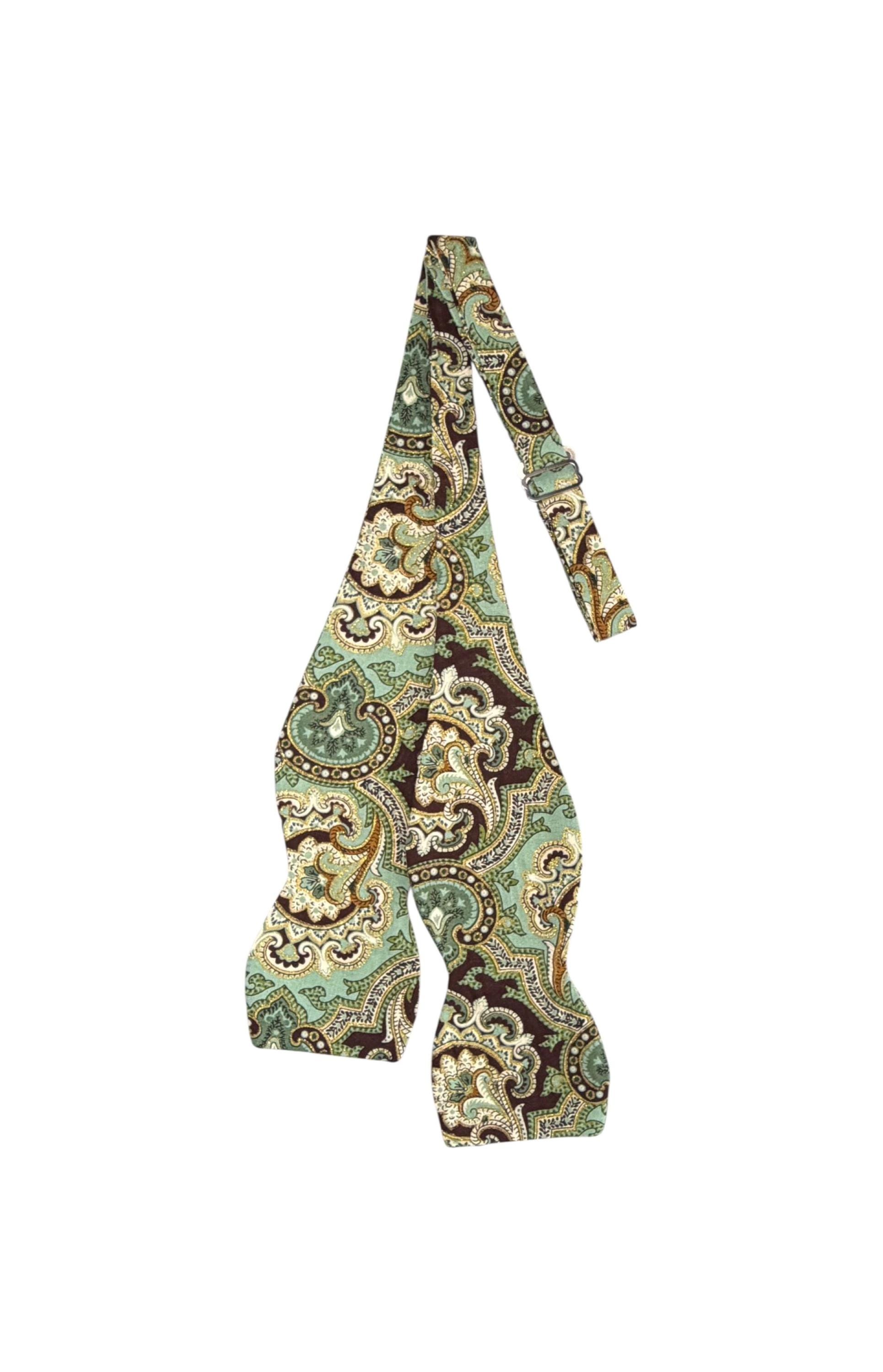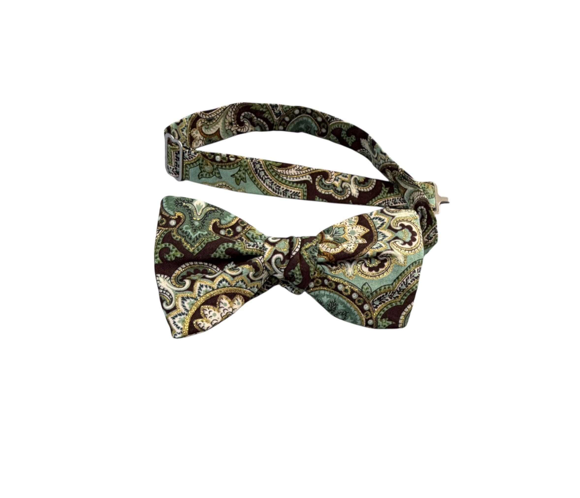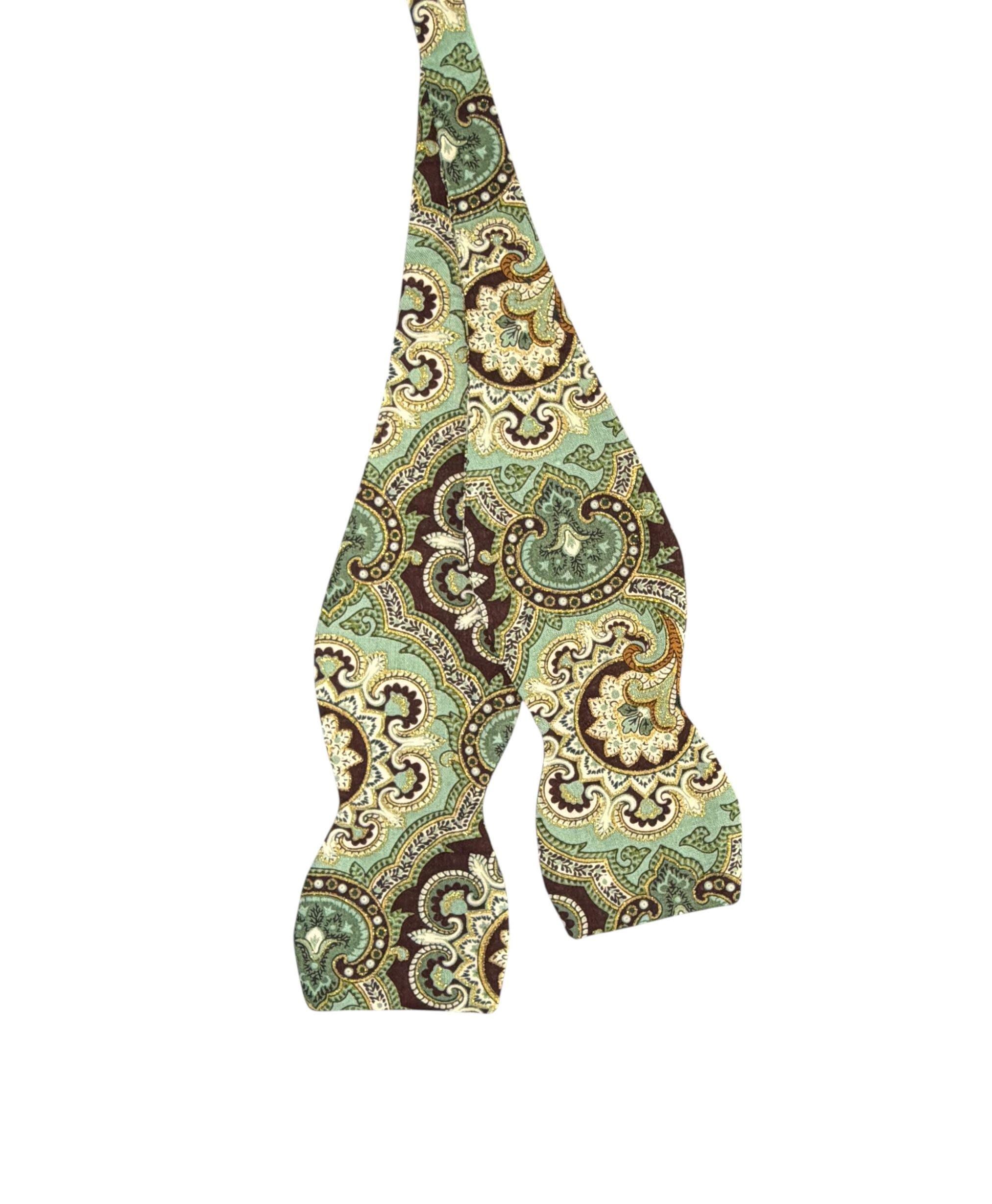 Self-tied or Pretied Bow Tie - Teal and Brown Paisley with Touches of Gold Metallic - Prom Night - Wedding - Adult Men's Sizing - Crafted in the USA - The "Poitier" Bow Tie
