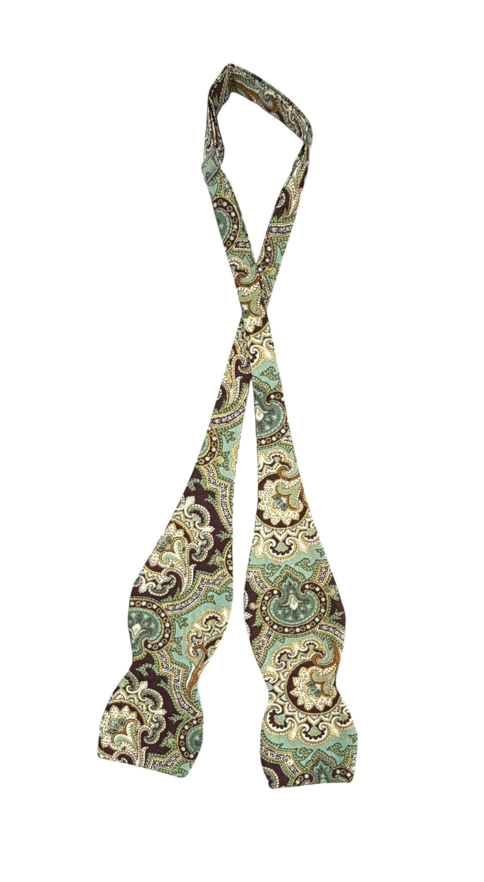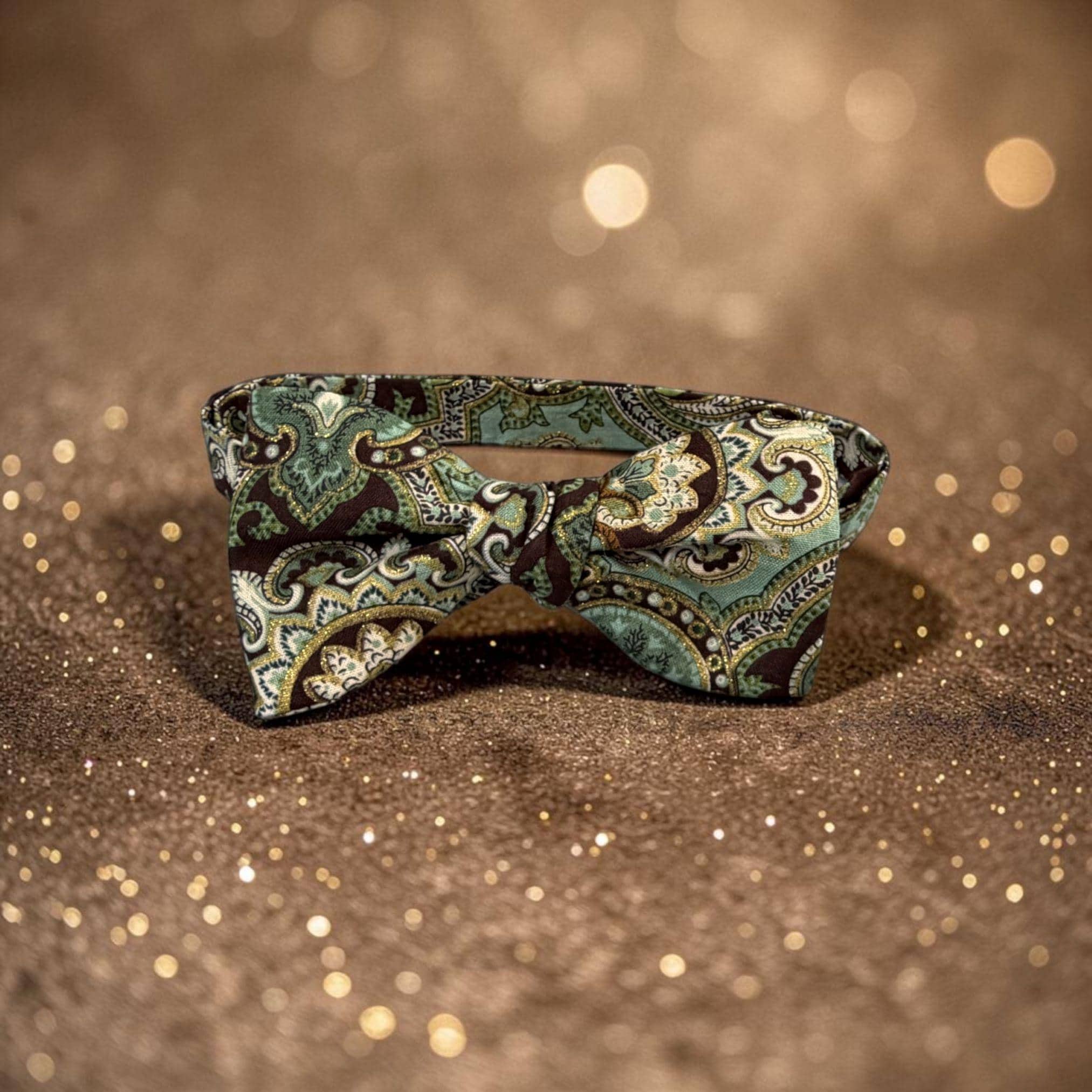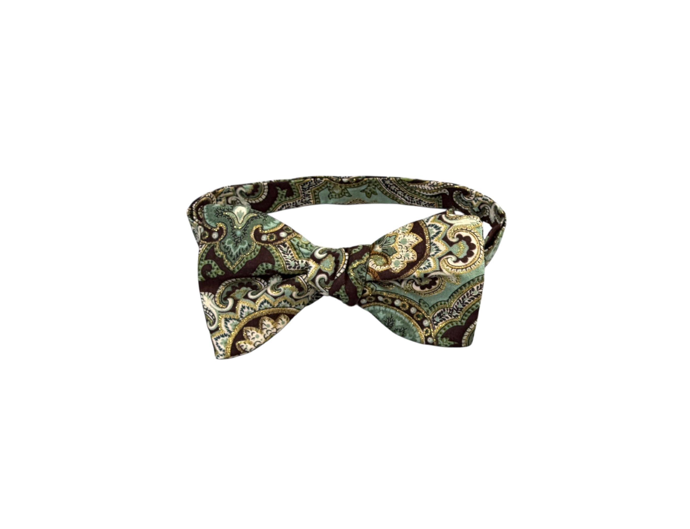 Self-tied or Pretied Bow Tie - Teal and Brown Paisley with Touches of Gold Metallic - Prom Night - Wedding - Adult Men's Sizing - Crafted in the USA - The "Poitier" Bow Tie