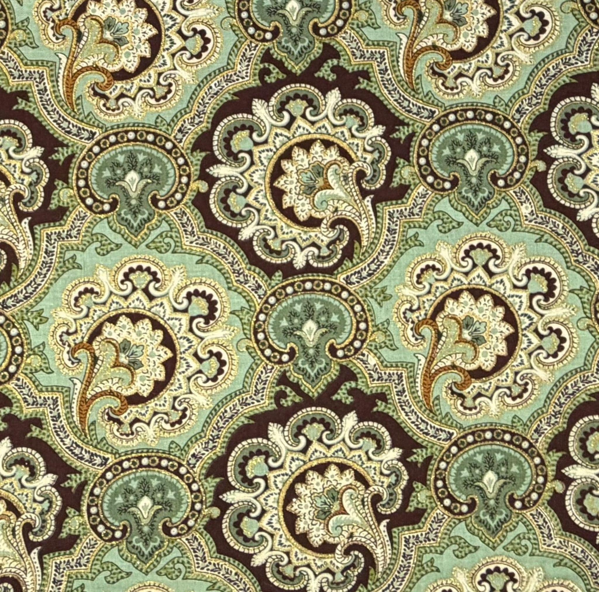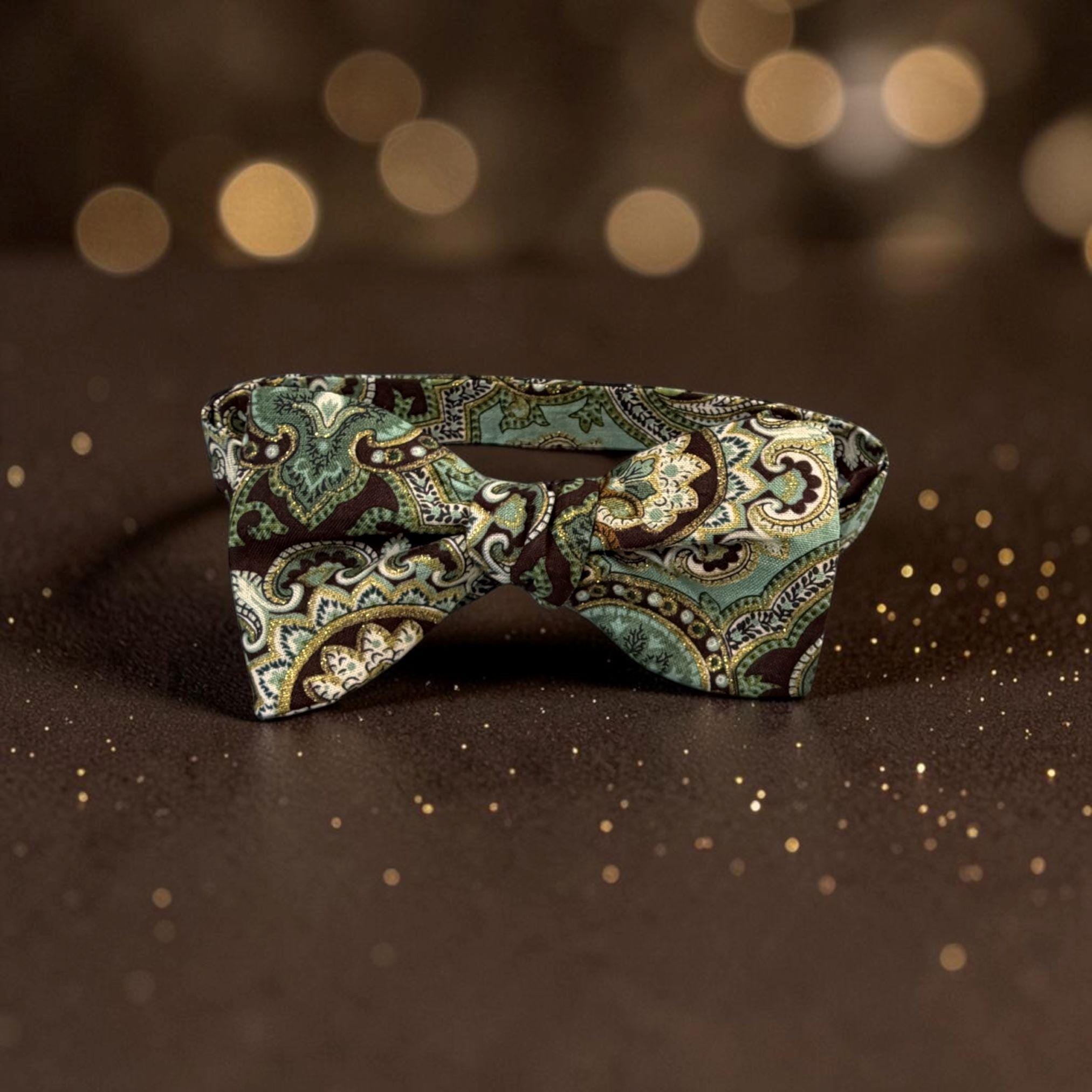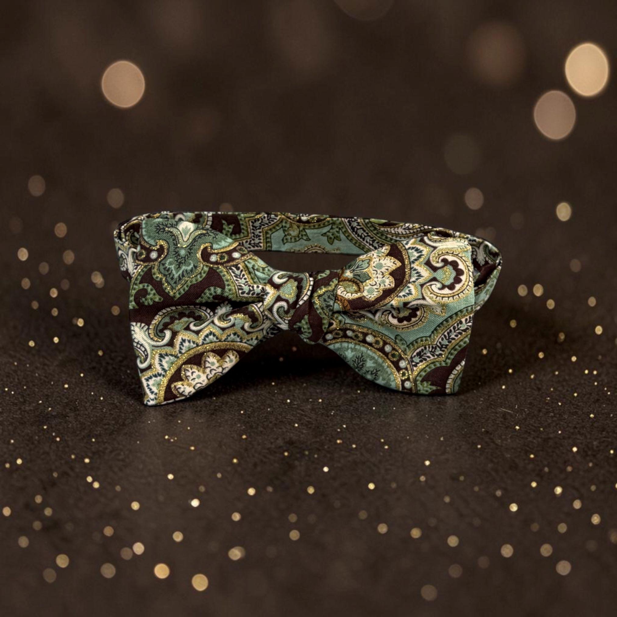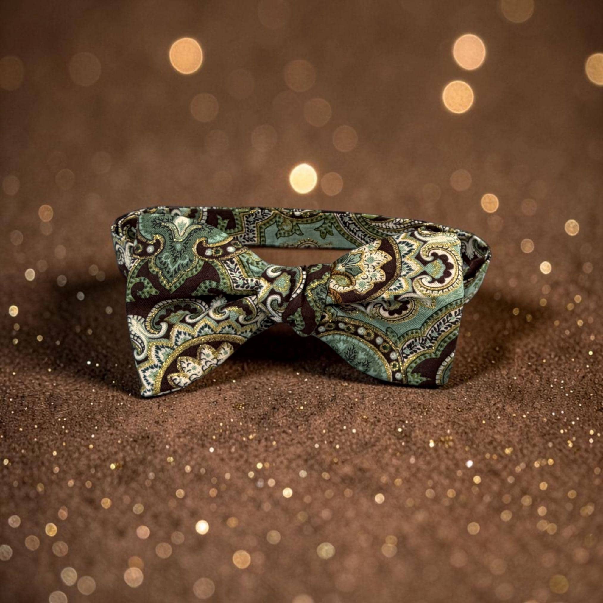 Self-tied or Pretied Bow Tie - Teal and Brown Paisley with Touches of Gold Metallic - Prom Night - Wedding - Adult Men's Sizing - Crafted in the USA - The "Poitier" Bow Tie