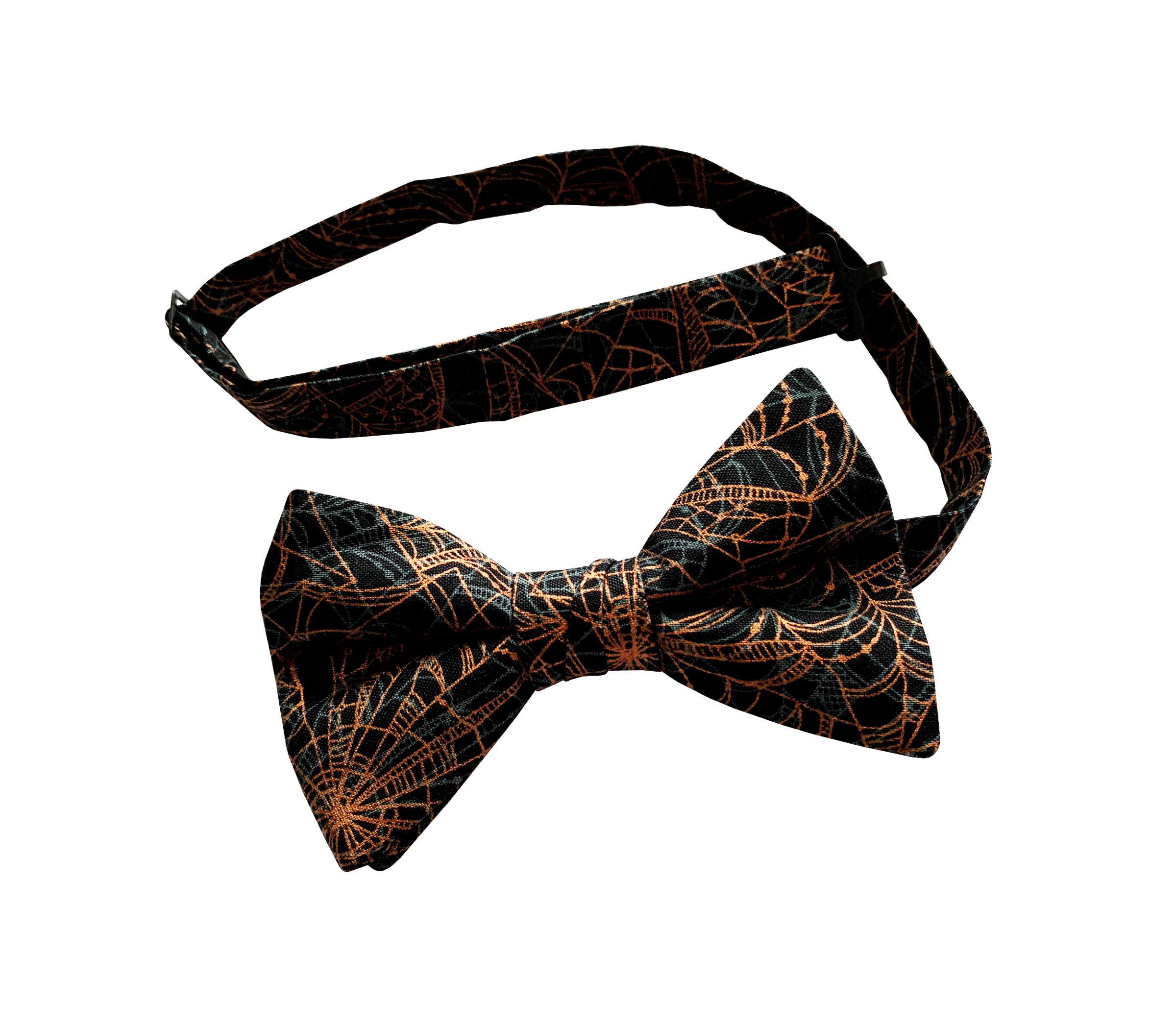 Step into Halloween in style with the “Asher” Bow Tie — a bold, handcrafted pre-tied bow tie with shimmering orange metallic spider webs against a jet-black backdrop. Perfect for Halloween parties, themed weddings, autumn events, or adding a festive twist to your formalwear.