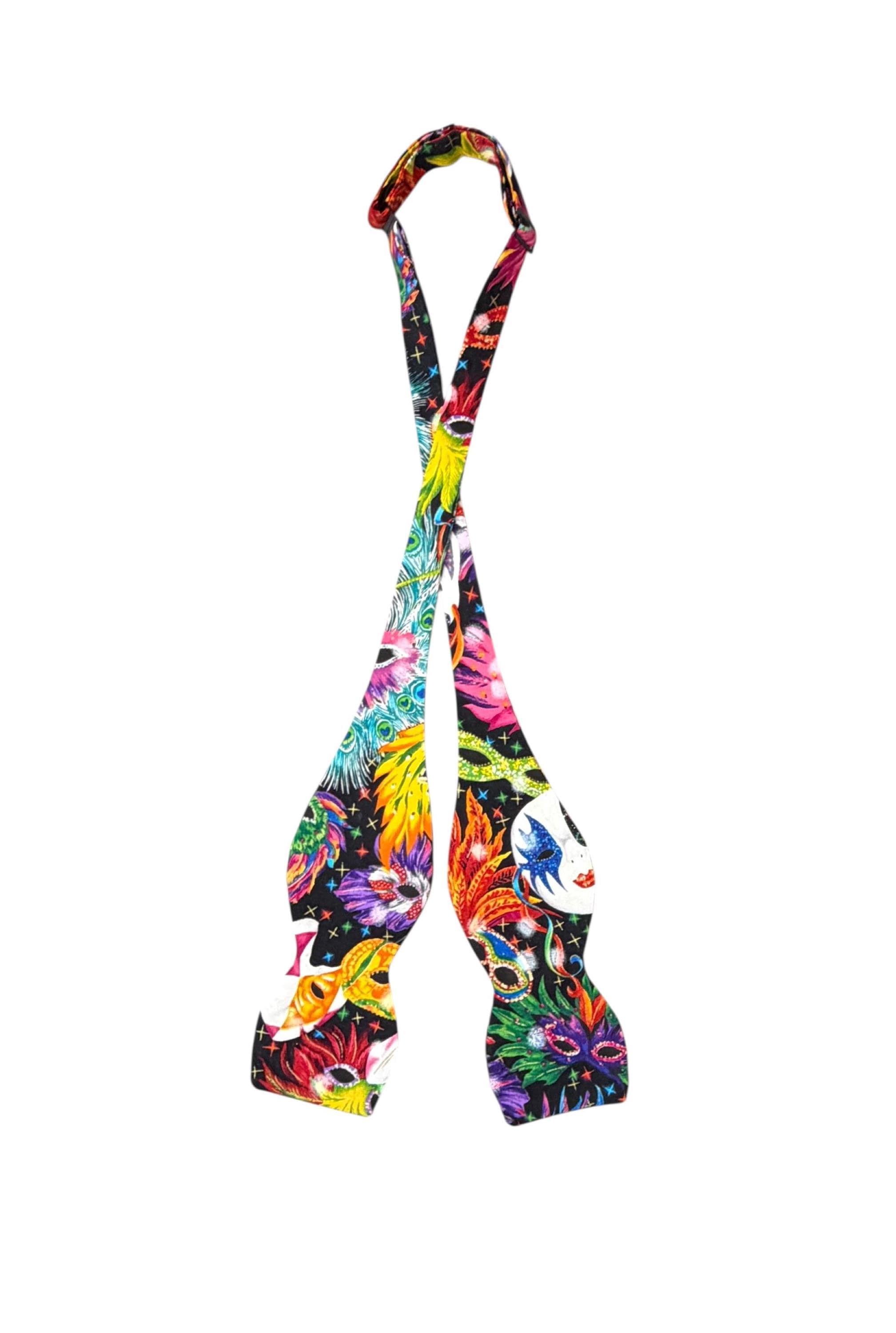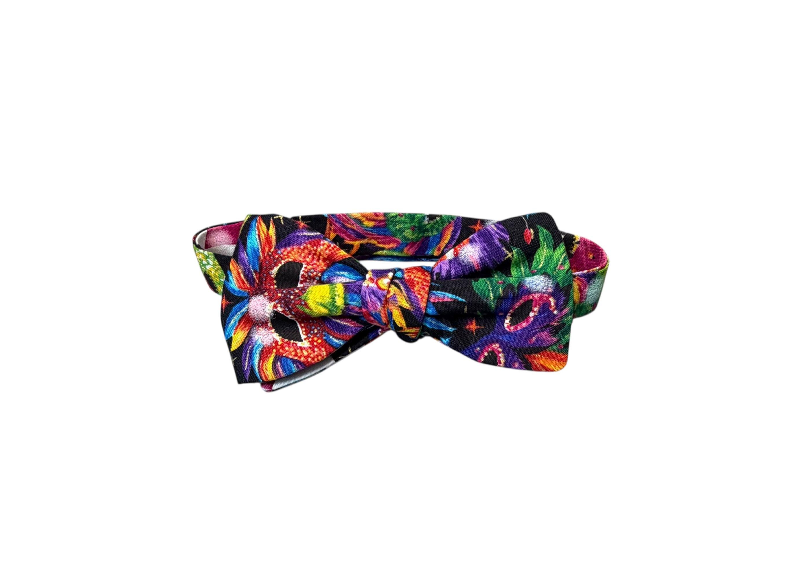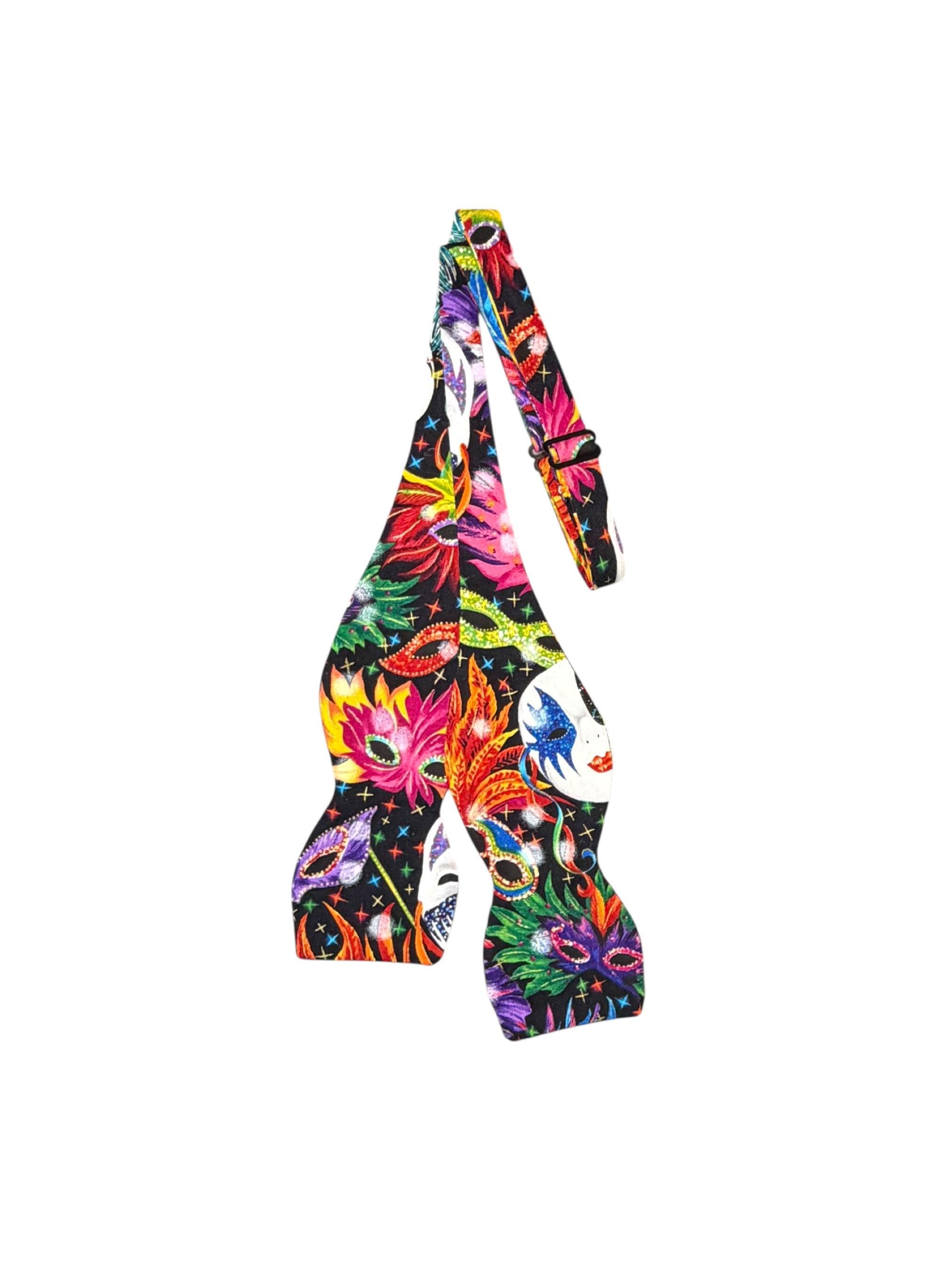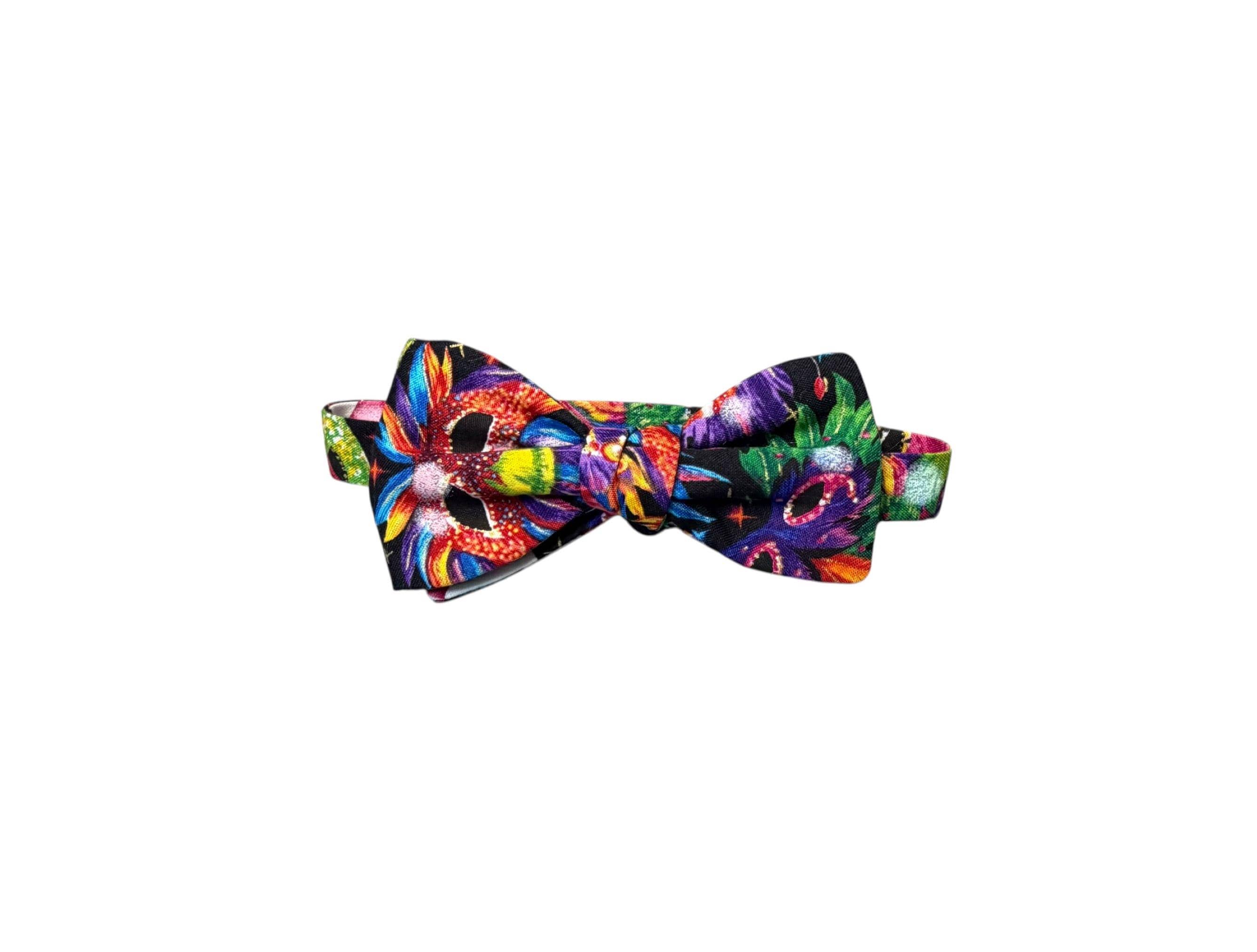 Mardi Gras Self-Tie Bow Tie - Multi Colored Masquerade Mask Celebration Cotton Bow Tie - Adult Men's Sizing - Crafted in the USA by Holiday Bow Ties, llc - The "Felix" Bow Tie