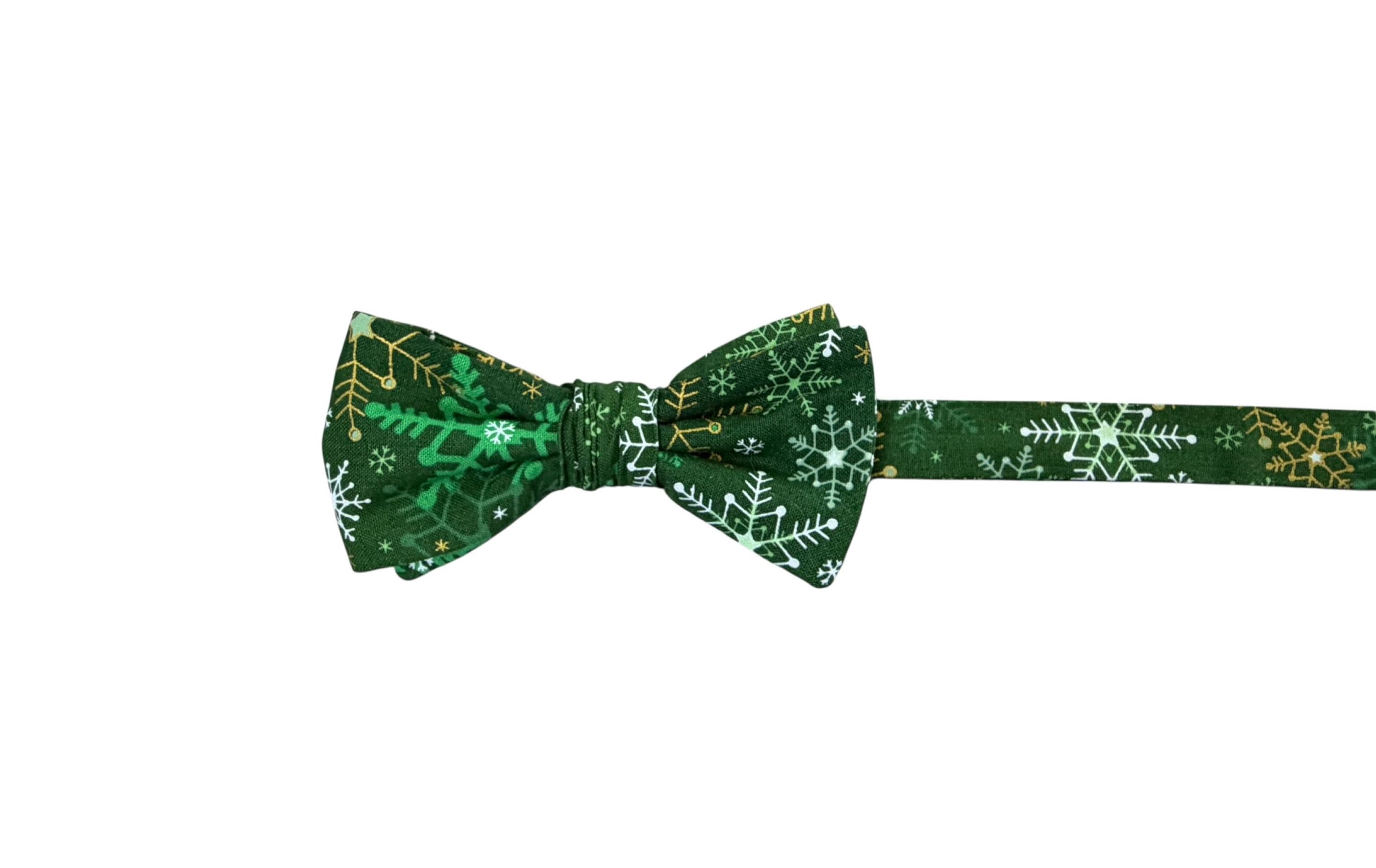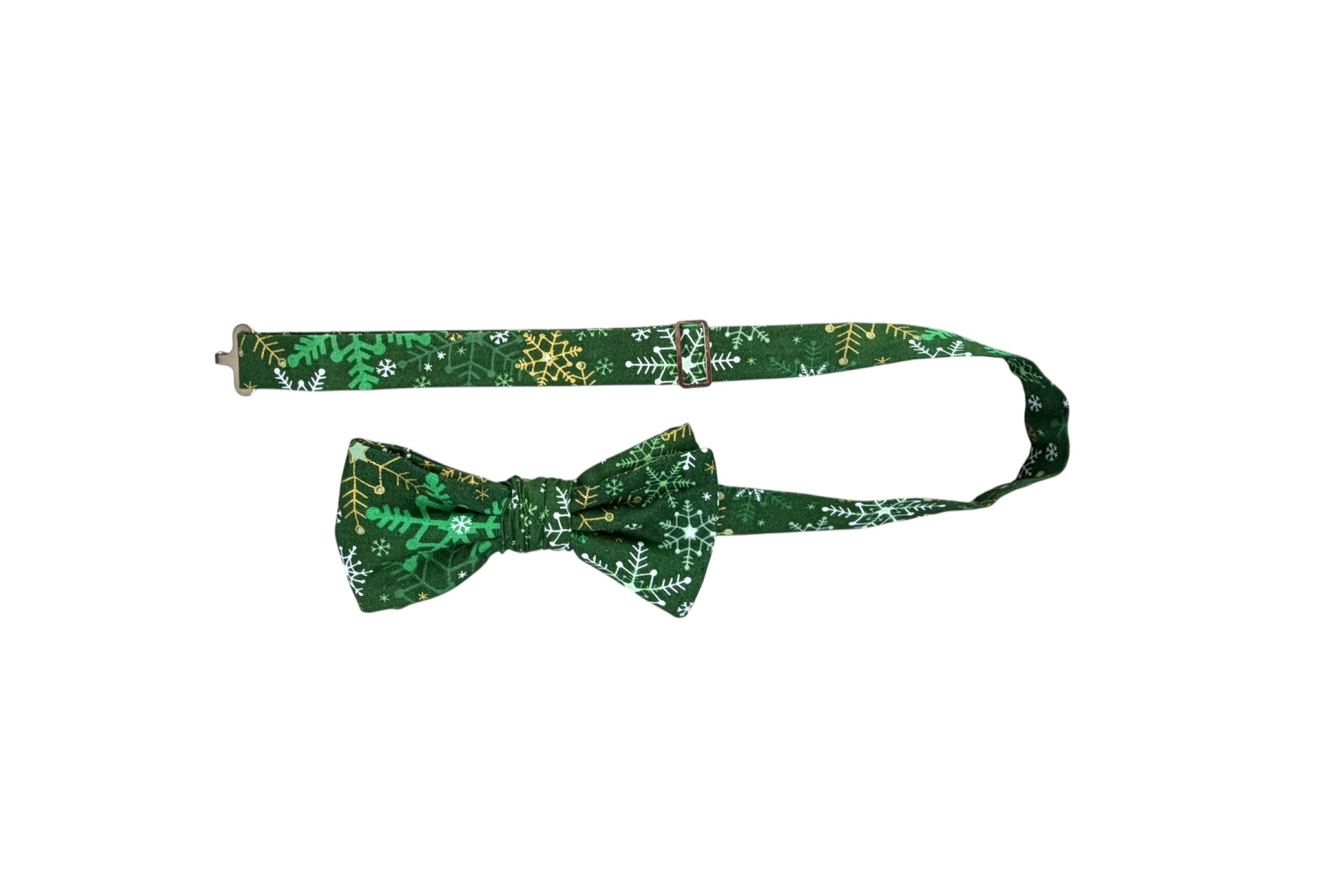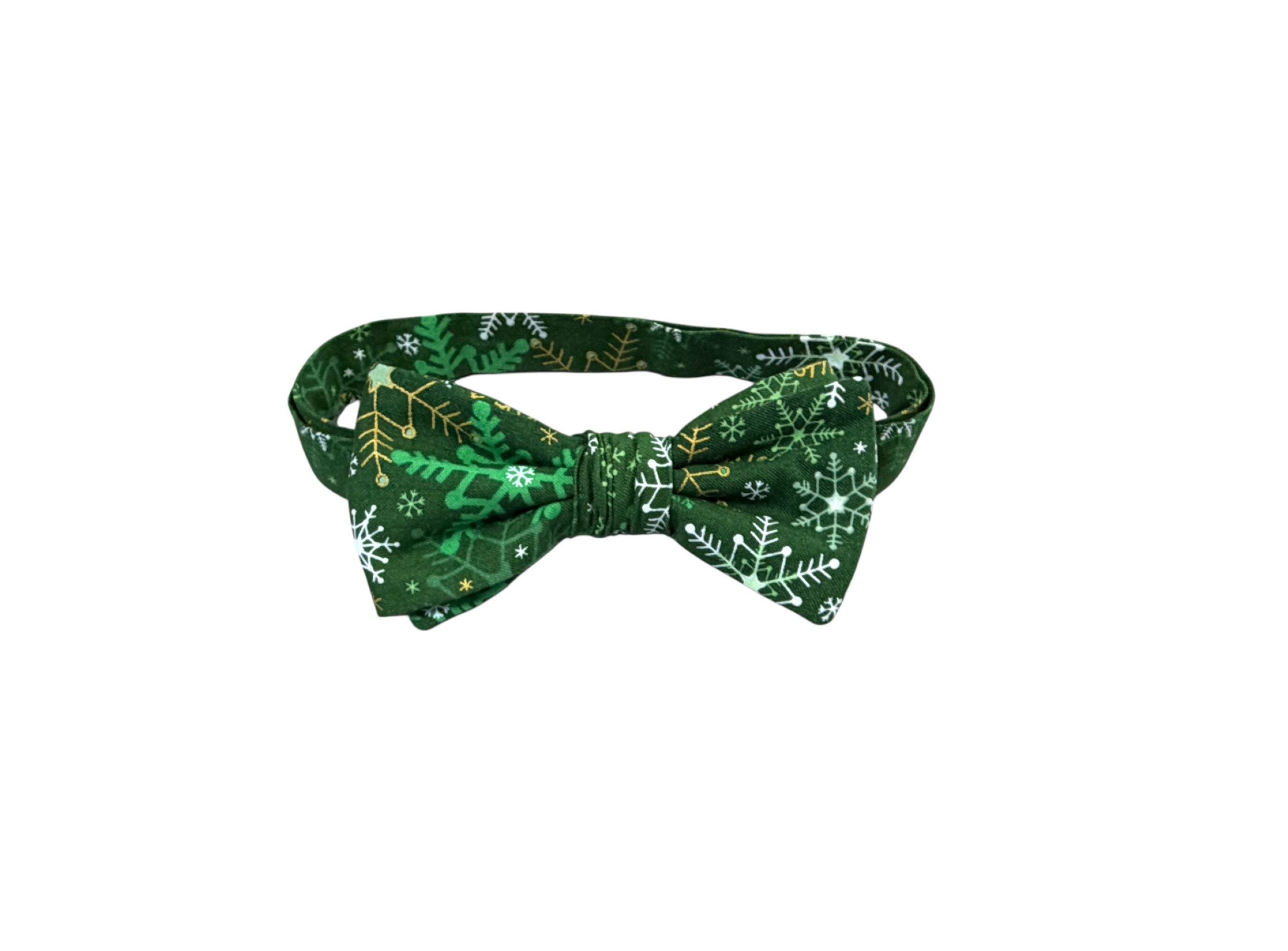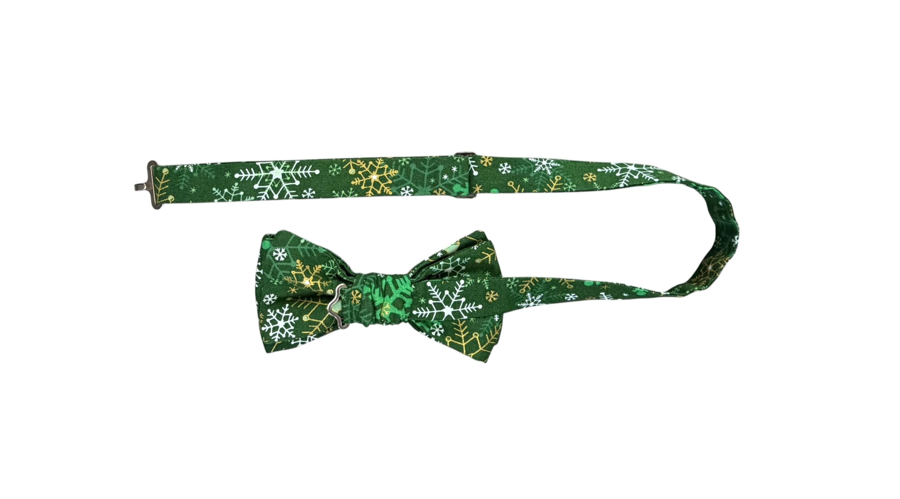 Handmade Pre-tied Bow Tie - Green with White & Gold Metallic Snowflakes - Premium Cotton - Adult Men's Sizing - Crafted in the USA by Holiday Bow Ties, llc - The "Malachi" Bow Tie