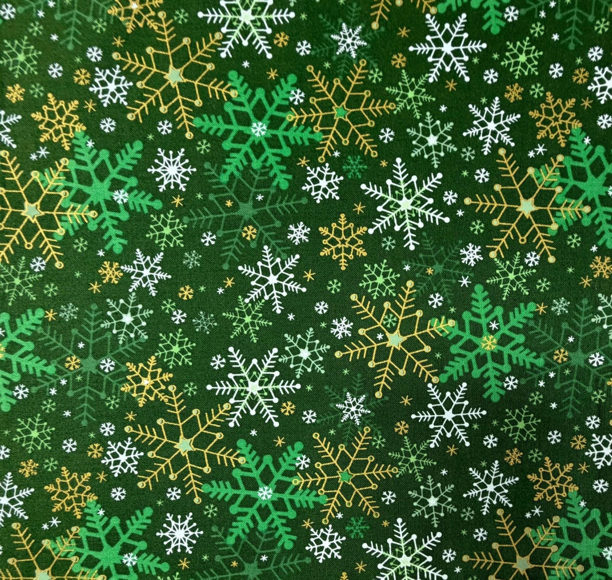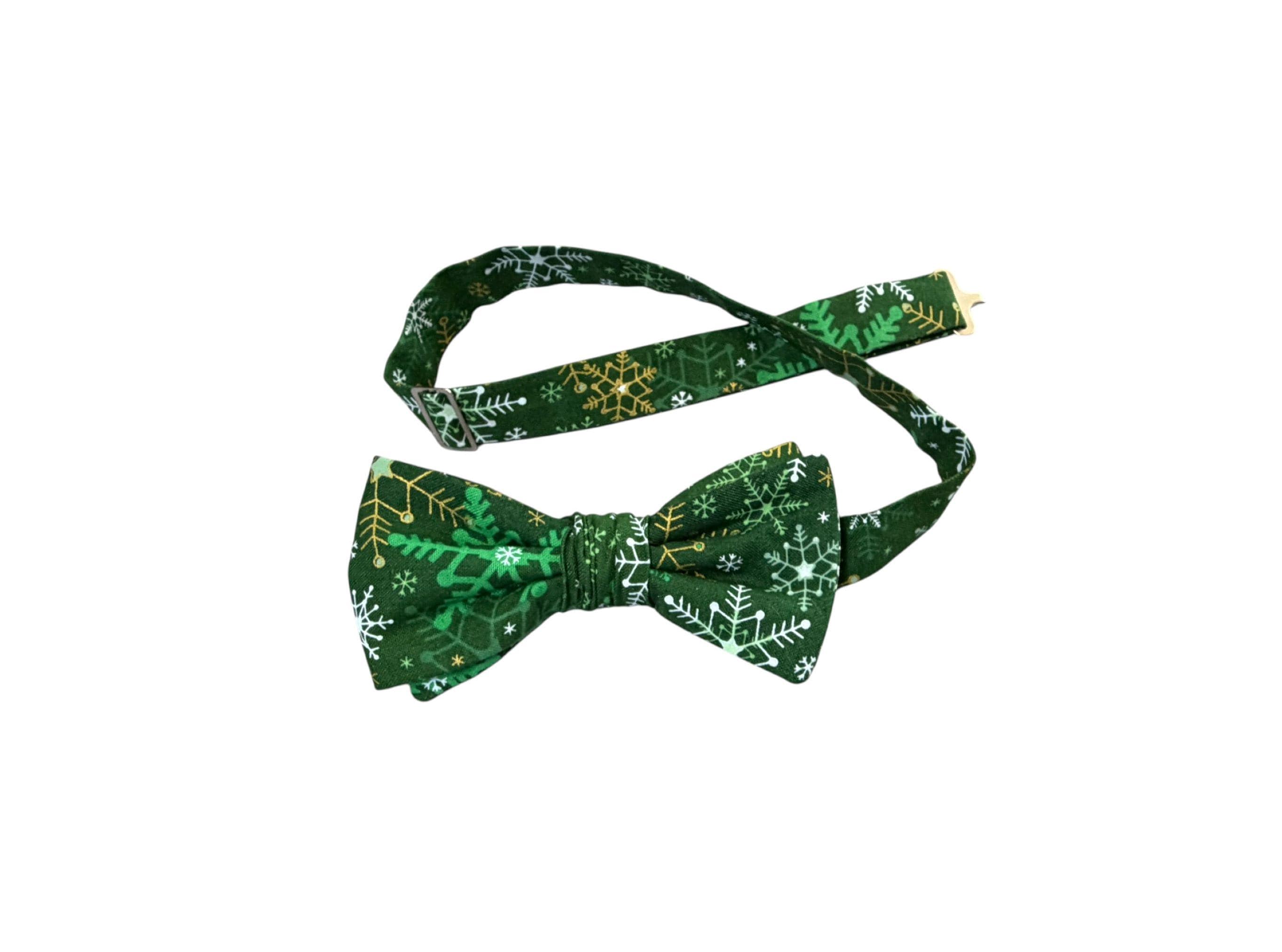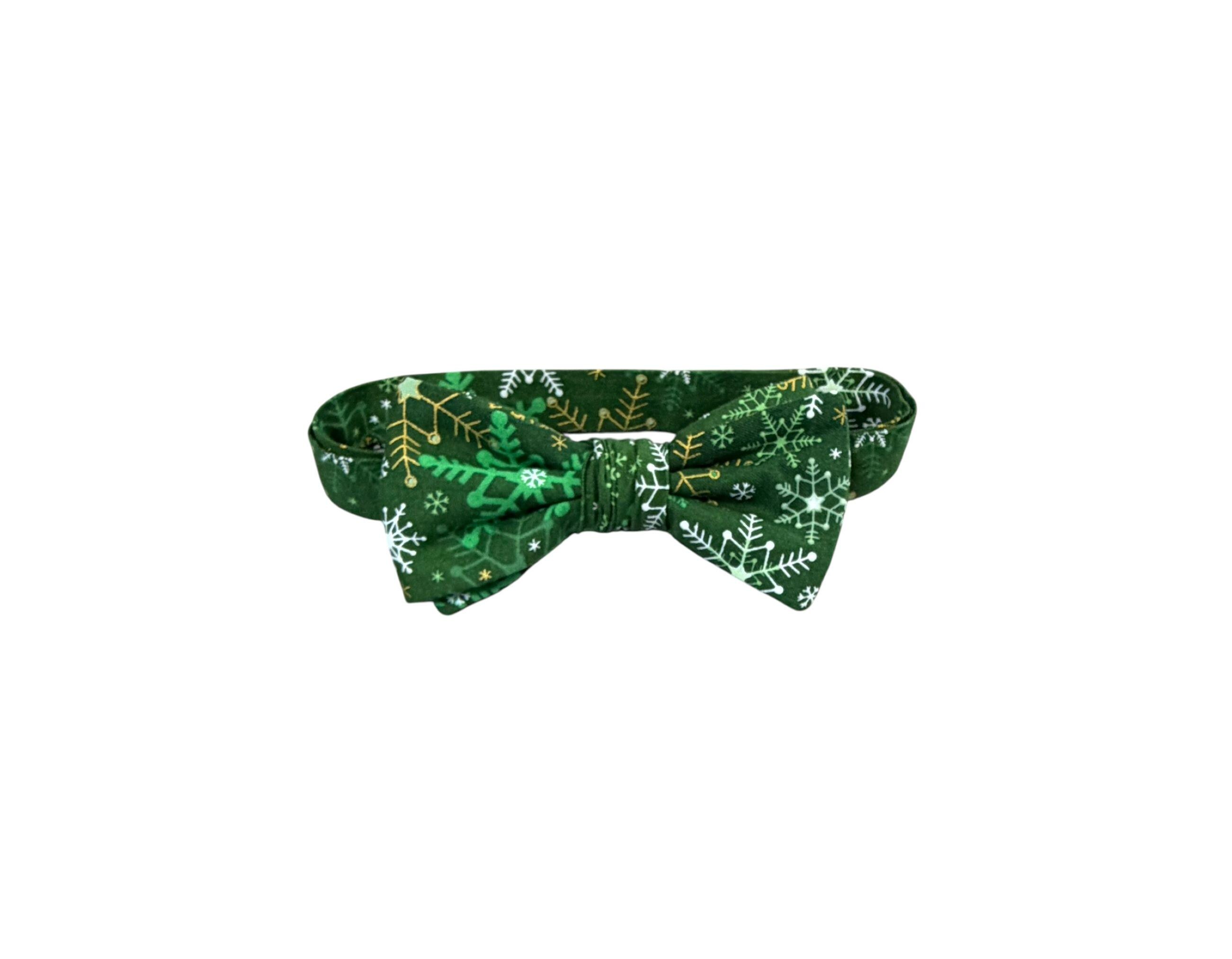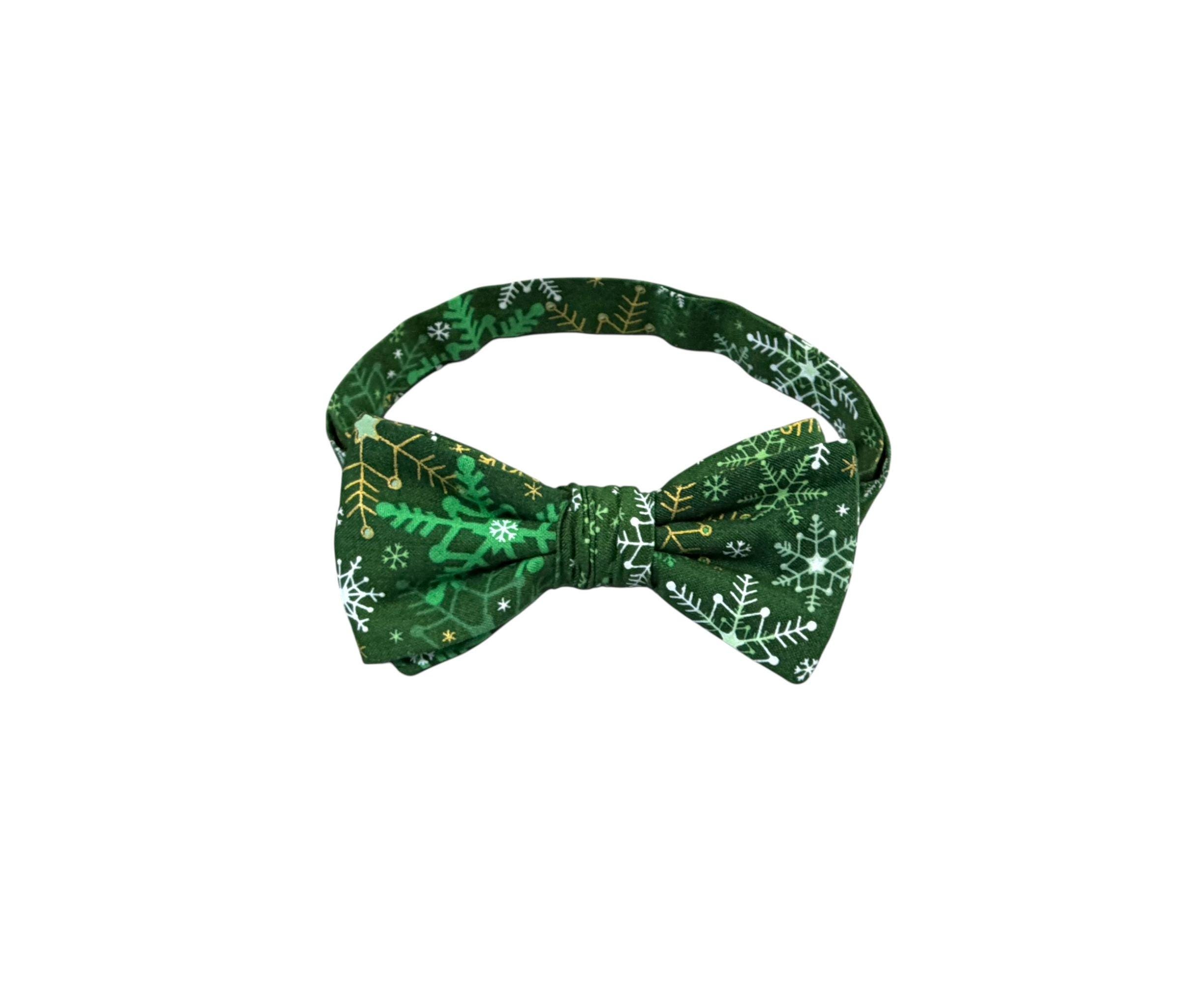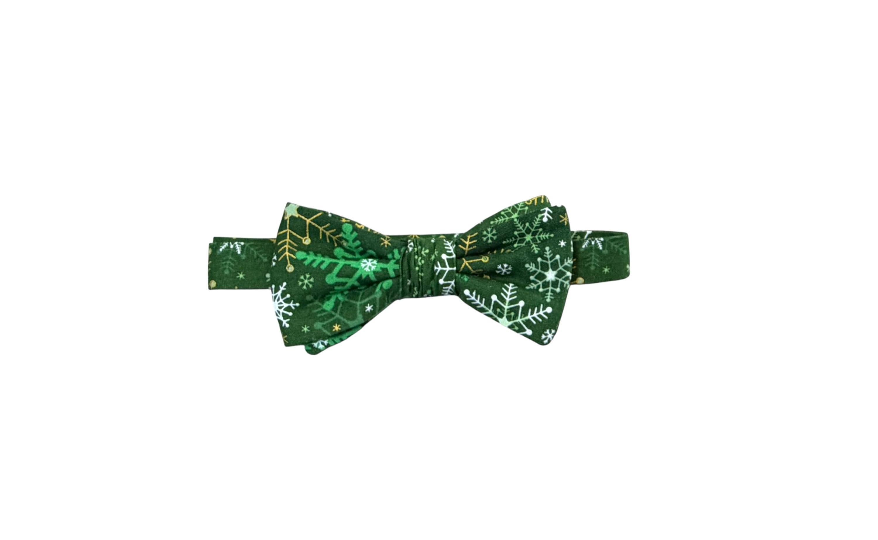 Handmade Pre-tied Bow Tie - Green with White & Gold Metallic Snowflakes - Premium Cotton - Adult Men's Sizing - Crafted in the USA by Holiday Bow Ties, llc - The "Malachi" Bow Tie