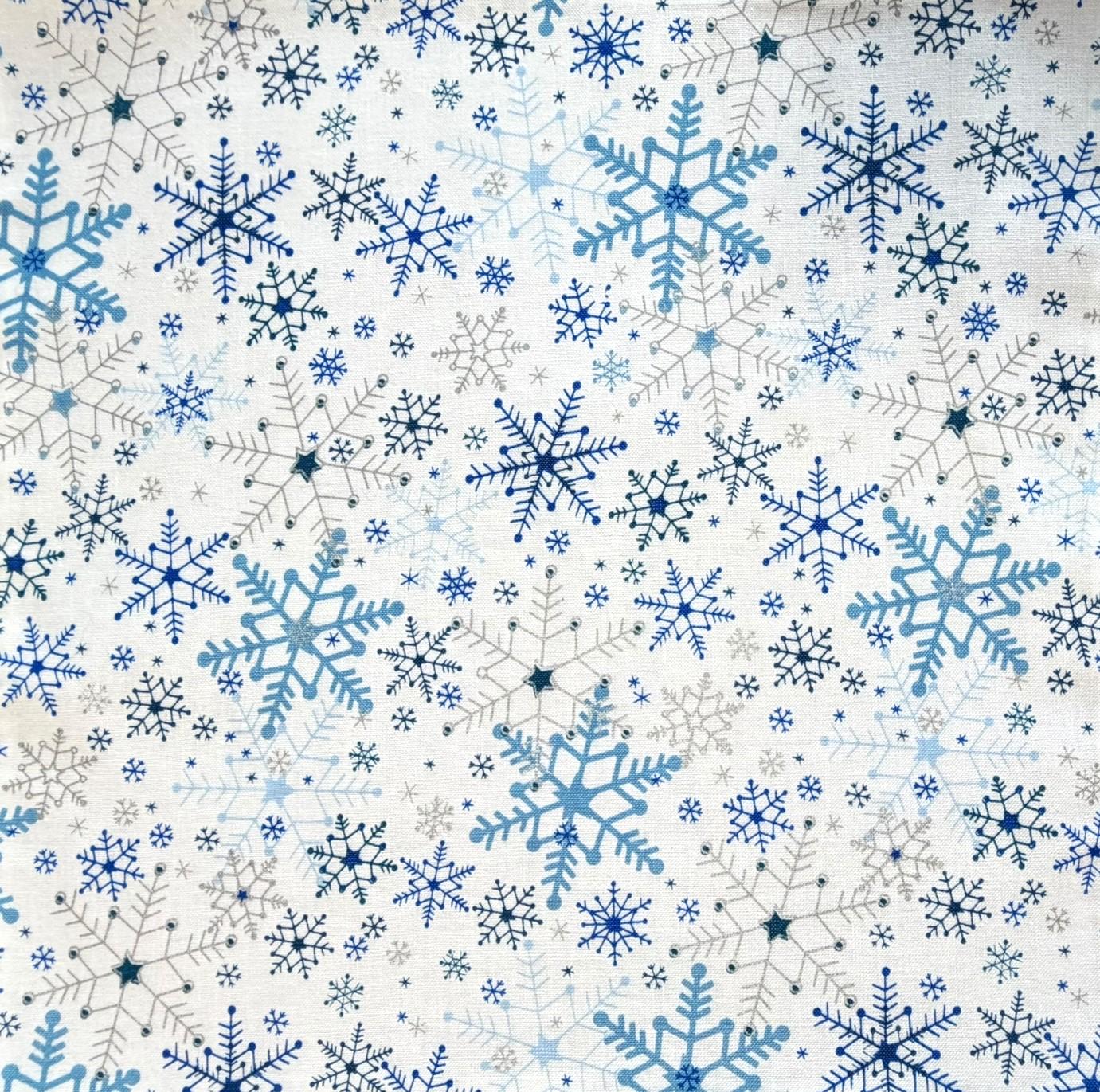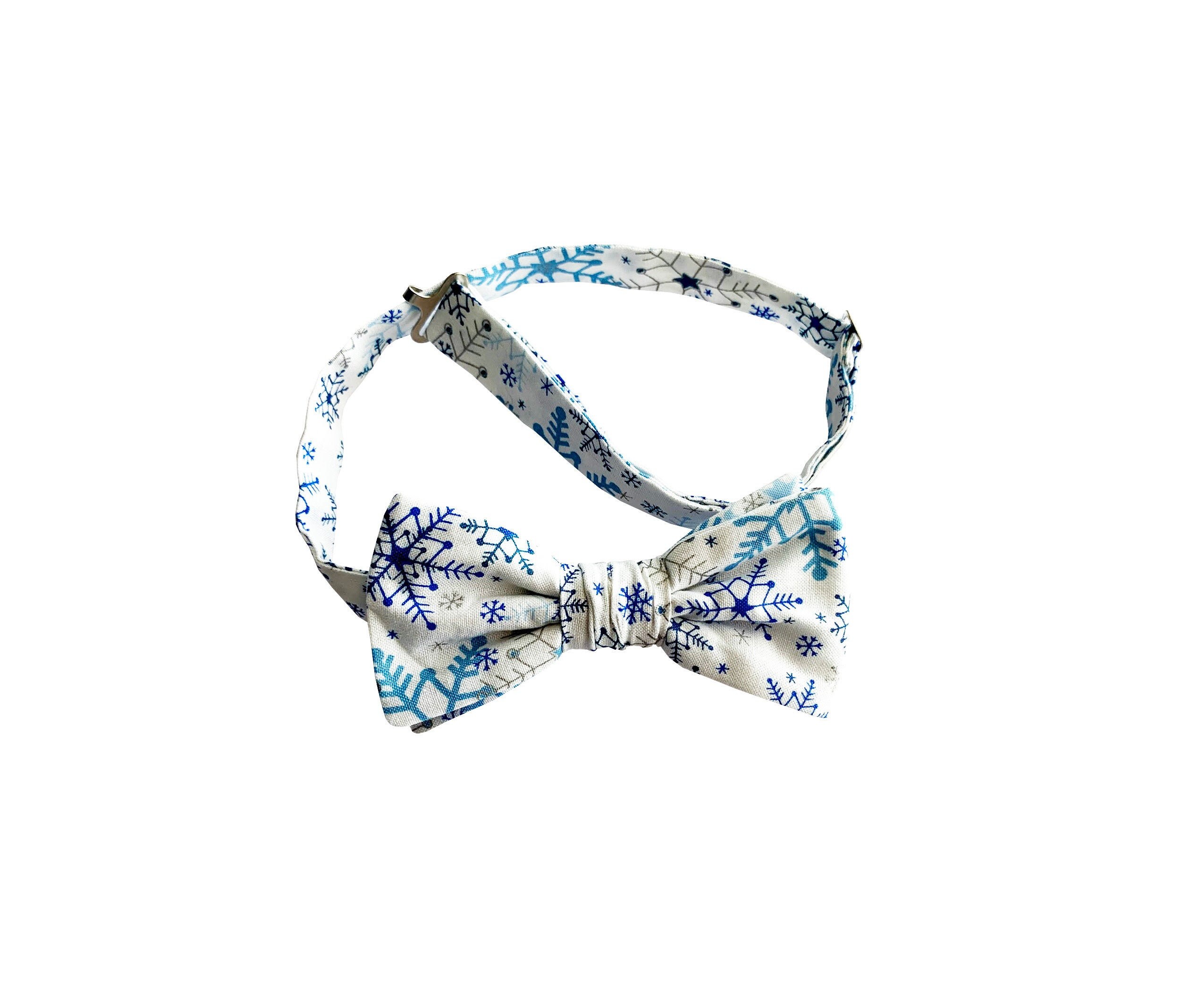 Handmade Pre-tied Bow Tie - White with Shades of Blue & Light Silver Metallic Snowflakes - Premium Cotton - Adult Men's Sizing - Crafted in the USA by Holiday Bow Ties, llc - The "Kaden" Bow Tie