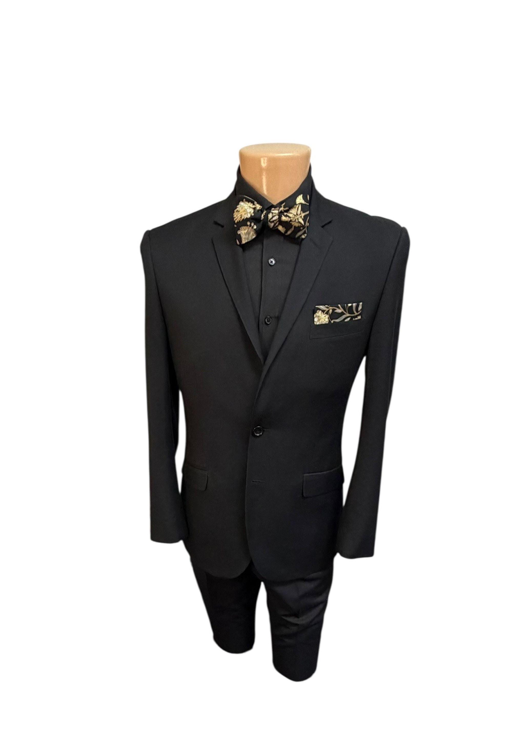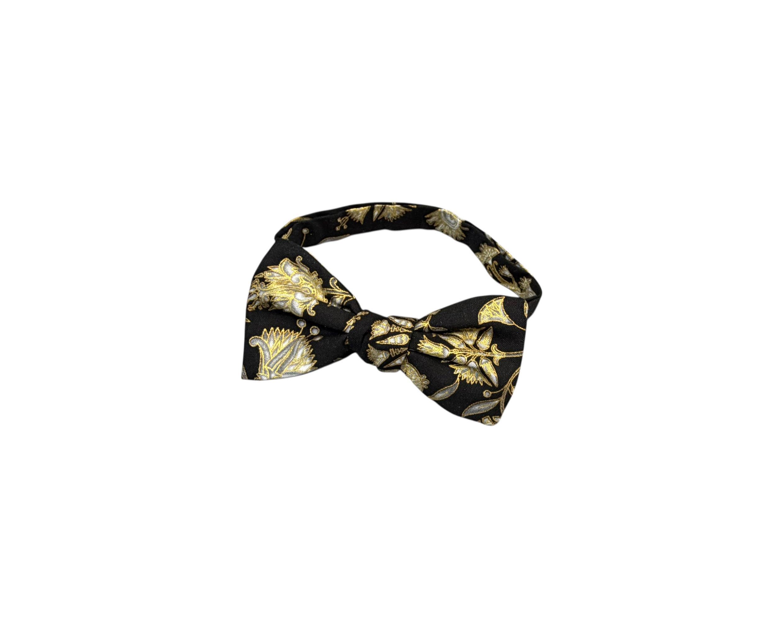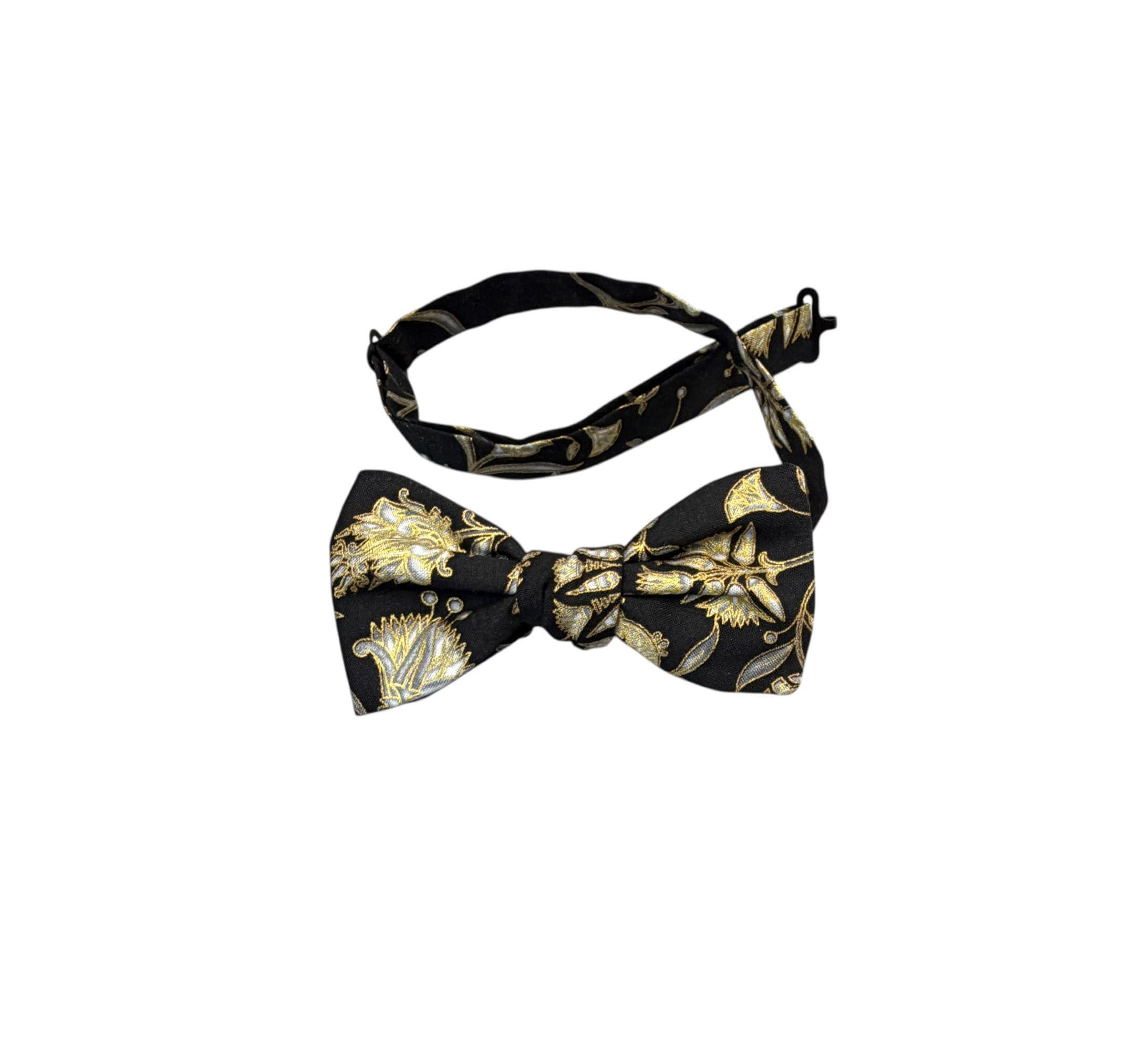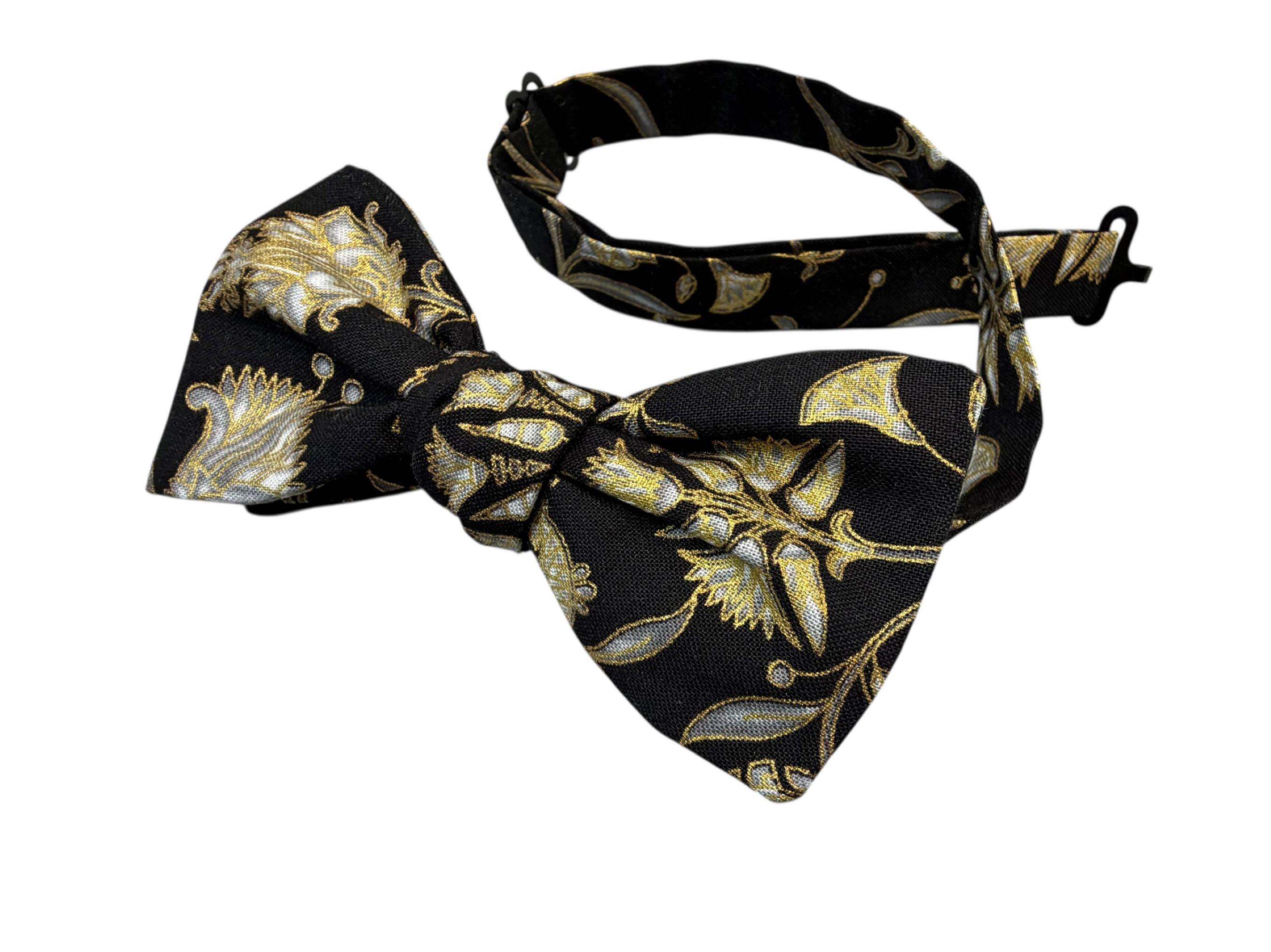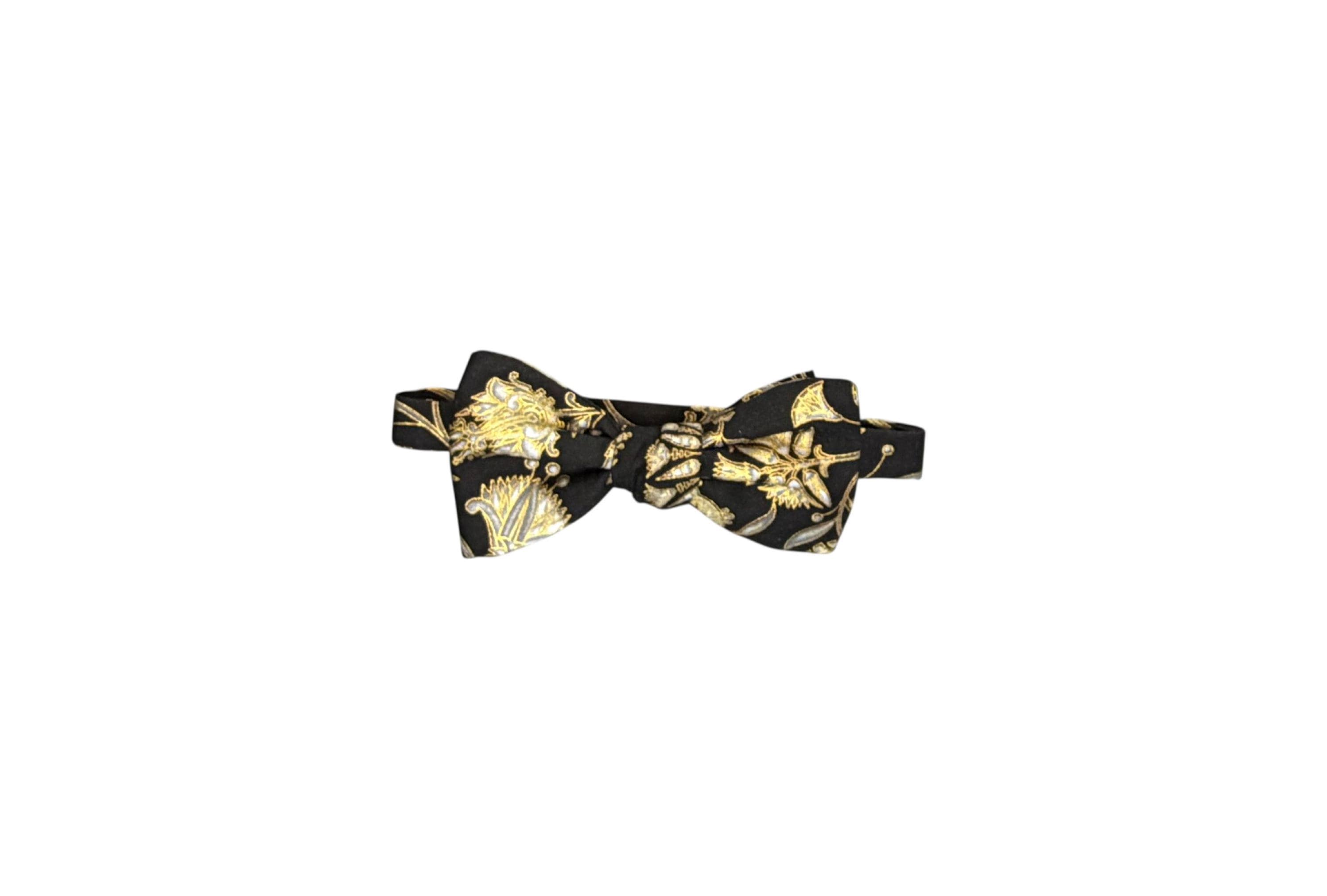 Handmade Pretied Bow Tie - Black with Gold Metallic Oriental Floral Holiday Design - Premium Cotton Bow Tie - Adult Men's Sizing - Crafted in the USA by Holiday Bow Ties, llc - The "Julius" Bow Tie